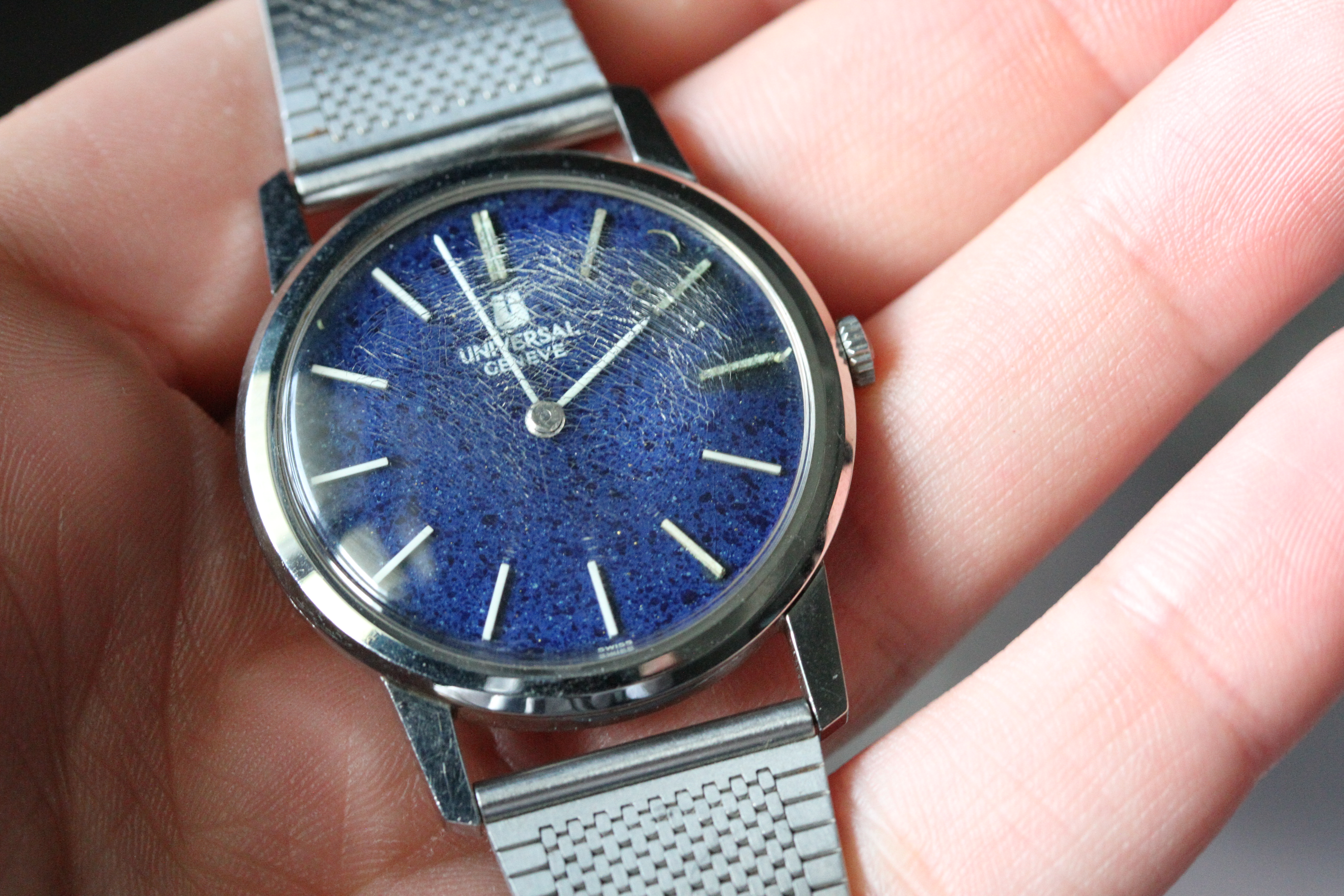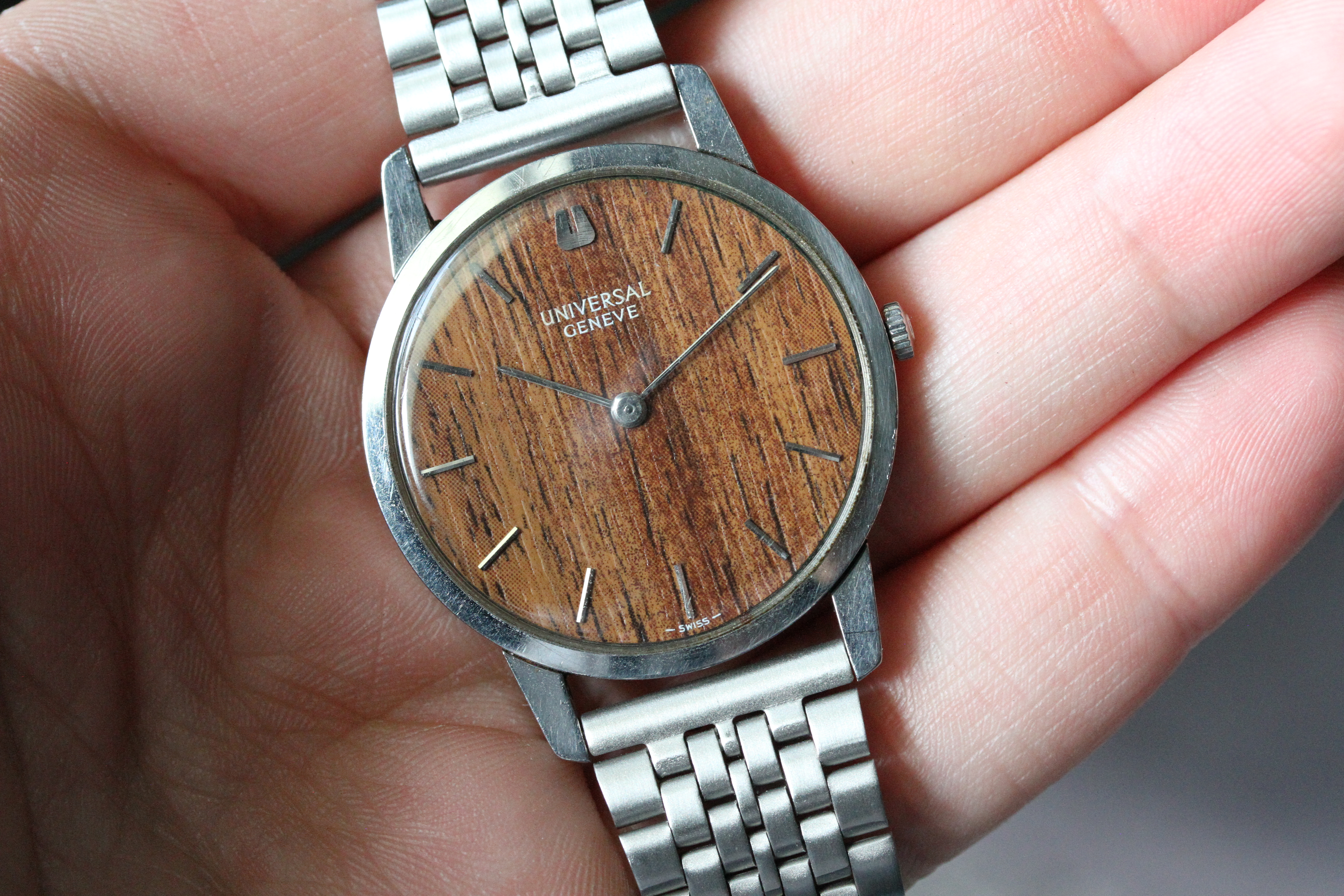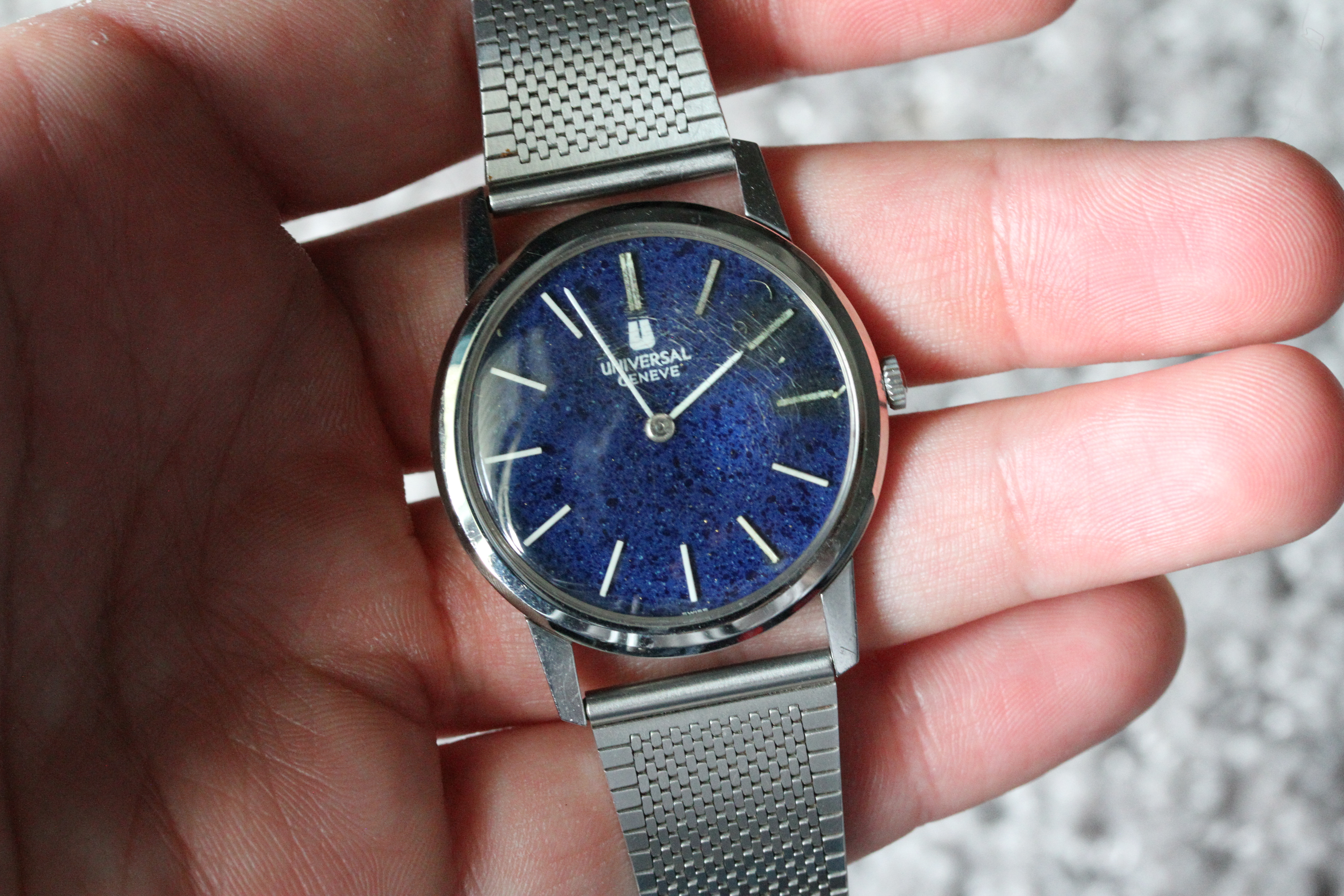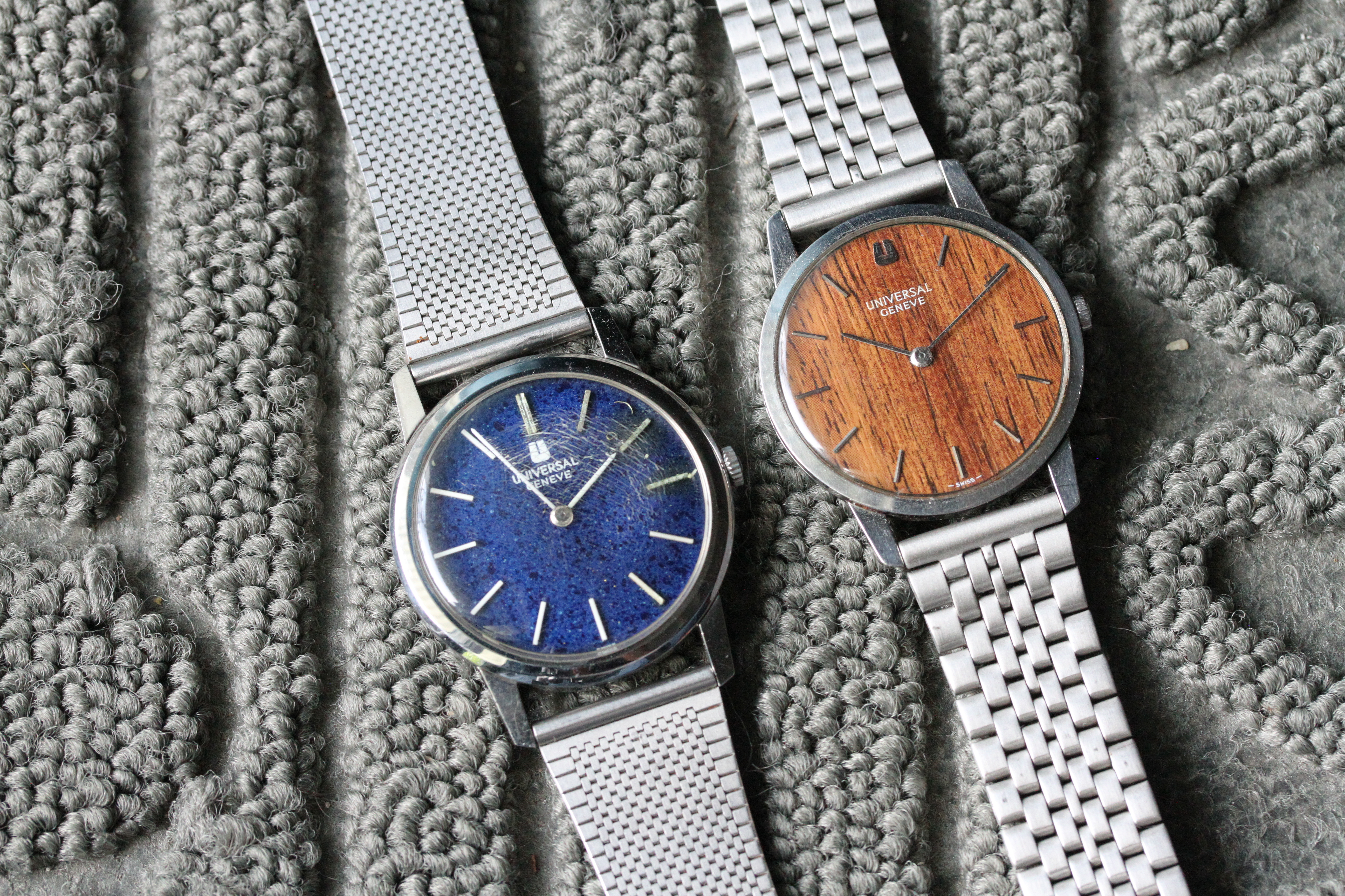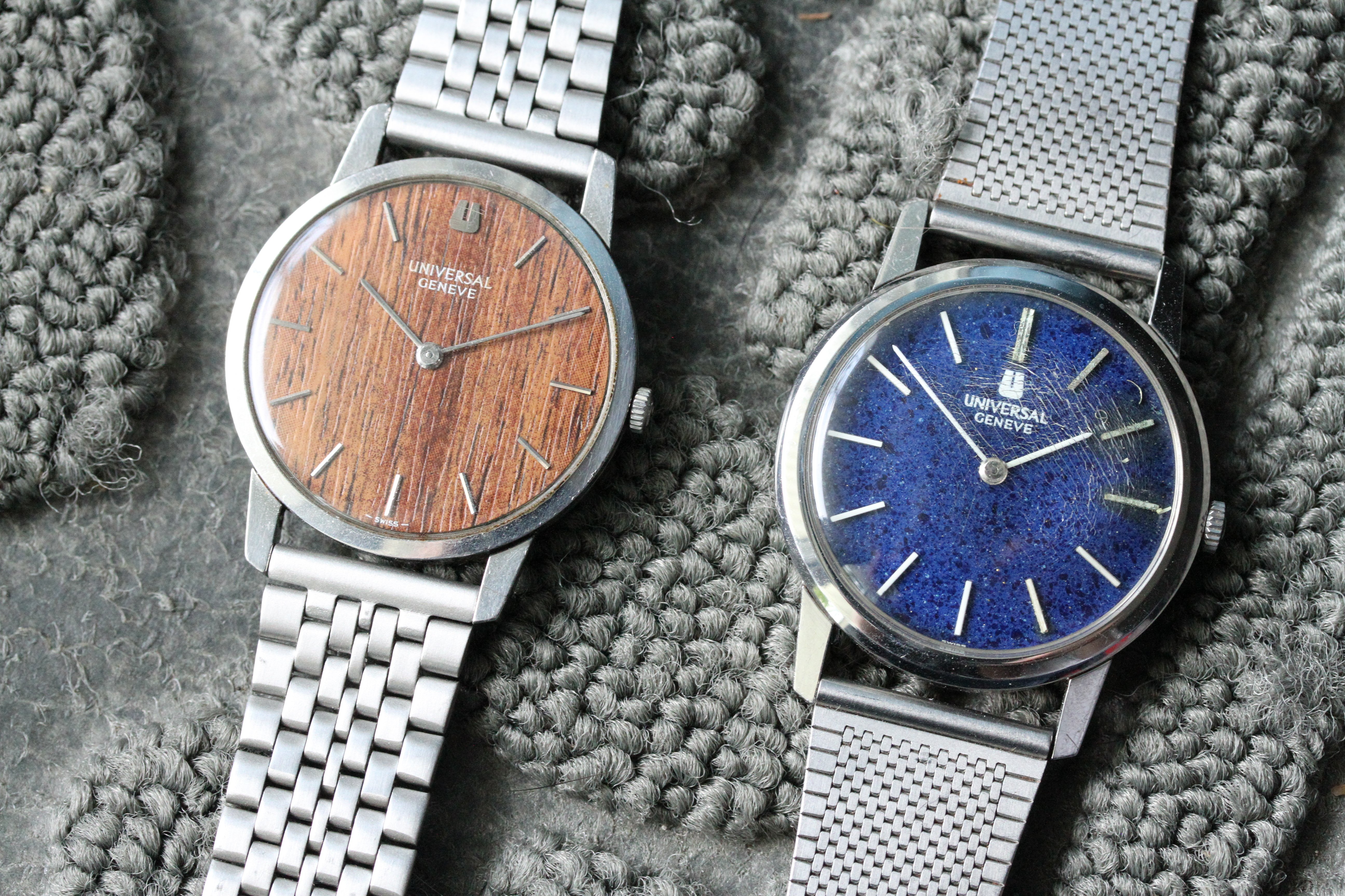 ·Up for sale is a pair of Universal Geneves with special dials. One has a wood grain and the other a "starry night" blue.