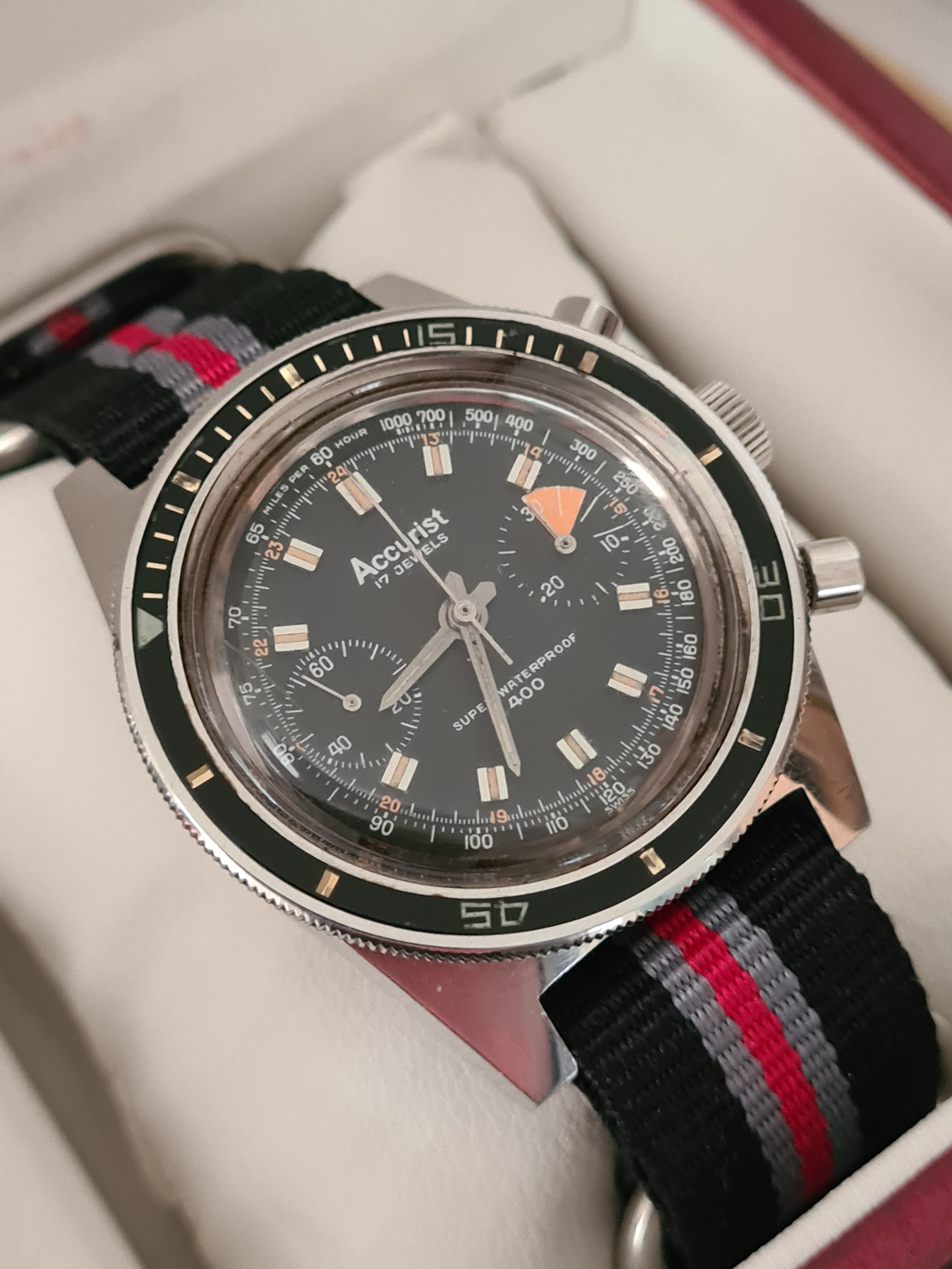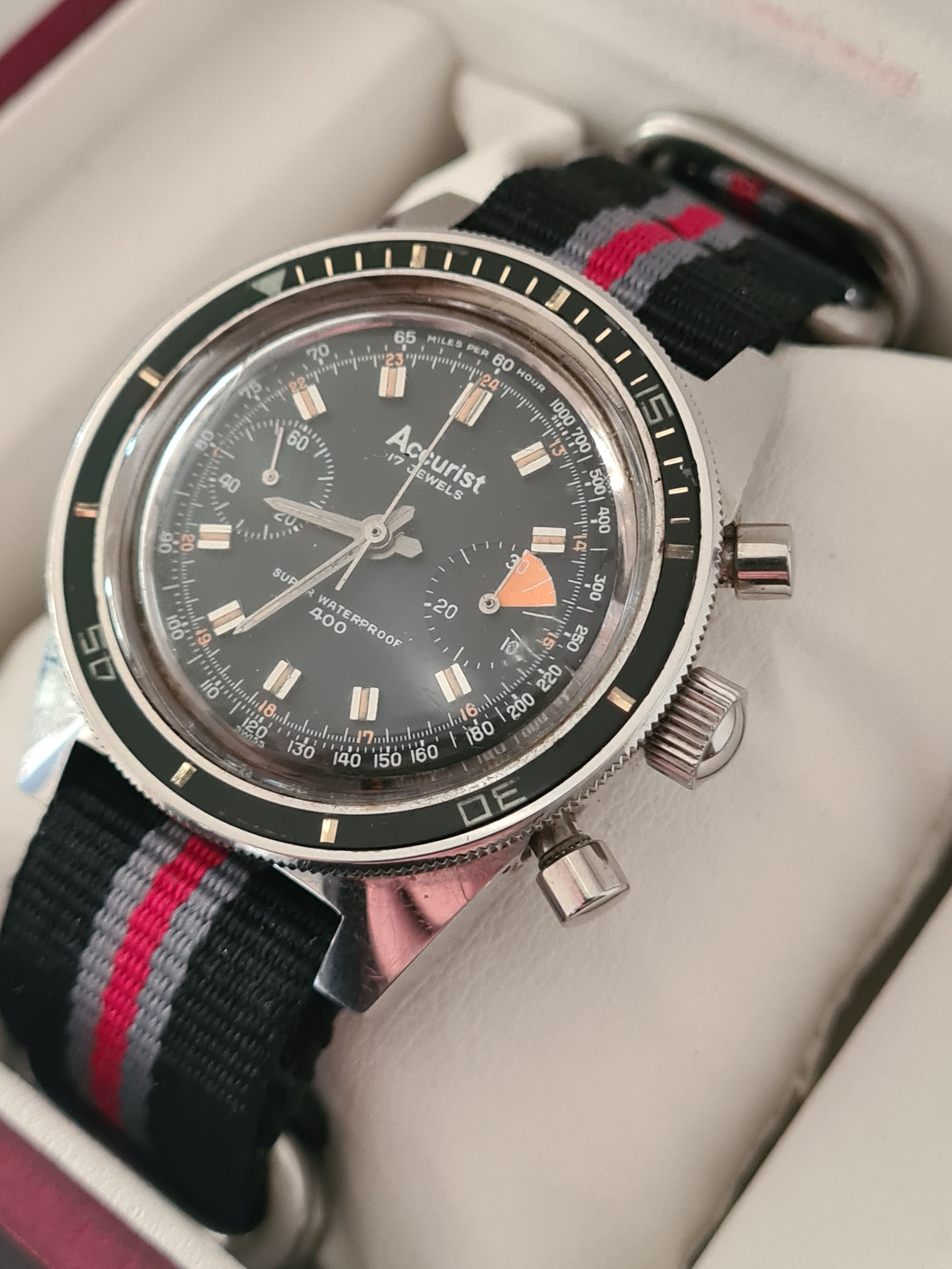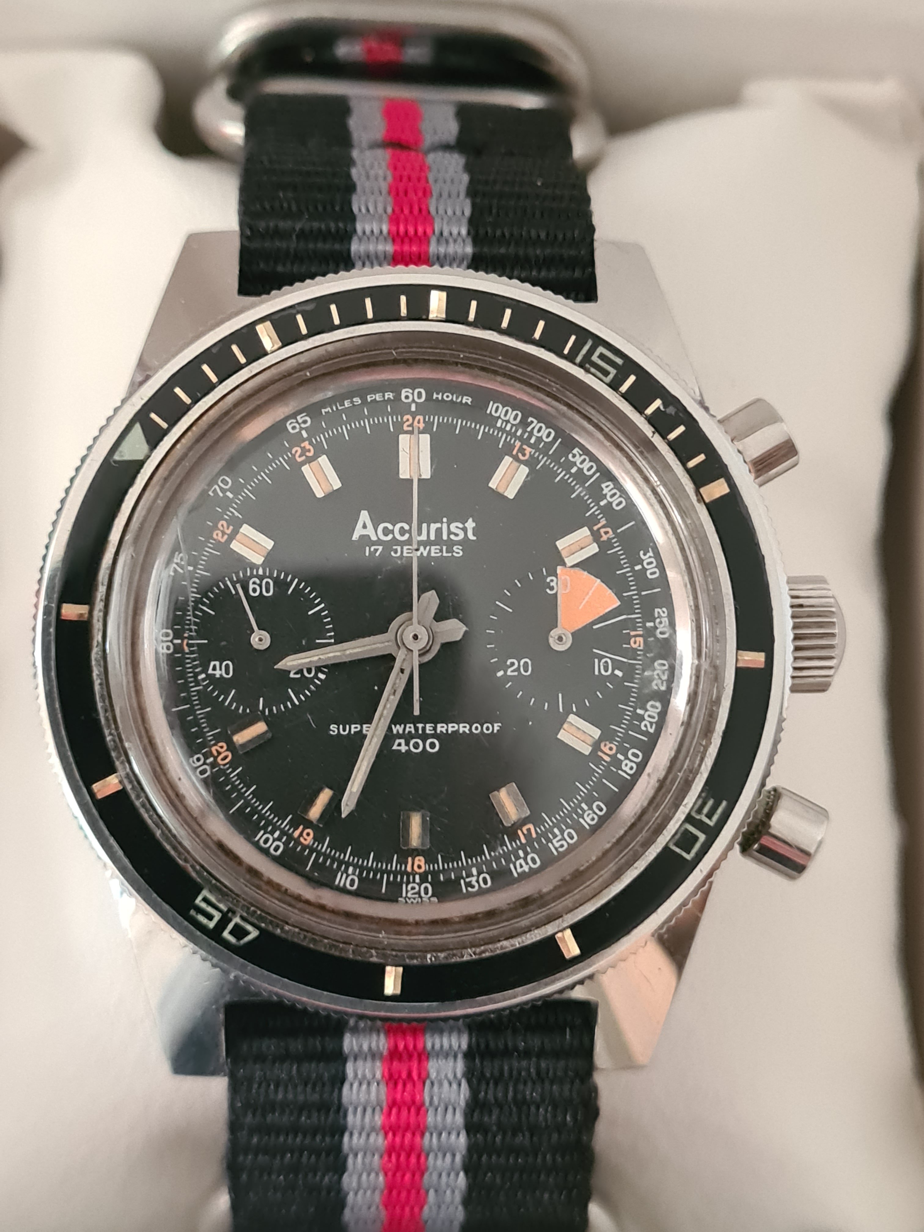 ·On offer from my personal collection is an Accurist Super Waterproof 400 chronograph dating to the early 1960s. The entire watch is all original, keeping good time, and in excellent condition. All steel.