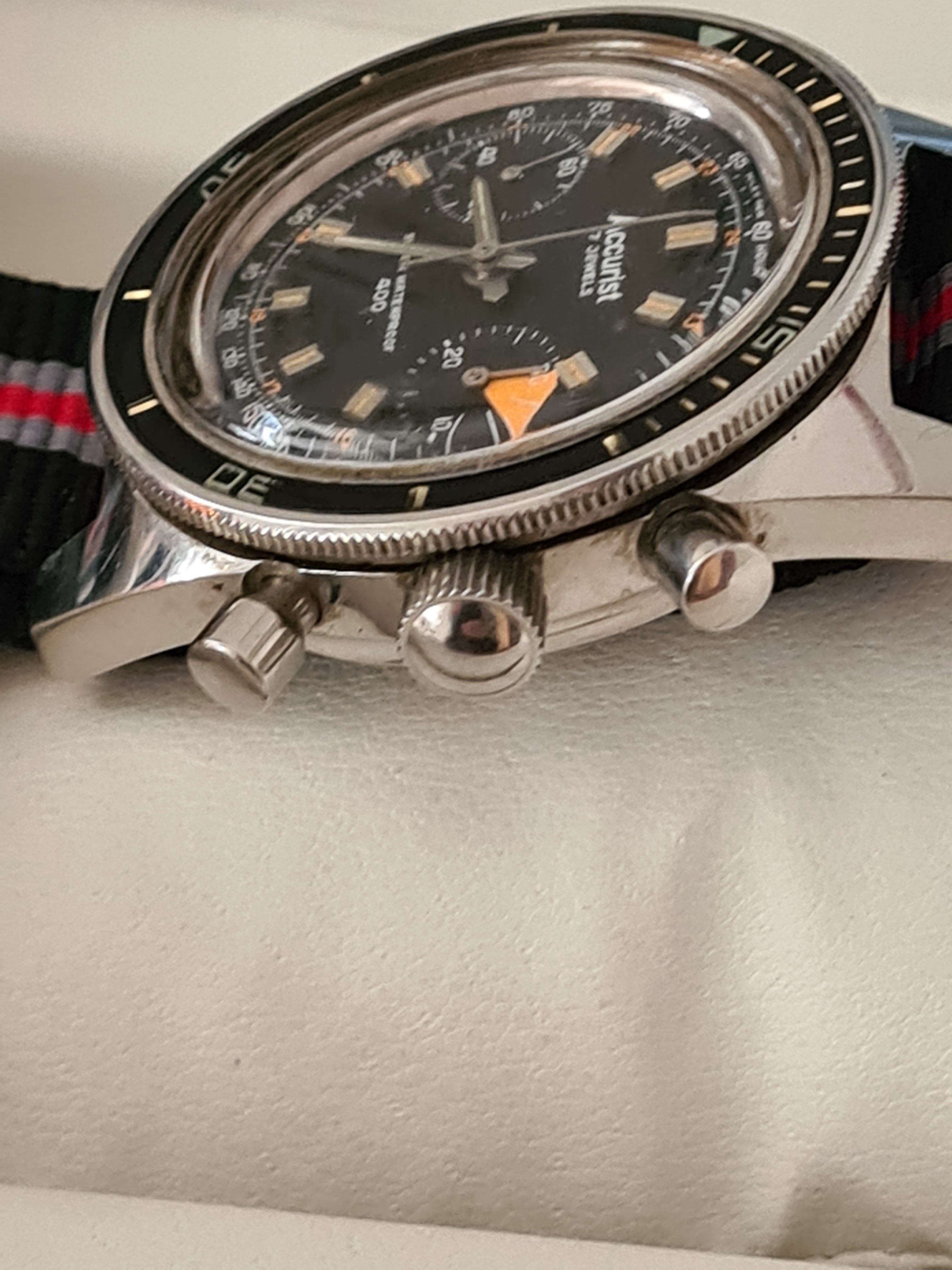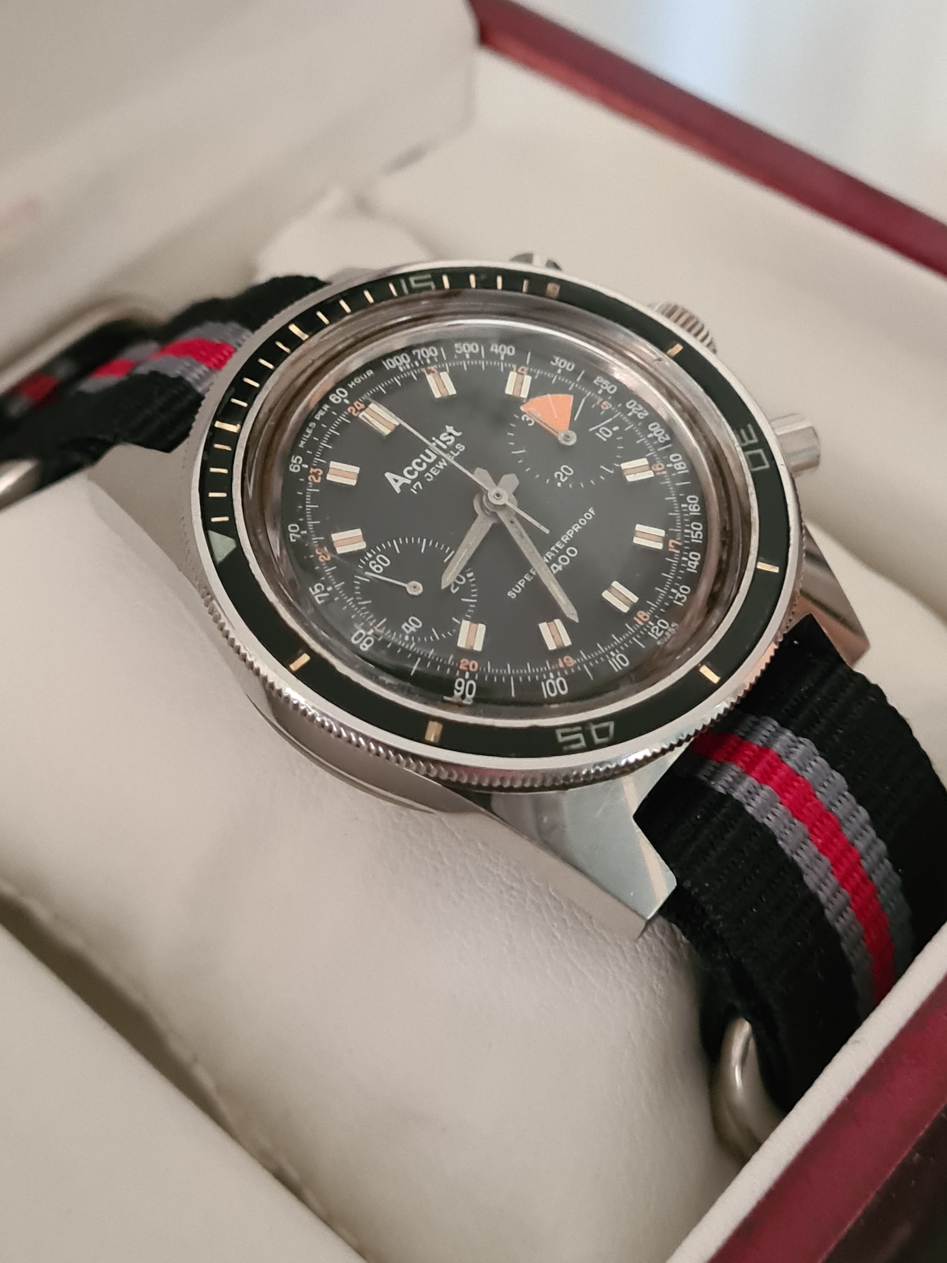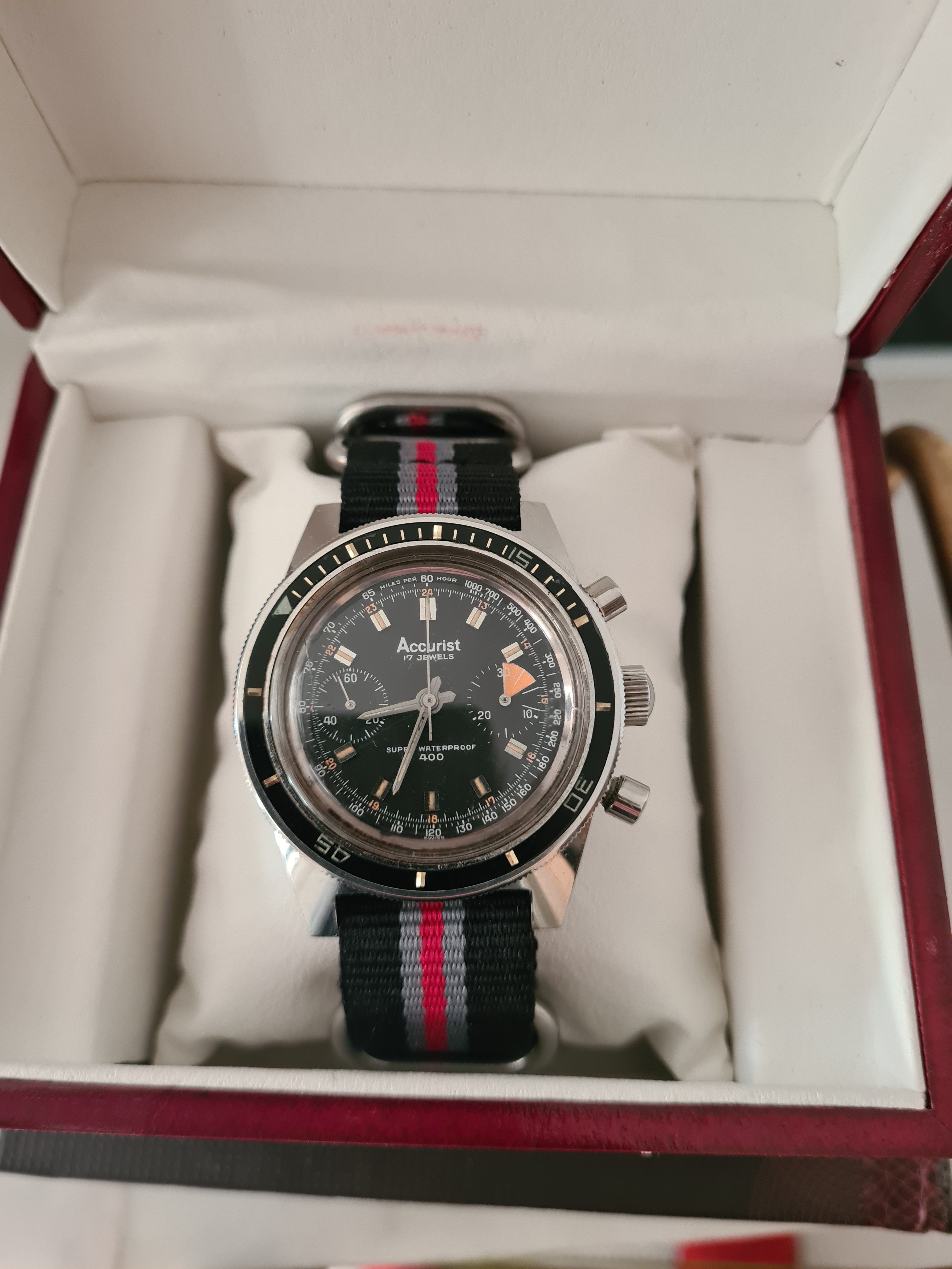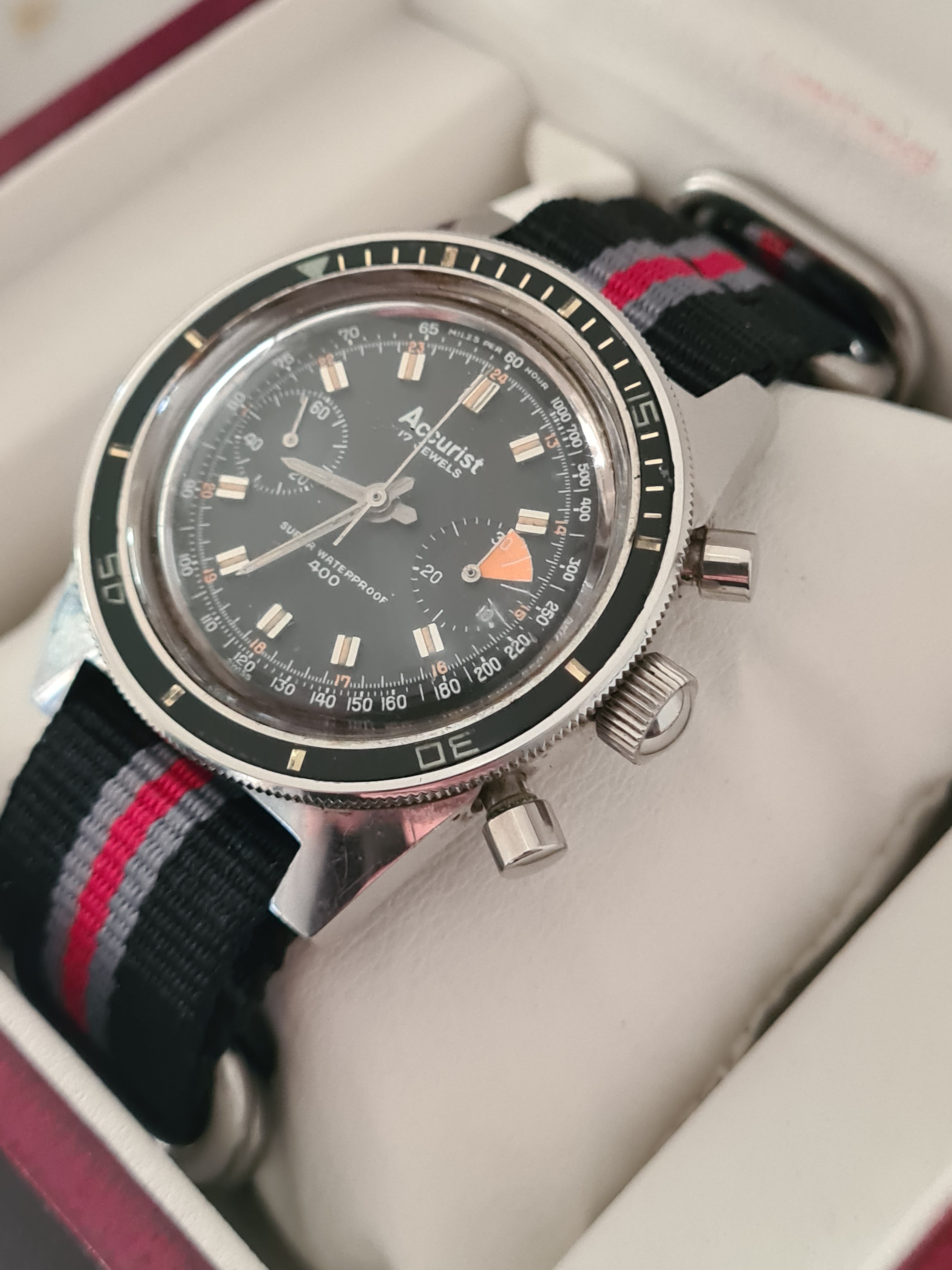 ·On offer from my personal collection is an Accurist Super Waterproof 400 chronograph dating to the early 1960s. The entire watch is all original, keeping good time, and in excellent condition. All steel.