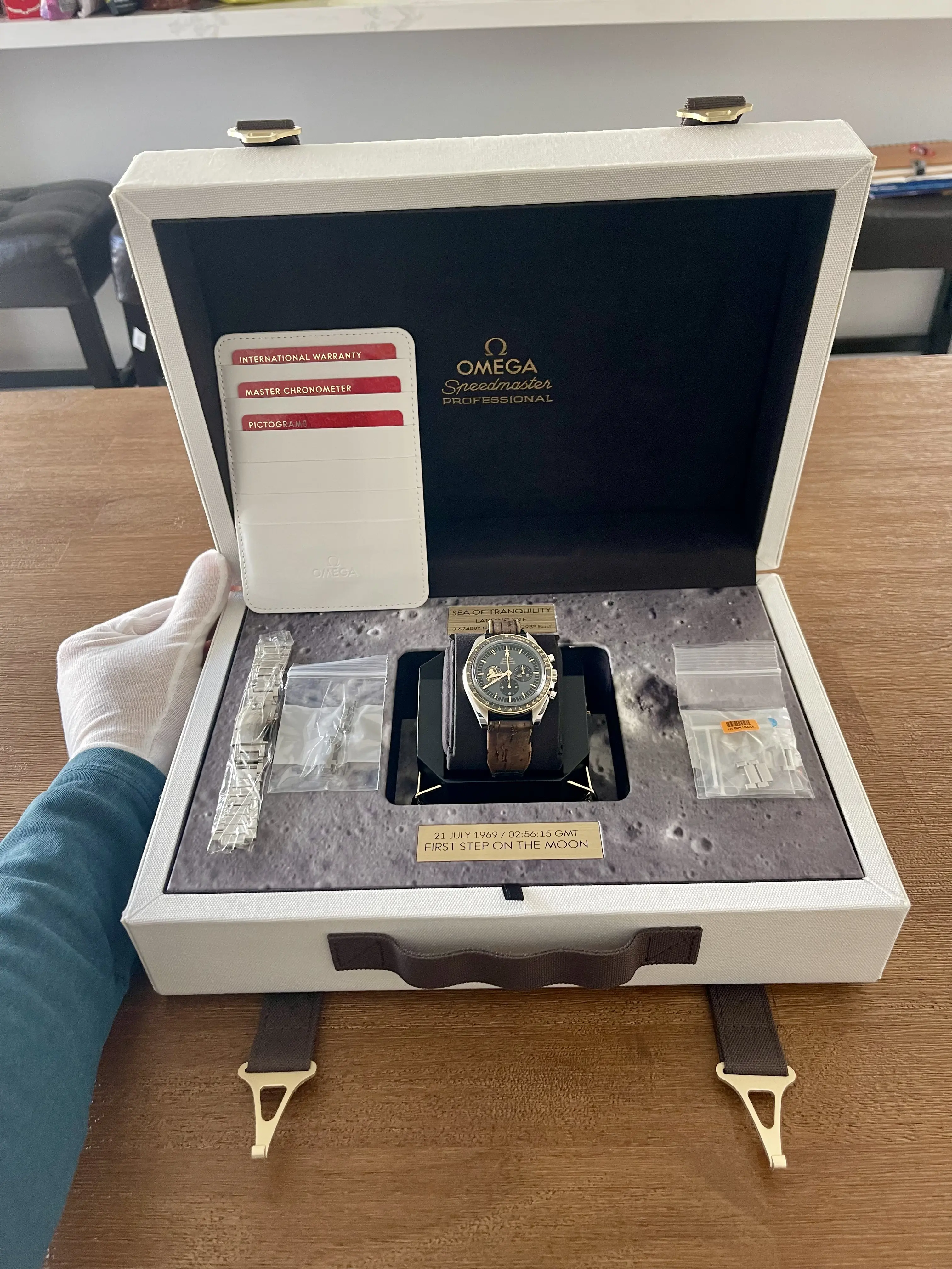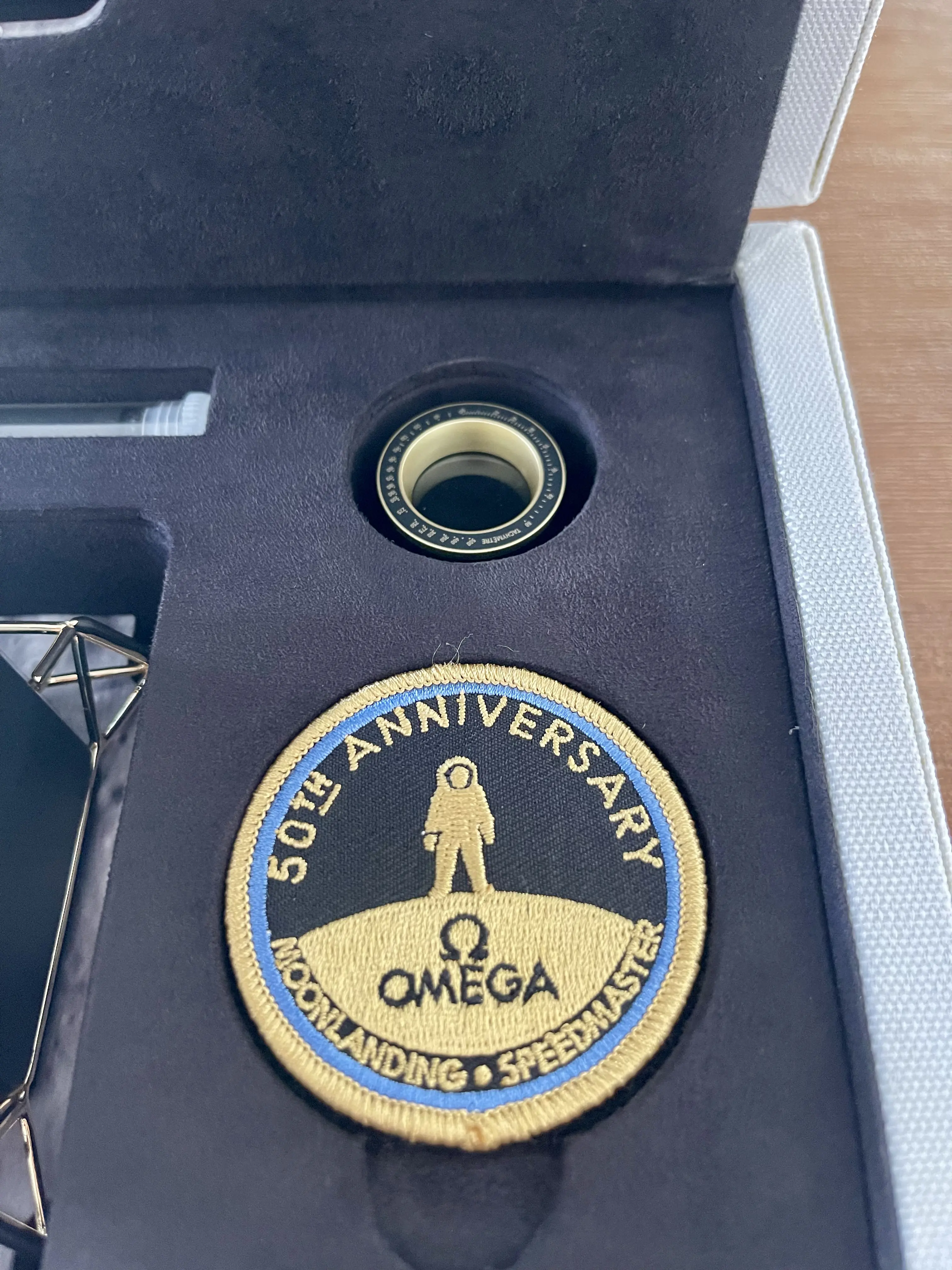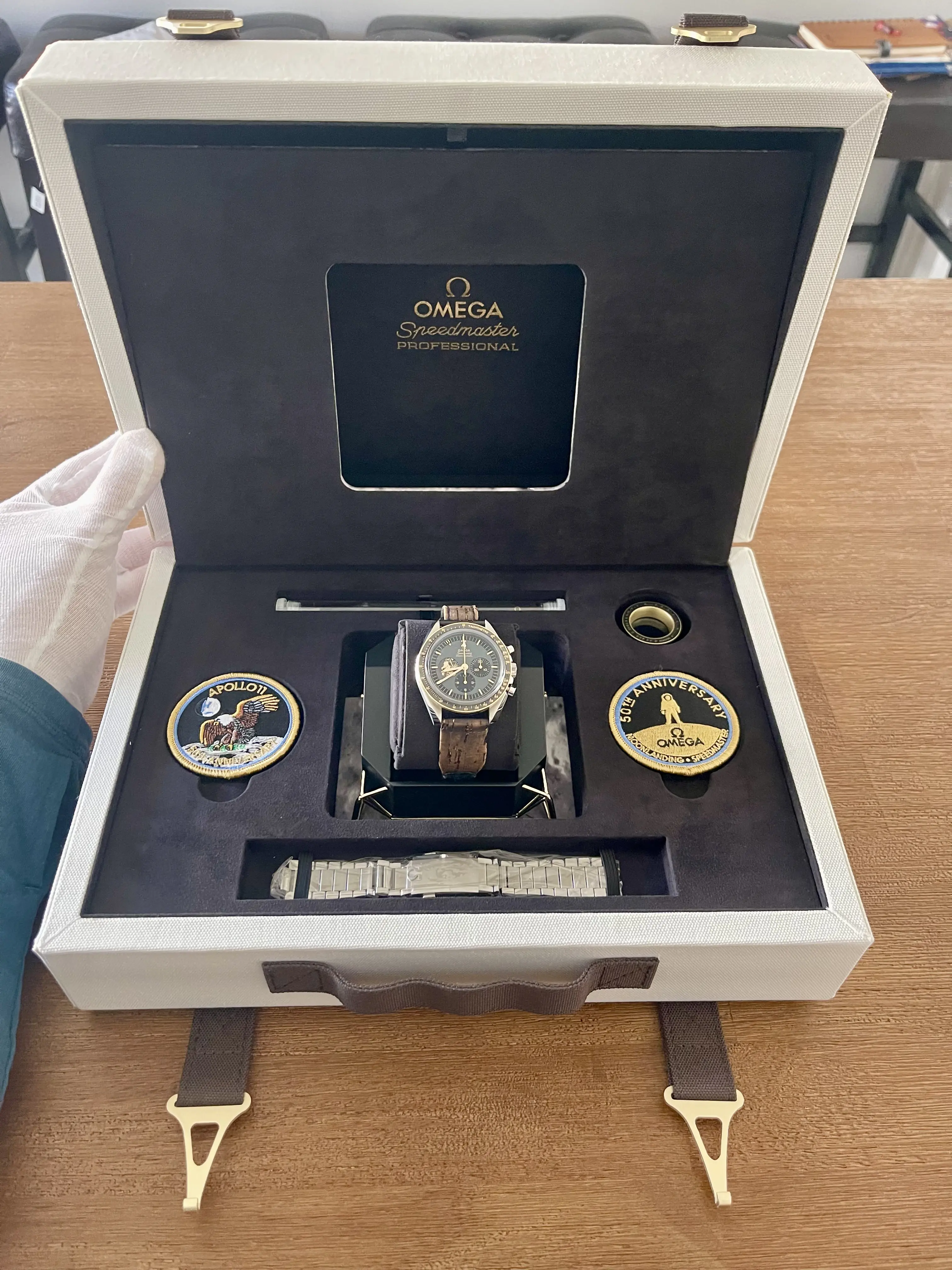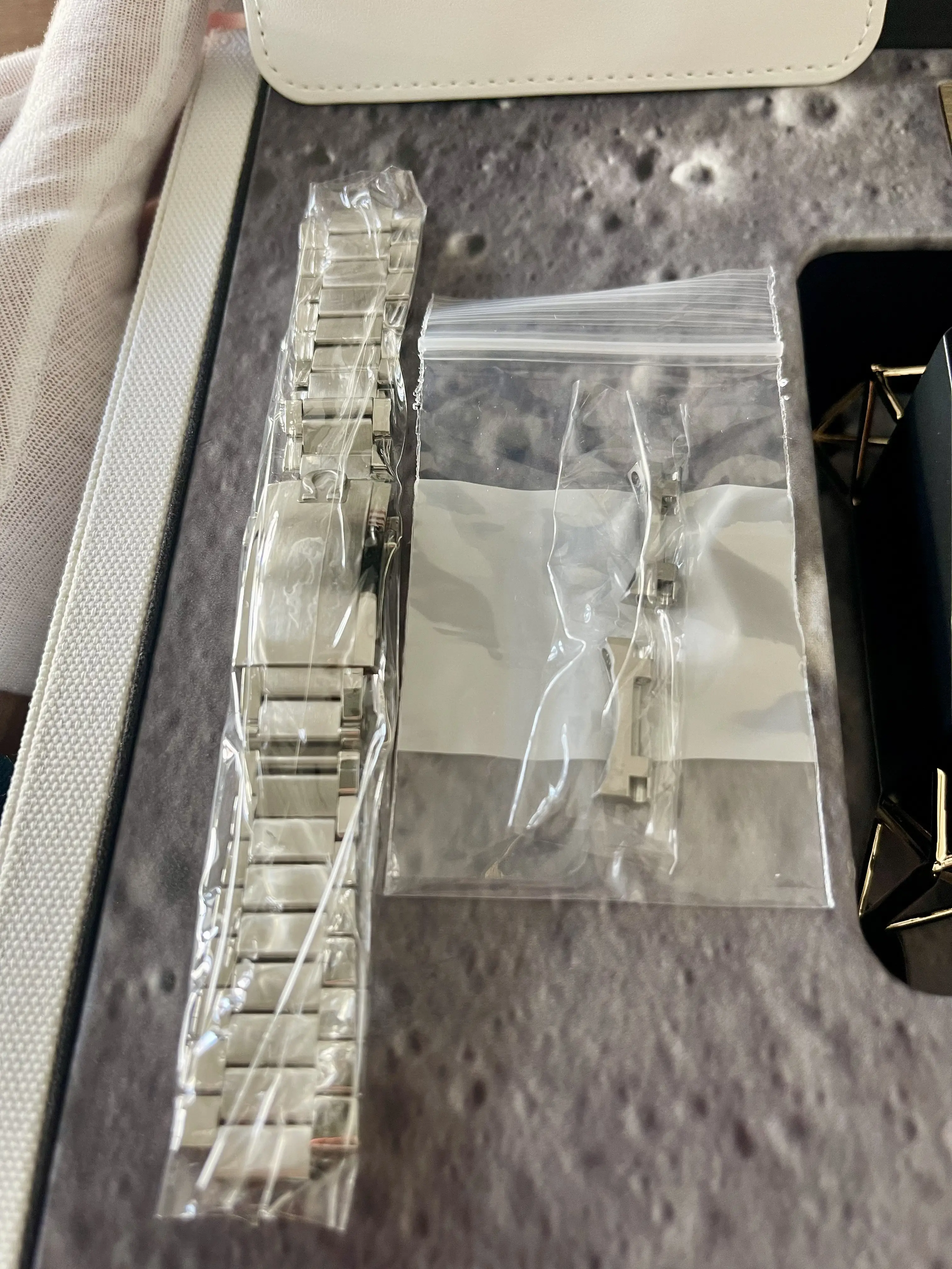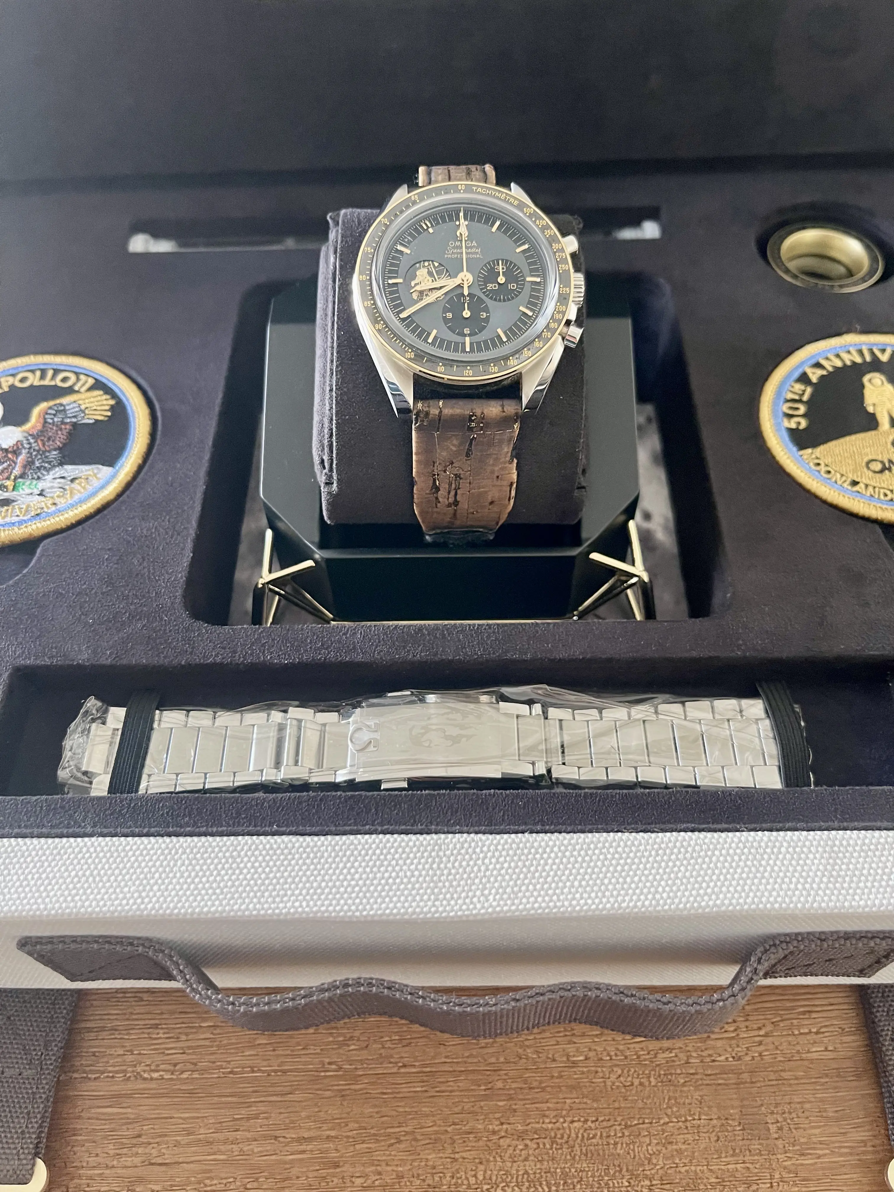 Once again, I am selling a watch to fund a house project...being a new homeowner is expensive! That being said, I have an Omega Speedmaster Apollo 11 50th Anniverary with an extra Black Omega Cleaning Cloth & an Omega Apollo 11 50th Anniversary Pen that was given out at launch. This watch was purchased from an Omega Boutique (OB) Oct 2019, & I am the only owner. There are no visible scratches that I can see. I wore the watch on the flat link bracelet for about a month, but then switched out to the cork strap at the OB. The bracelet has been wrapped in plastic ever since. This watch was worn in a rotation of 8 other watches that I own.