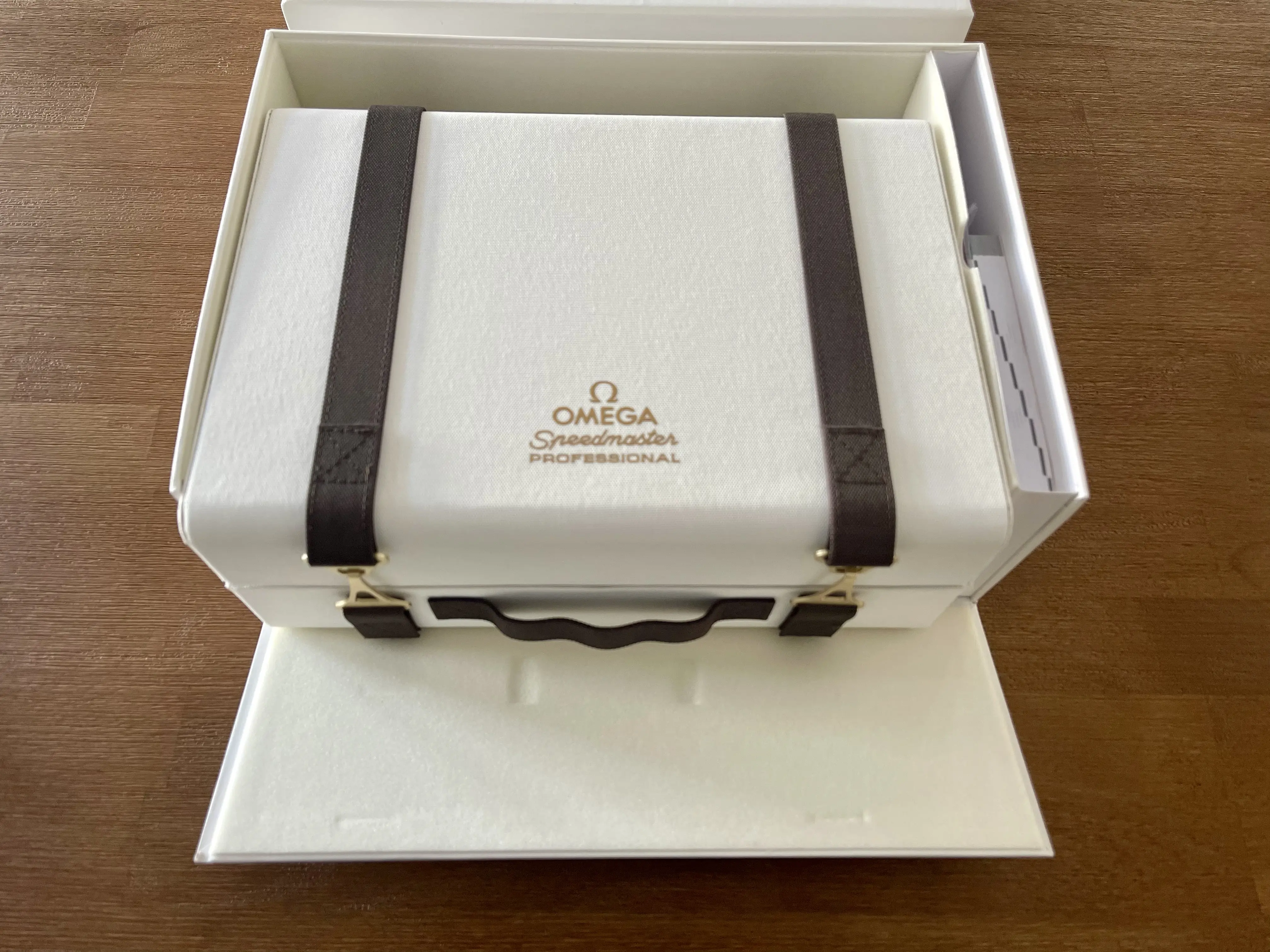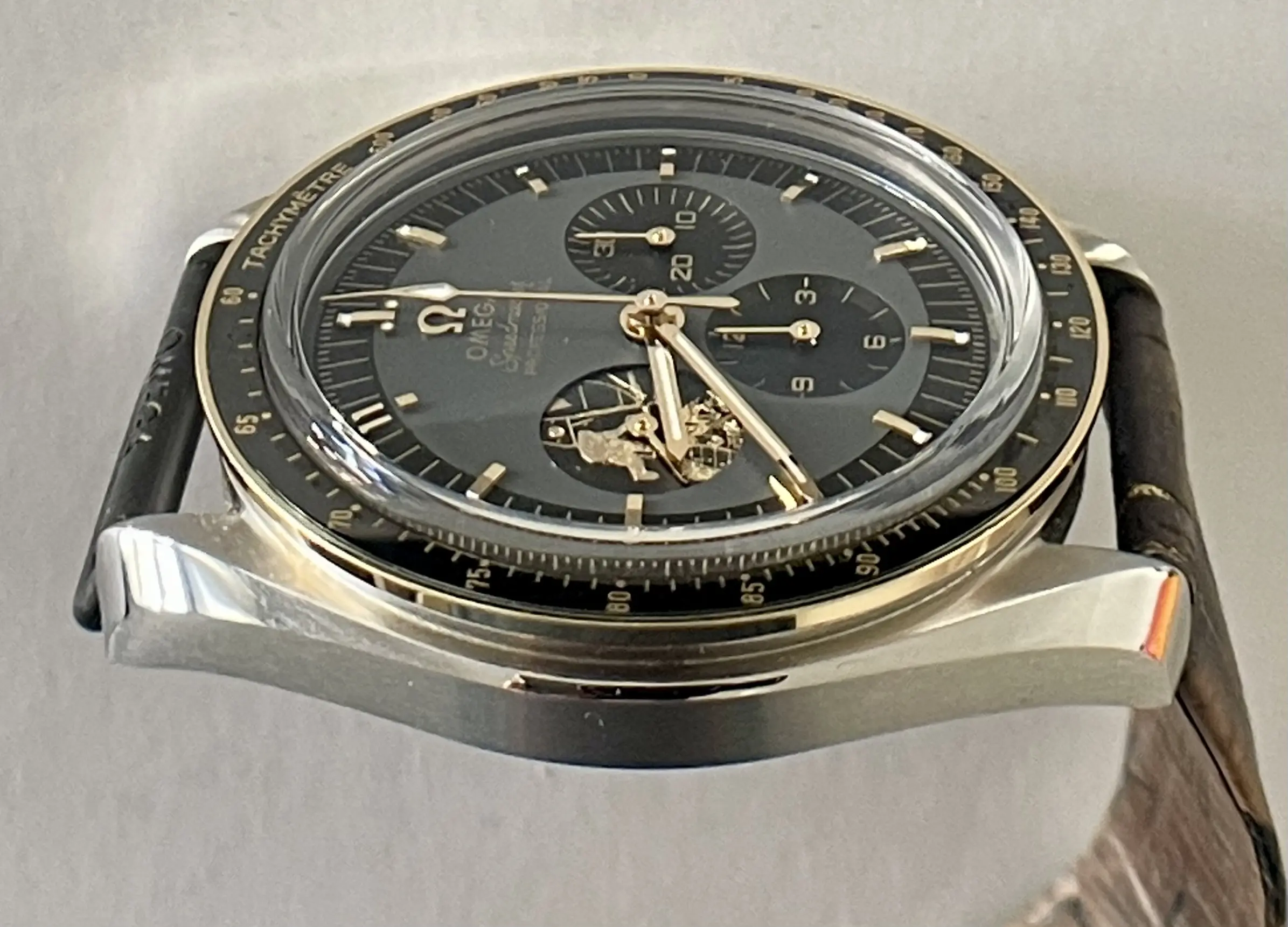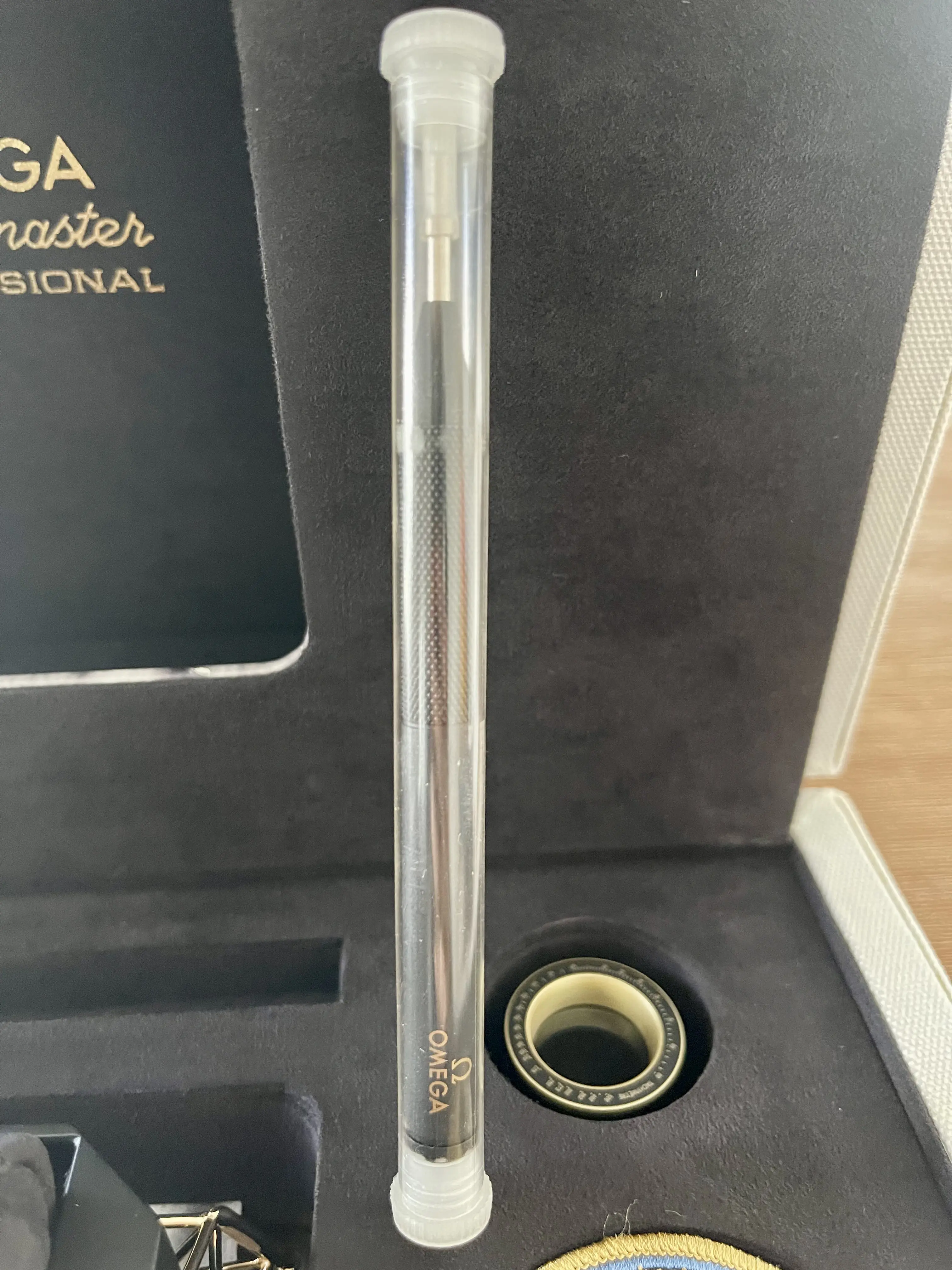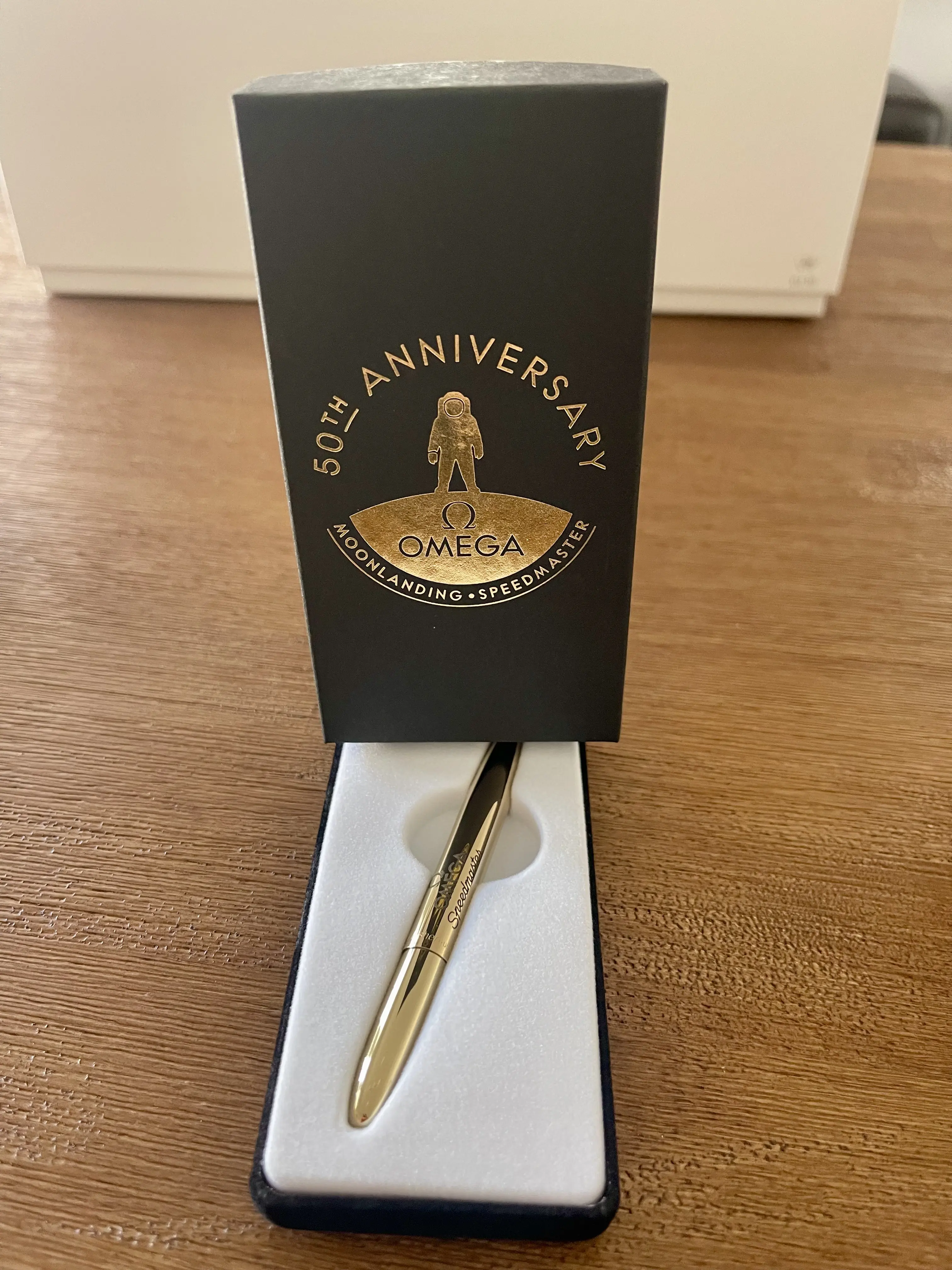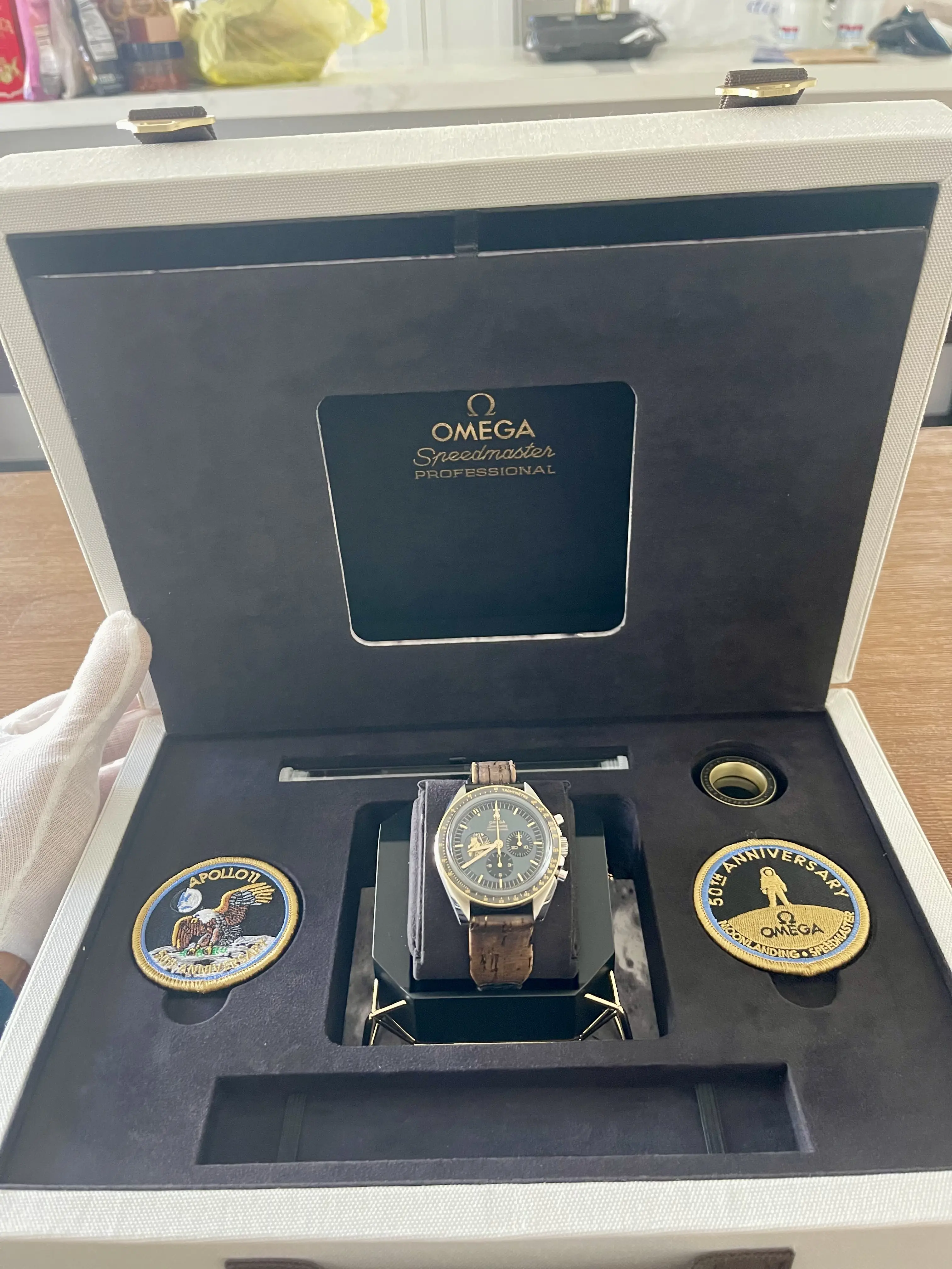 Once again, I am selling a watch to fund a house project...being a new homeowner is expensive! That being said, I have an Omega Speedmaster Apollo 11 50th Anniverary with an extra Black Omega Cleaning Cloth & an Omega Apollo 11 50th Anniversary Pen that was given out at launch. This watch was purchased from an Omega Boutique (OB) Oct 2019, & I am the only owner. There are no visible scratches that I can see. I wore the watch on the flat link bracelet for about a month, but then switched out to the cork strap at the OB. The bracelet has been wrapped in plastic ever since. This watch was worn in a rotation of 8 other watches that I own.