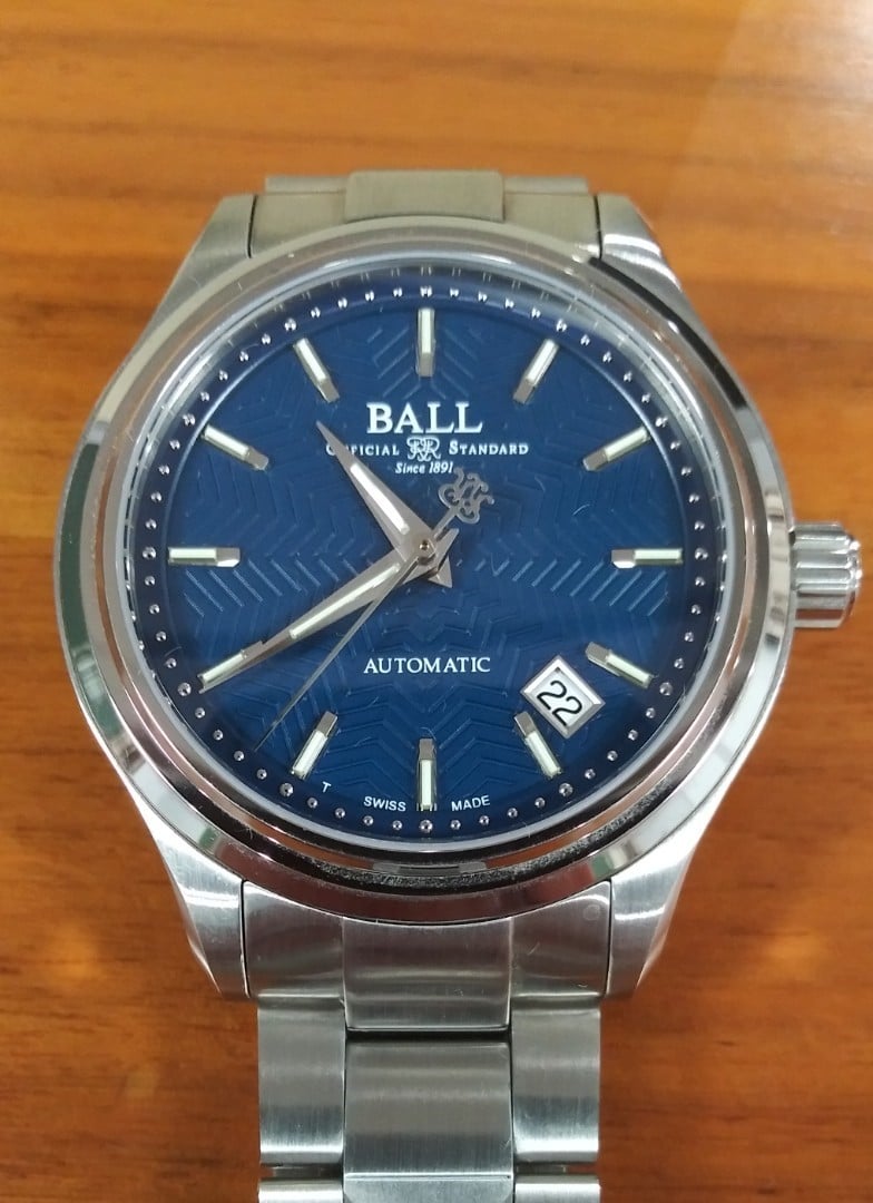 Stainless steel case with a stainless steel bracelet. Fixed stainless steel bezel. Blue textured dial with luminous silver-tone hands and index hour markers. Minute markers around the outer rim. Tritium tubes on the hands and markers. Date display between the 4 and 5 o'clock positions. BALL calibre RR-1103 automatic movement. Scratch resistant sapphire crystal. Screw down crown. Round case. Case size: 39 mm. Case thickness: 11 mm. Butterfly clasp. Water resistant at 50 meters / 165 feet. Functions: date, hour, minute, second. Trainmaster Series. Swiss Made. Ball Trainmaster Automatic Blue Dial Men's Watch NM1060D-S5-BE. Remainder of 4 year warranty.
