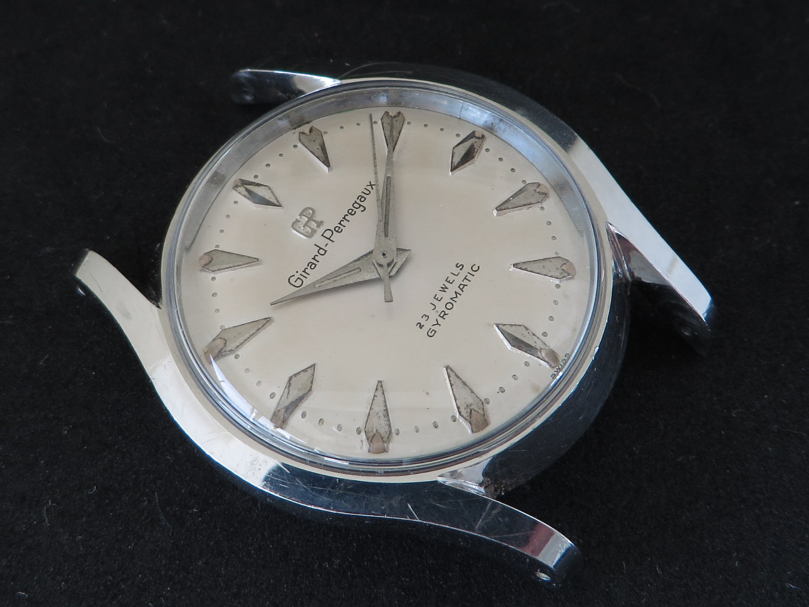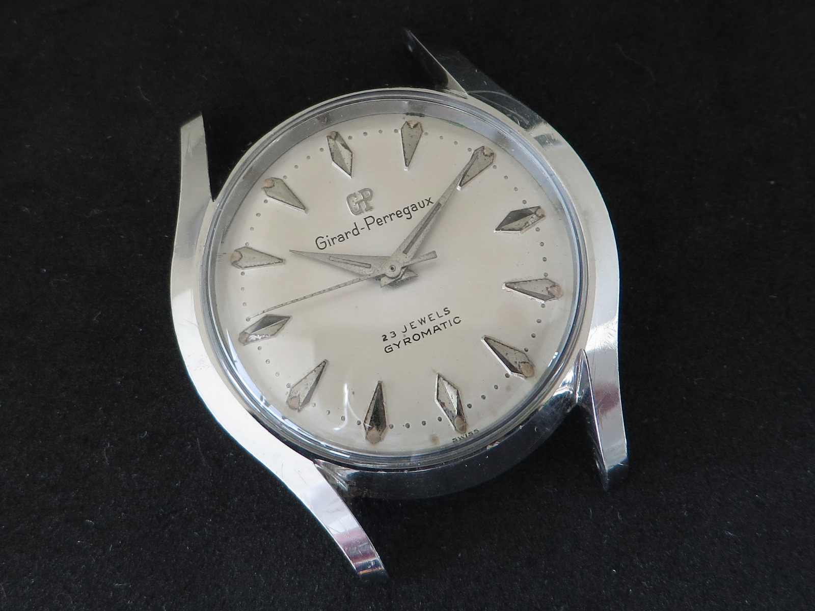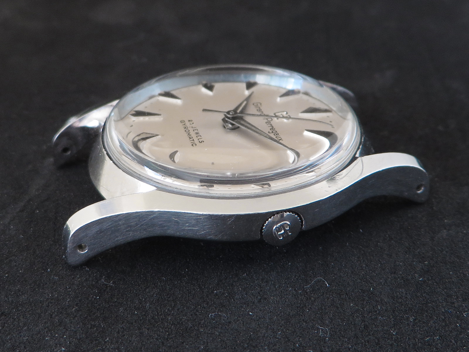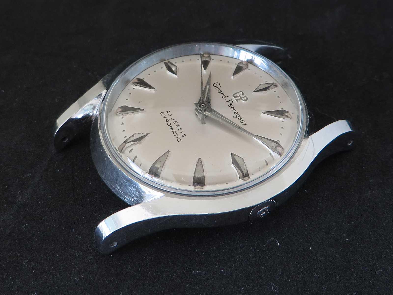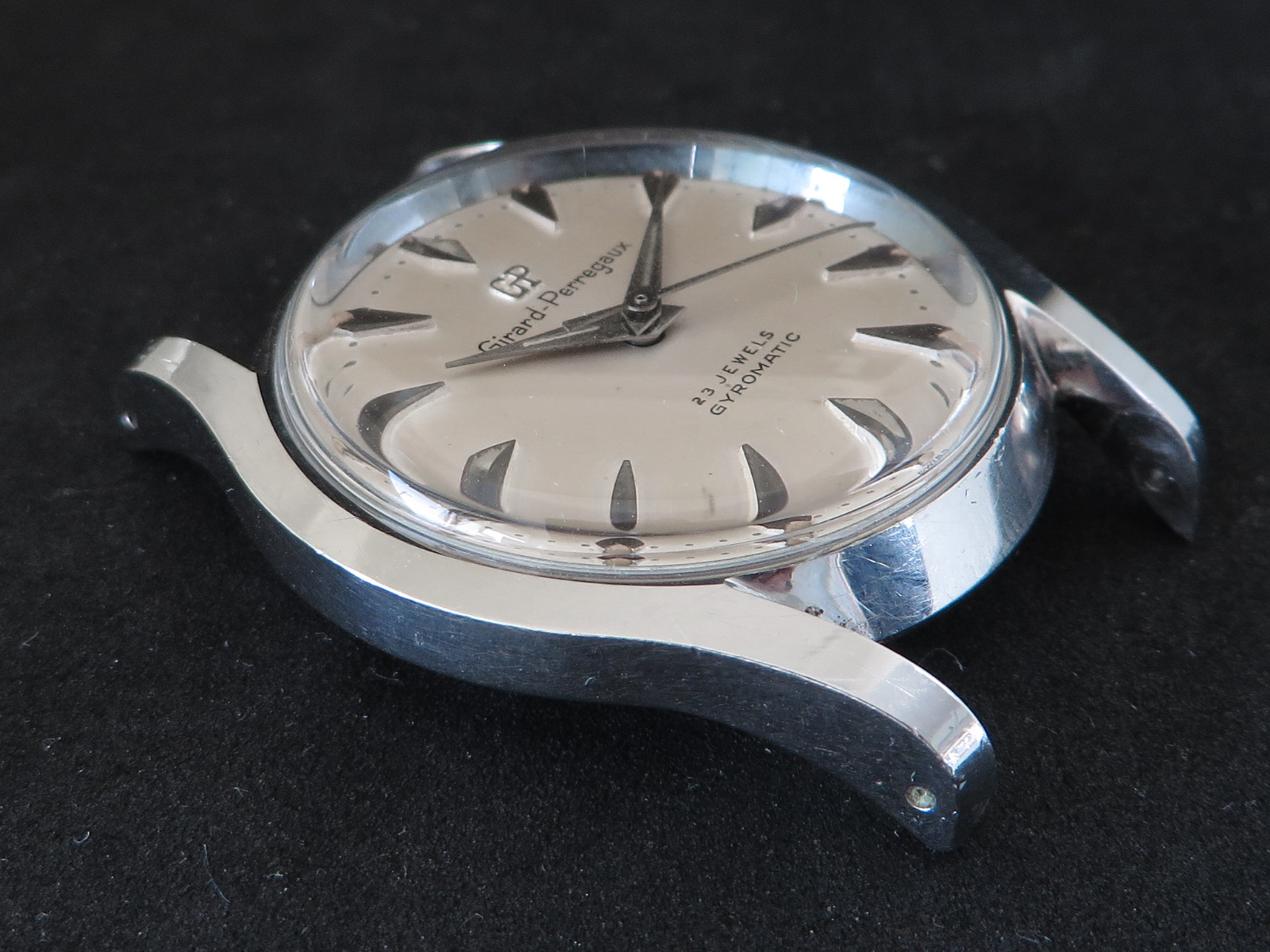 Unusual stainless steel screw back case with fancy Bombe lugs and GP signed hidden crown.