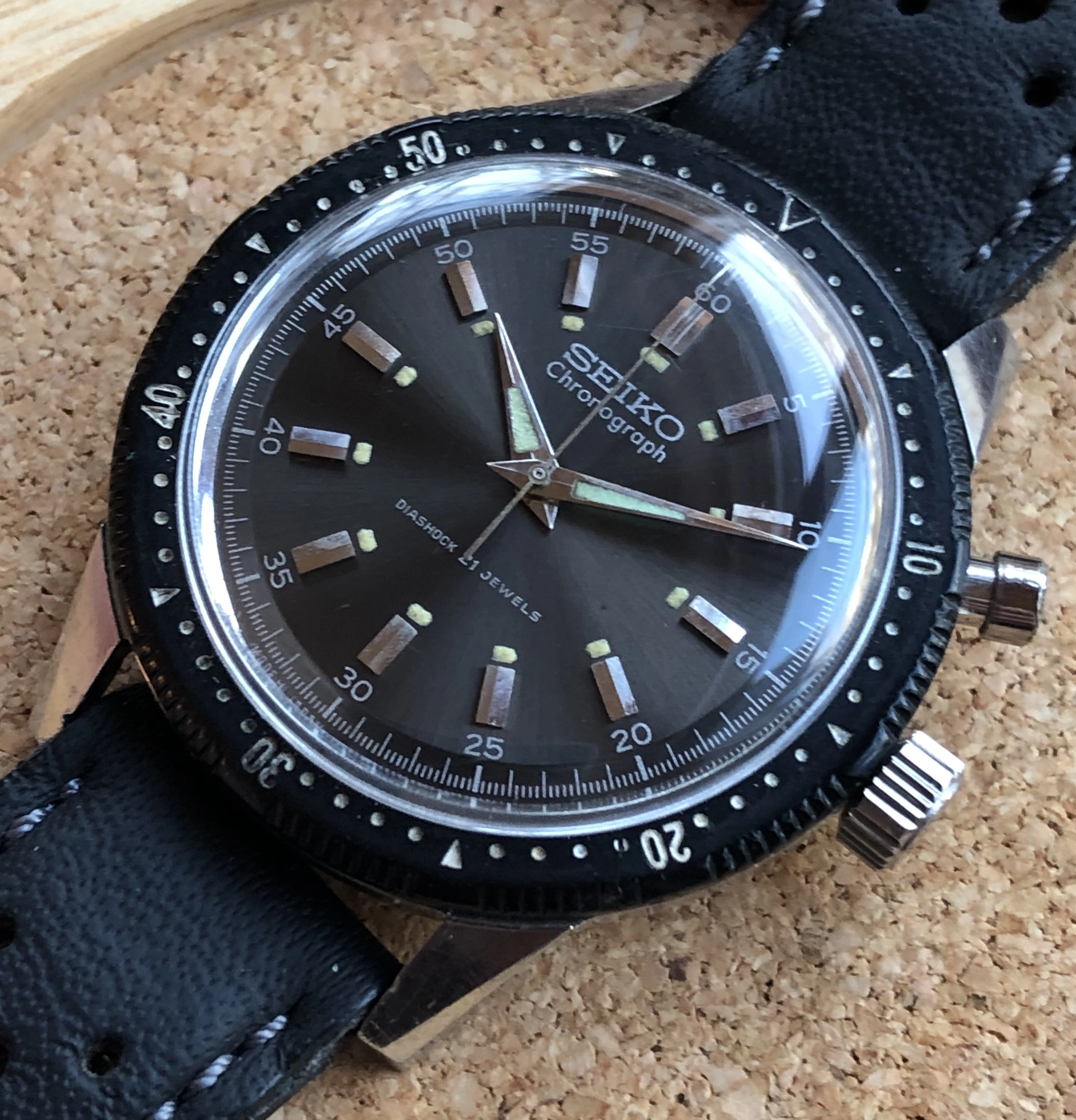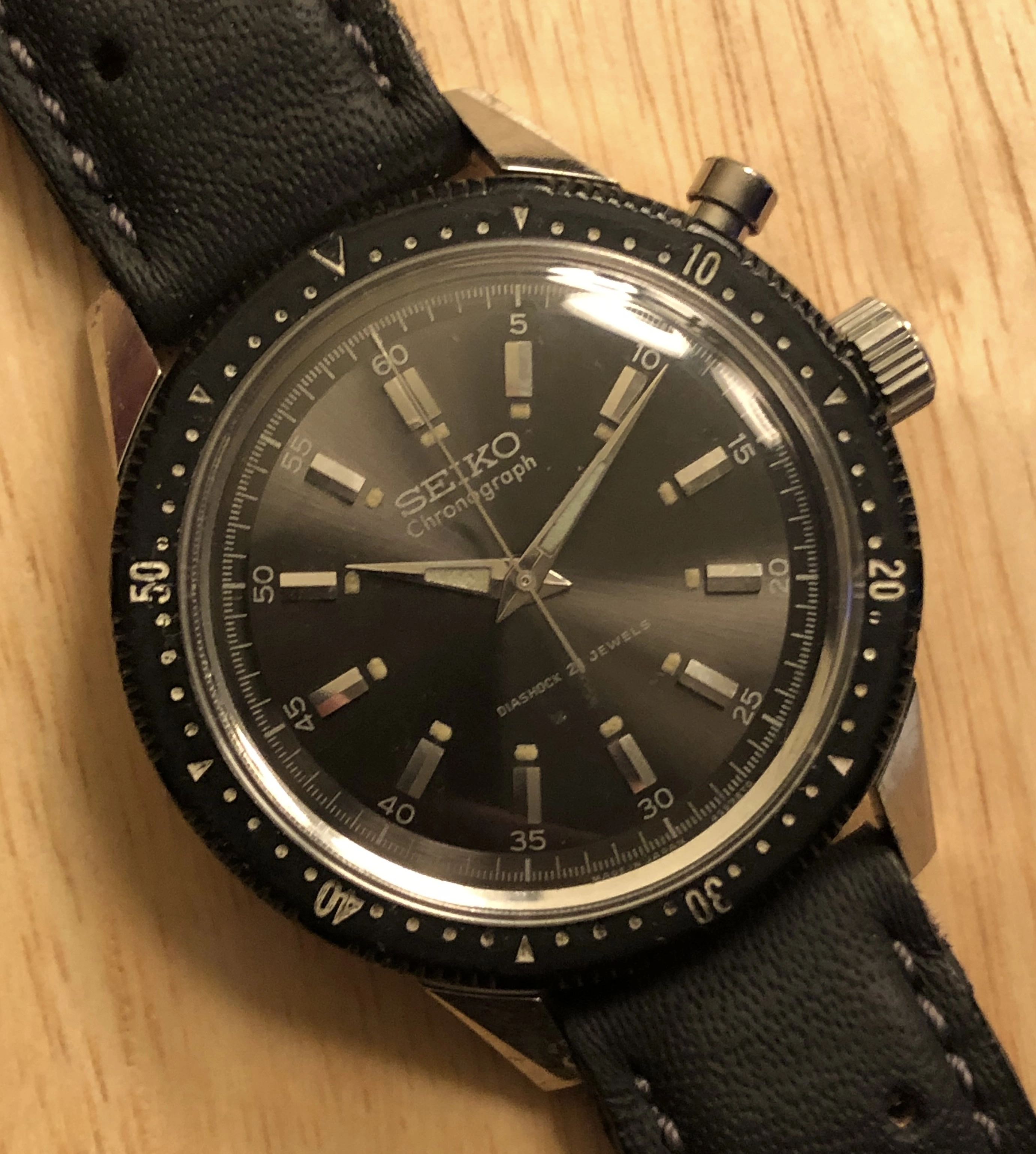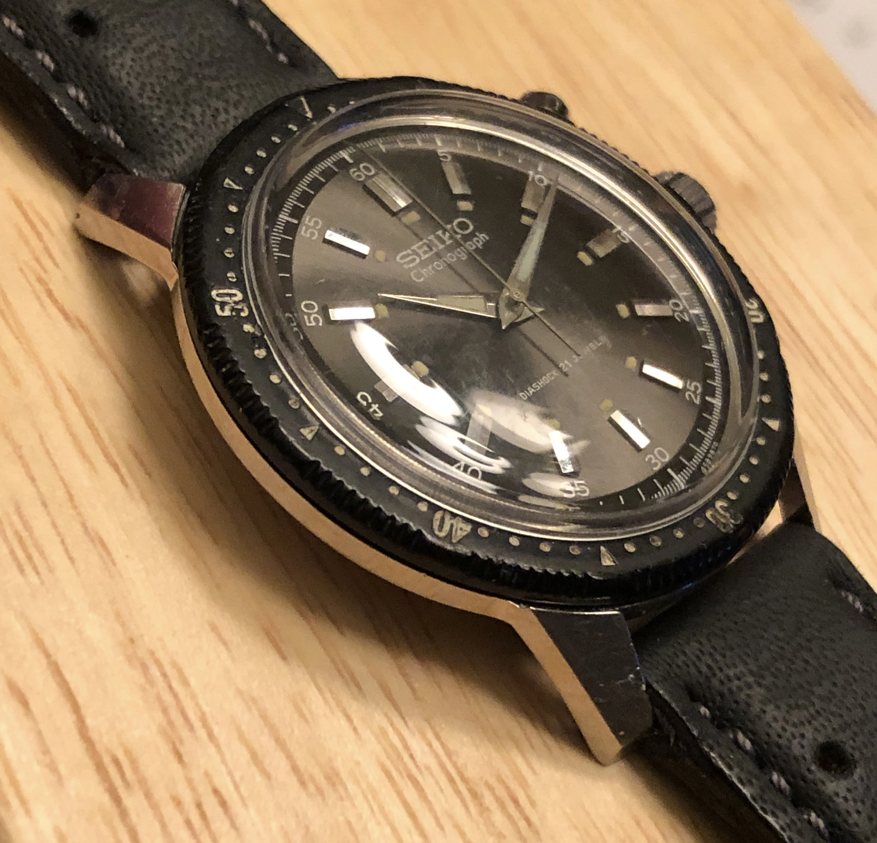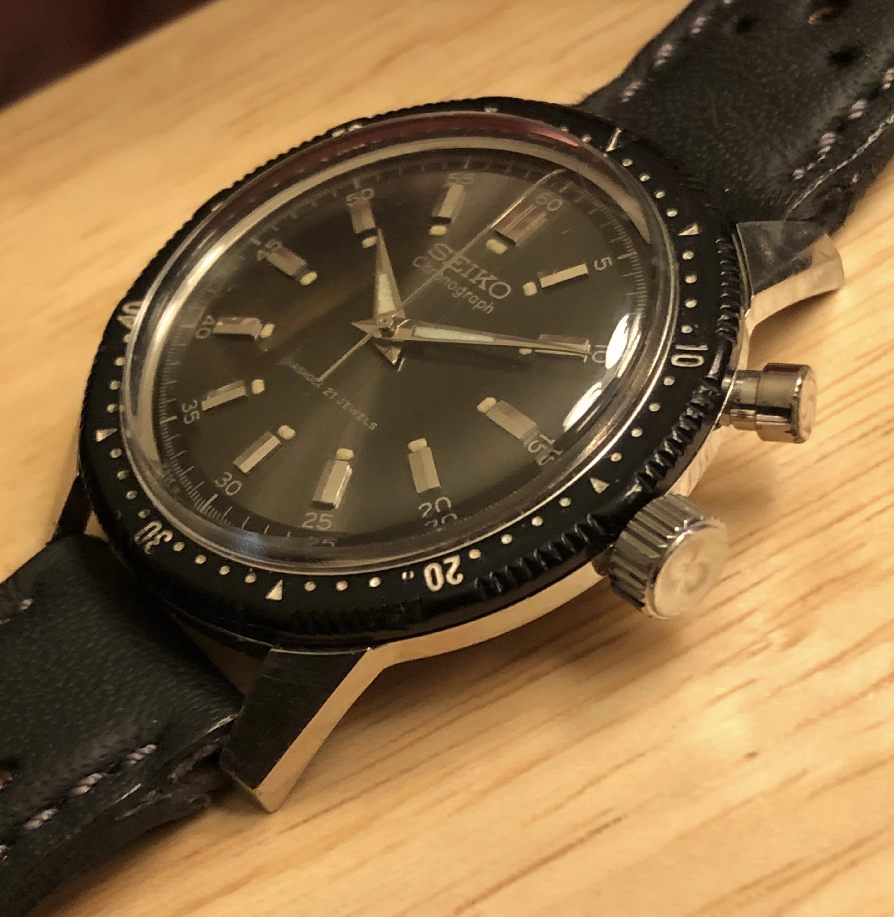 ·For sale is a 1964 ref 45899 hand-winding Seiko monopusher chronograph. This was Seiko's first chronograph, released for the 1964 Tokyo Olympics with the Olympic torch on the back. This is a very good example IMO, with a beautiful sunburst charcoal dial and clean lume plots and hands. Notably, the watch retains its original intact bakelite bezel (rotating smoothly), which was often replaced during service with a stainless service part. The 37mm case is extremely sharp, showing detailed and prominent chamfers. The case-back shows wear that is typical for these shallowly engraved examples. I had the watch serviced in 2021 by Vintage Time Australia (Adrian Sellick) and it is winding, setting, and running.