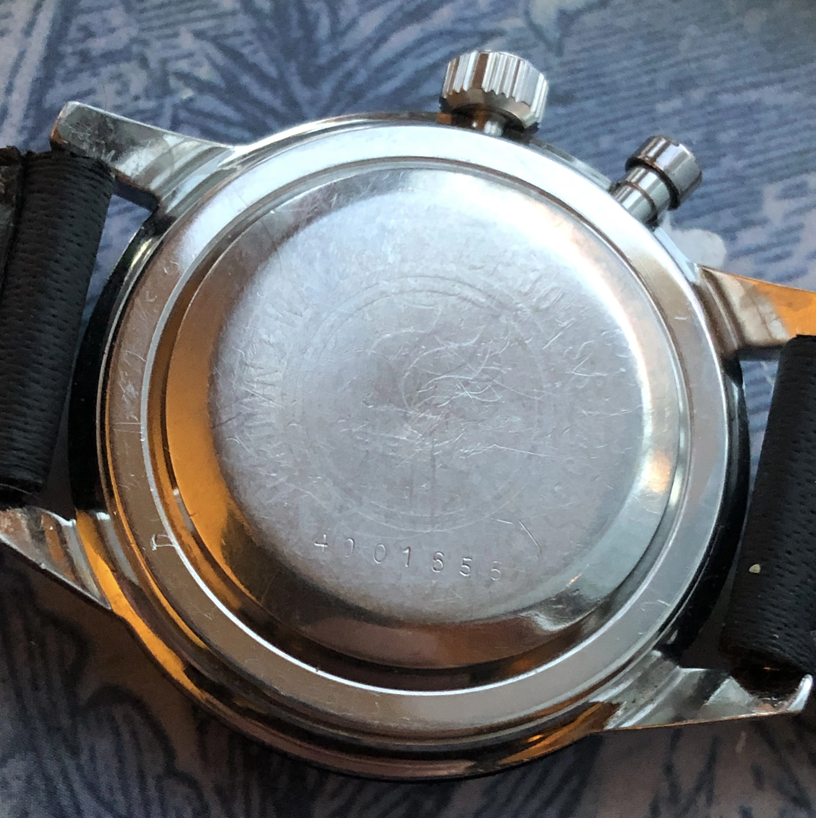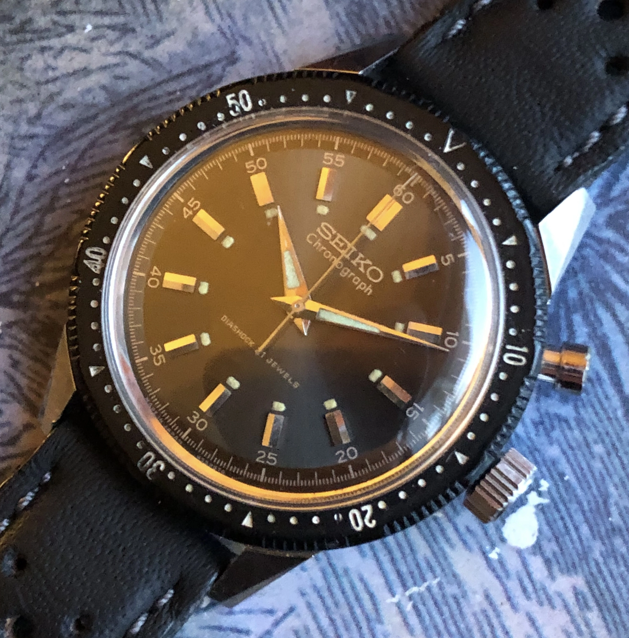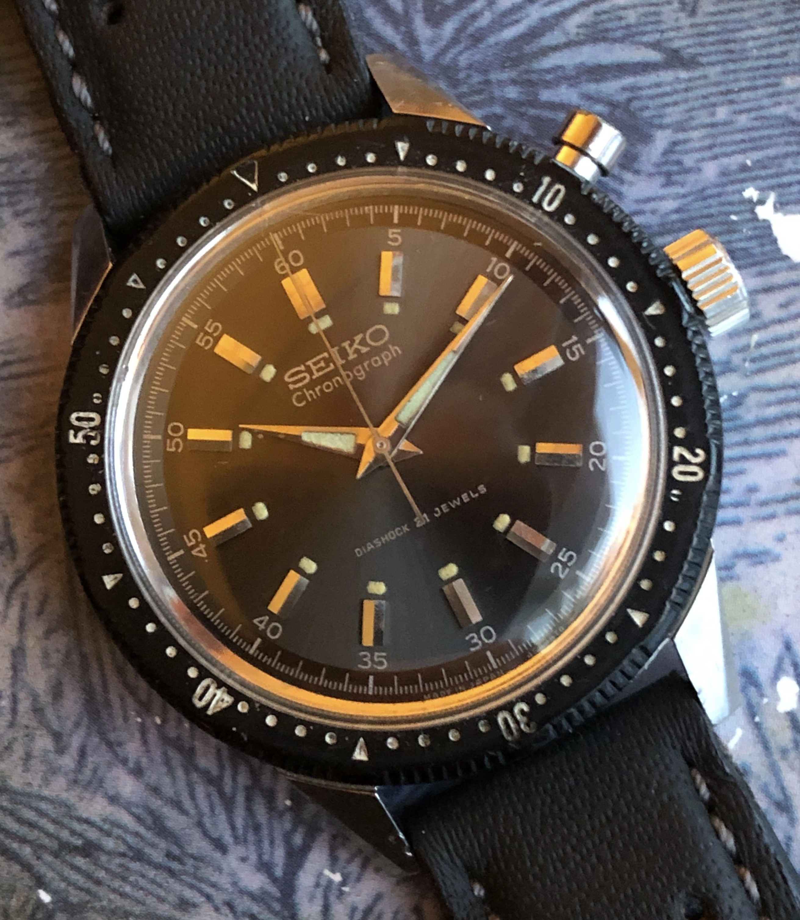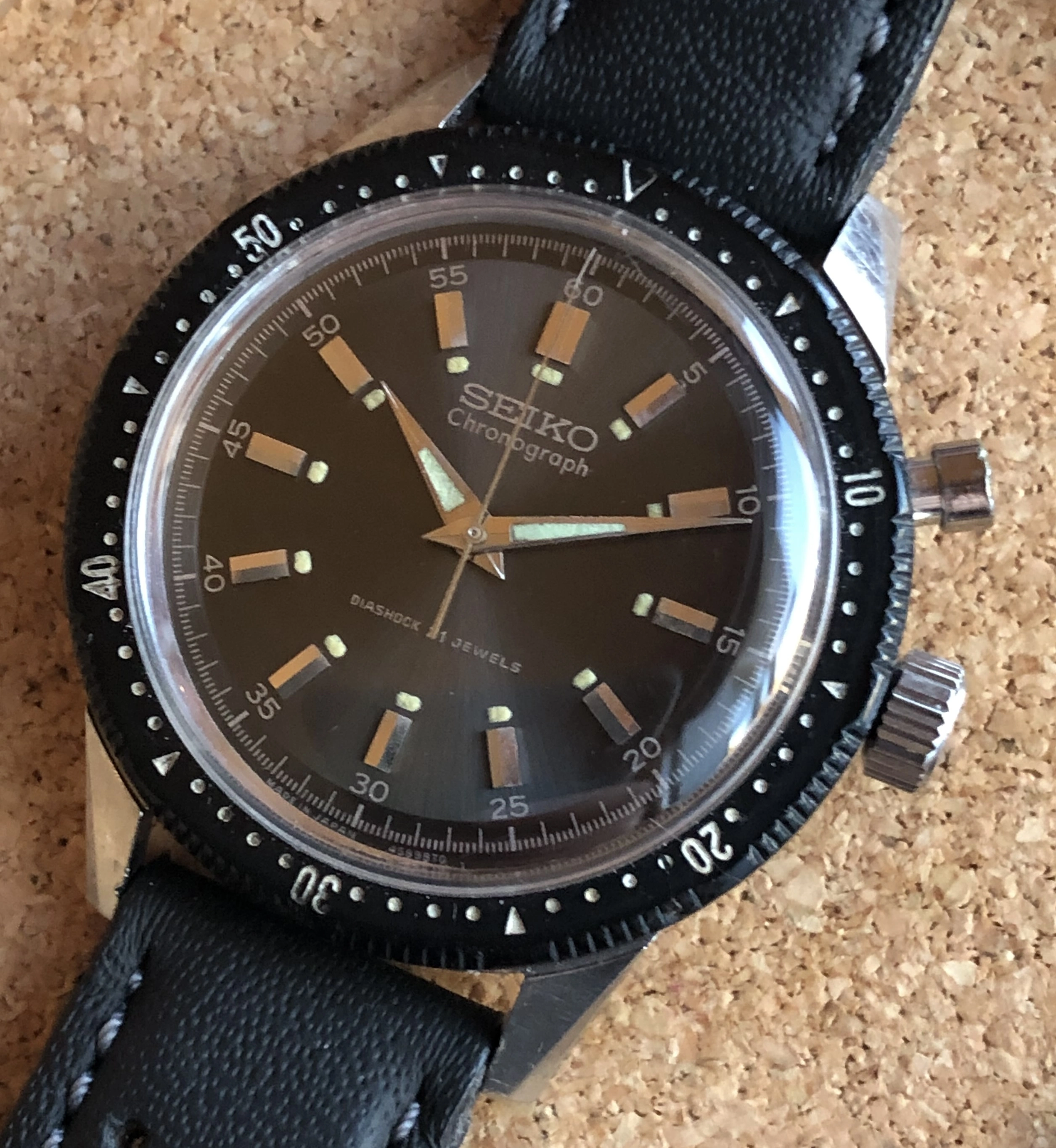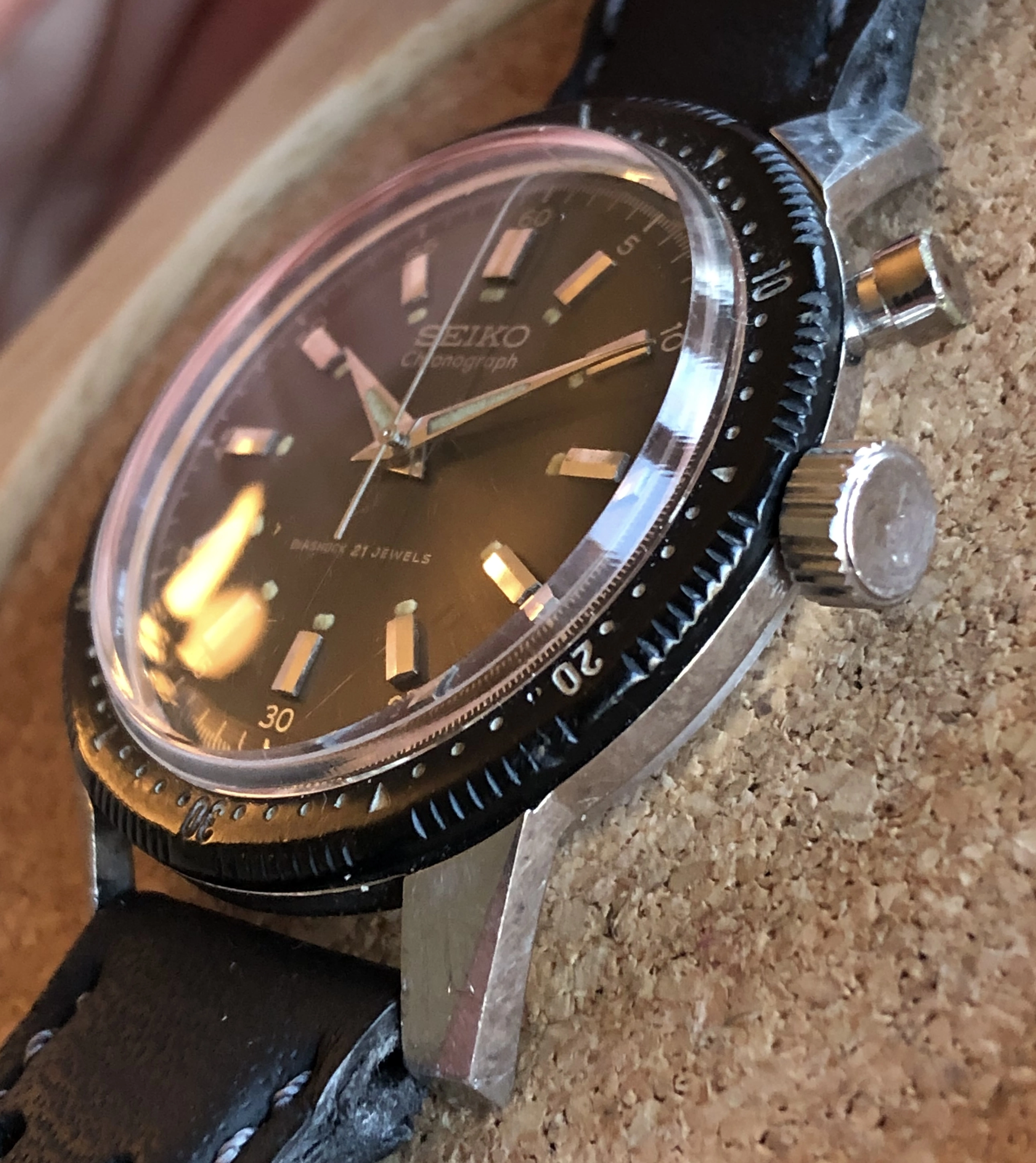 ·For sale is a 1964 ref 45899 hand-winding Seiko monopusher chronograph. This was Seiko's first chronograph, released for the 1964 Tokyo Olympics with the Olympic torch on the back. This is a very good example IMO, with a beautiful sunburst charcoal dial and clean lume plots and hands. Notably, the watch retains its original intact bakelite bezel (rotating smoothly), which was often replaced during service with a stainless service part. The 37mm case is extremely sharp, showing detailed and prominent chamfers. The case-back shows wear that is typical for these shallowly engraved examples. I had the watch serviced in 2021 by Vintage Time Australia (Adrian Sellick) and it is winding, setting, and running.