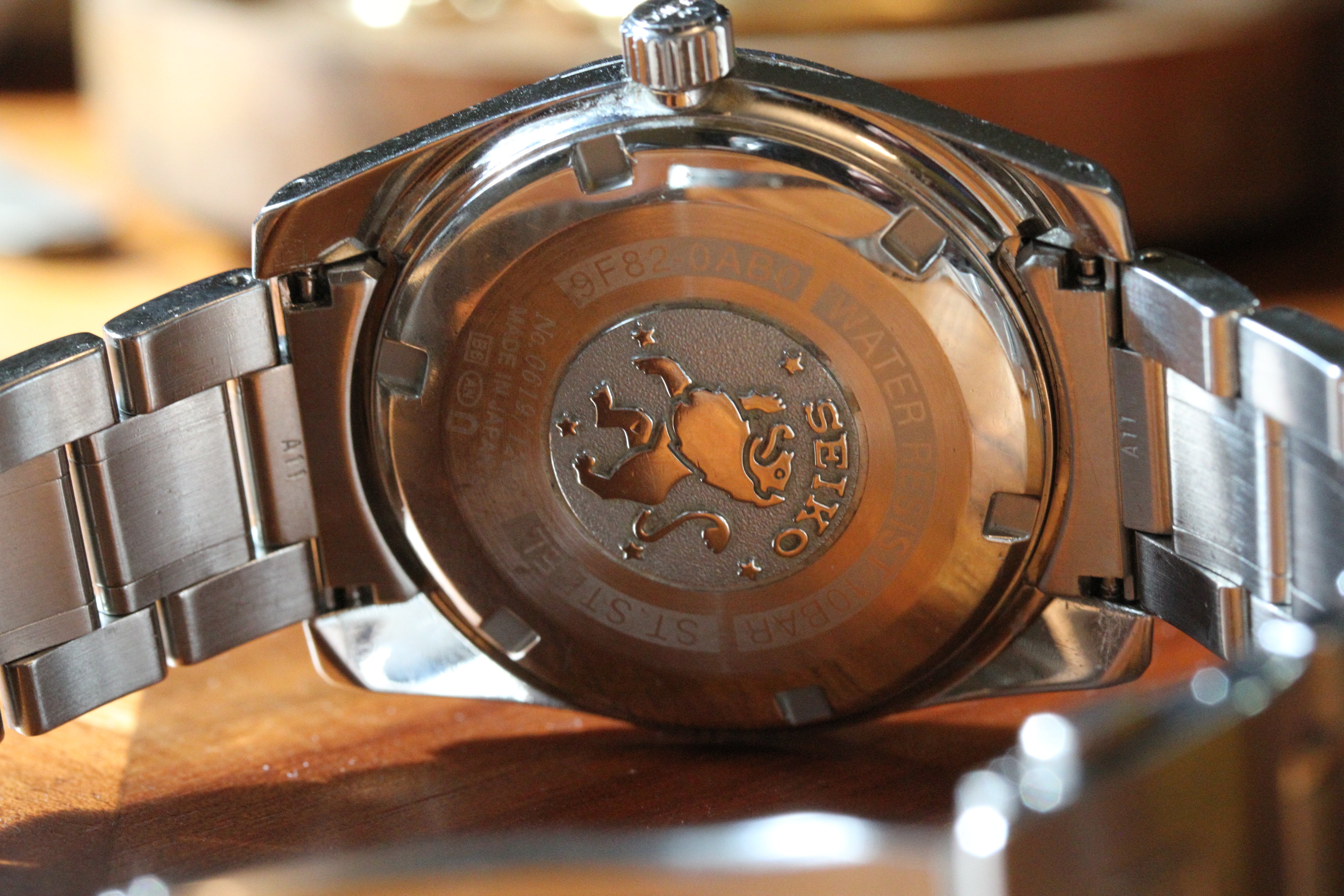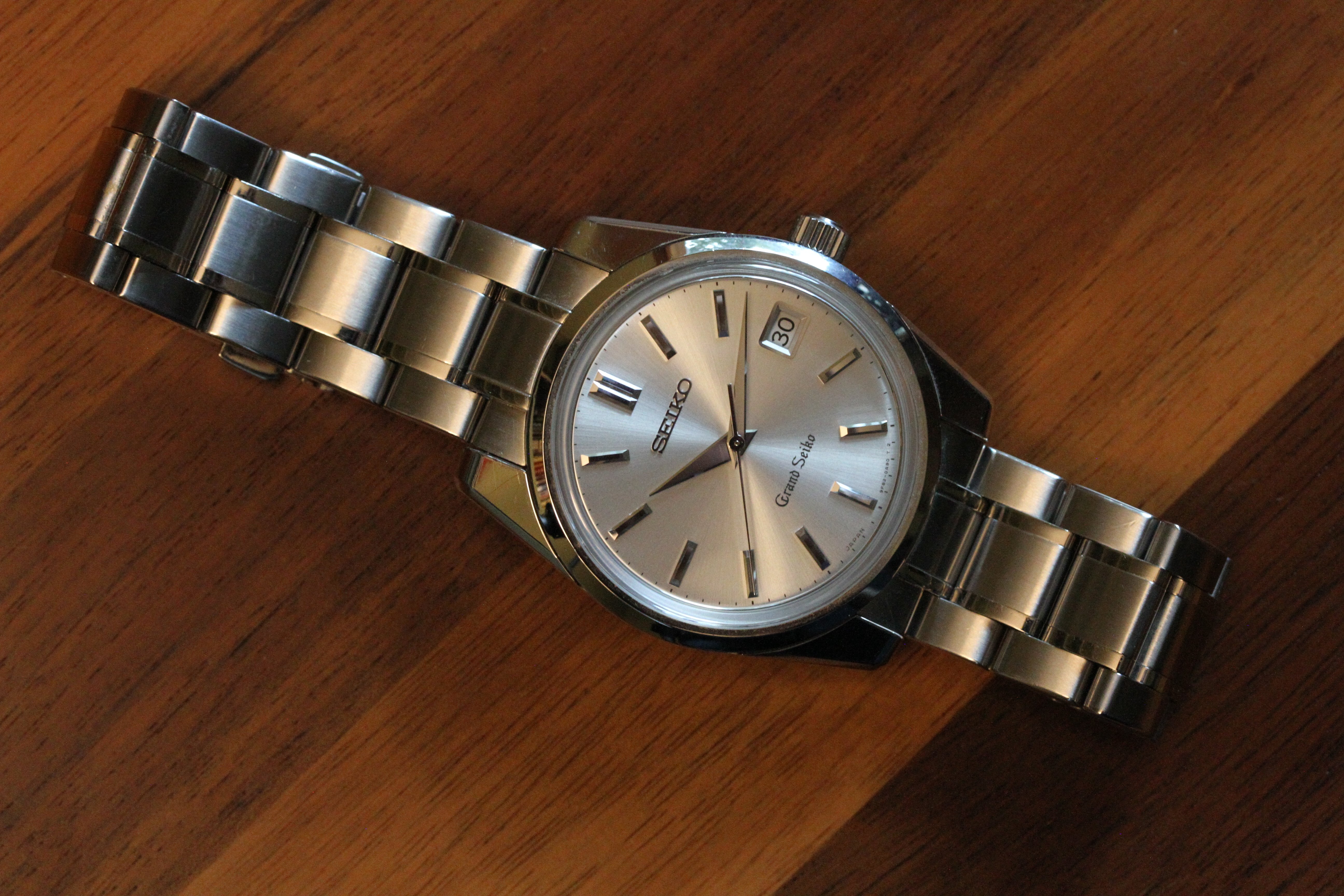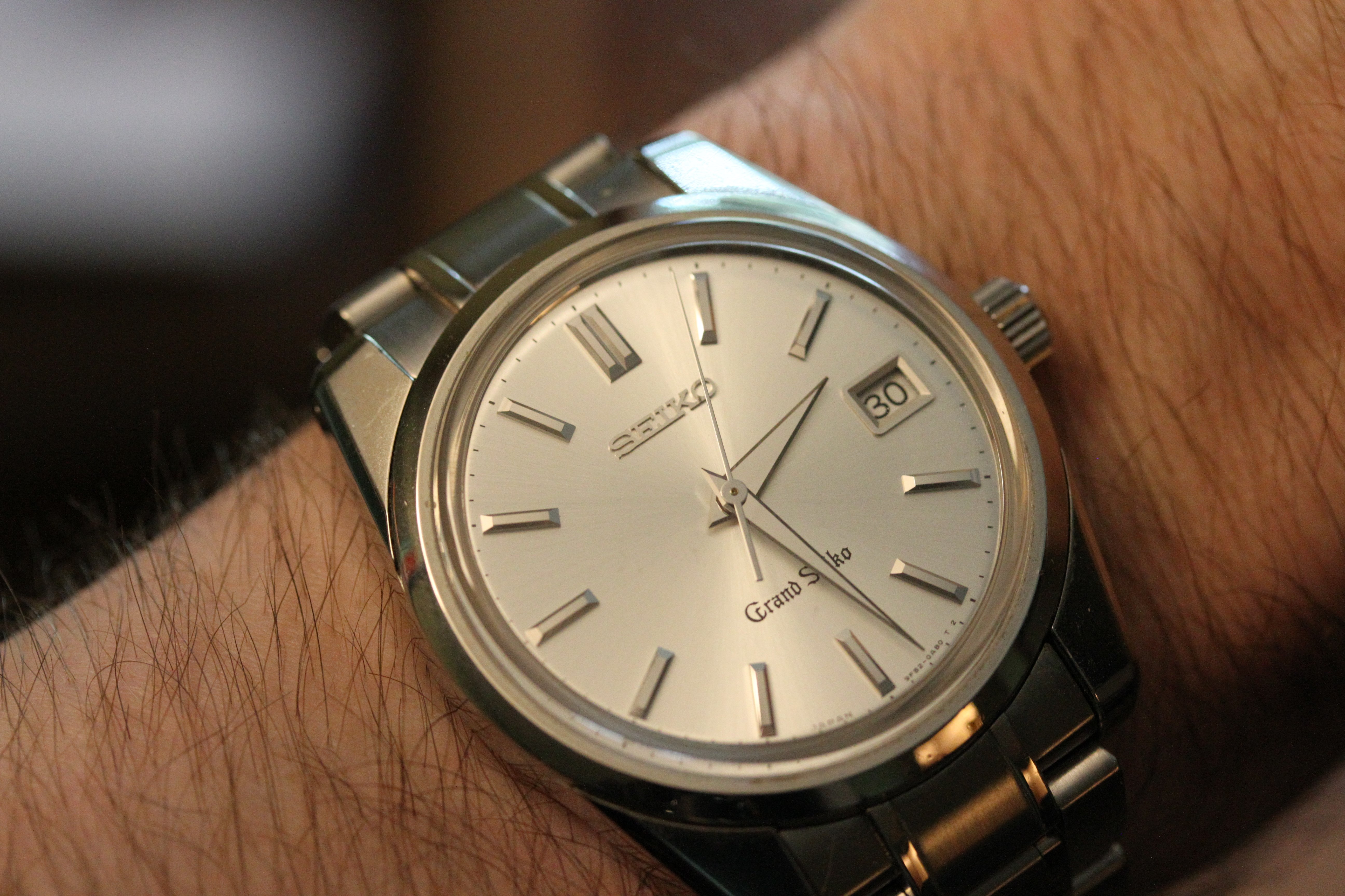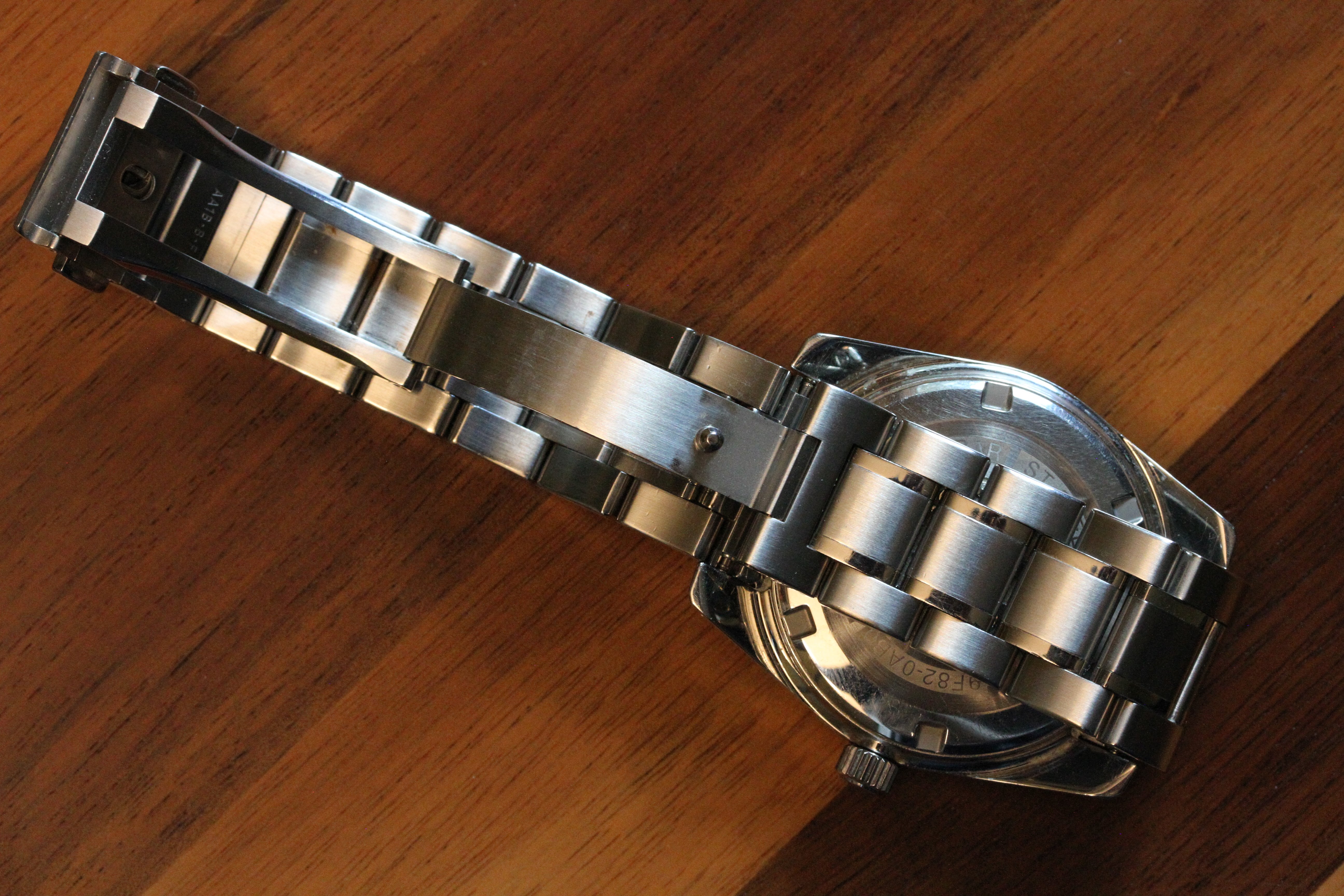 The movement is the ultra-precise GS 9F quartz movement. The watch is running, though the low battery "2-second tick" is active, indicating it wants a new battery.