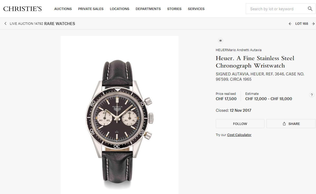 The watch sold (not to me) at Christie’s Geneva Auction in Nov. 2017 for $17,500 (CHF:USD rate was 1:1). See Heuer. A Fine Stainless Steel Chronograph Wristwatch (christies.com)