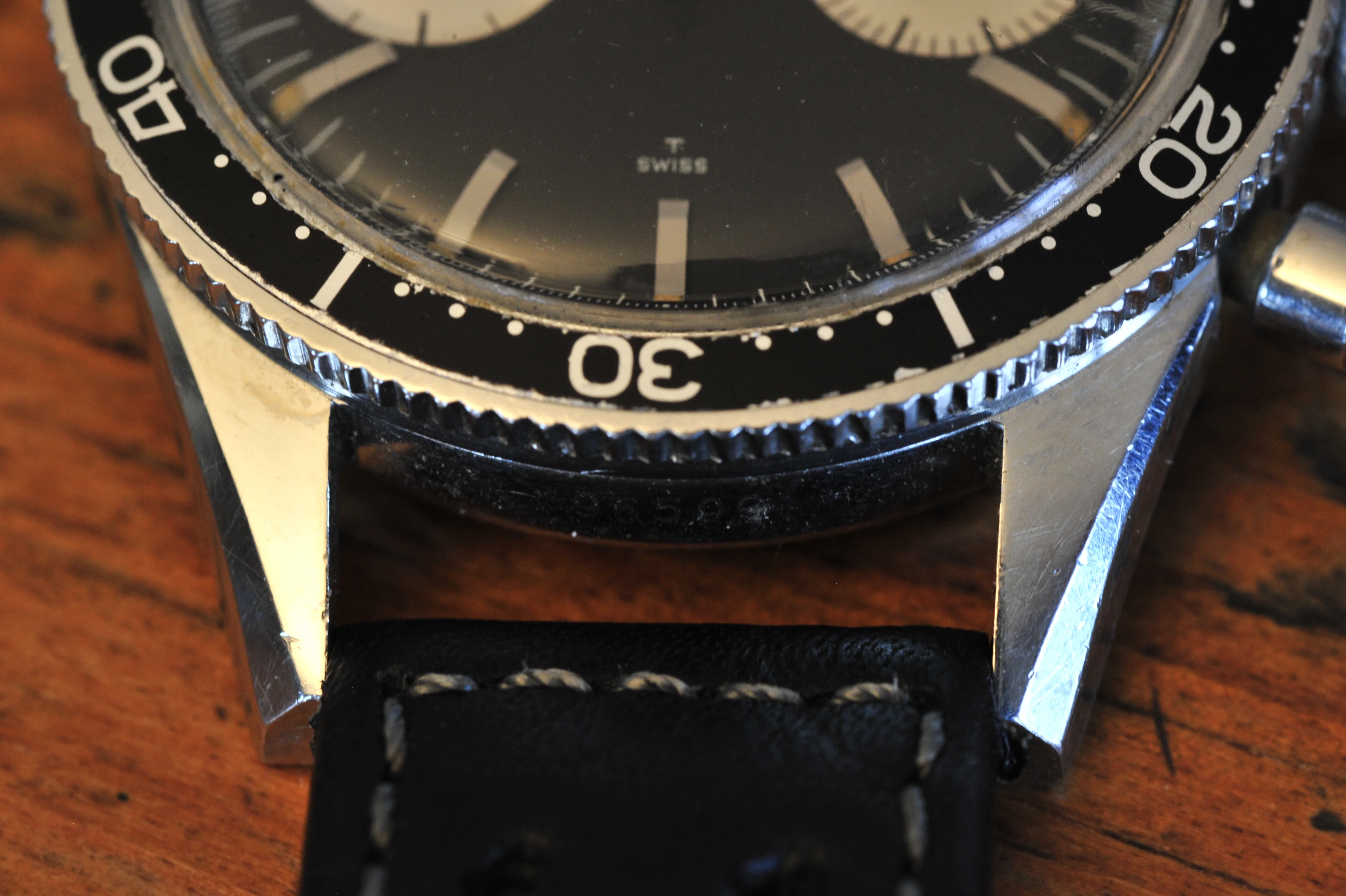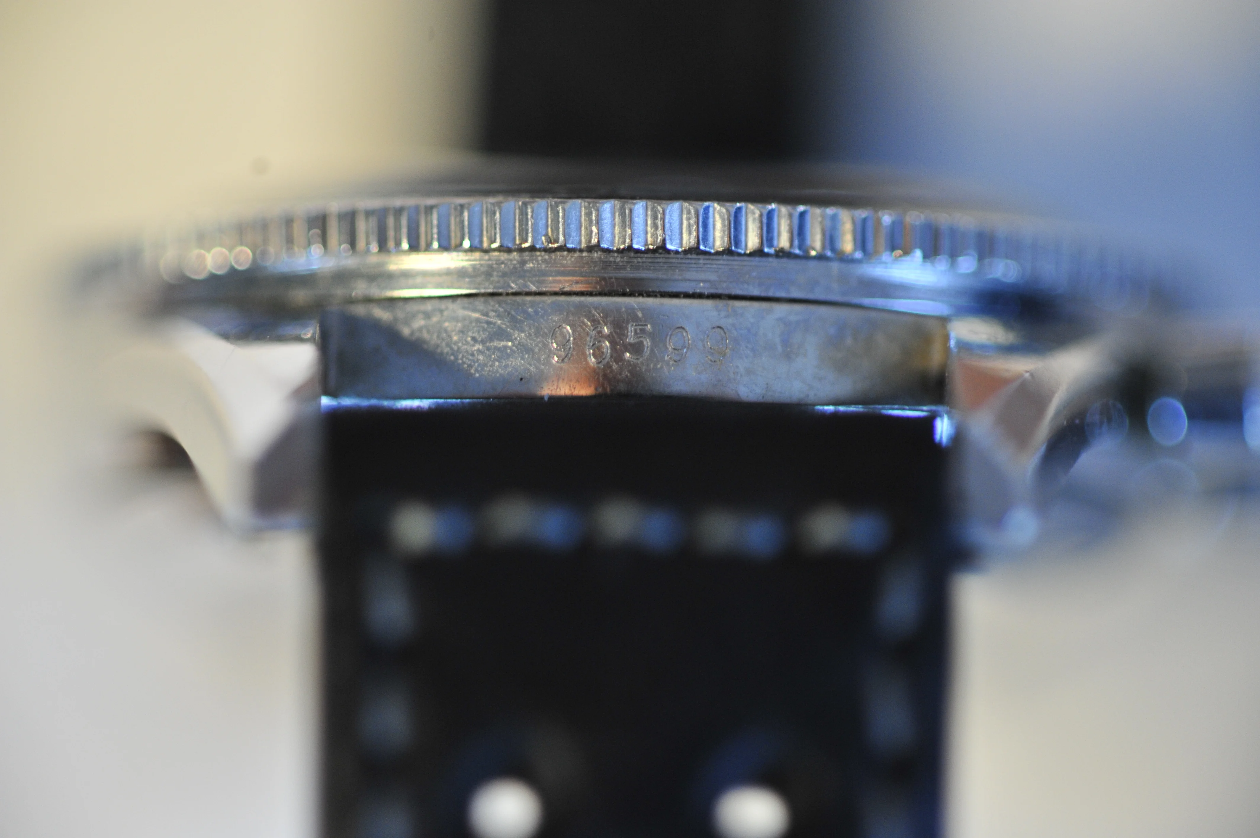 It is tough to find this model but especially in such good all-original condition, right down to the original chrono seconds hand and crown (these are often service replacements). Crown is signed. The sharp lug bevels are a highlight. The case is unpolished. The original lume is mostly intact with patina. Bezel insert is largely clean and unfaded with just a few small chips as shown. Coin edge is sharp. The only flaw to point out are some markings on the caseback as shown in photo, presumably from previous use of a NATO strap. These are not scratches or gouges. I am guessing these can be lightly buffed out, but I did not want to risk it, so will leave that decision to the buyer.