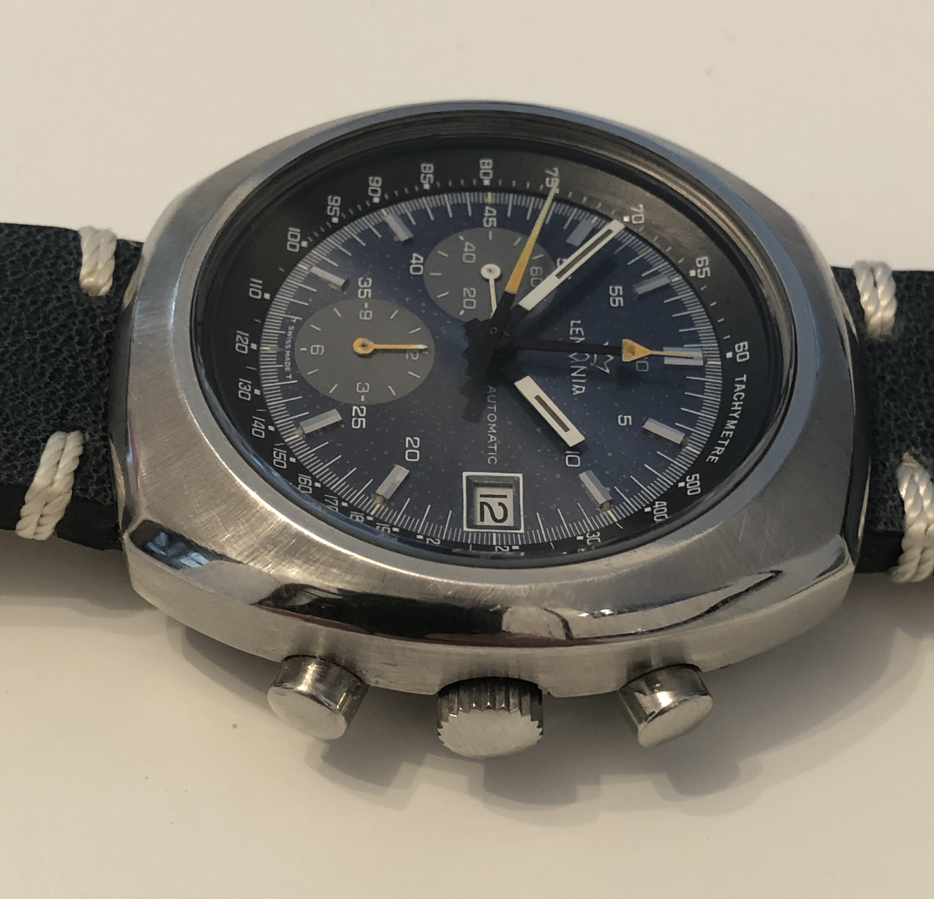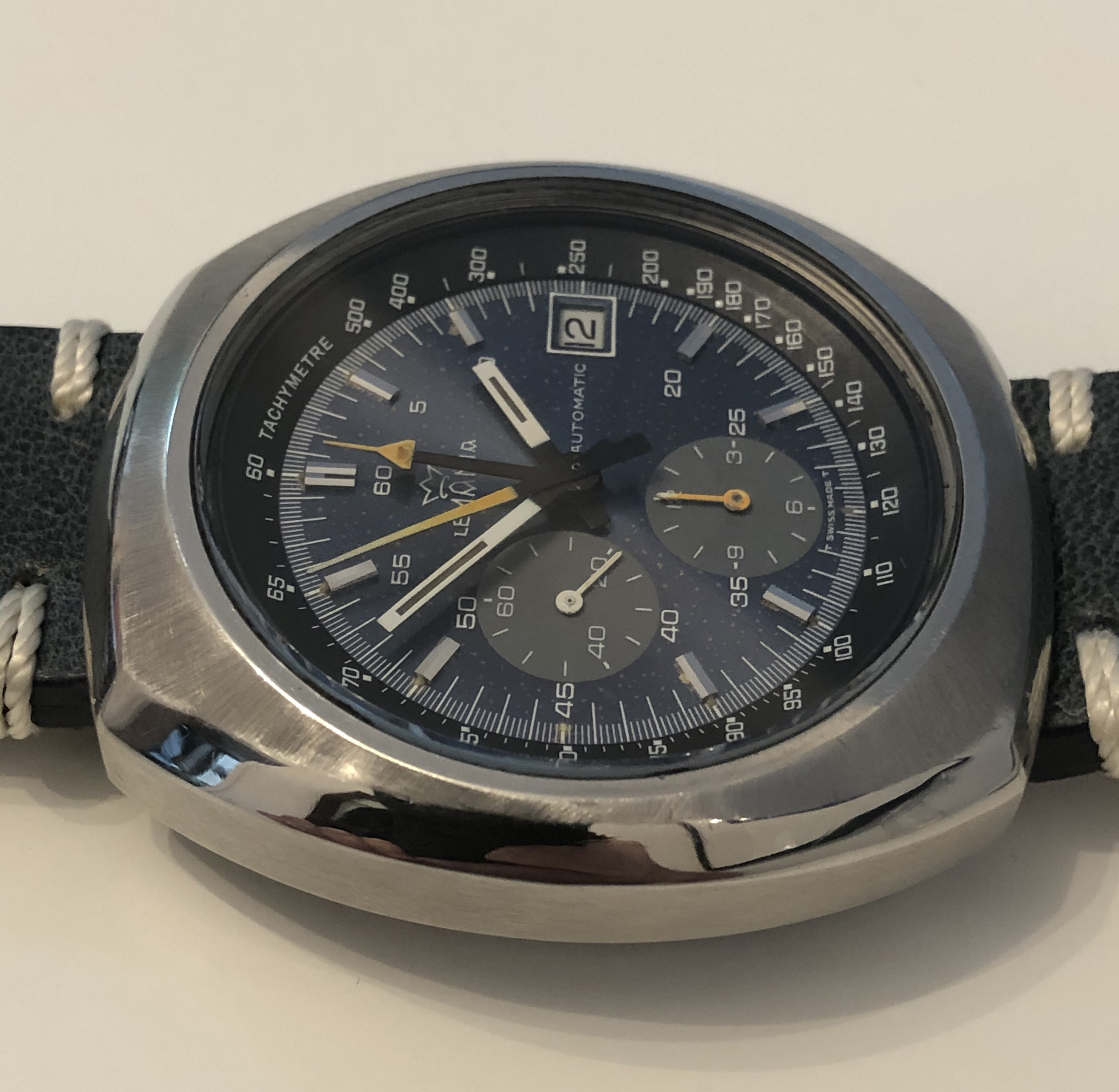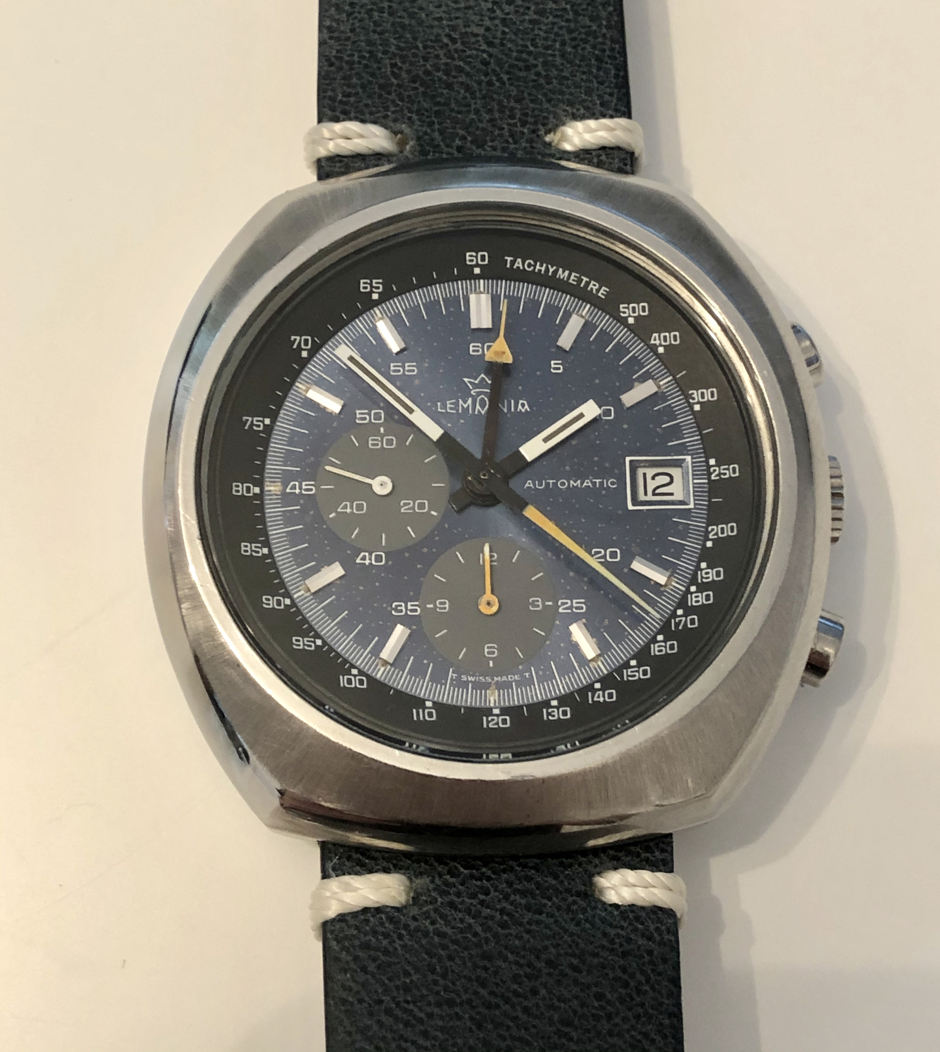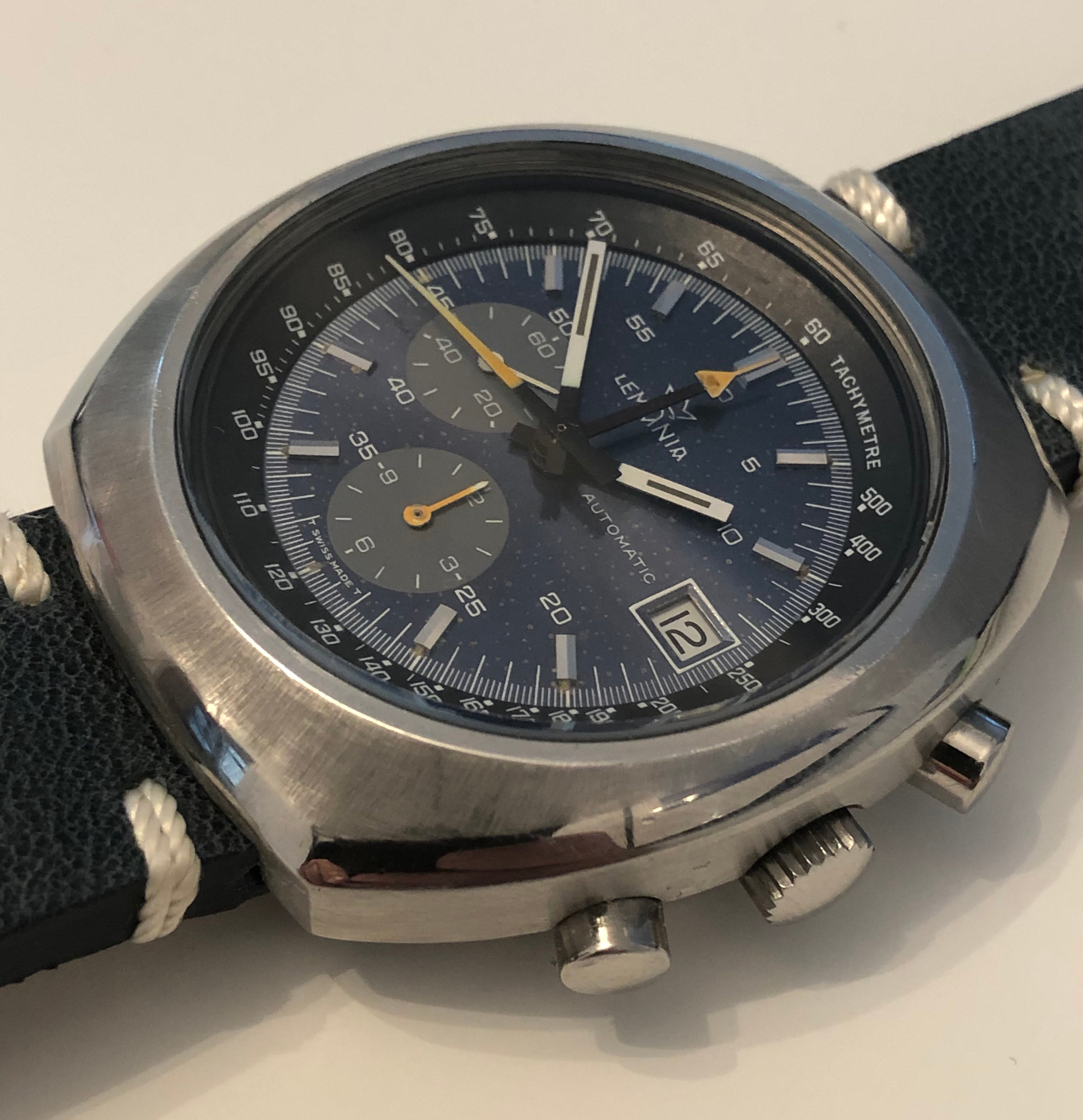 ·A rare Lemania 1341 automatic chronograph blue dial orange hand 44mm. A wonderful and rare variant of both case and dial with one of the true great vintage chronograph movements. I've seen other variants of this, but not another Lemania dial one. An eye-catching blue dial with orange Chrono hands with grey subdials and a matte black bezel leaps off the wrist. A great wearing watch that is large, eye-catching and highly functional. Beast of a watch. Look at the pictures, it's a cracker. Sunshine pic at the top.