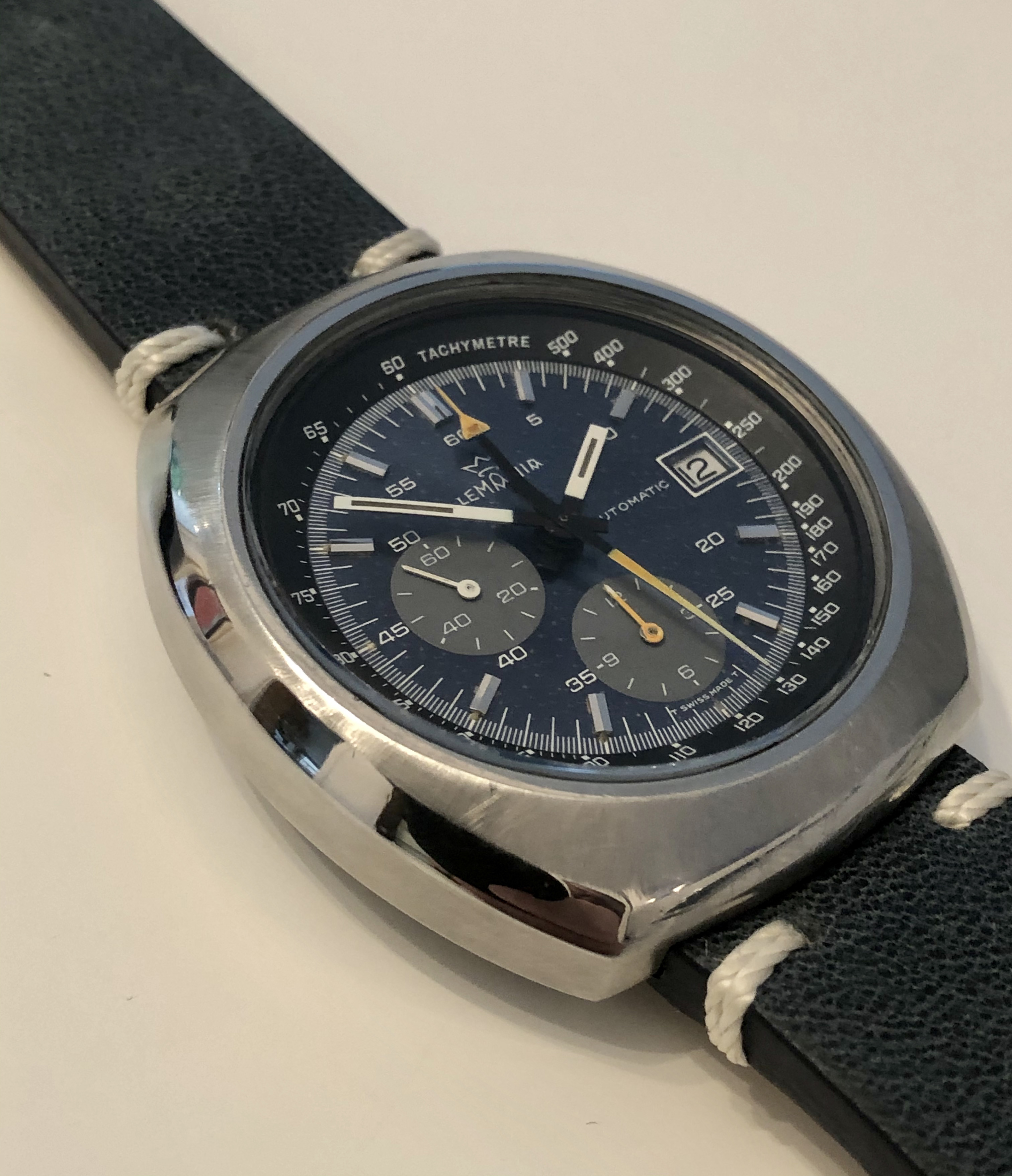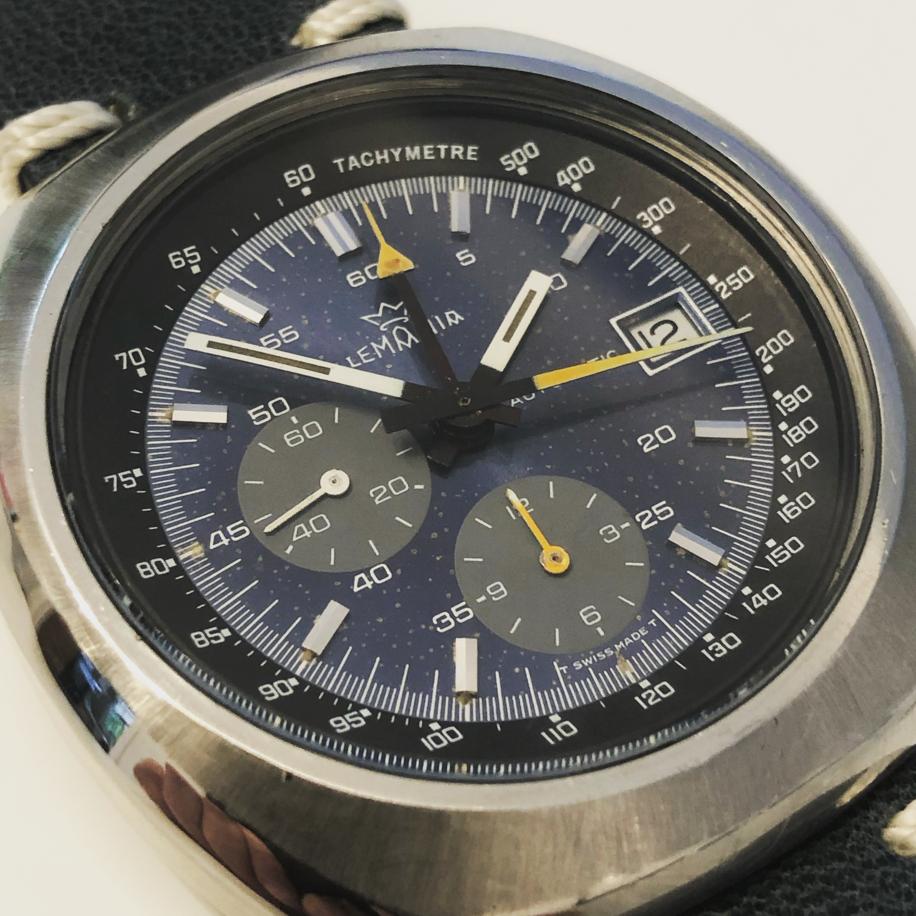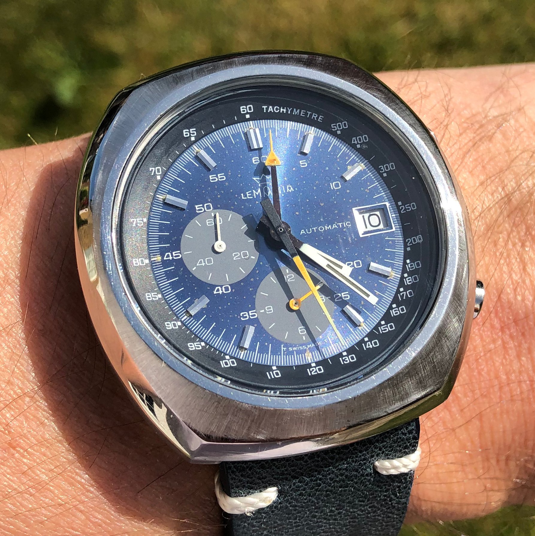 ·A rare Lemania 1341 automatic chronograph blue dial orange hand 44mm. A wonderful and rare variant of both case and dial with one of the true great vintage chronograph movements. I've seen other variants of this, but not another Lemania dial one. An eye-catching blue dial with orange Chrono hands with grey subdials and a matte black bezel leaps off the wrist. A great wearing watch that is large, eye-catching and highly functional. Beast of a watch. Look at the pictures, it's a cracker. Sunshine pic at the top.