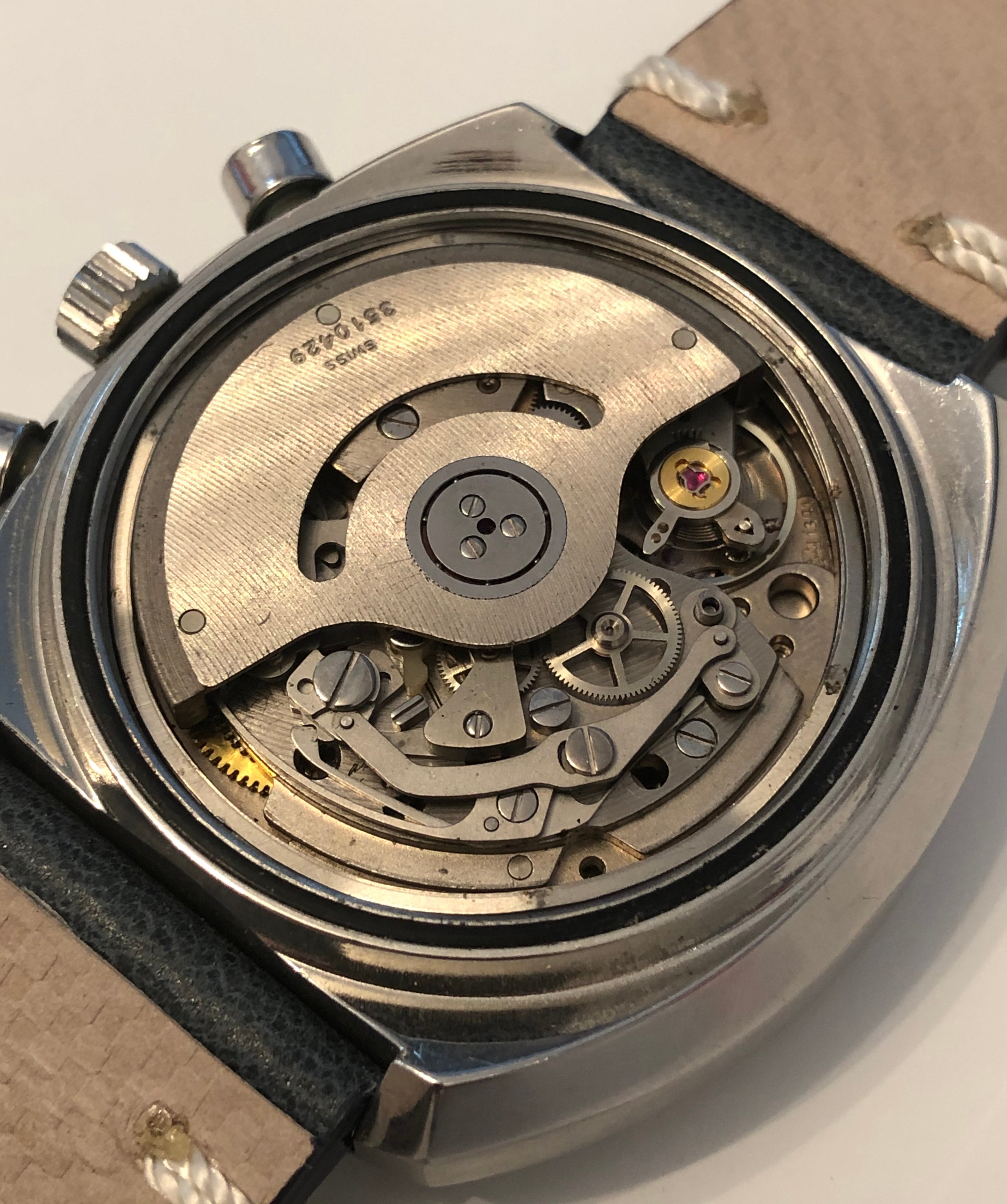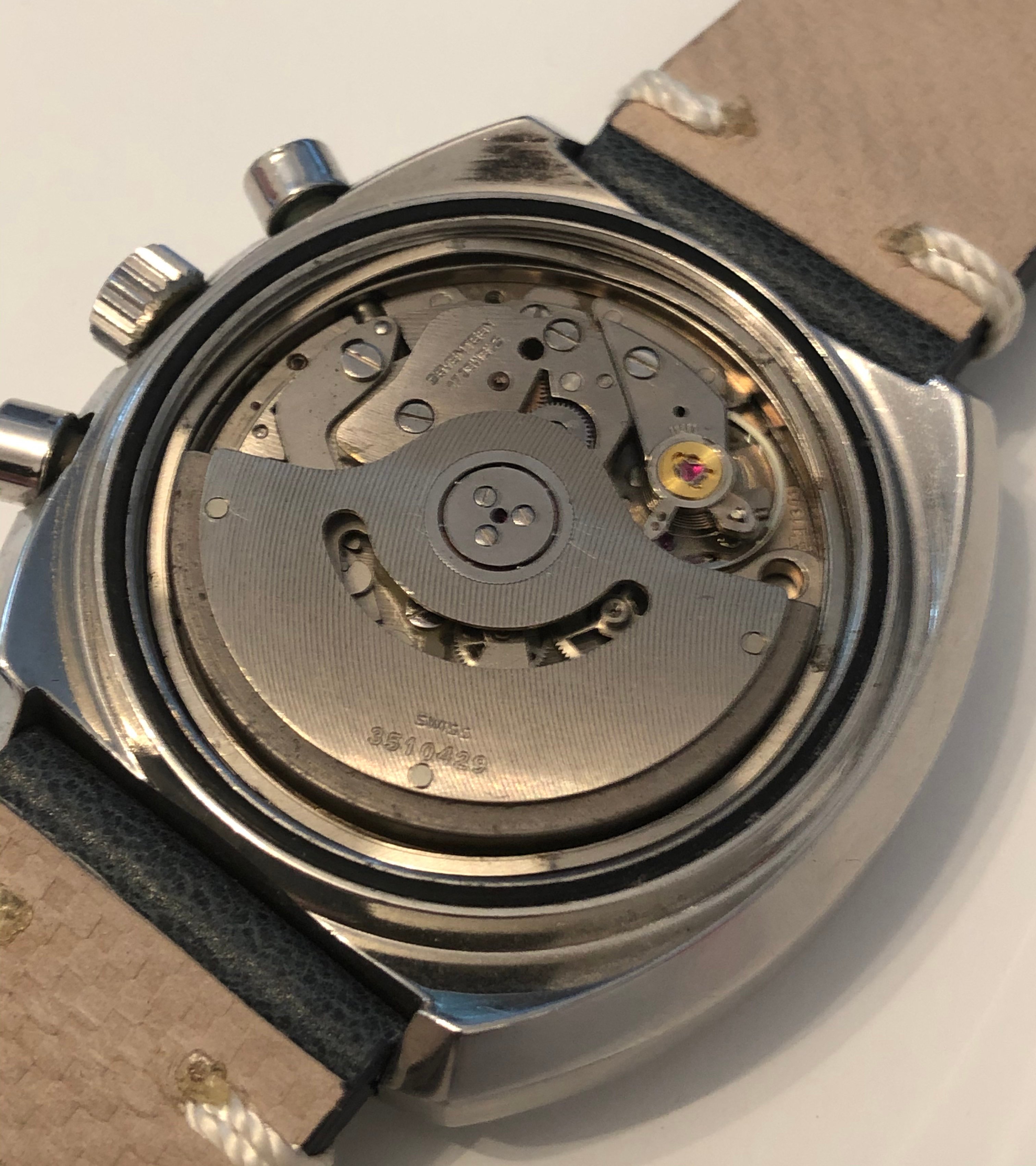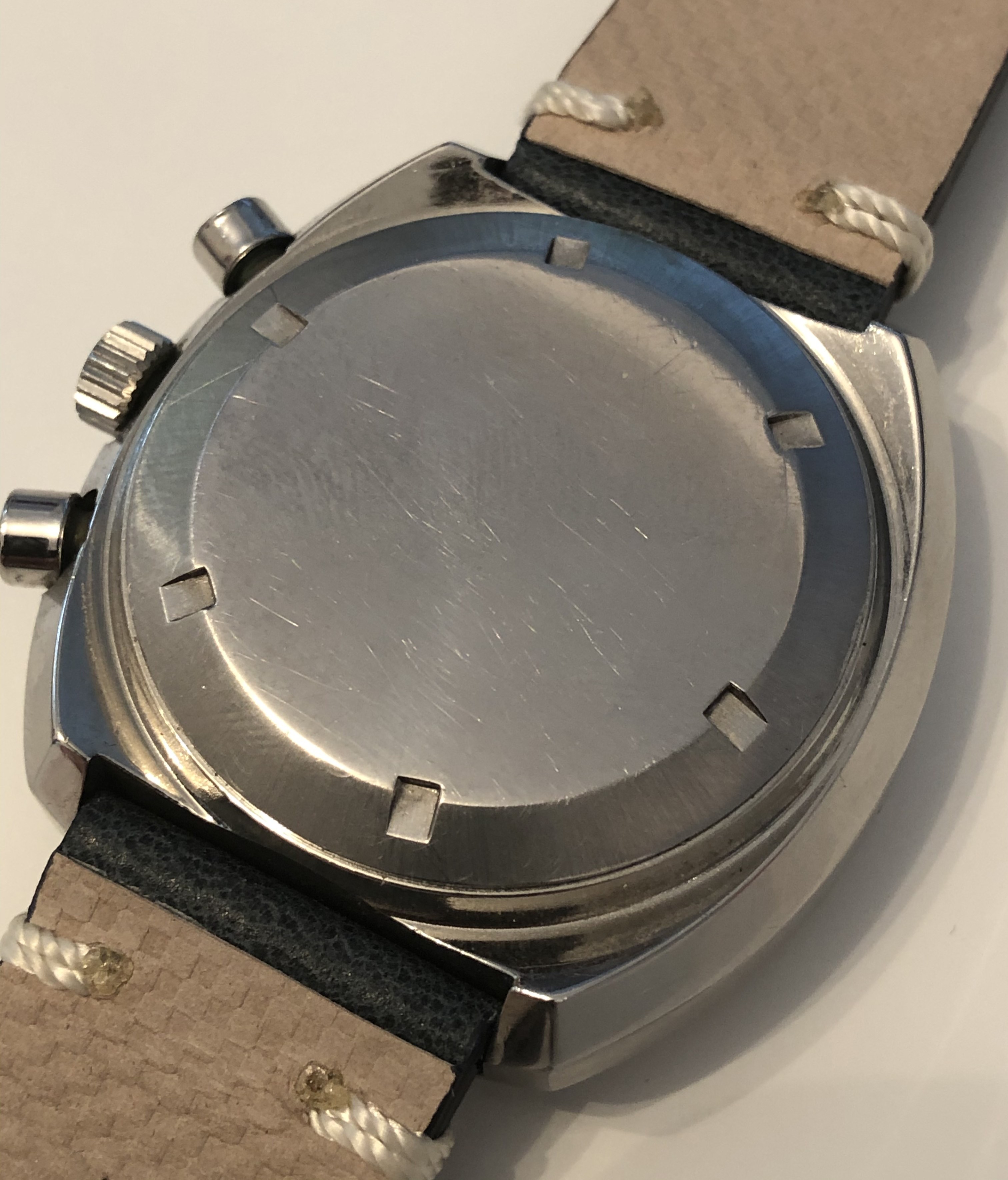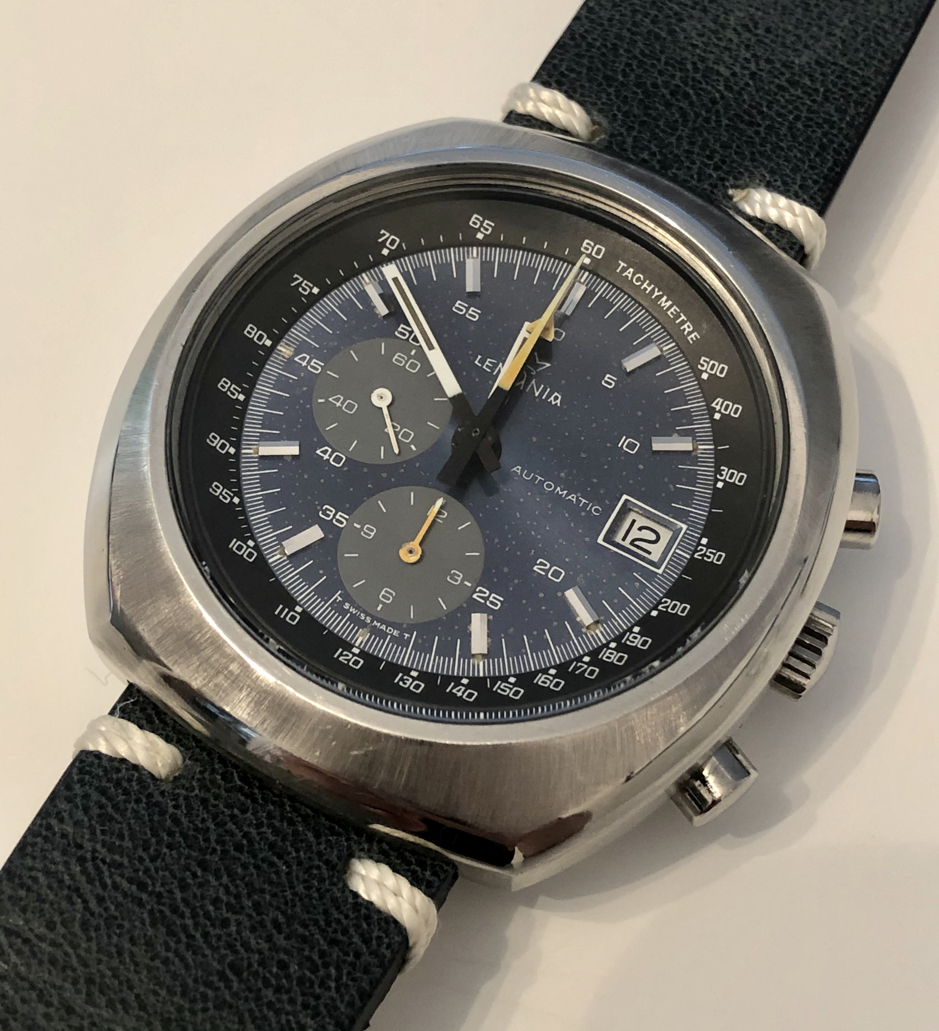 ·A rare Lemania 1341 automatic chronograph blue dial orange hand 44mm. A wonderful and rare variant of both case and dial with one of the true great vintage chronograph movements. I've seen other variants of this, but not another Lemania dial one. An eye-catching blue dial with orange Chrono hands with grey subdials and a matte black bezel leaps off the wrist. A great wearing watch that is large, eye-catching and highly functional. Beast of a watch. Look at the pictures, it's a cracker. Sunshine pic at the top.