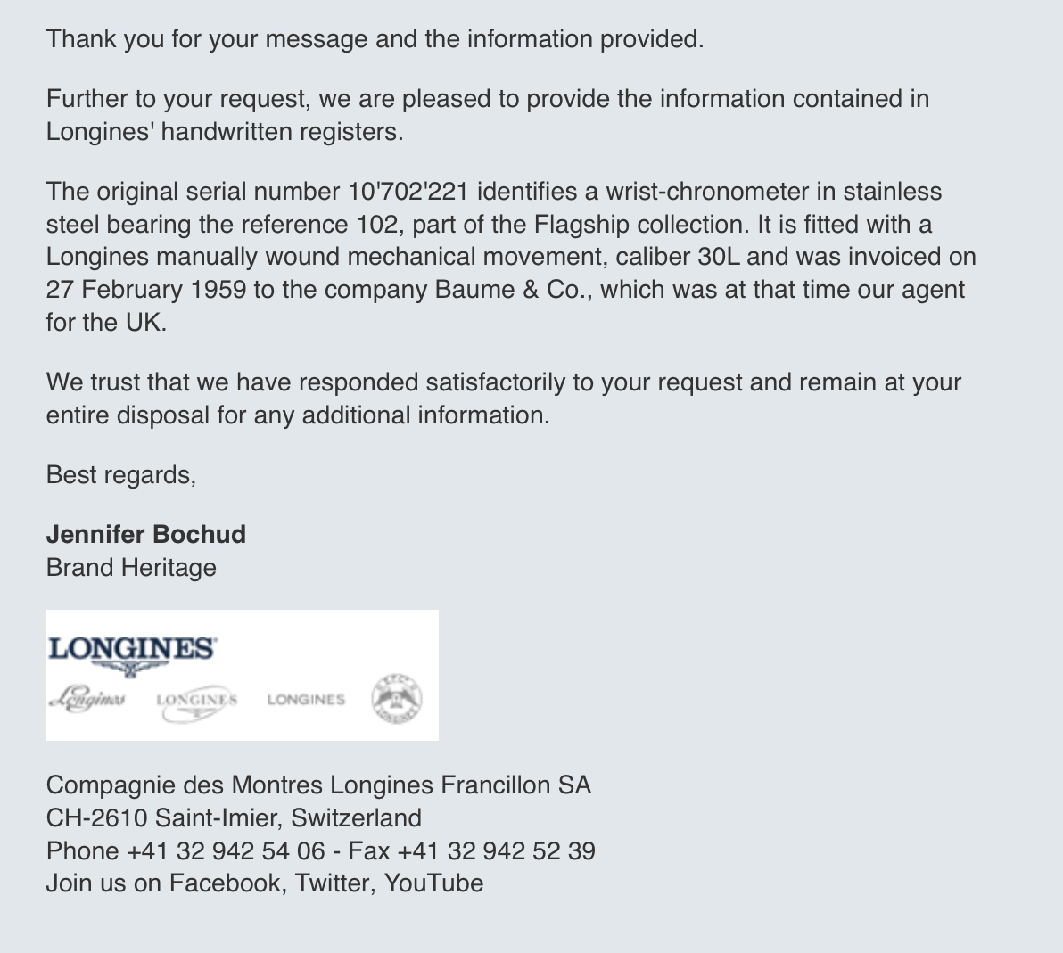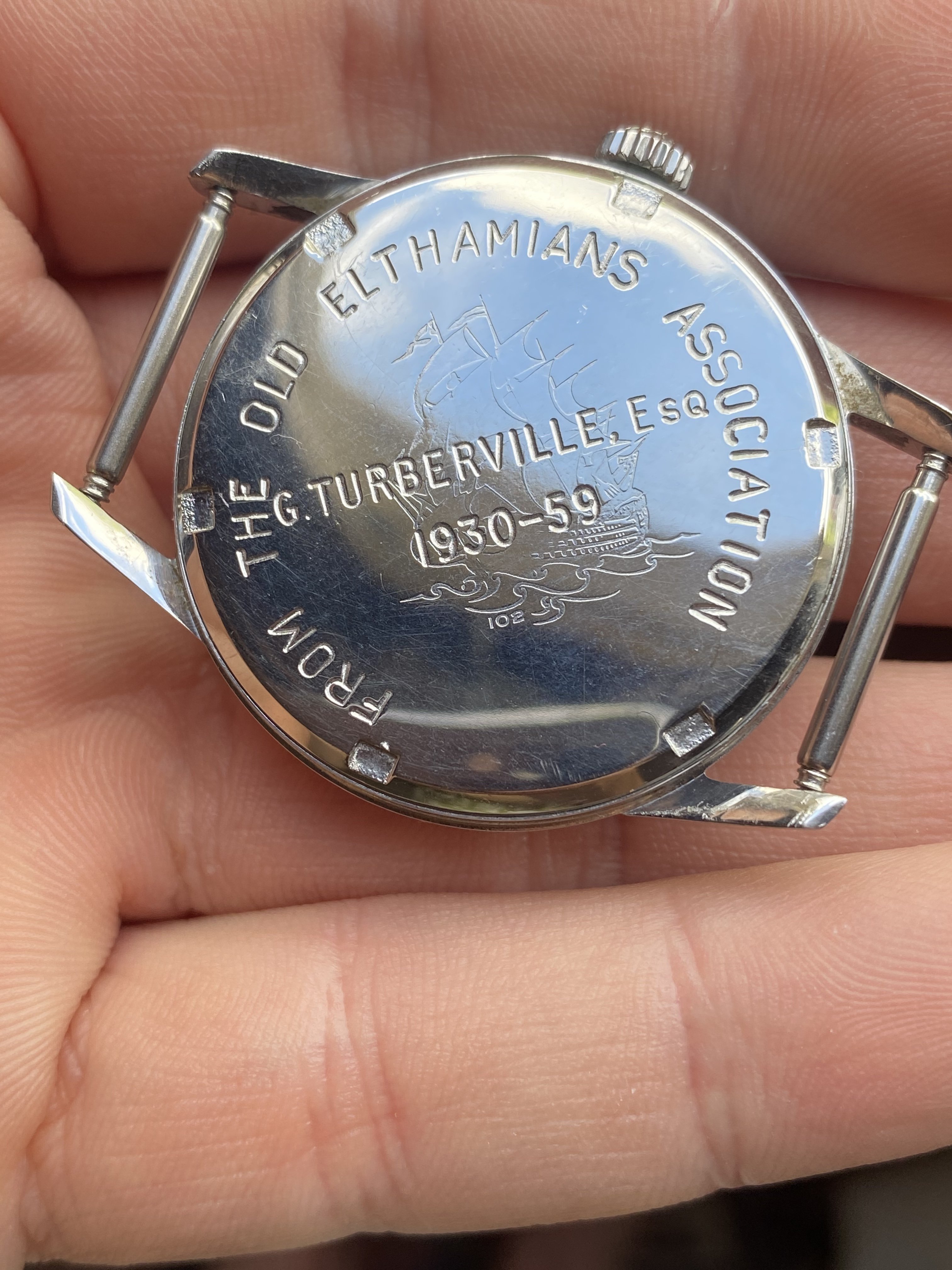 This particular watch was presented to Geoffrey Turberville in 1959 on his retirement as the longest serving headmaster of Eltham College. According to Longines’ archives, the watch was invoiced to the UK on the February 27th, 1959.
