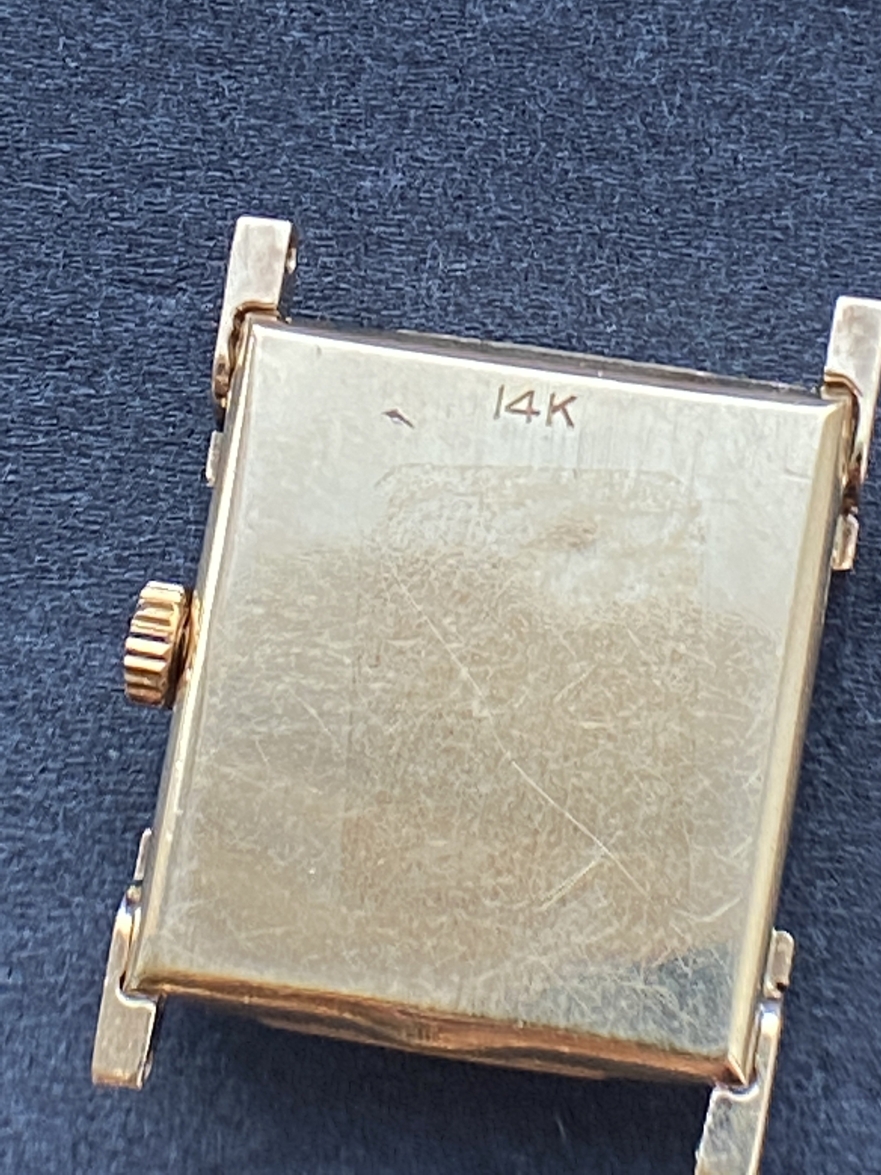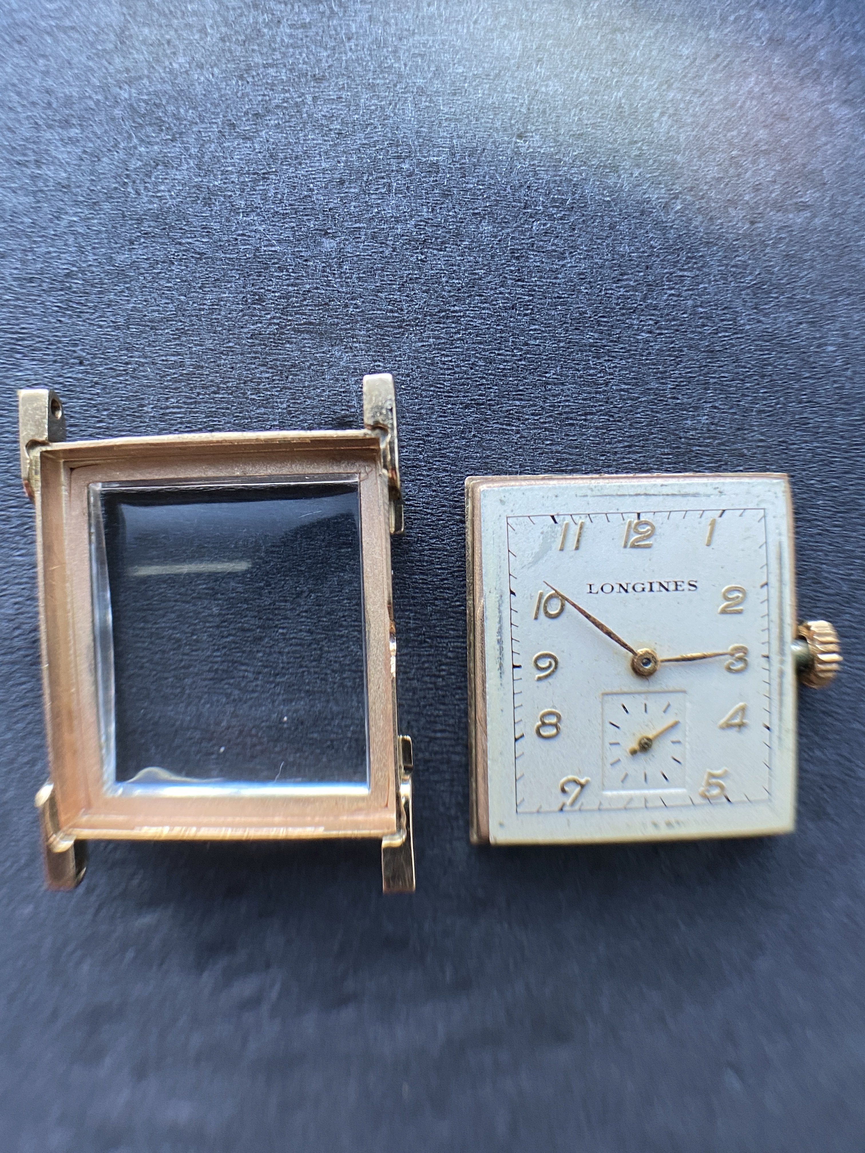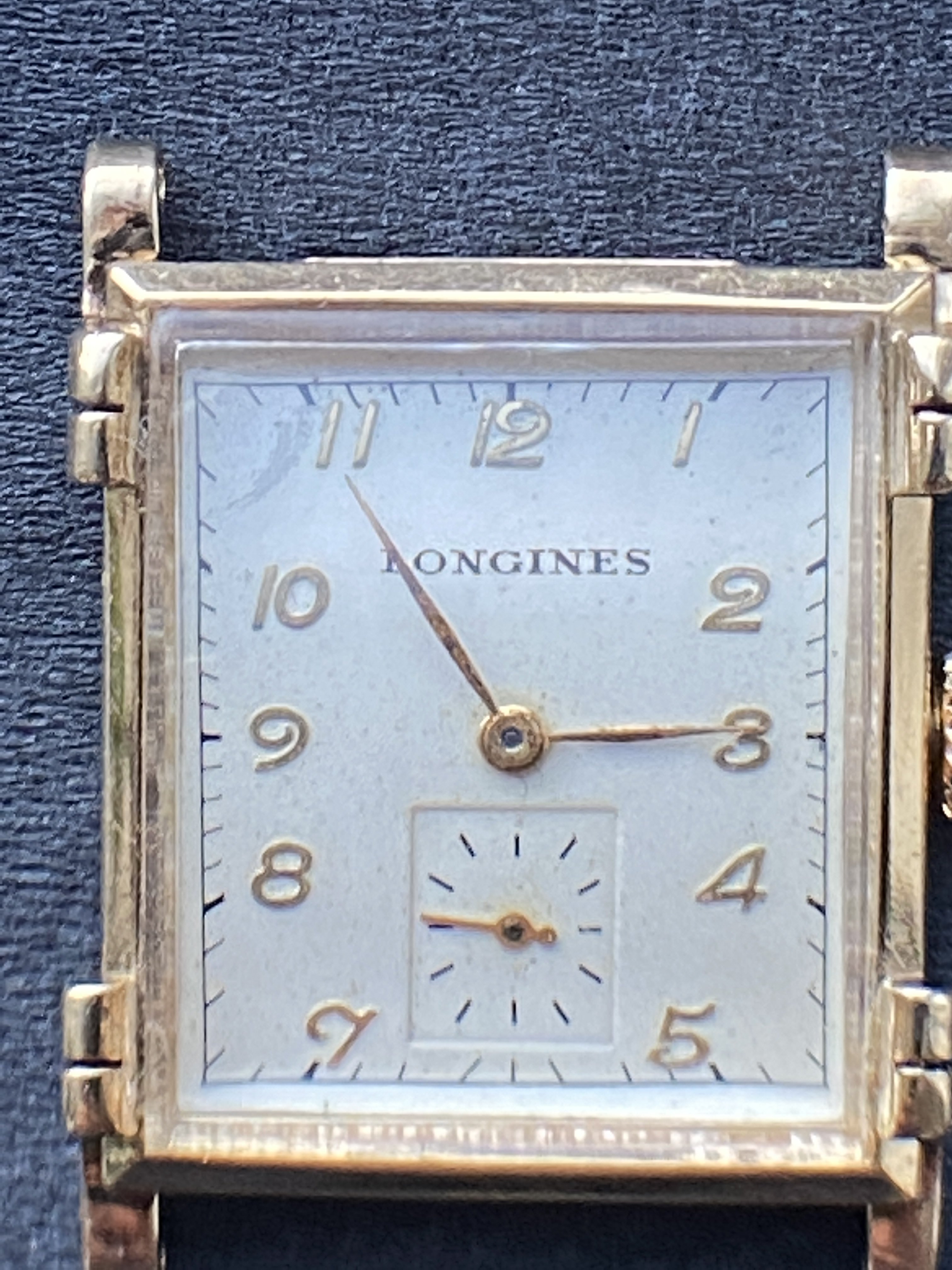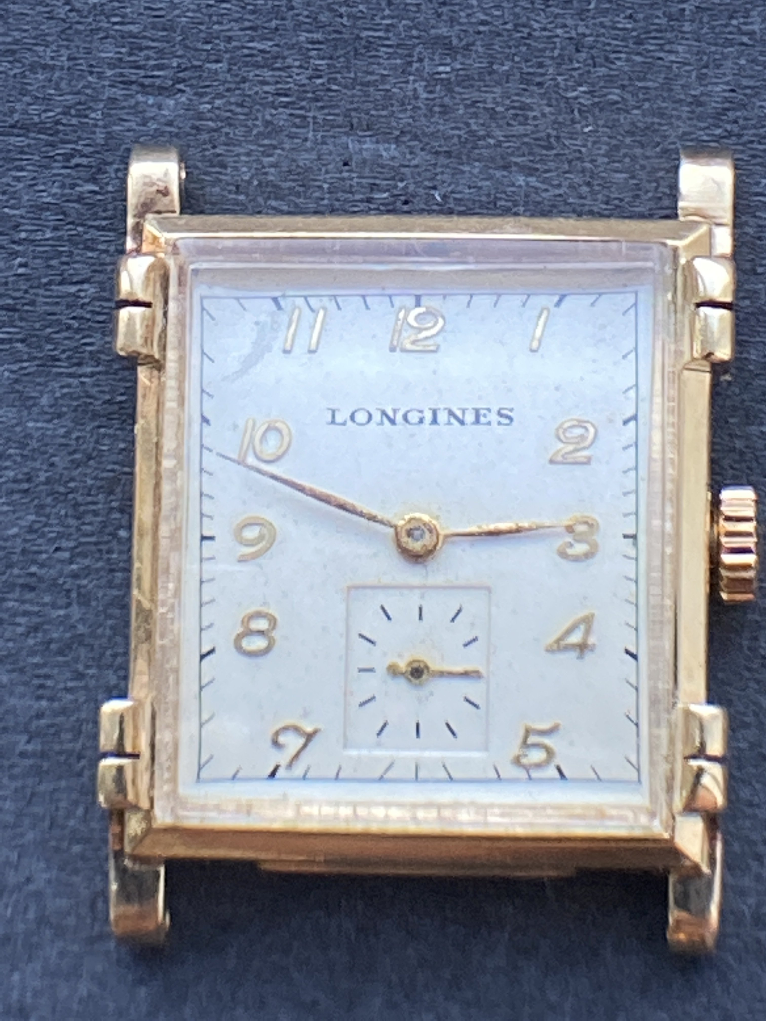 Longines handwind 14 carat gold case with silver colored dial, 1947. A sweet and striking watch, this beats a dull Cartier Tank any day (but that is only my humble opinion…)