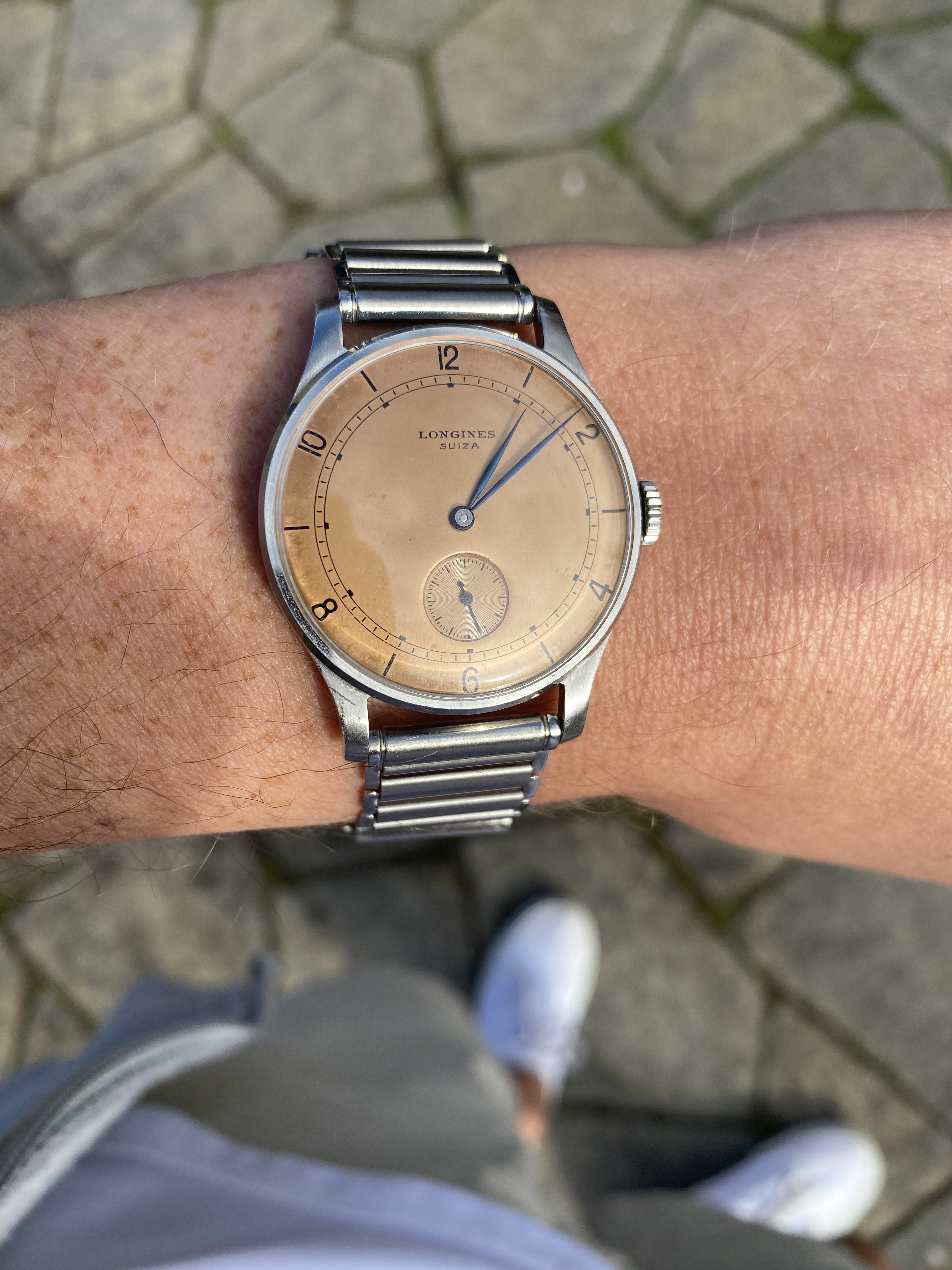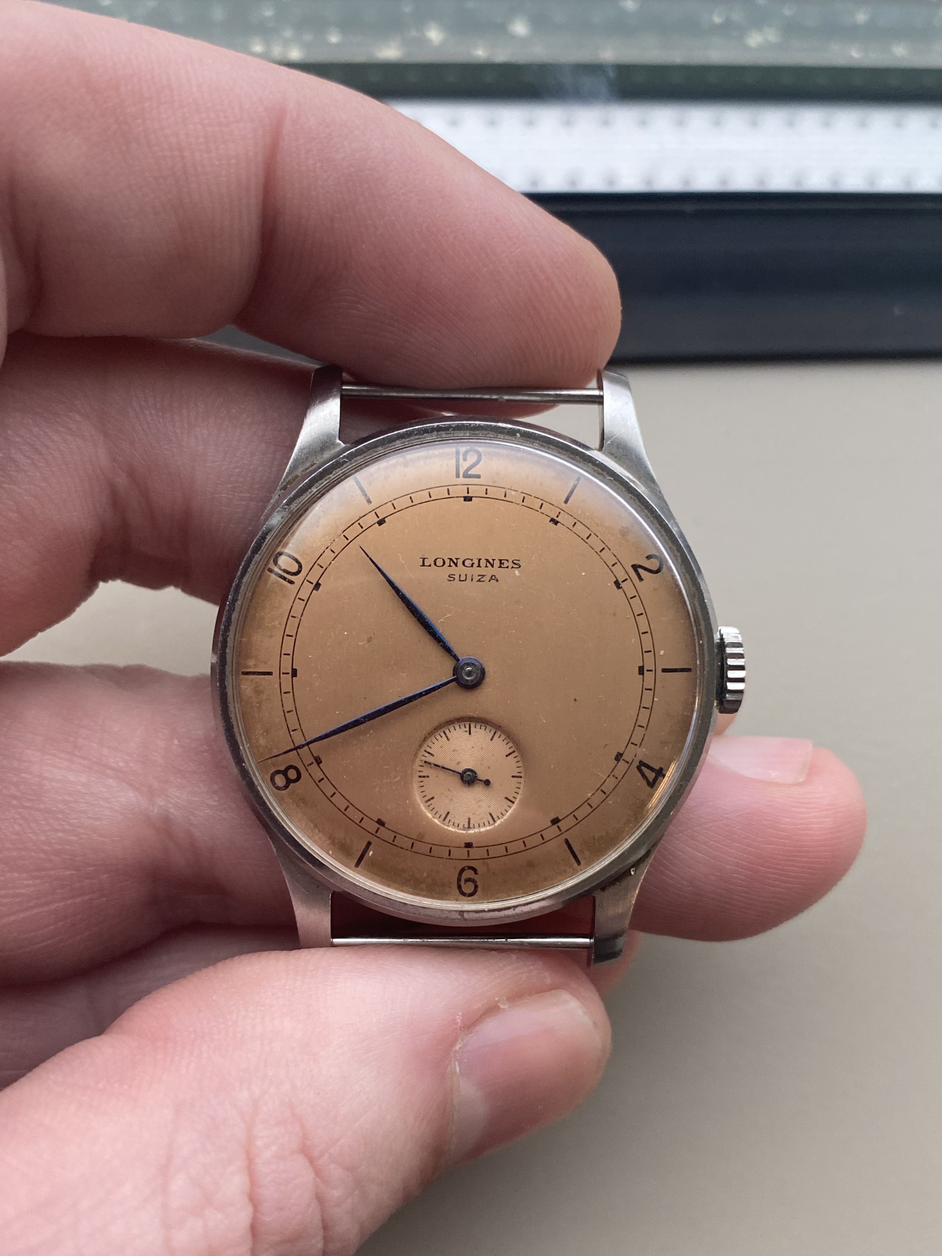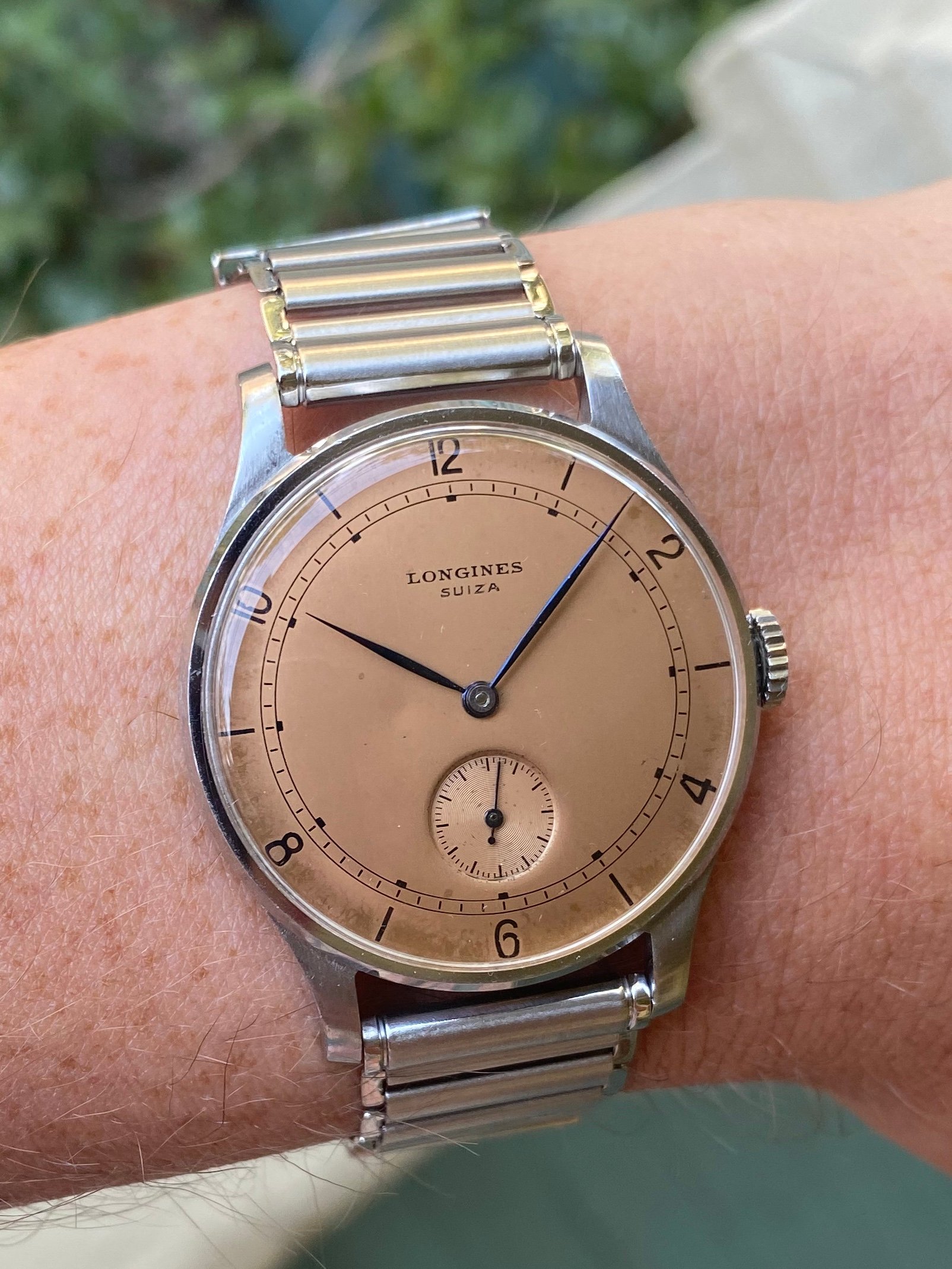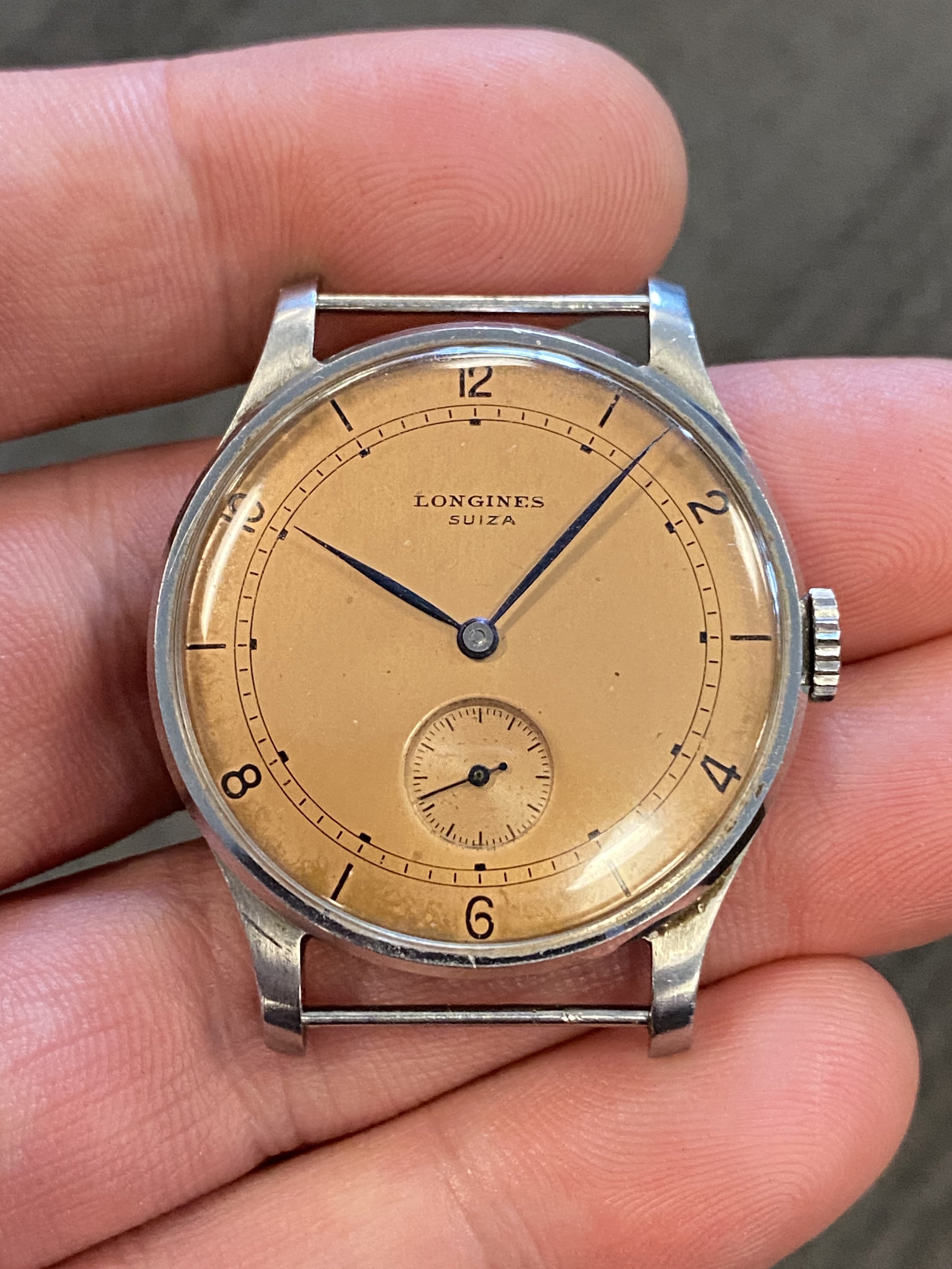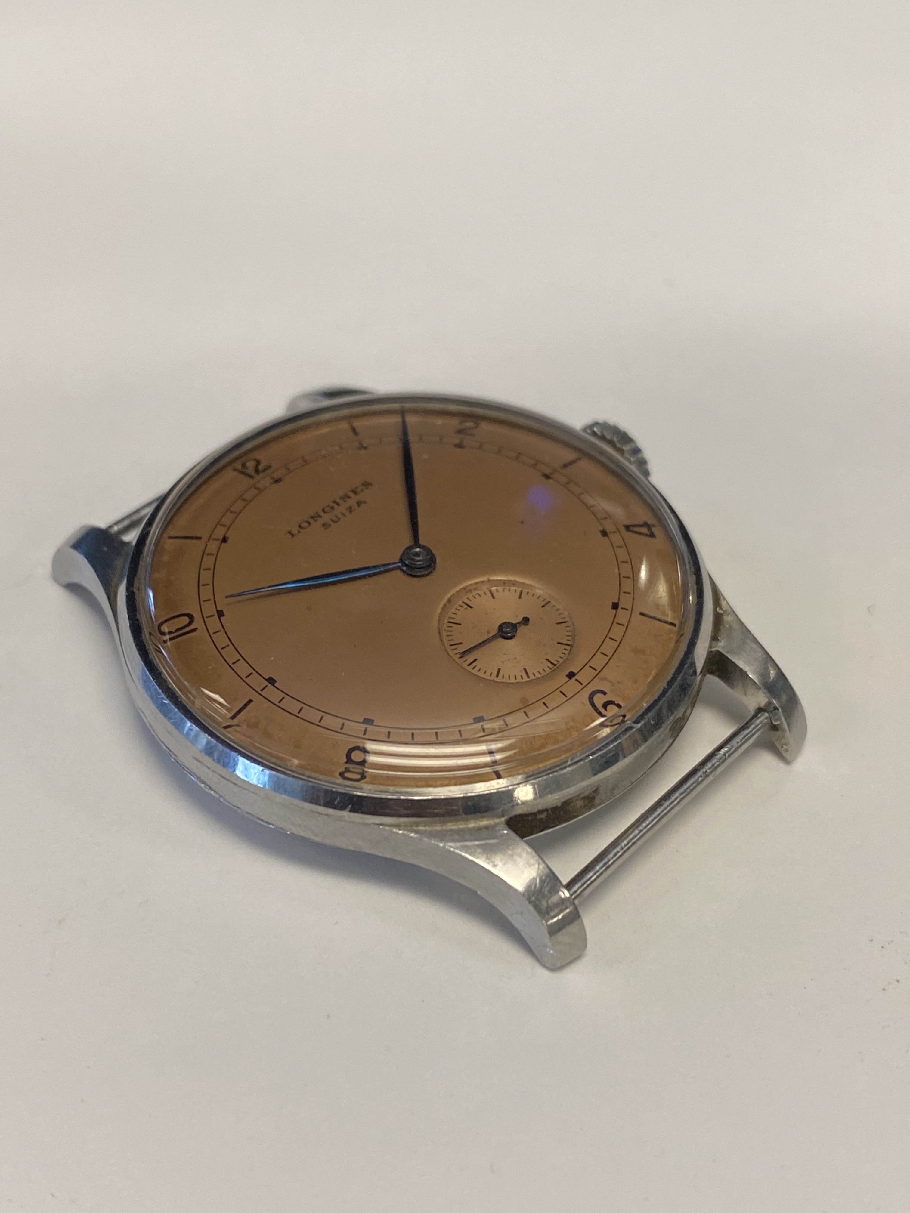 The real star of this show, however, is the salmon colored, Suiza signed dial. Salmon dialed watches from Longines are quite uncommon and highly sought after. This one is even more unusual in that it also has the Suiza signature, which was featured on watches exported to some South American nations (Argentina, Uruguay) around the mid century.