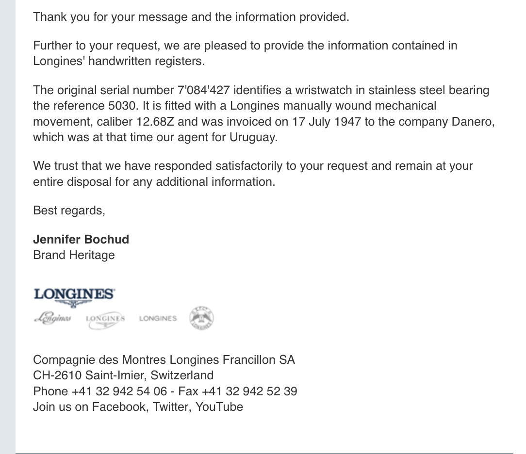 Recently serviced by Kelly Hunter (art_of_the_watch on IG), this watch is, according to Longines’ archives, a ref 5030 originally invoiced to Uruguay on July 17th, 1947.