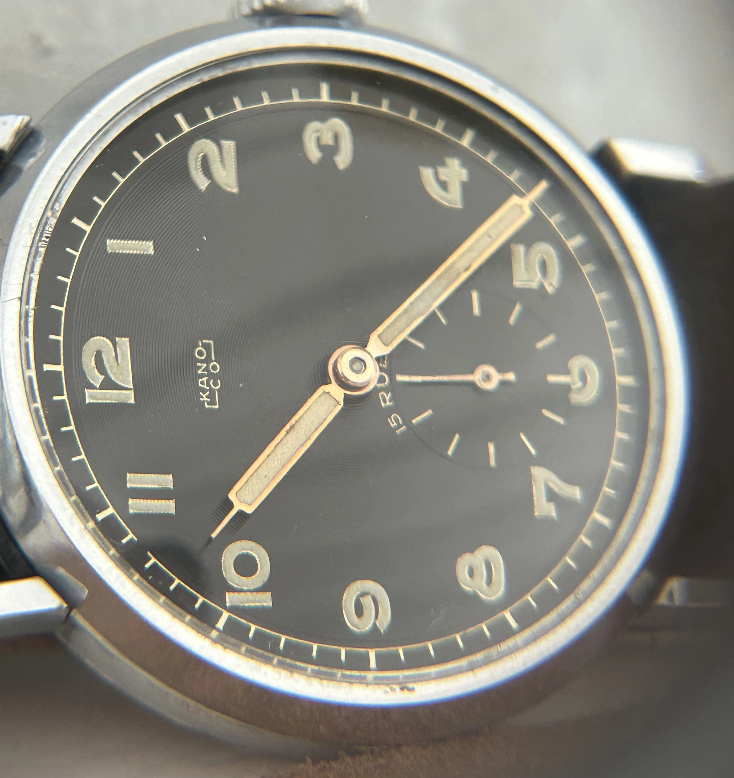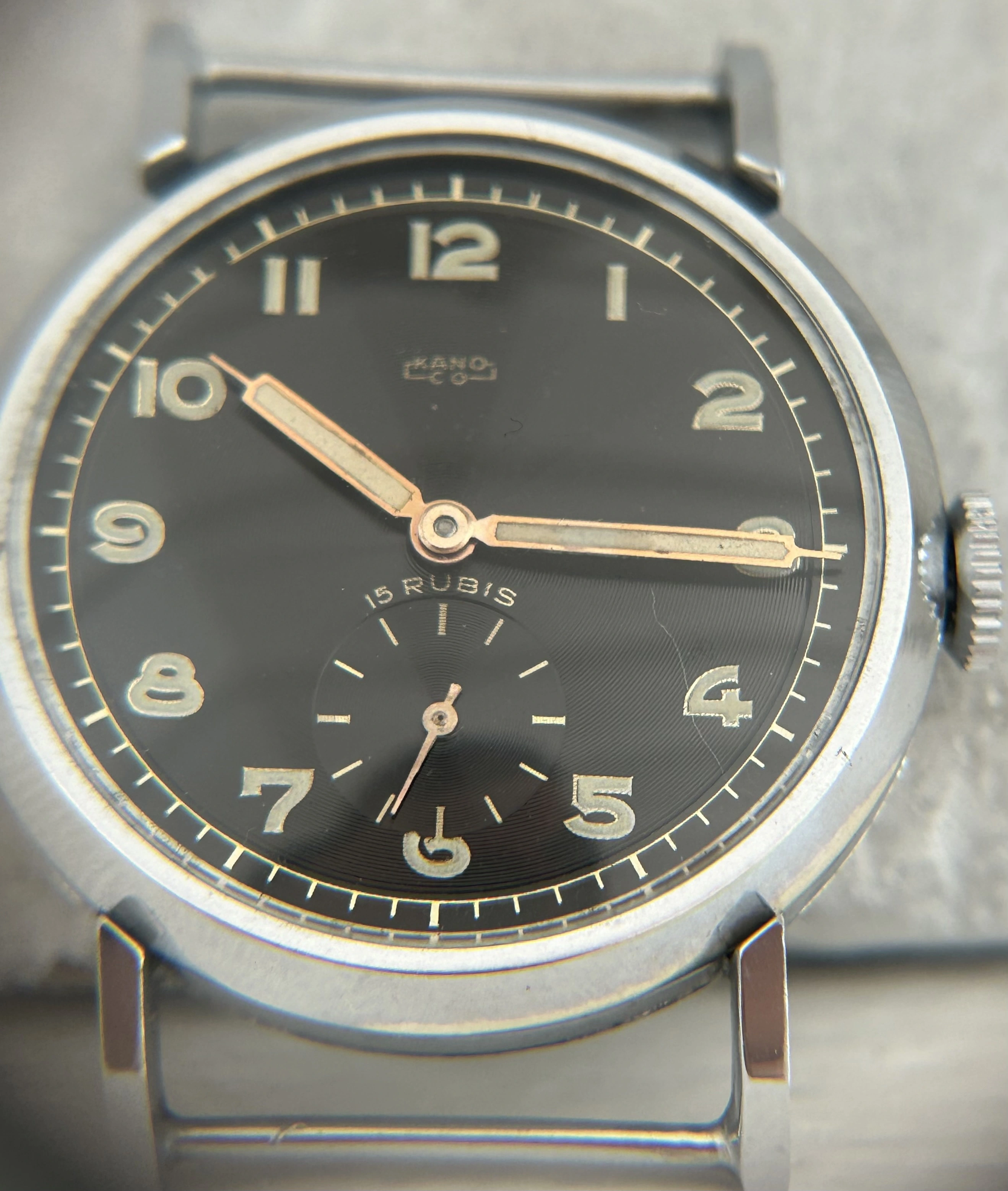 ·Up for sale is a truly remarkable new old stock transitional late-1940s Kano military-style wristwatch, from Karl Nonnenmacher’s Pforzheim-based firm. This is an absolute time capsule in untouched, original condition - incredible black rose-gold sunburst dial.