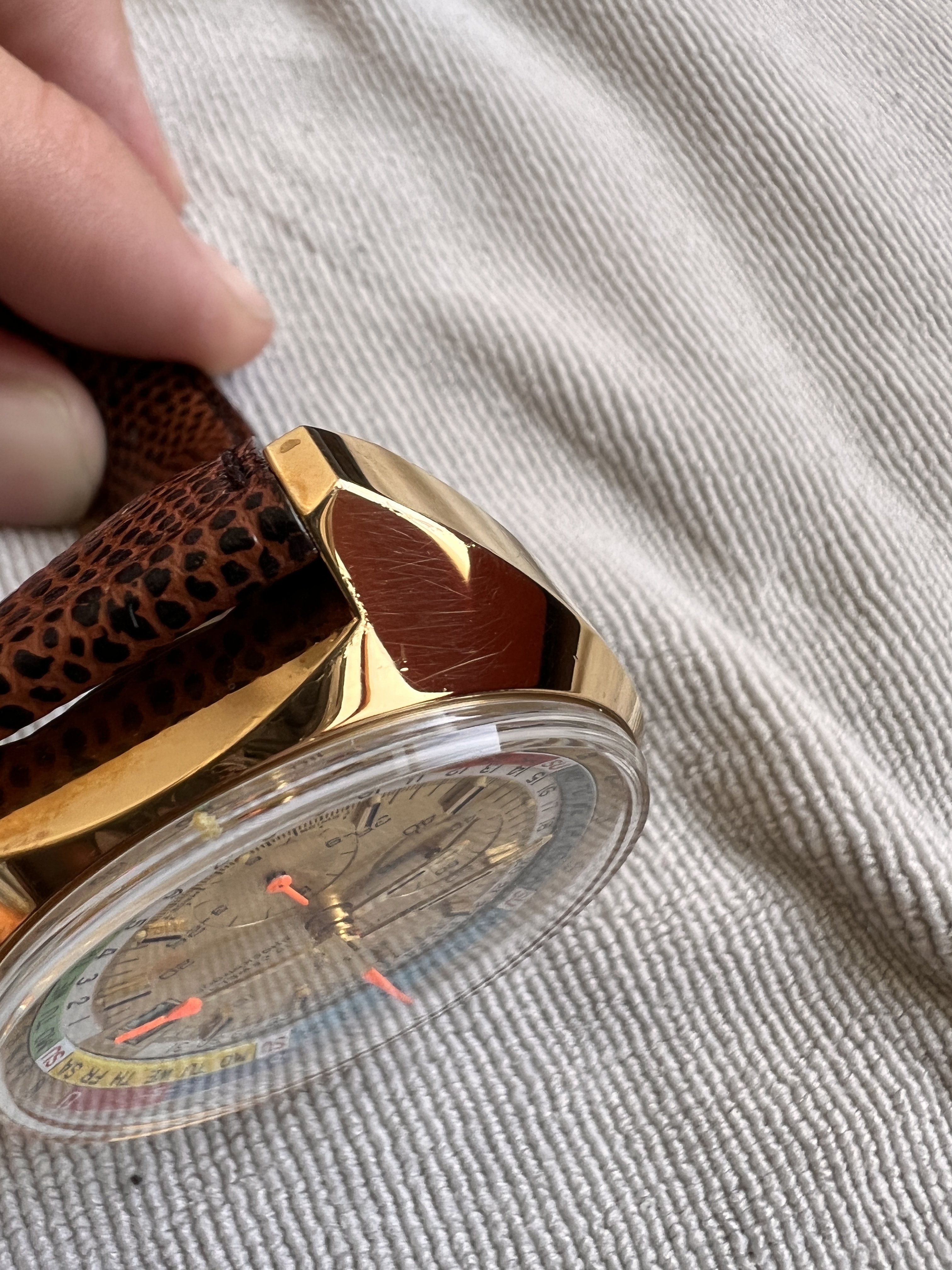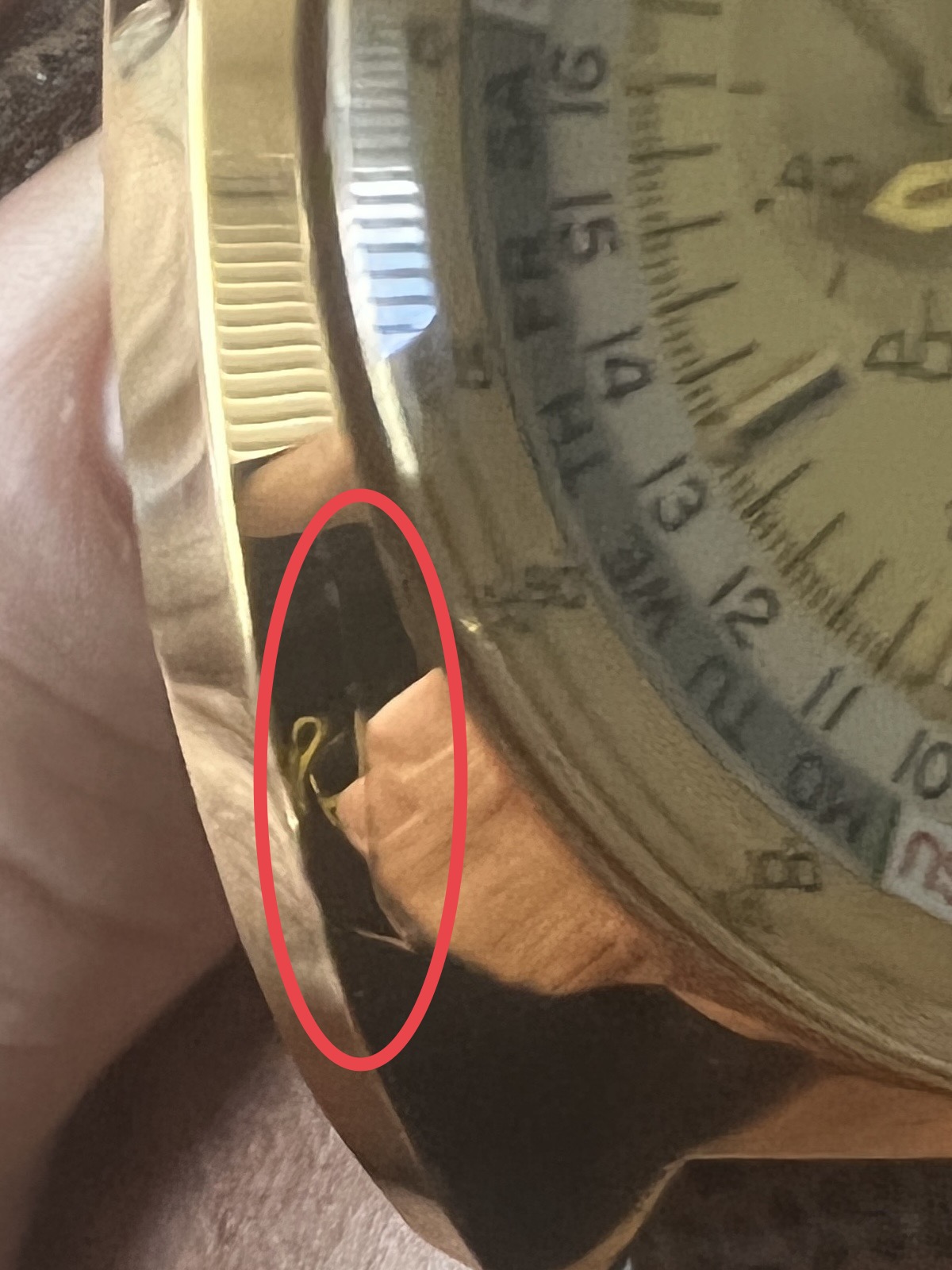 Despite the otherwise NOS condition, there is on the ~7:30 position on the front-facing case a tiny, hairline, scratch in the gold plating. I’ve tried hard to photograph it, and in its most egregious looking lighting - but that is still difficult (see red ring photo). Also, the crown, which is of a slightly different material/plating than the case, has a touch of patina, which I believe could be cleaned off with the appropriate cleaner/cloth but I leave that to its new owner.