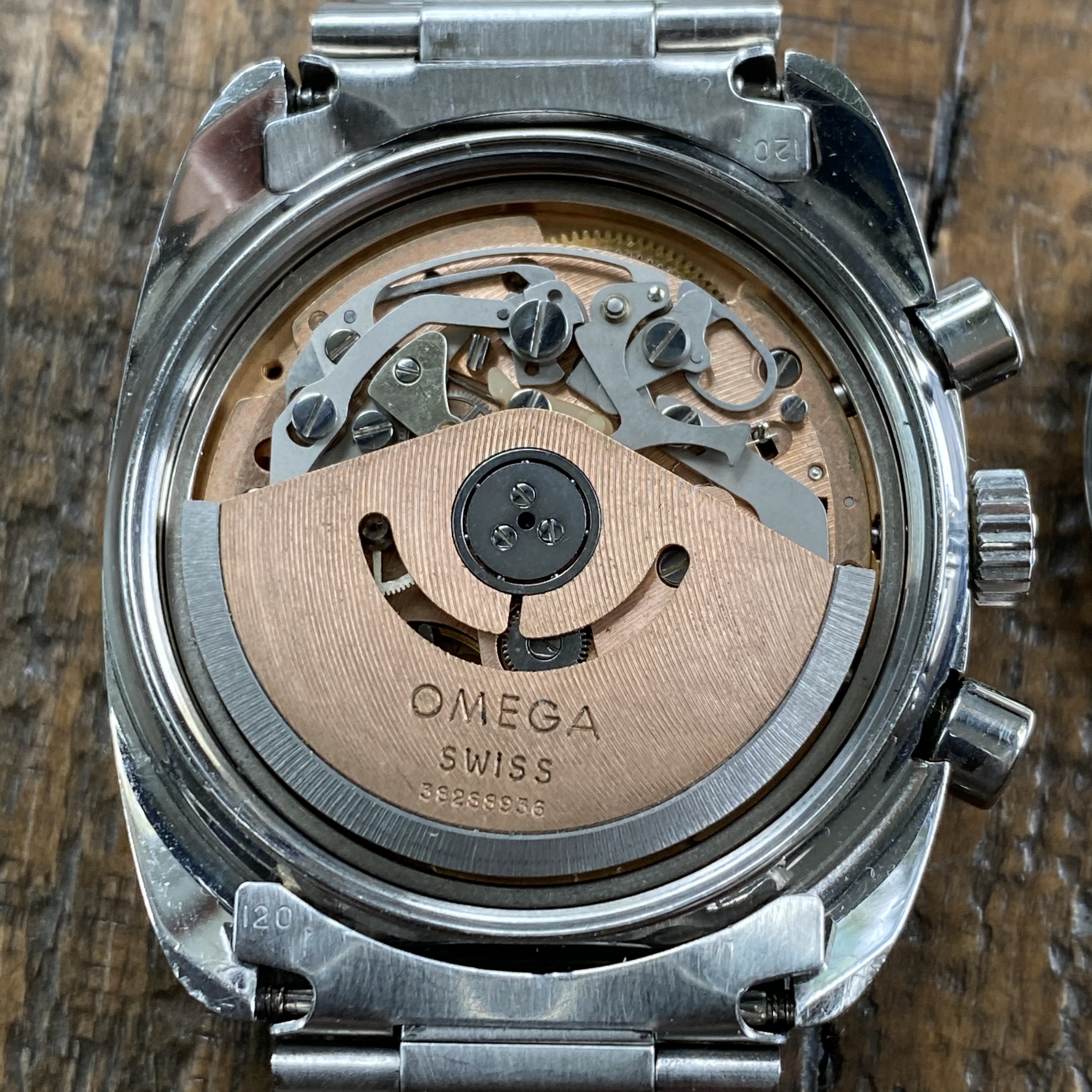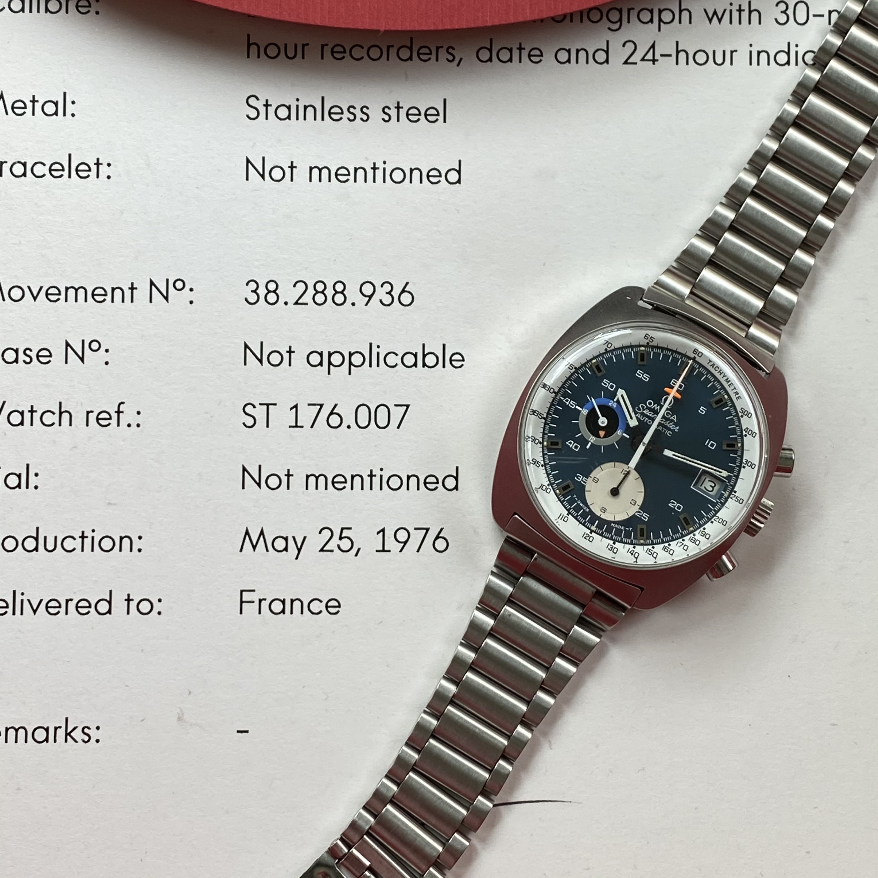 Movement is clean and sets correctly and the chronograph starts, stops, and resets as it should. Movement received a full service in June of 2018. I have only worn it once or twice since it came back from service, and not at all in over a year. Comes with an Extract of the Archives dating the watch to May 1976 and delivered to France.