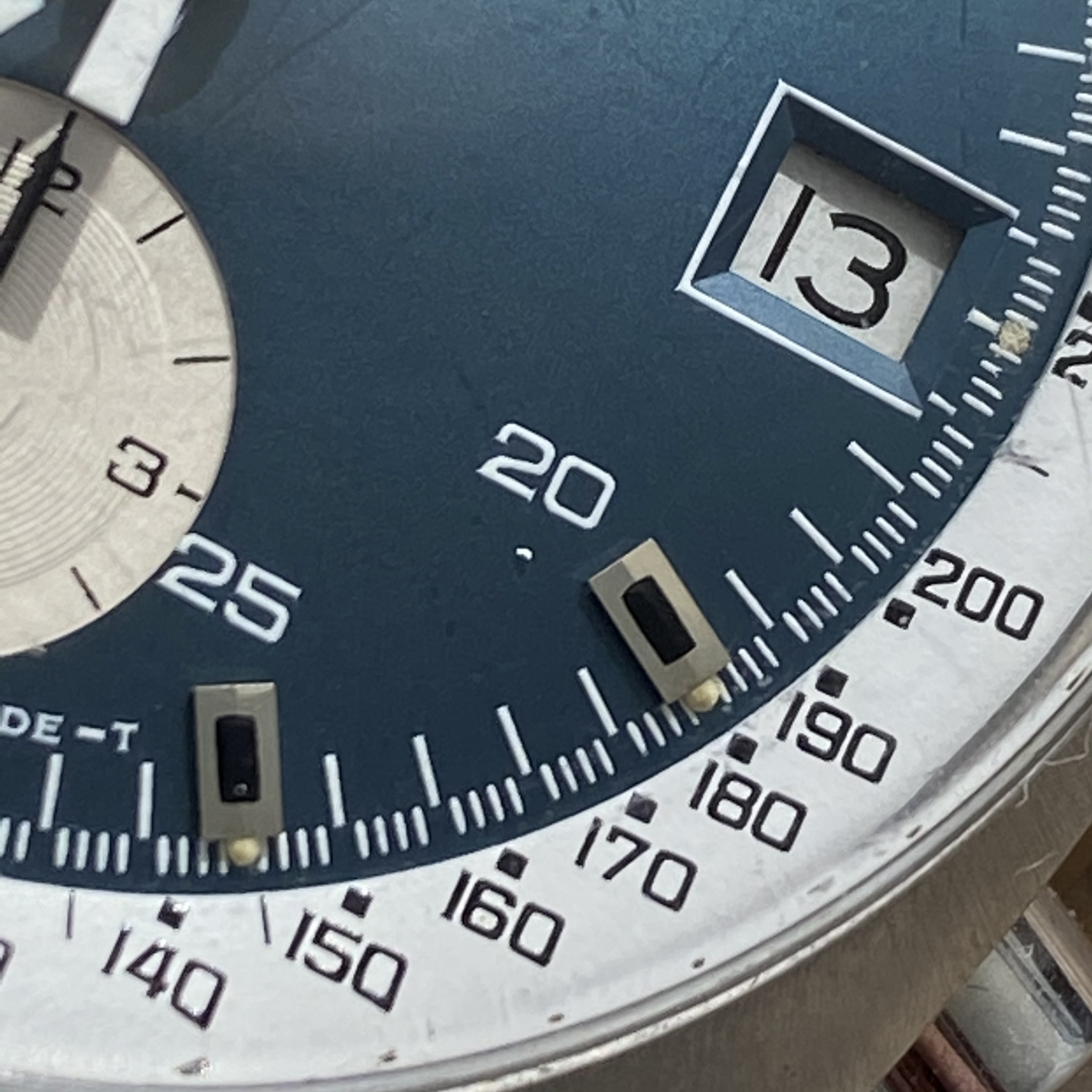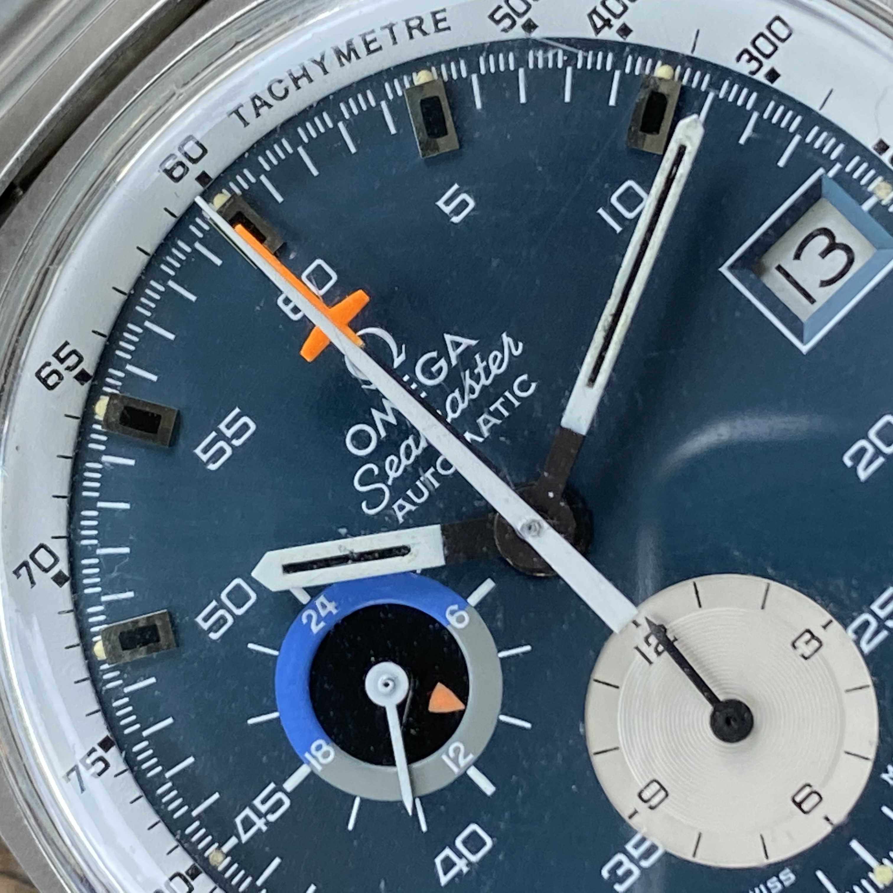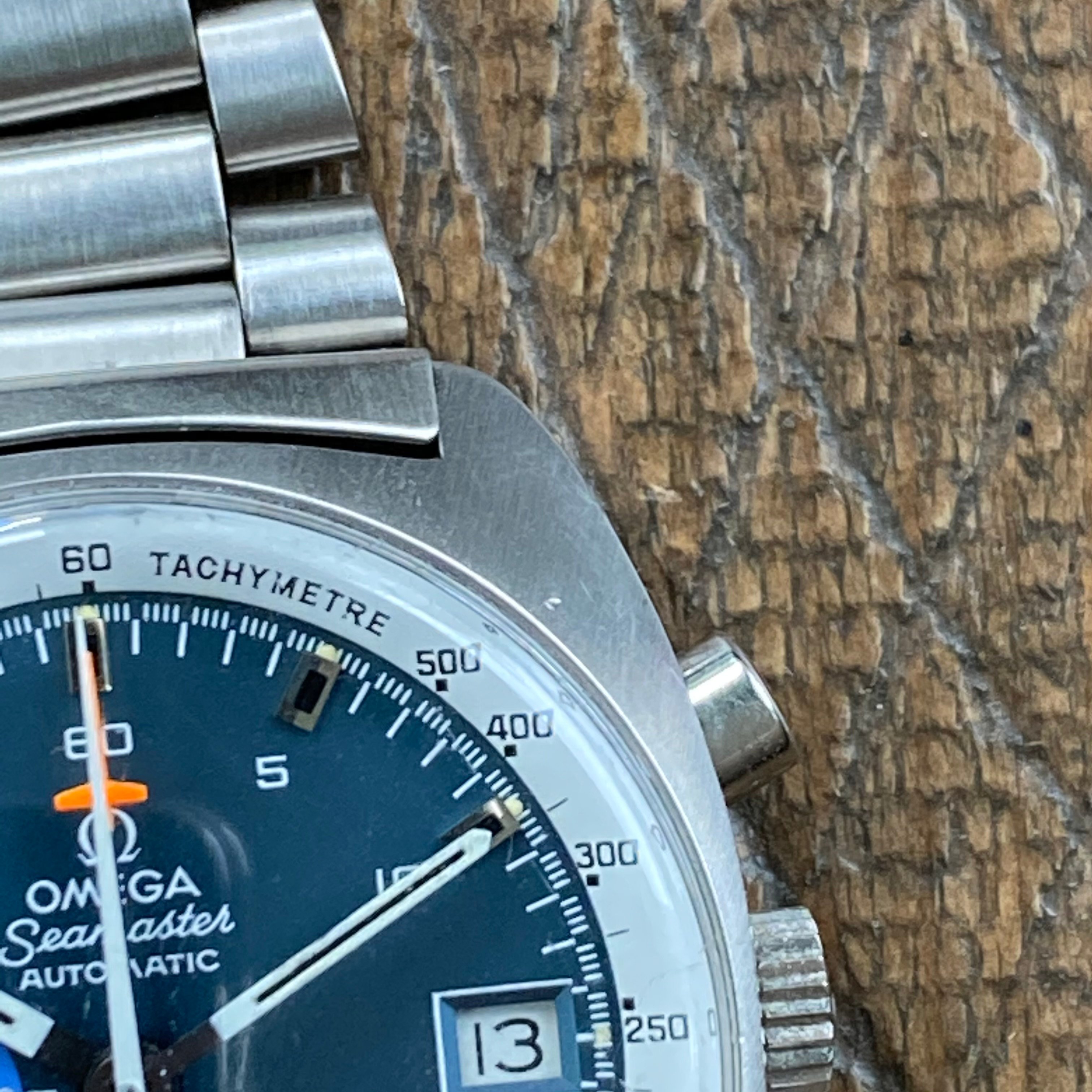 Dial is an A1 variant with OSA text order (OMEGA Seamaster AUTOMATIC), satin blue in excellent condition. I believe it to be original. It has lost some of the “shimmer” that the satin finish originally had, but the paint and lacquer are still intact, as are the tritium lume dots outside the hour markers. No signs of water damage. There appears to be a small speck of dust on the dial near the 4:00 marker (see image). Other imperfections shown in photos all appear to be shadows from scratches in the crystal or dust on the crystal I failed to wipe away.