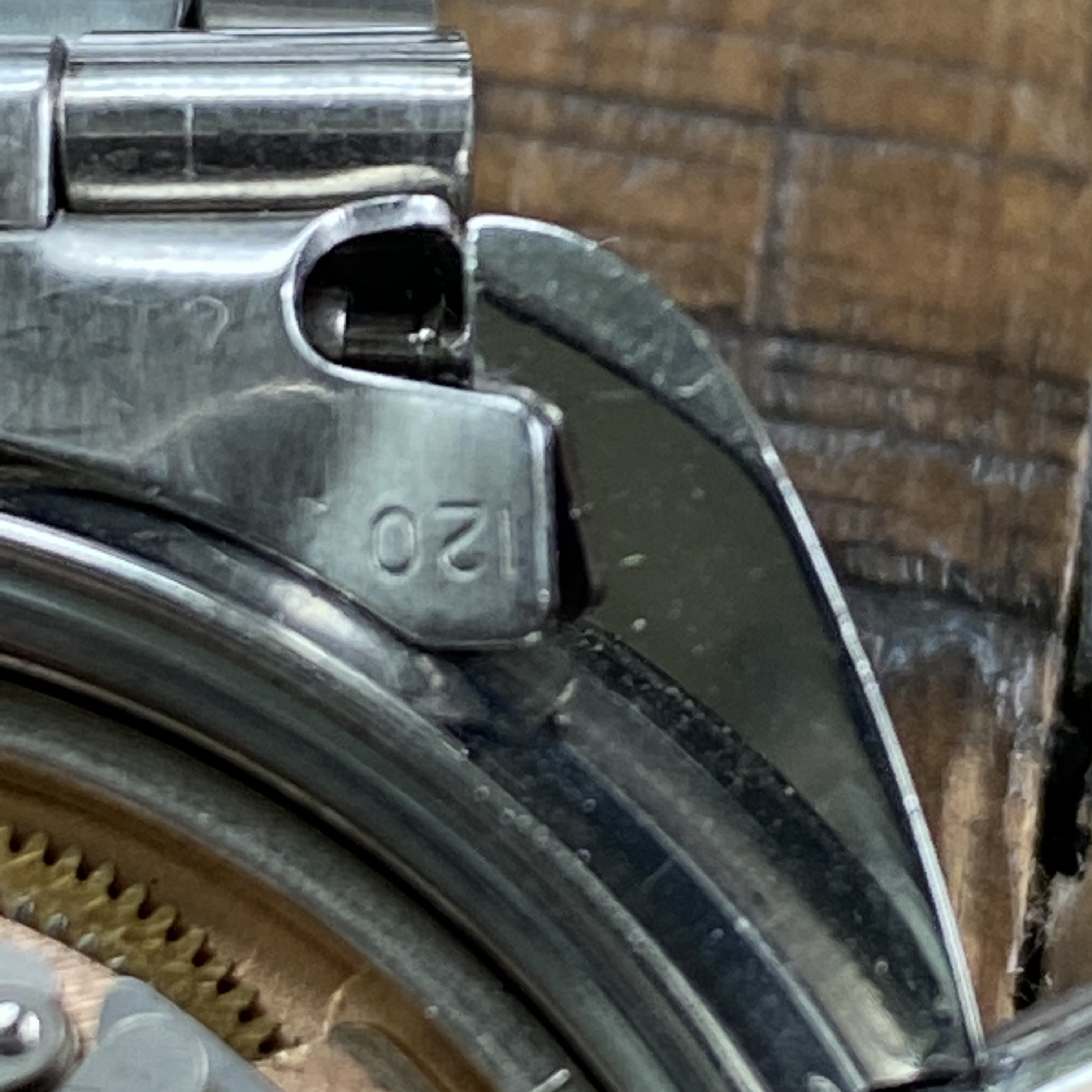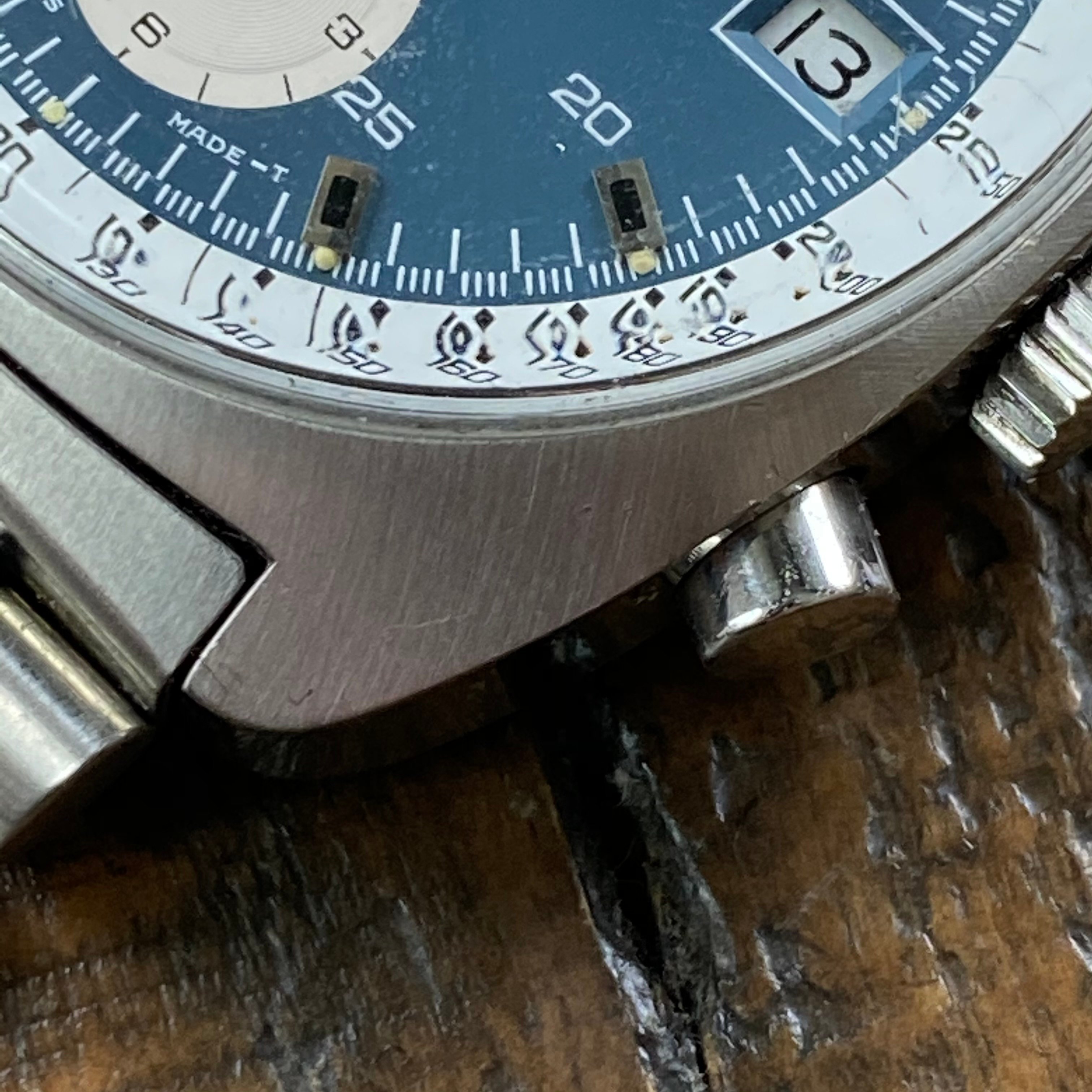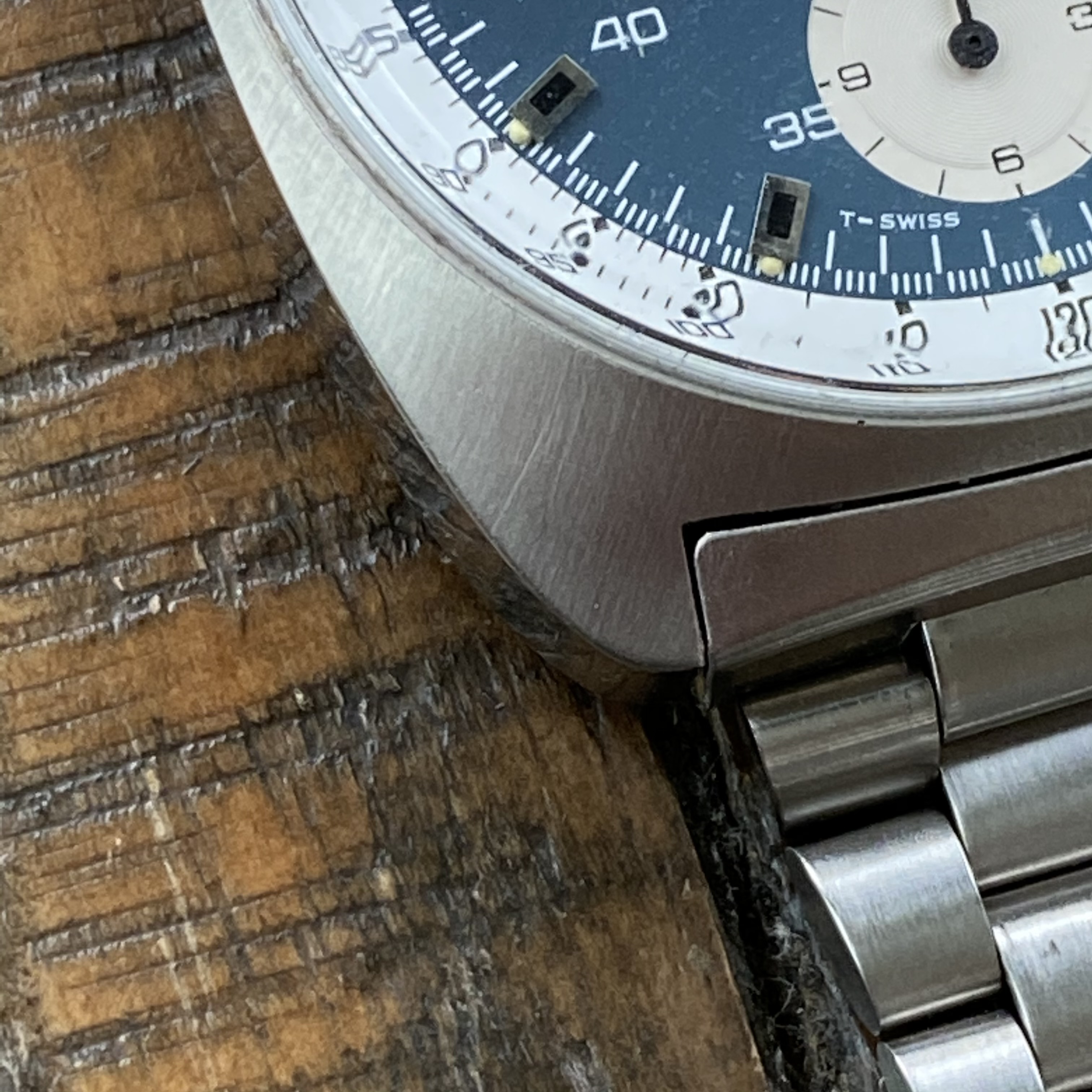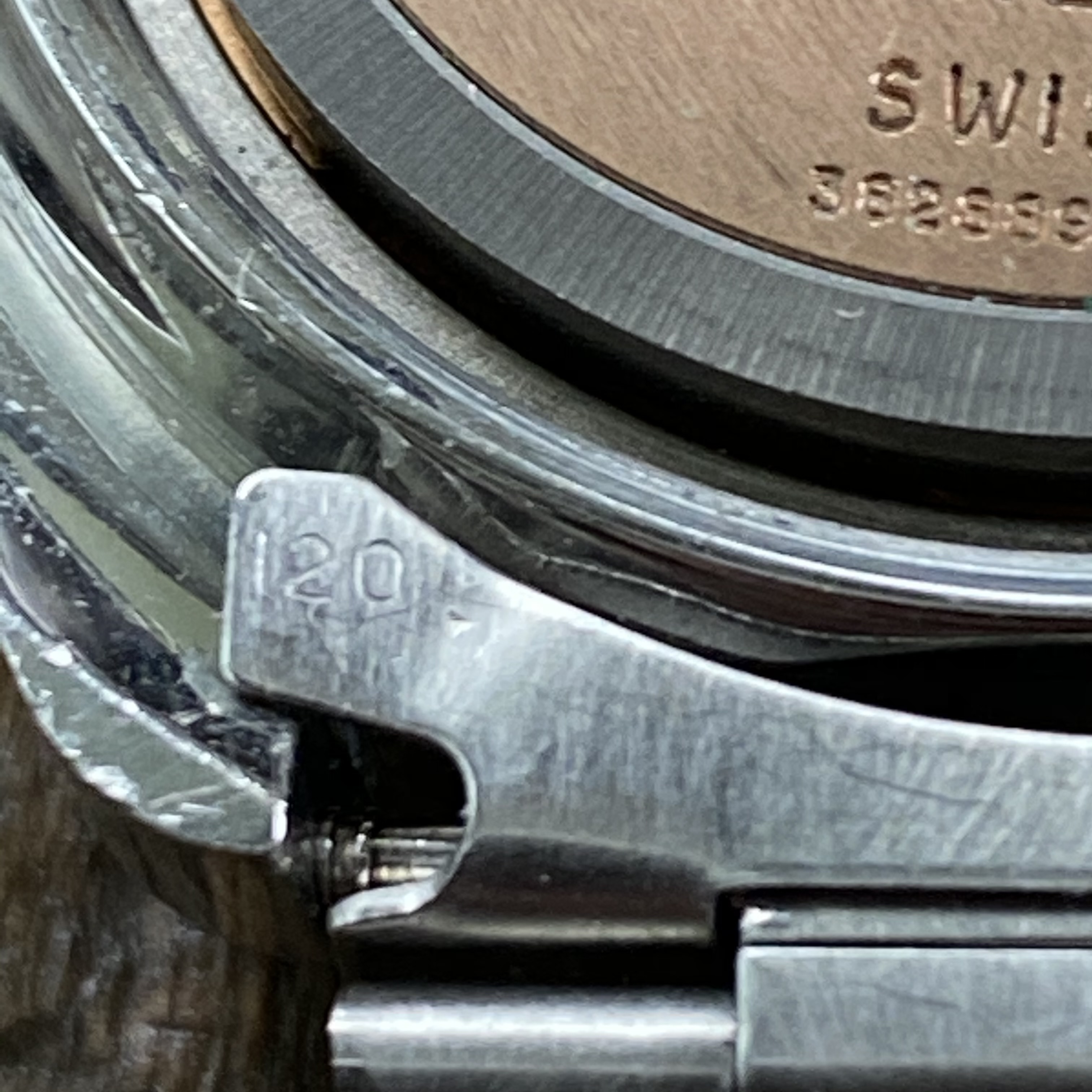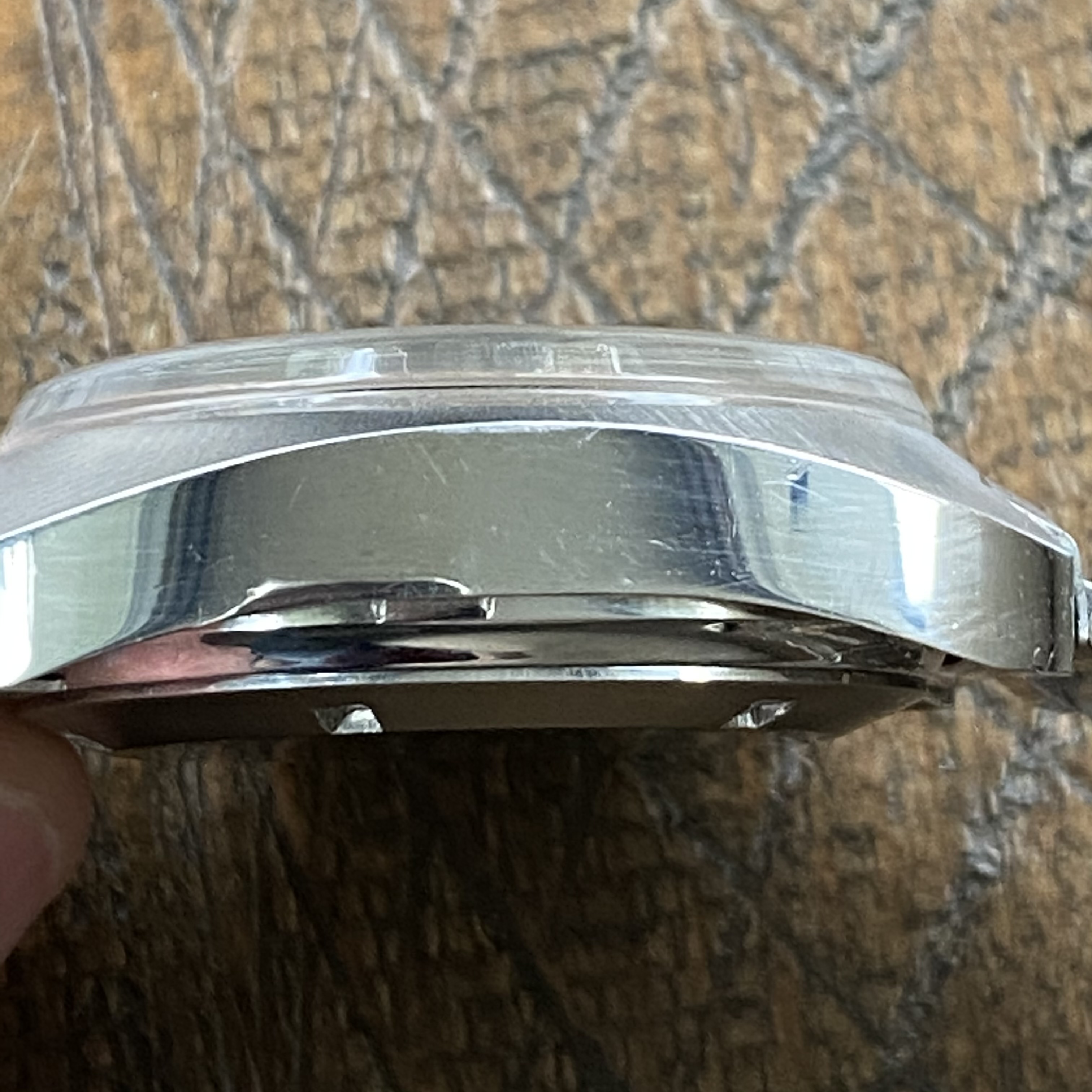 Case appears to have been lightly polished in the past but the transitions from brushed top to polished sides remain straight.