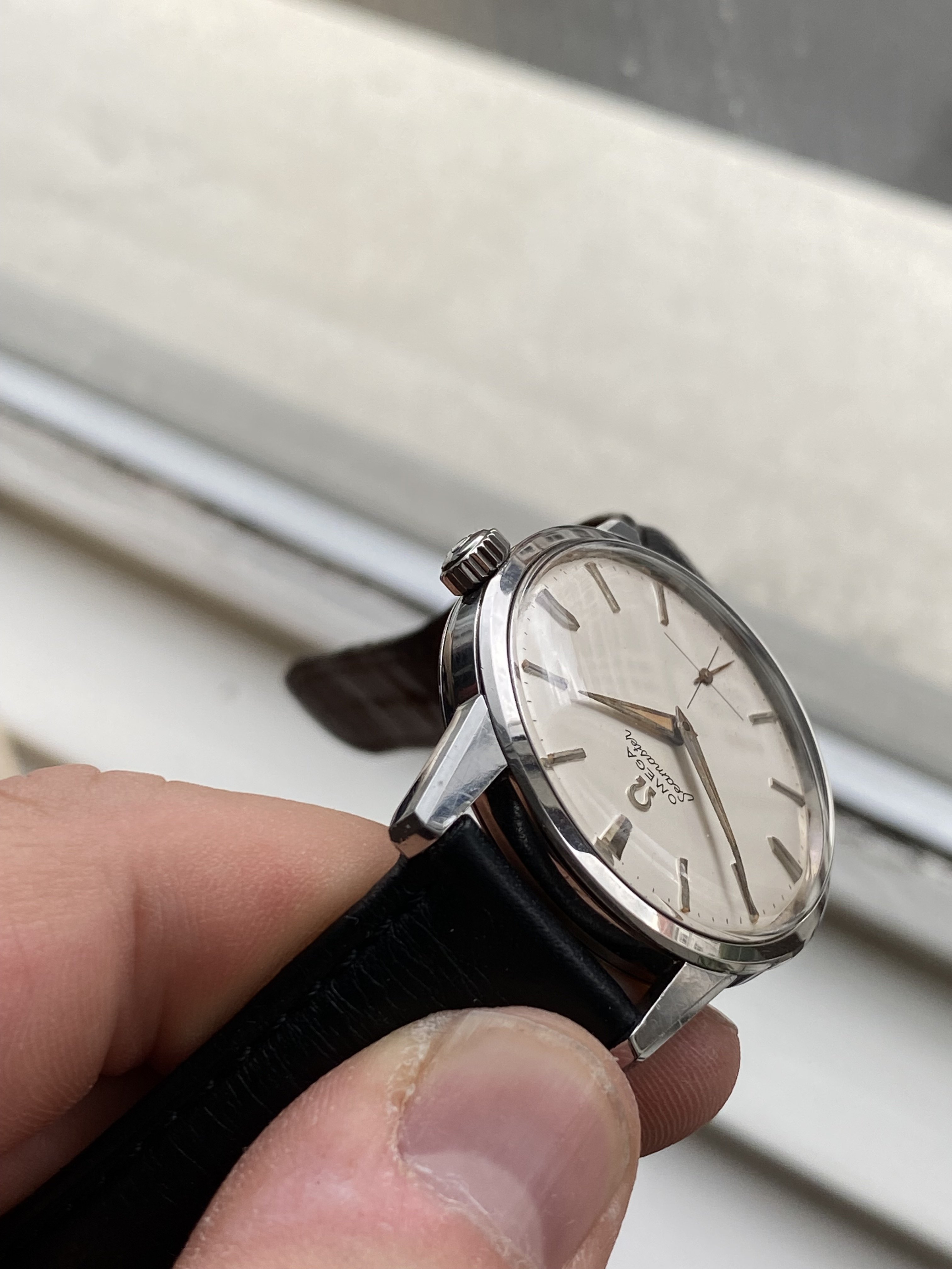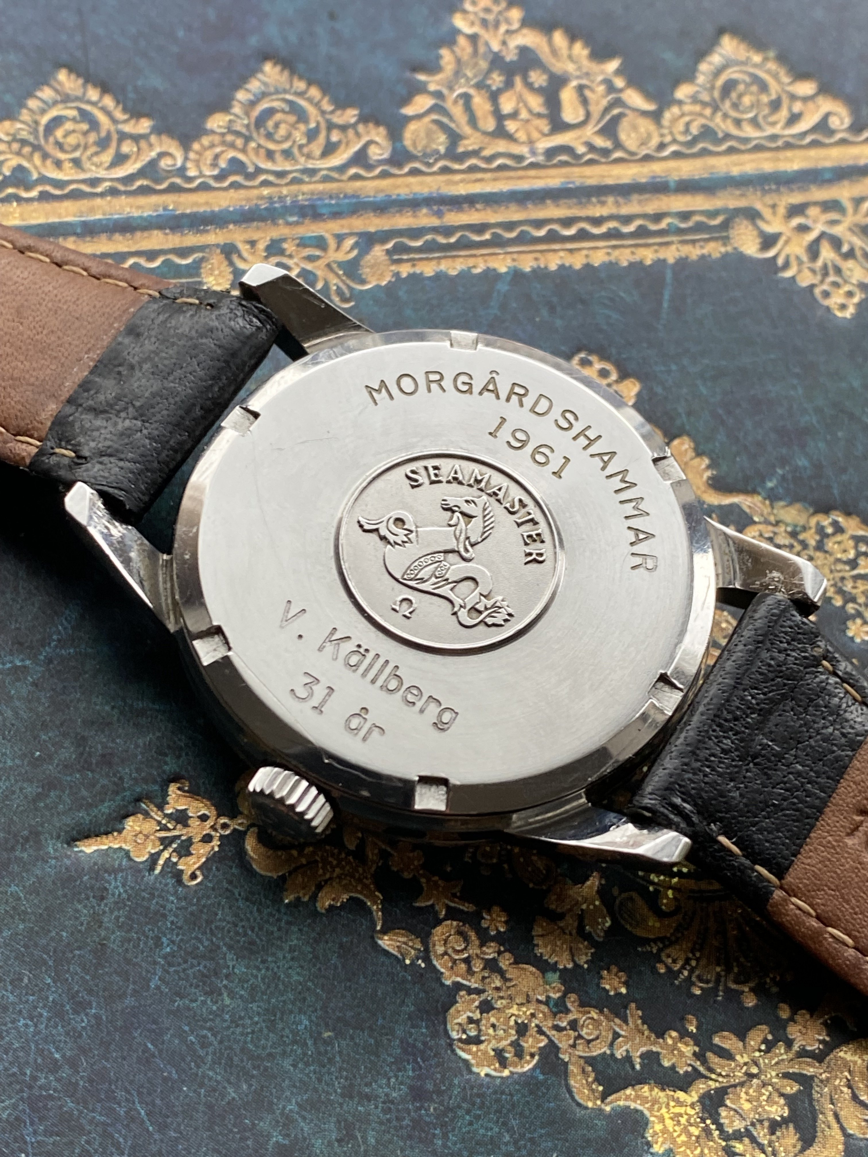 Case: Unpolished case in a very good condition with sharp lugs and intact facets. It measures 35 mm. without the original signed Omega crown. The caseback has an inscription.