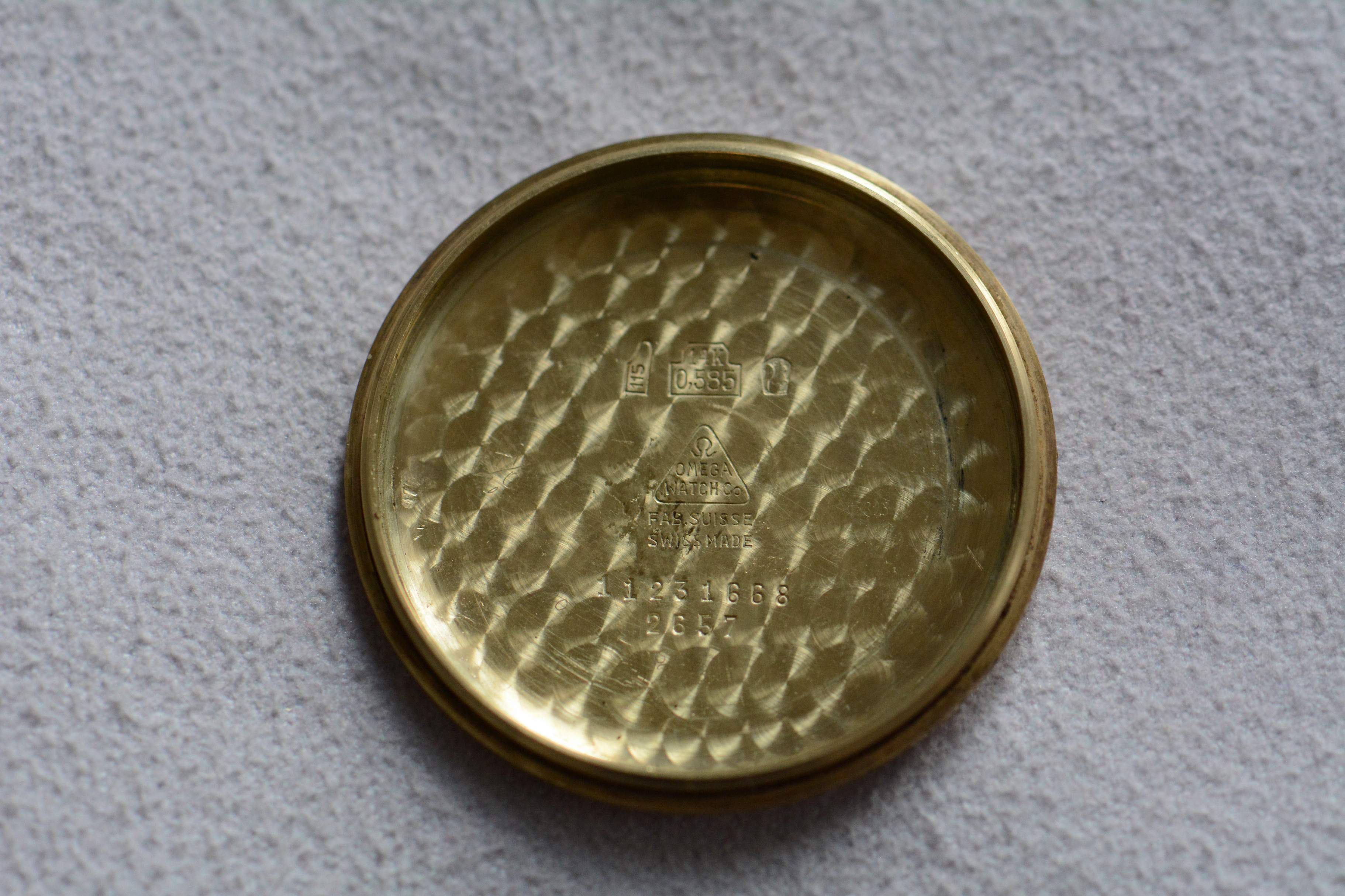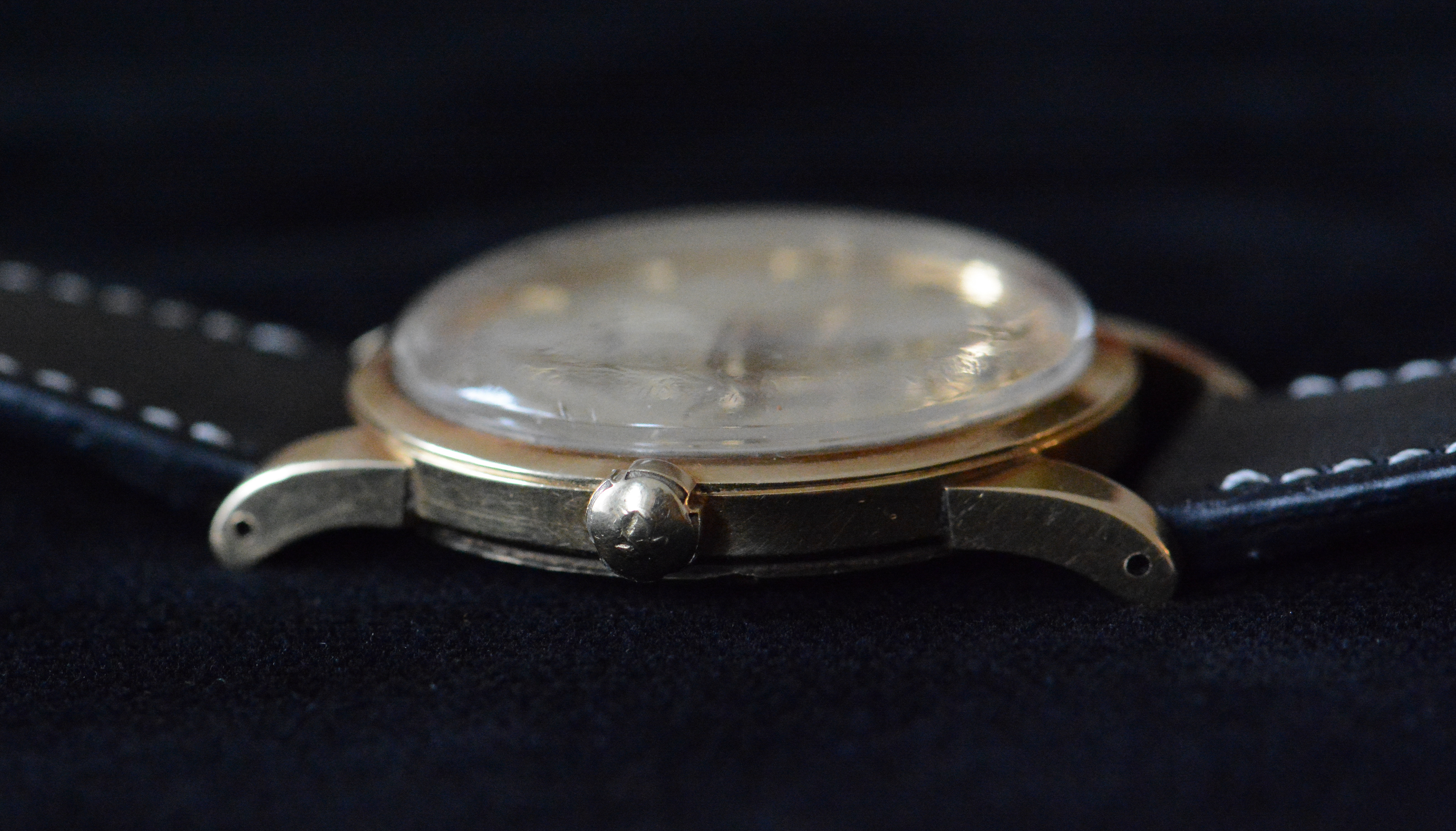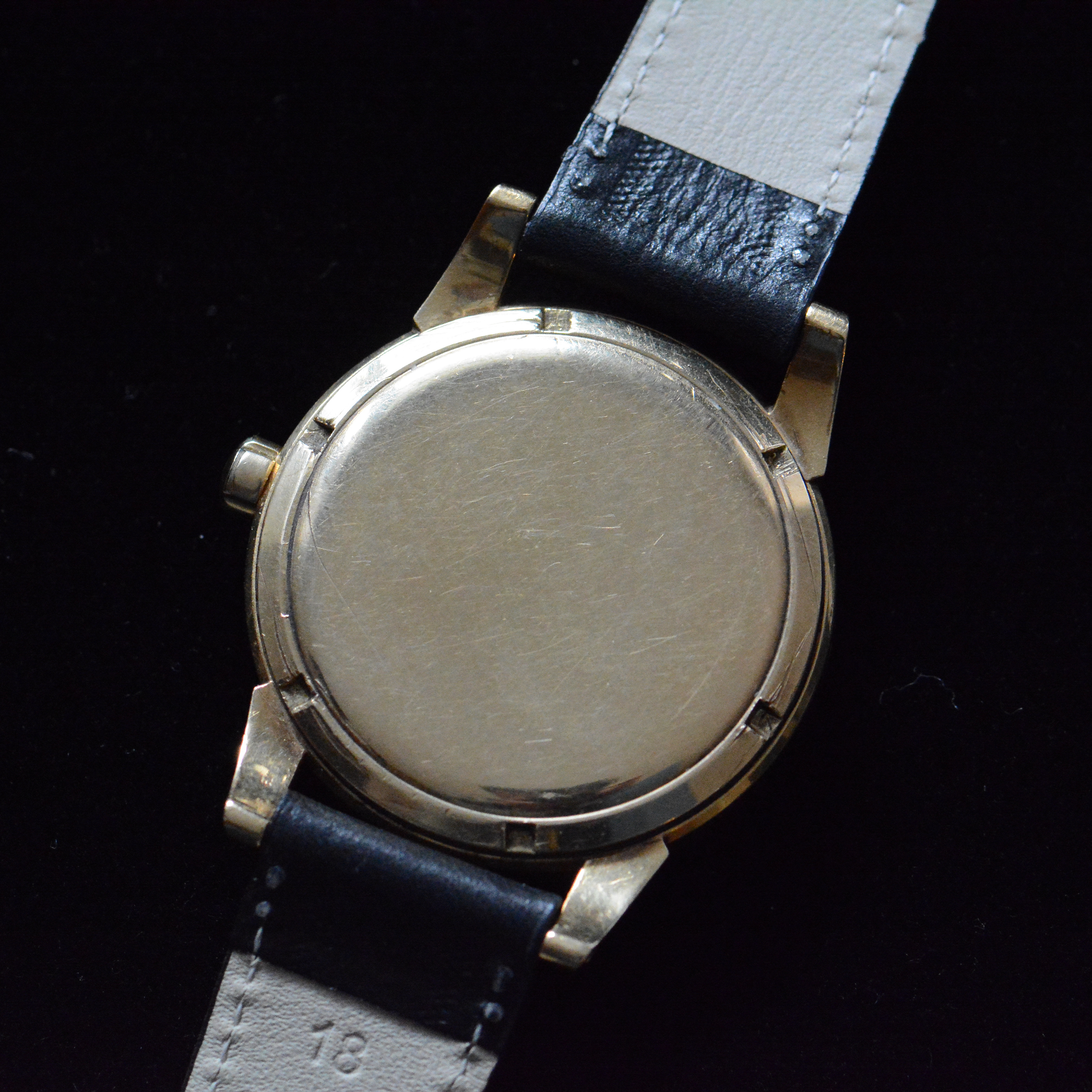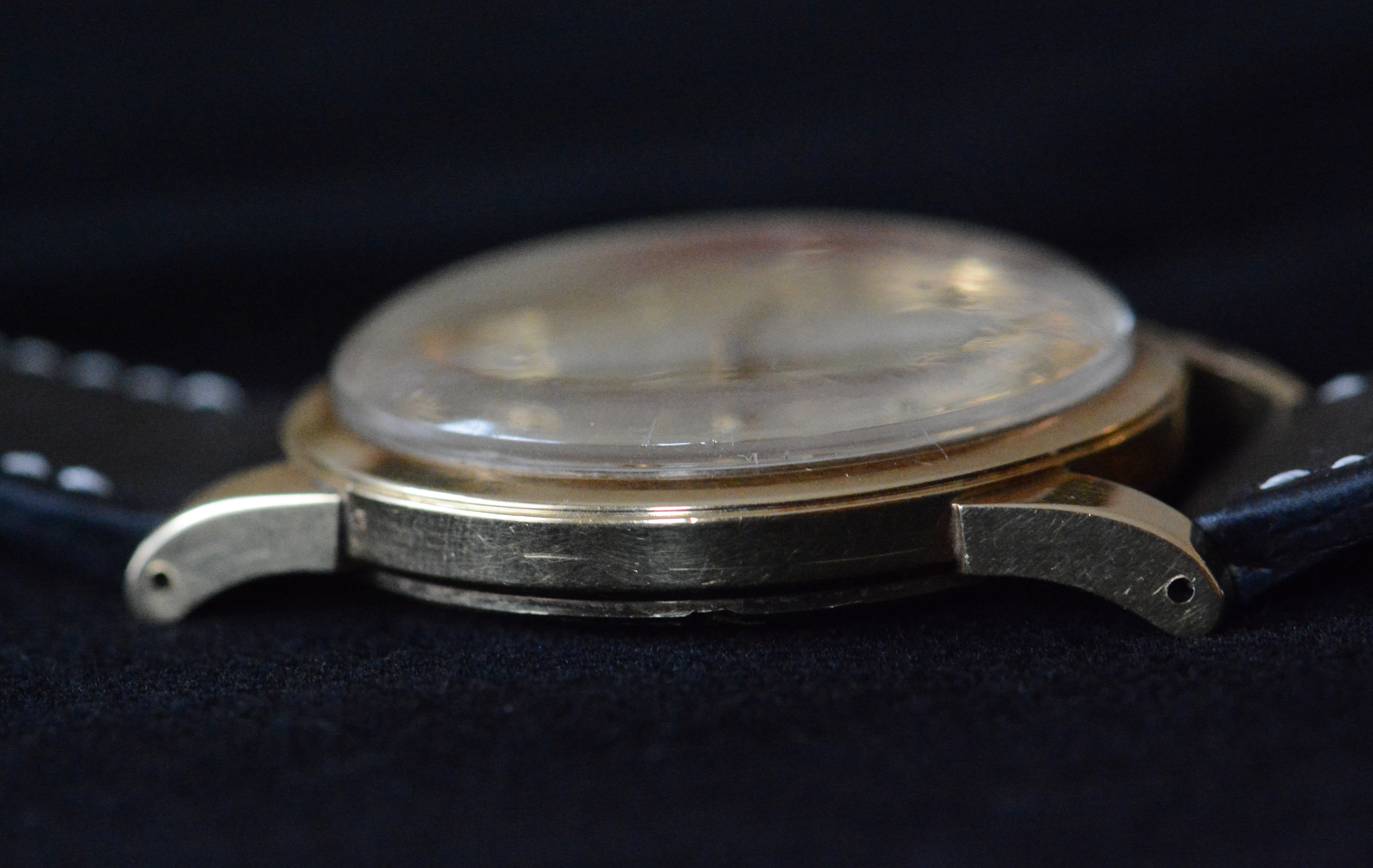 Case: 14k solid gold. It’s very sharp case for being solid gold (partly thanks to 14k being harder than 18k). Look at the edges of the lugs and the bezel. Sadly the case back has several scratches from past opening attempts (not by me) as well as some shallow dents.