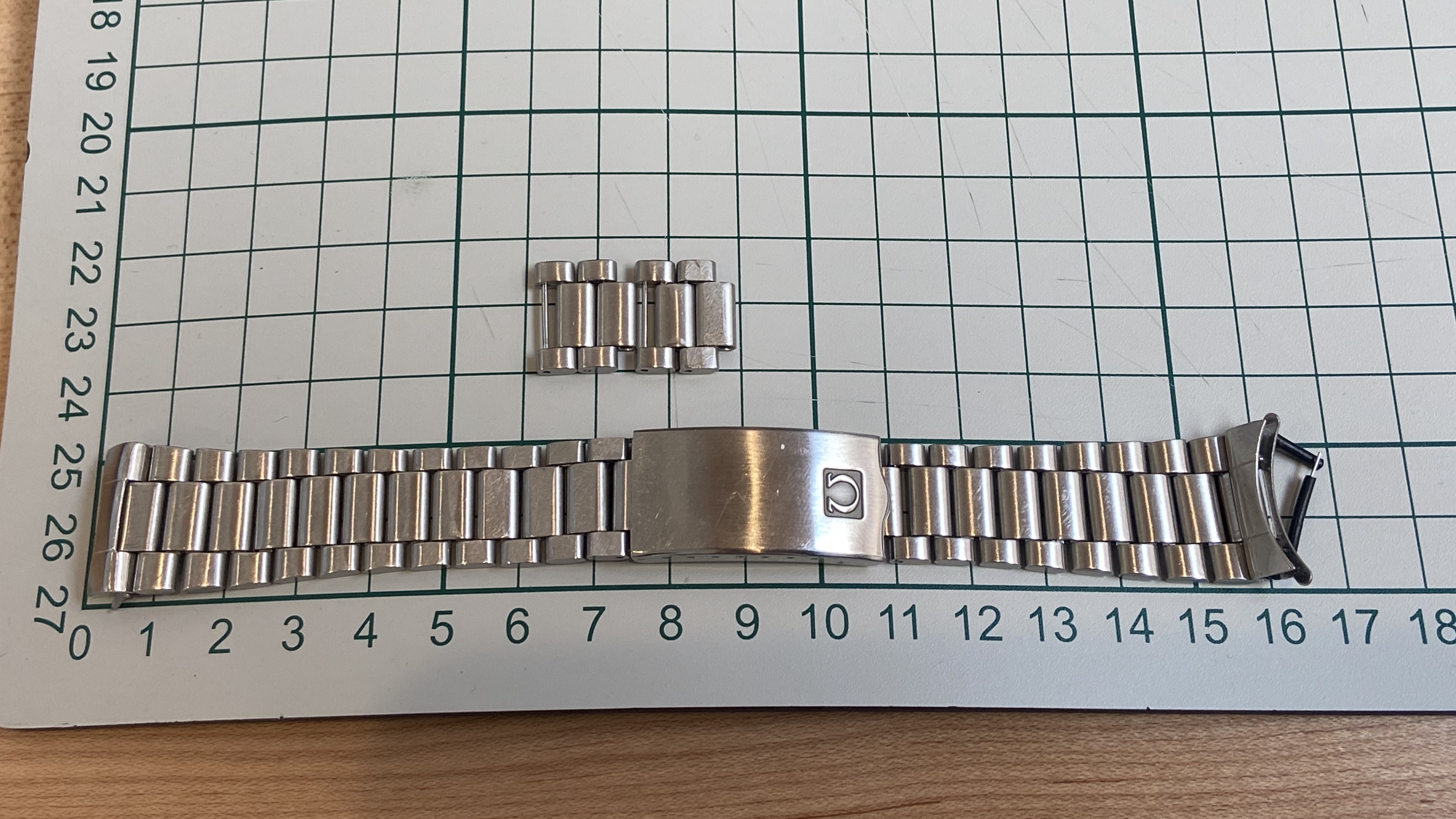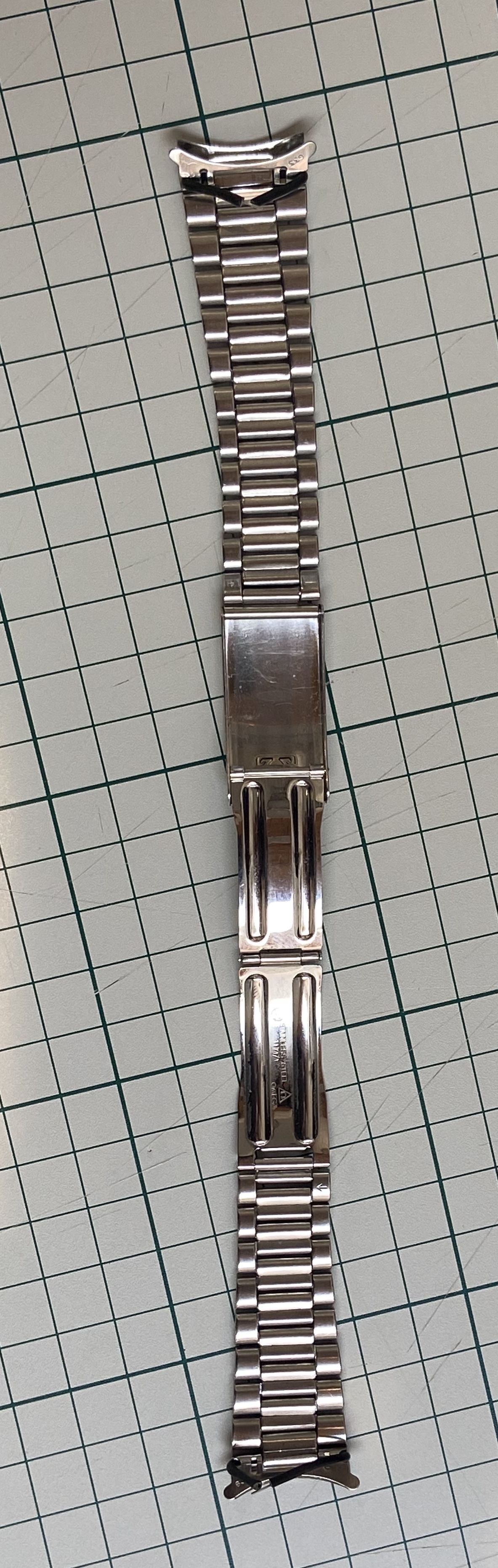 Bracelet is in good physical condition (functionally and visually) with wear consistent with age. Not polished so a few scuffs and scratches, desk diver marks on the clasp, but nothing big to note. This is a nice long bracelet, currently set for an approx 7.5" wrist with an additional 4 links included. I believe it will fit from 6.75" to 8.5" wrists with its adjustments and extra links but please use your knowledge and judgment on sizing. The 20mm 633 end links shown are of course included. 19 links (8 on one side 11 on the other) on the bracelet currently plus the 4 additional for 23 total links.