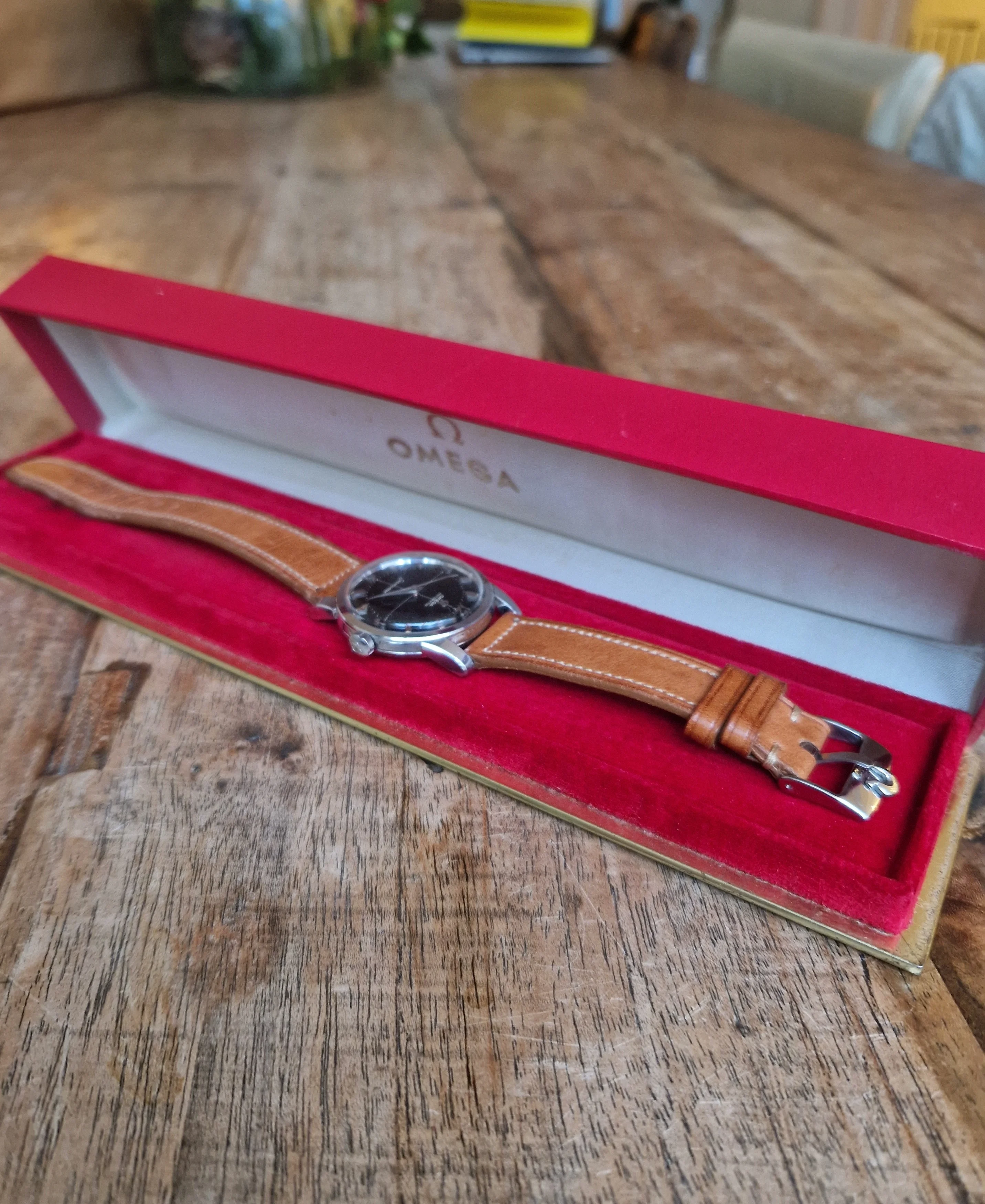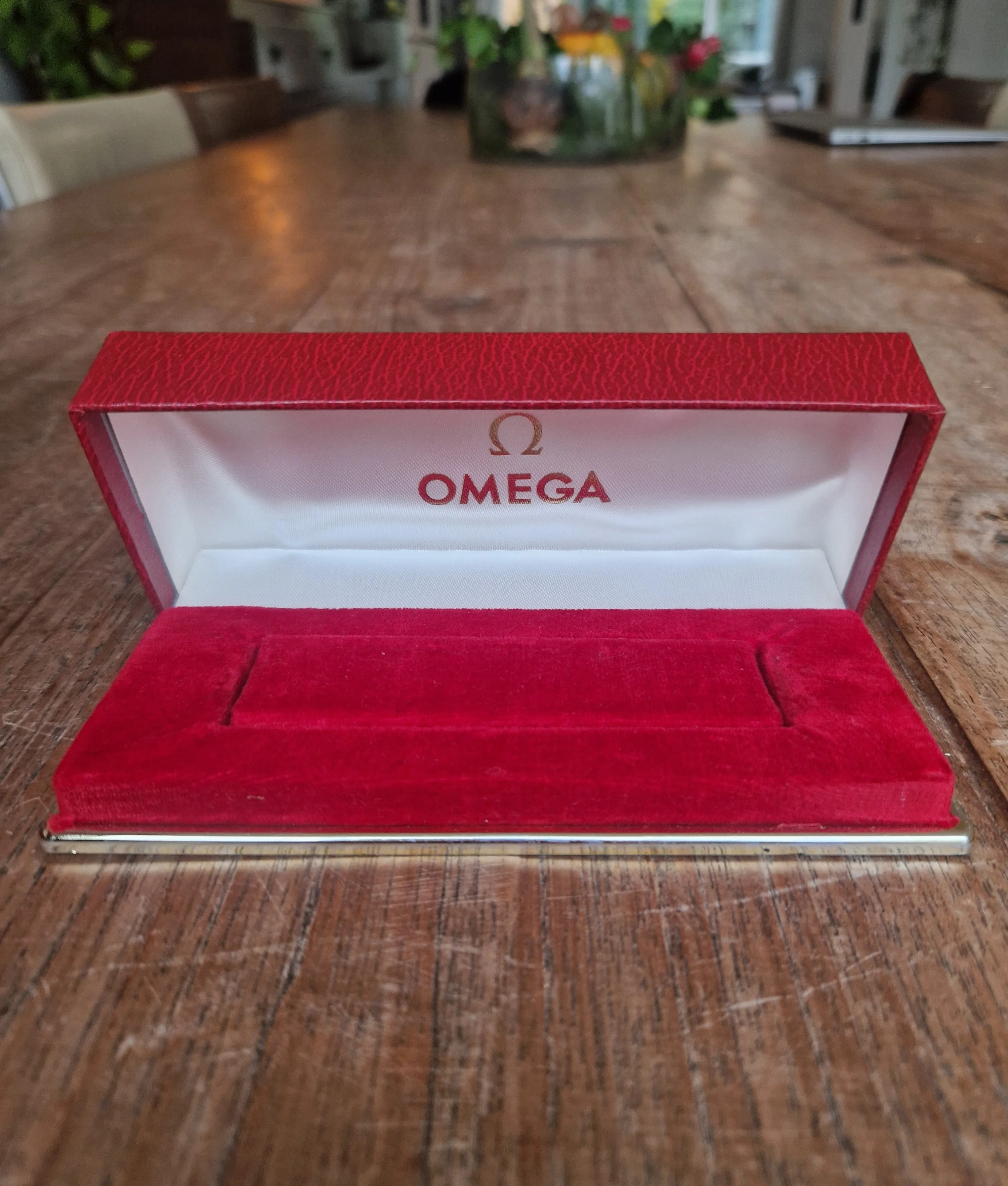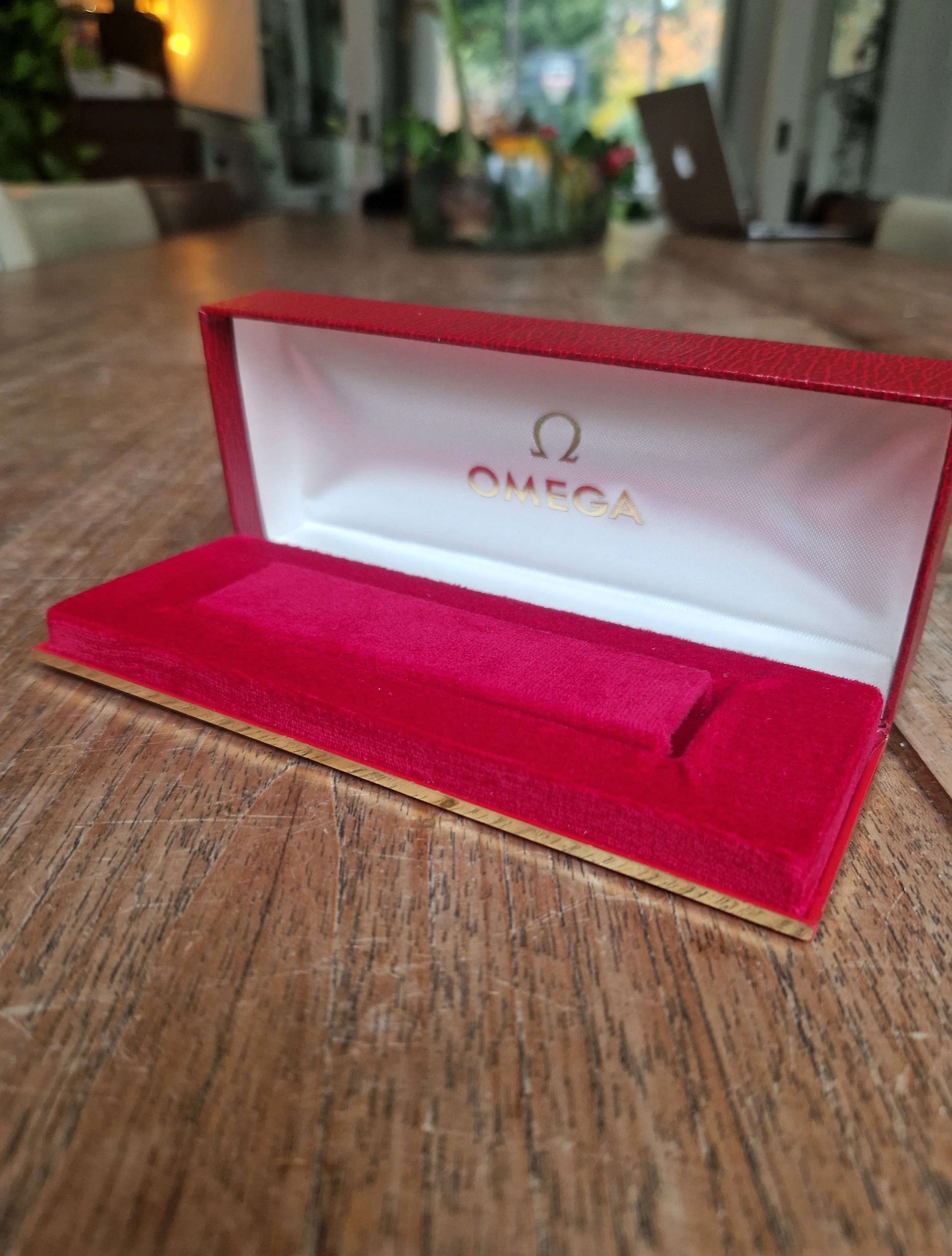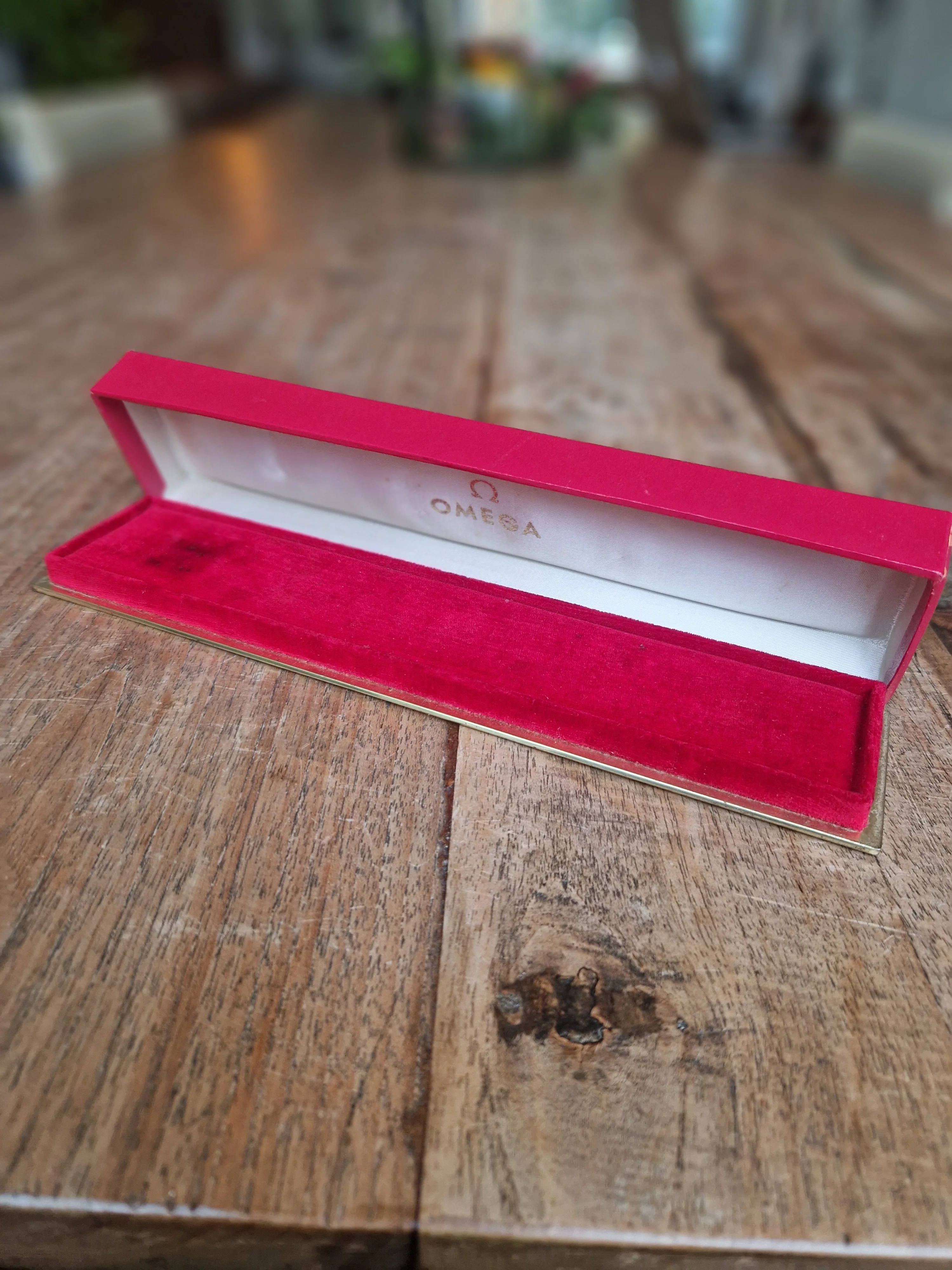 2. 1960’s Omega box ( nr.1). This is the version with the removeable insert. Excellent condition. 14 x 5 x 2.5cm. €75