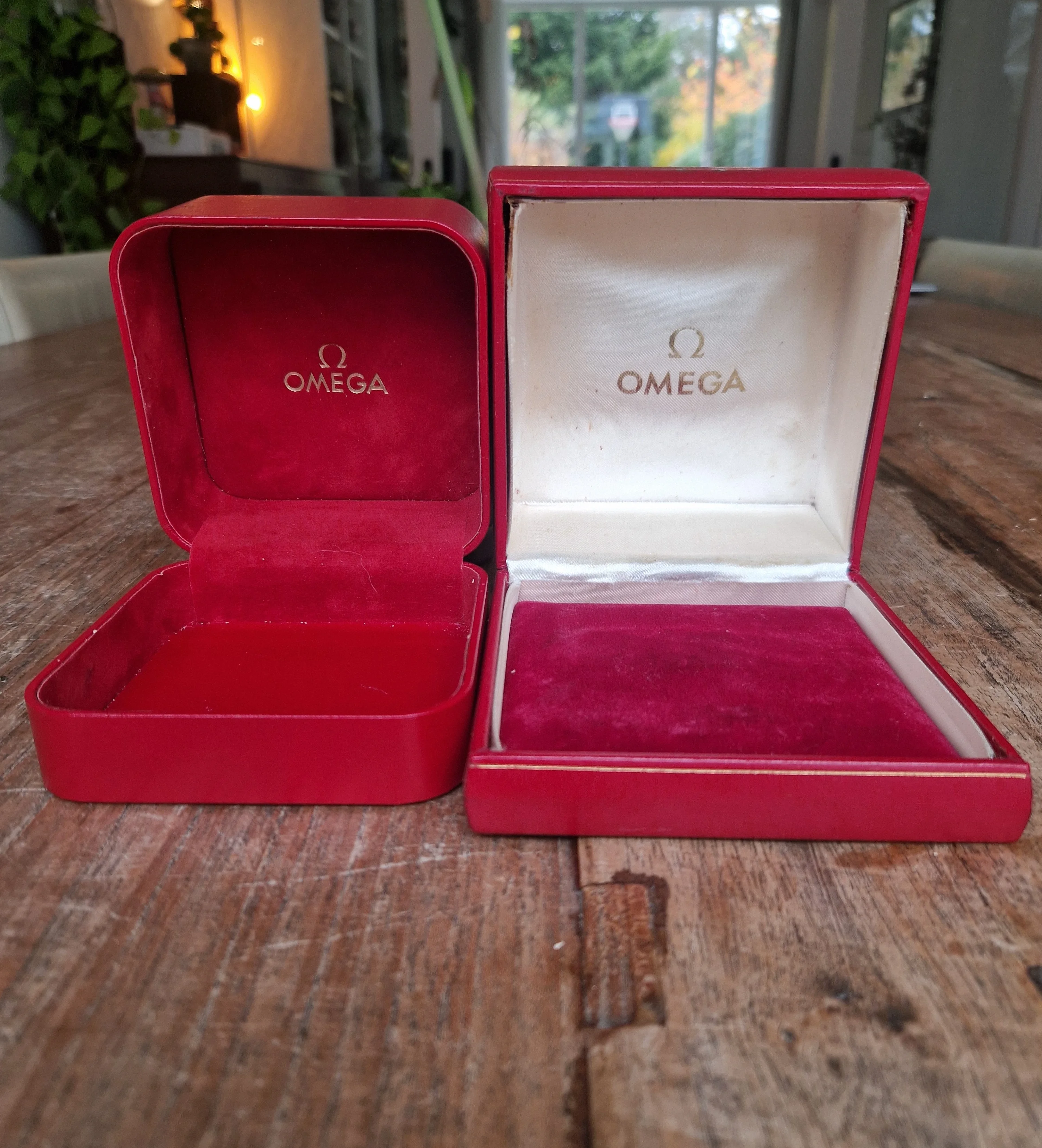 4. Sold! - 2x Omega boxes. 1960’s both in as seen condition missing part of the inserts. Both hinges are good. Small one: 9 x 9 x 6cm. Larger one: 10 x 10 x 6cm. €20 for the pair