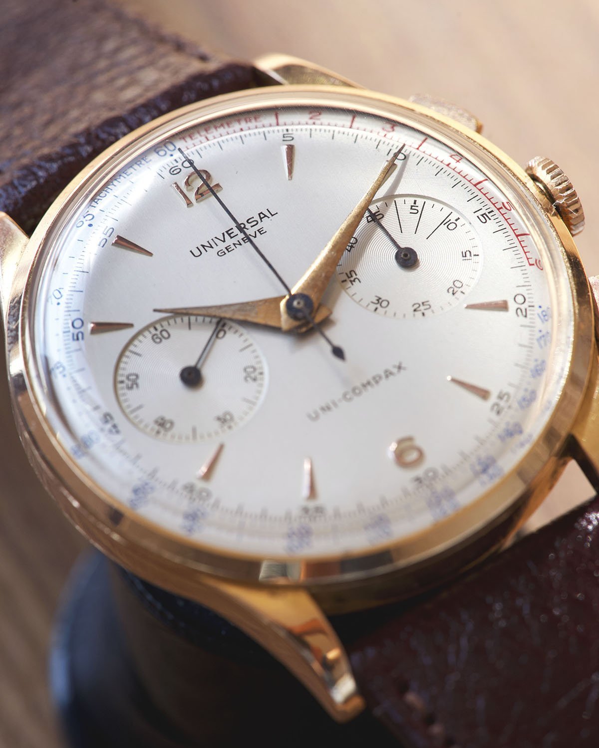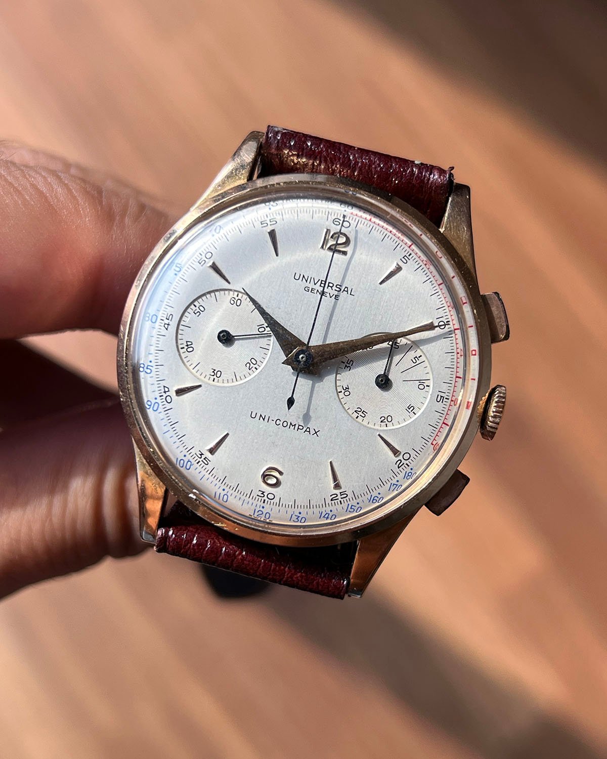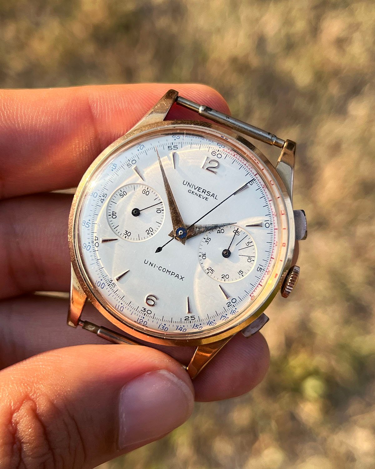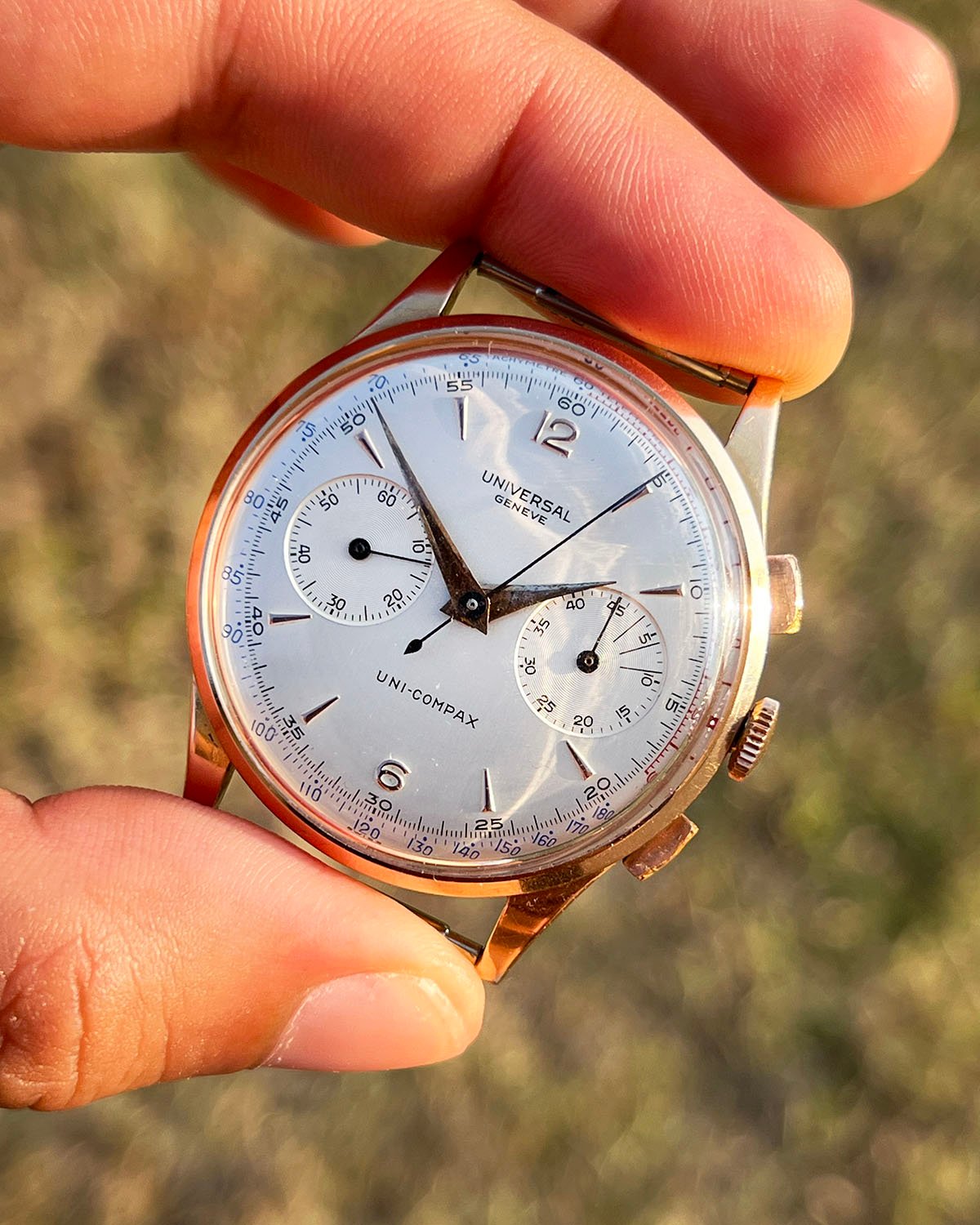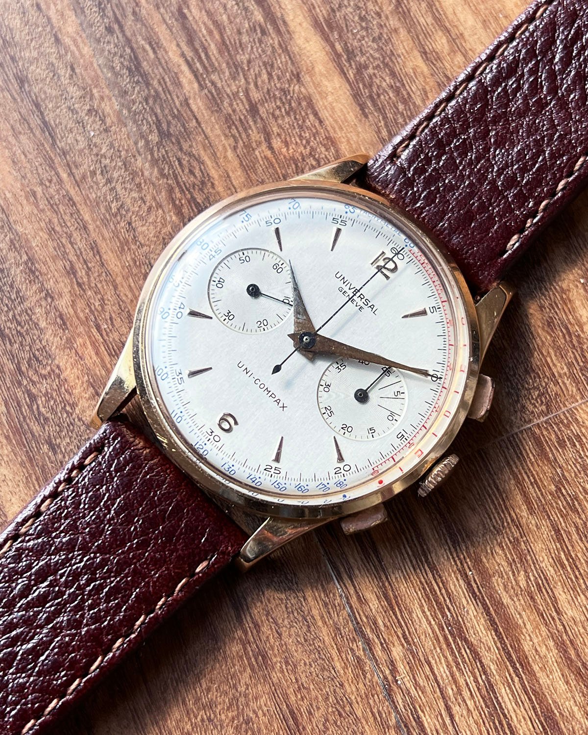 Some specs: circa 1951, 37mm 18kt pink gold case, 124103 ref number, Uni-Compax by Universal Geneve.