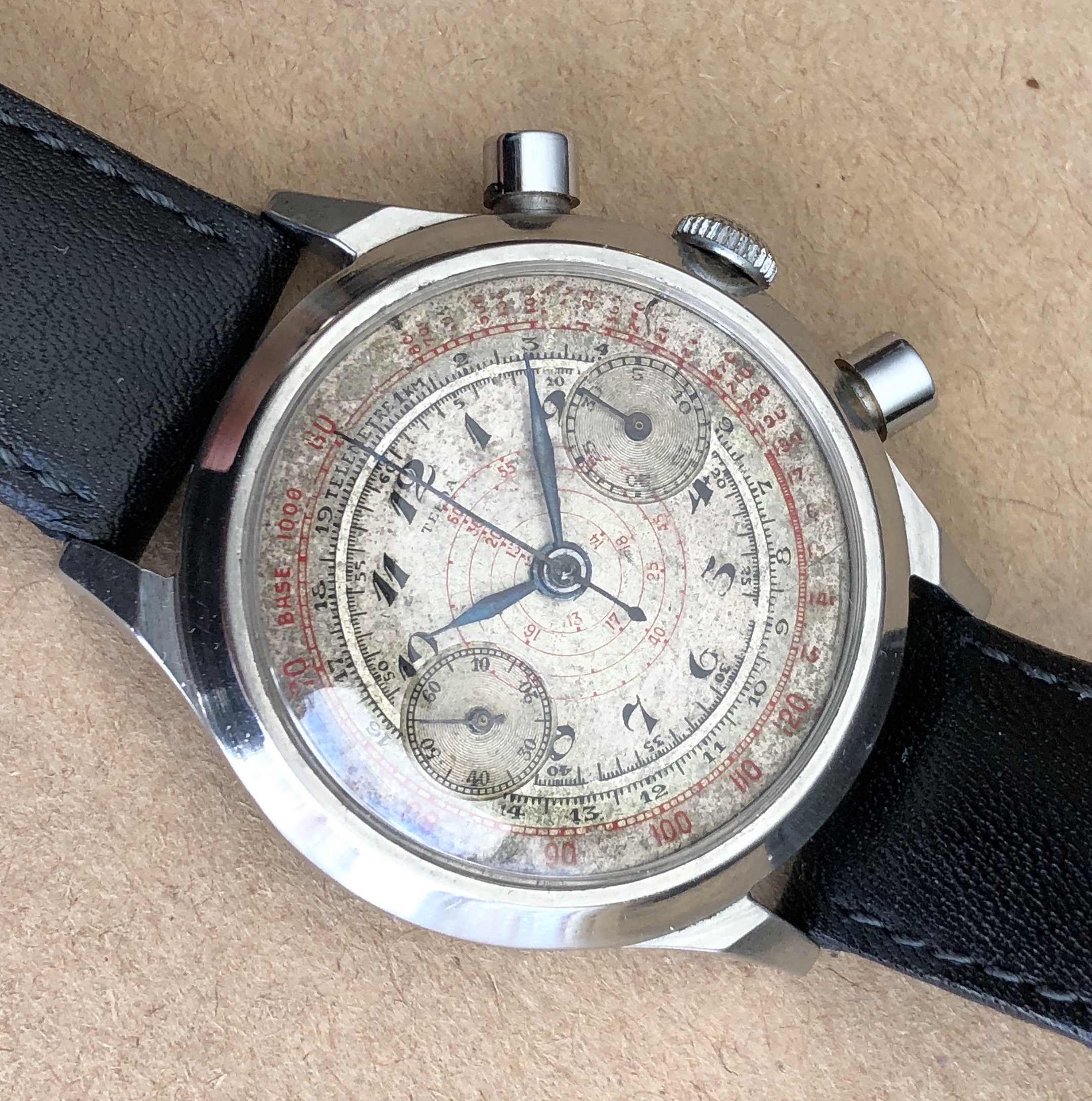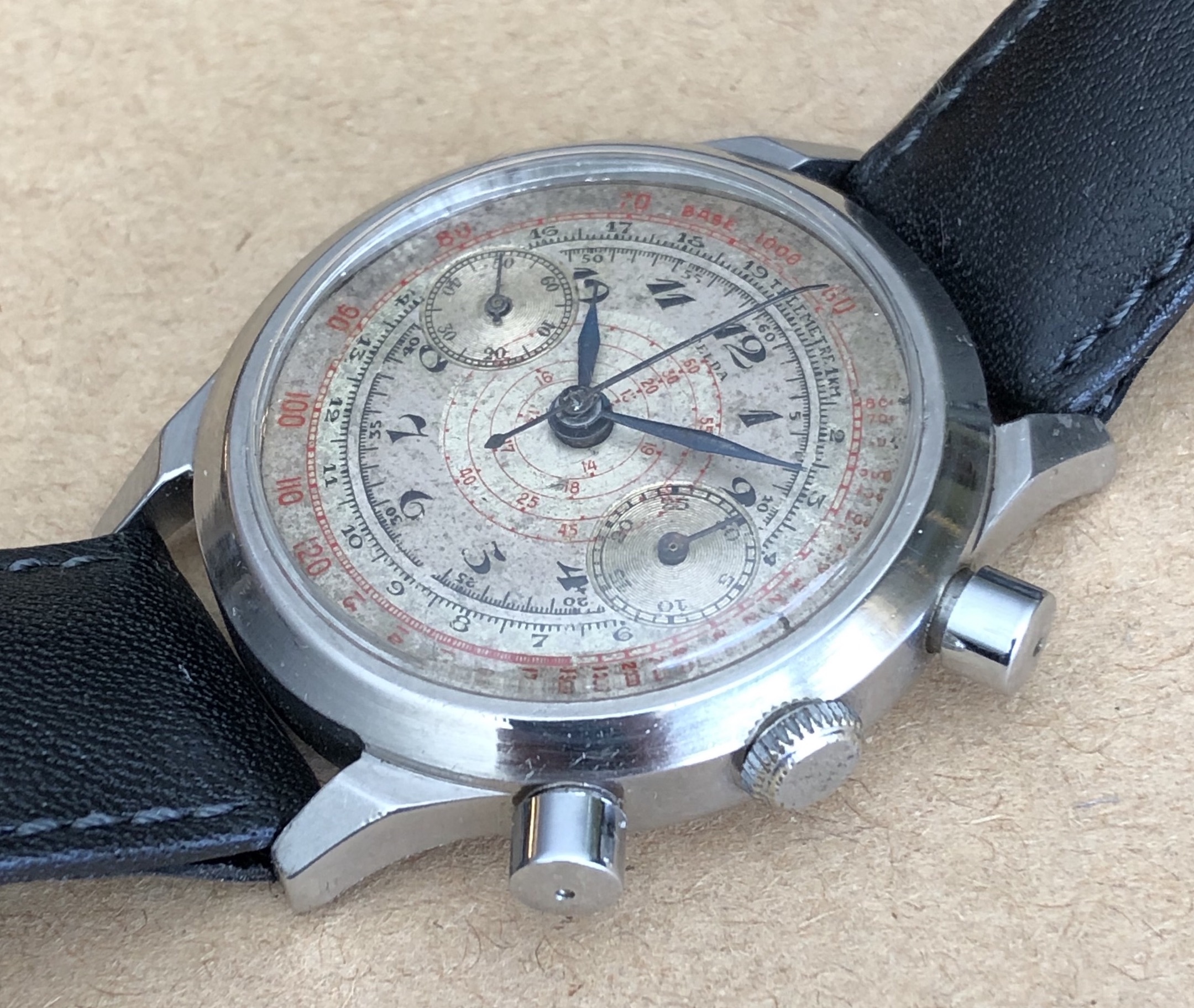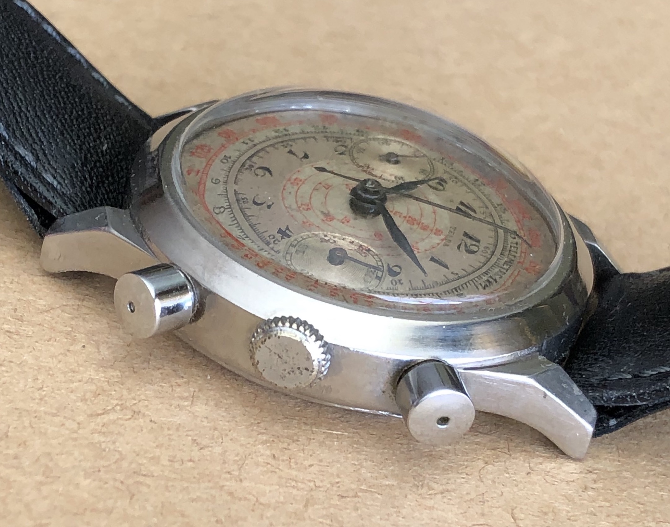 This particular chronograph has a number of desirable features, starting with the amazing gilt sector dial with spiral "snail" chronograph track and Breguet numeral hour markers. The colors of the various sectors change with the direction of the light, as shown in the various photos. The blued hands are showing a bit of oxidation, but complement the dial perfectly. The 37.5mm stainless steel case was large for the time and perfect on the wrist. The case has a "Spillman style" bent lug design and maintains its original lines with signs of modest polishing. The lug spacing is 19mm and the lug bars are fixed. A lightly worn Hirsch strap is current fitted to the watch. The pushers appear to be replacements.