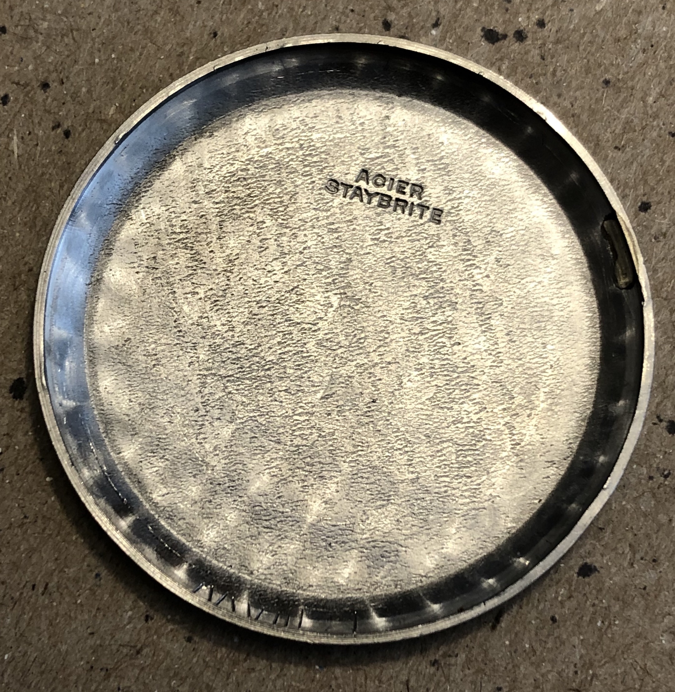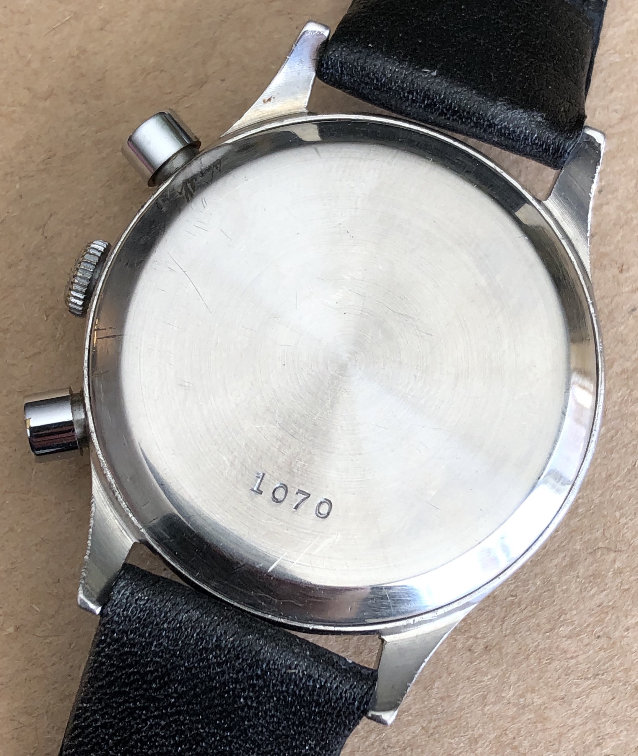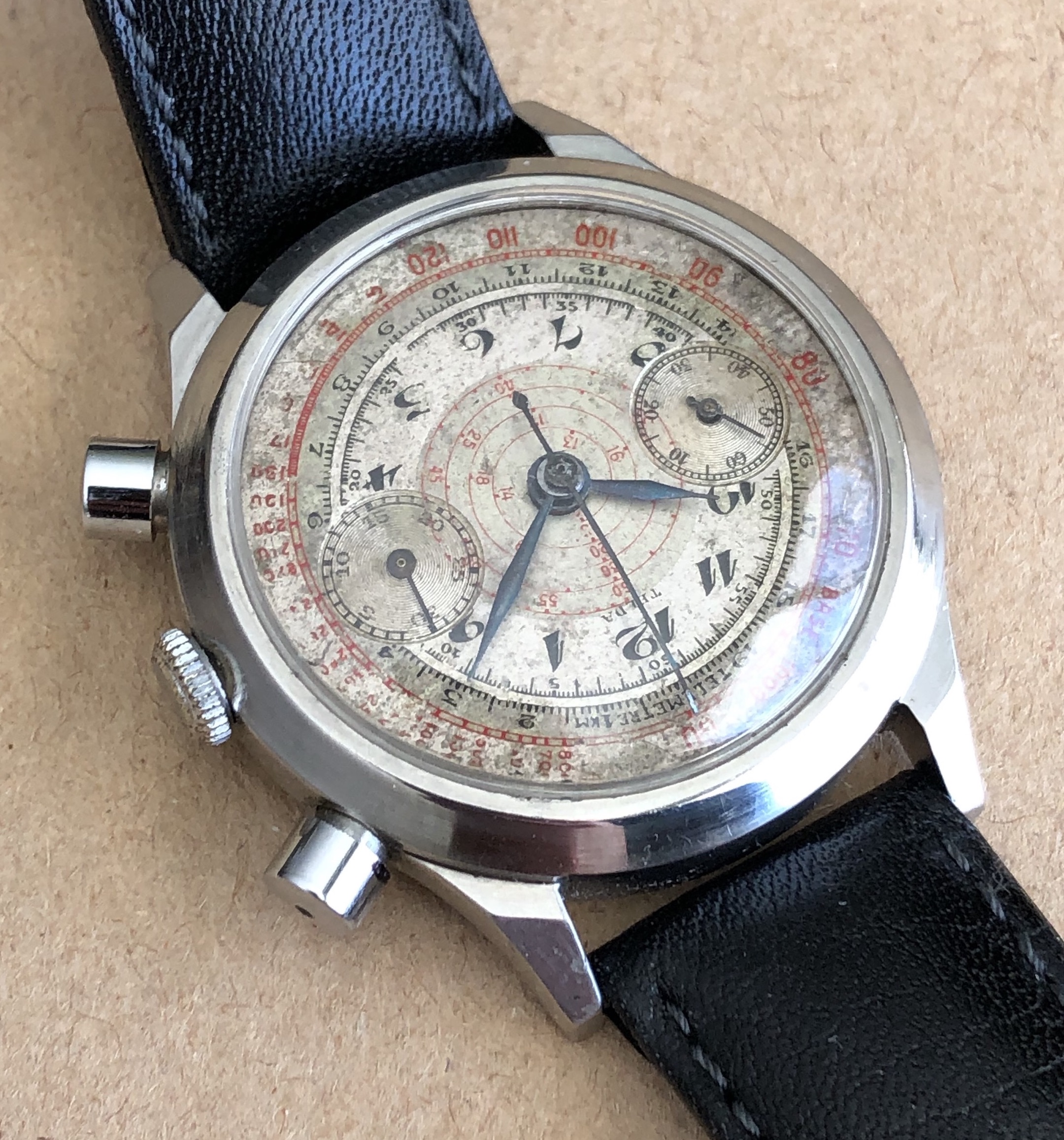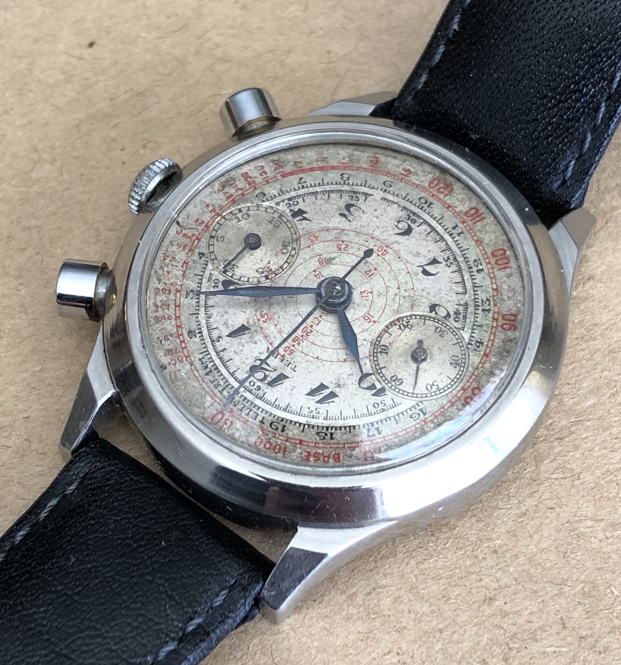 This particular chronograph has a number of desirable features, starting with the amazing gilt sector dial with spiral "snail" chronograph track and Breguet numeral hour markers. The colors of the various sectors change with the direction of the light, as shown in the various photos. The blued hands are showing a bit of oxidation, but complement the dial perfectly. The 37.5mm stainless steel case was large for the time and perfect on the wrist. The case has a "Spillman style" bent lug design and maintains its original lines with signs of modest polishing. The lug spacing is 19mm and the lug bars are fixed. A lightly worn Hirsch strap is current fitted to the watch. The pushers appear to be replacements.