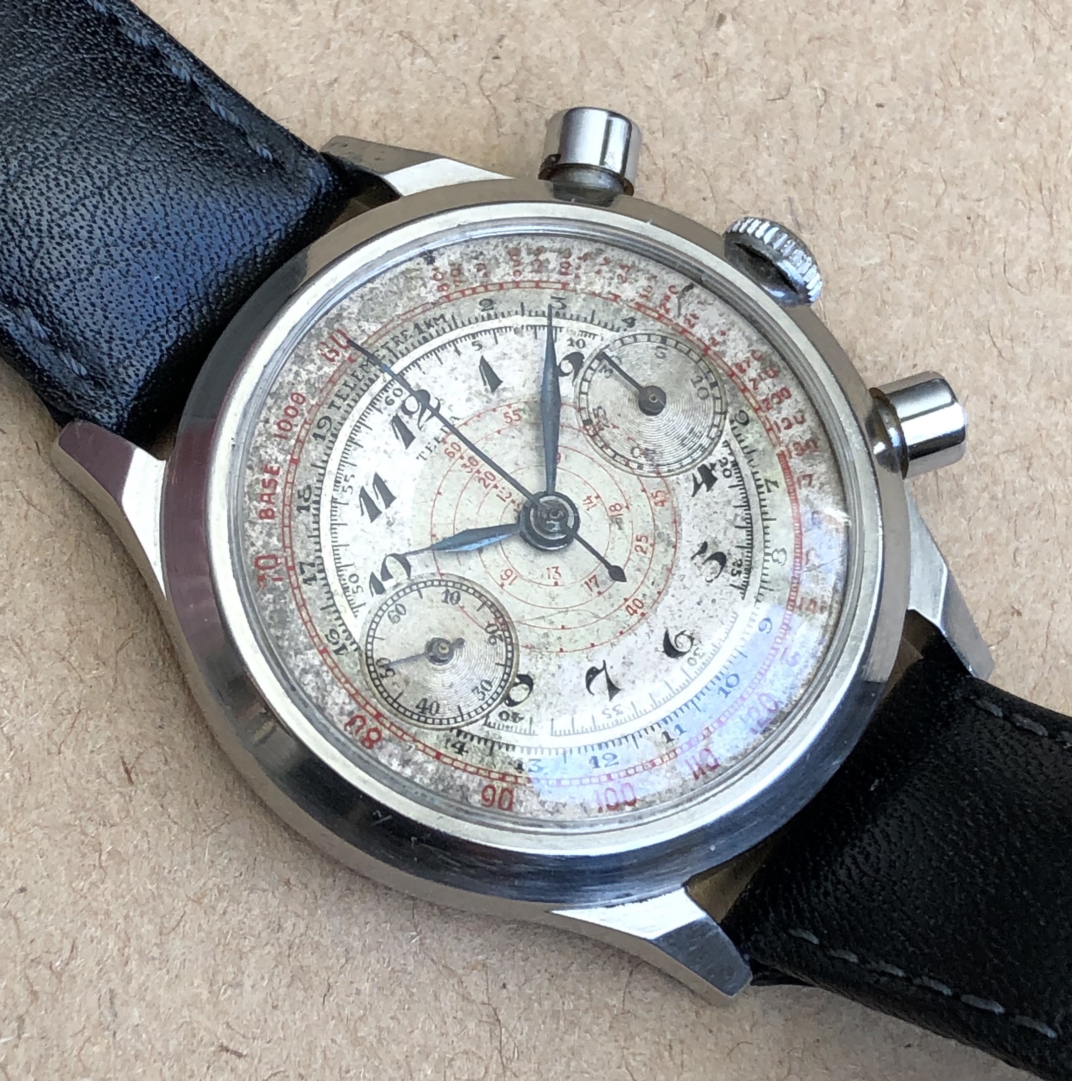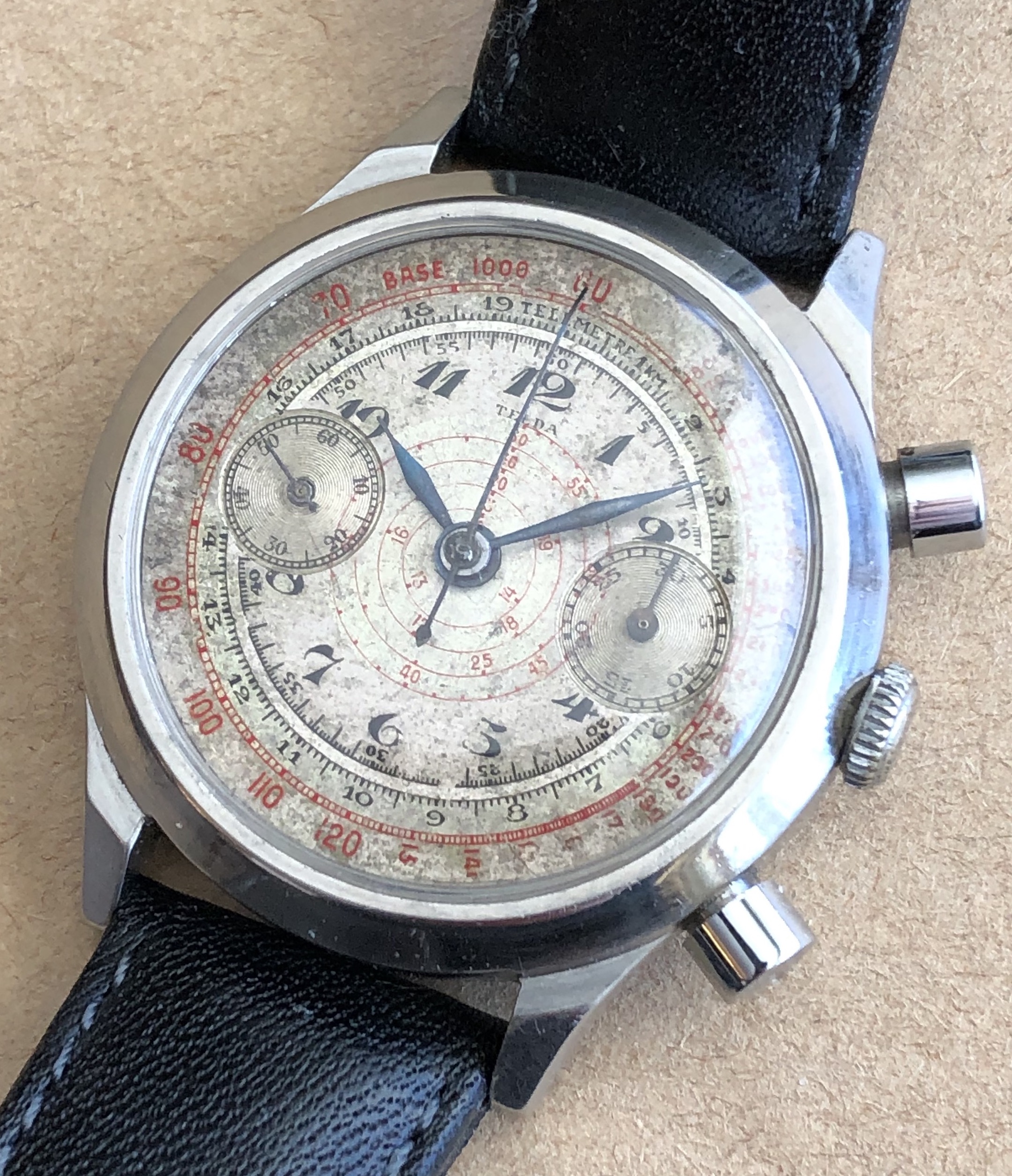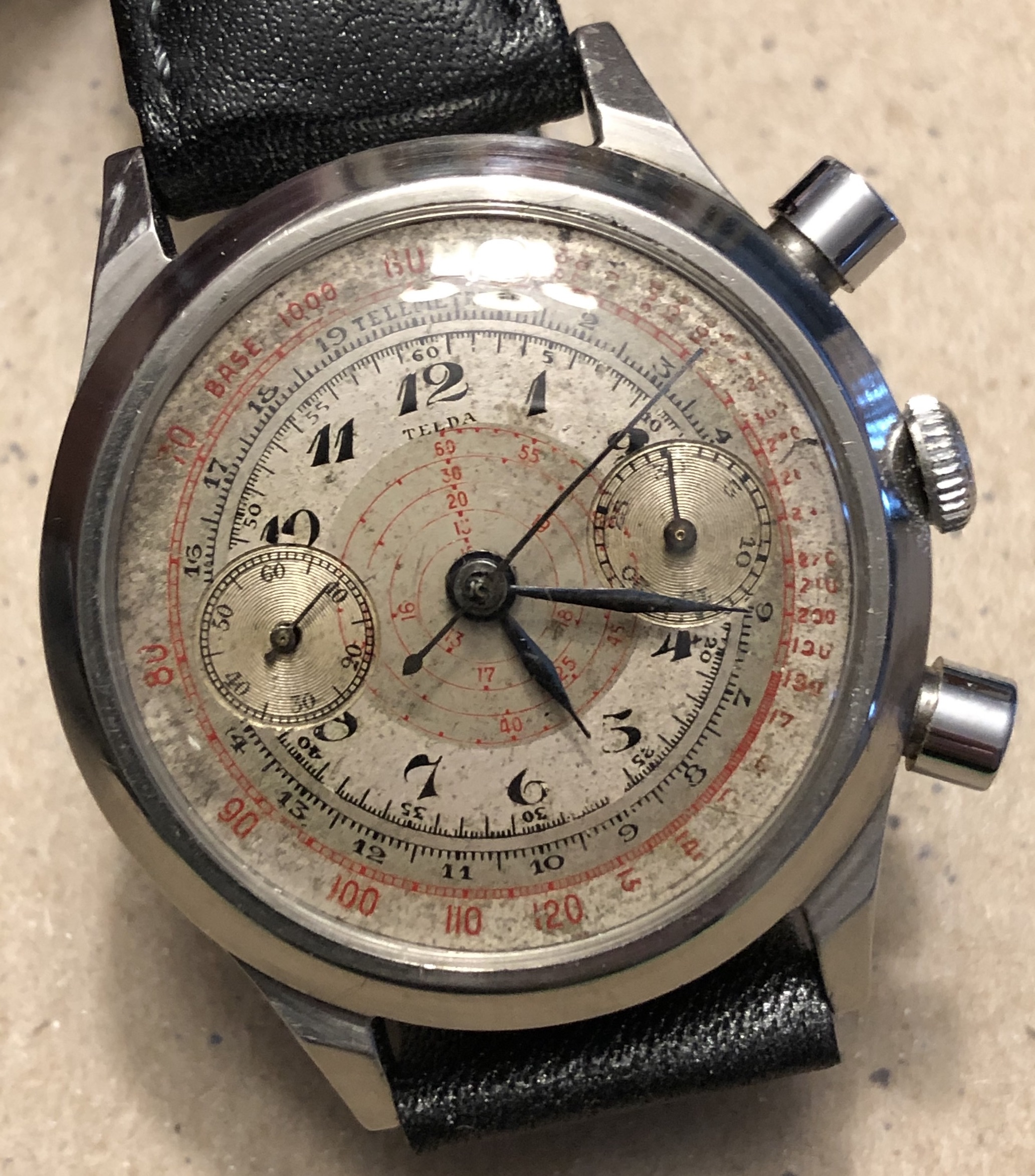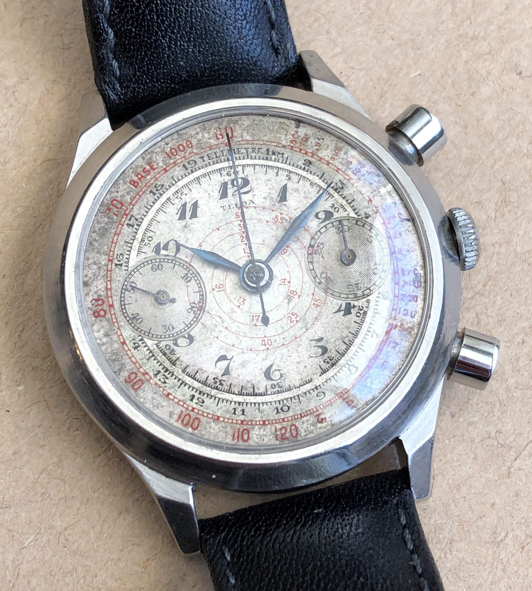·Here's something you don't see every day, a 1940s Telda chronograph with a Valjoux 22 column wheel movement. The Telda name was associated with the Armand Nicolet company of Tramelan Switzerland, which dates back to 1875.