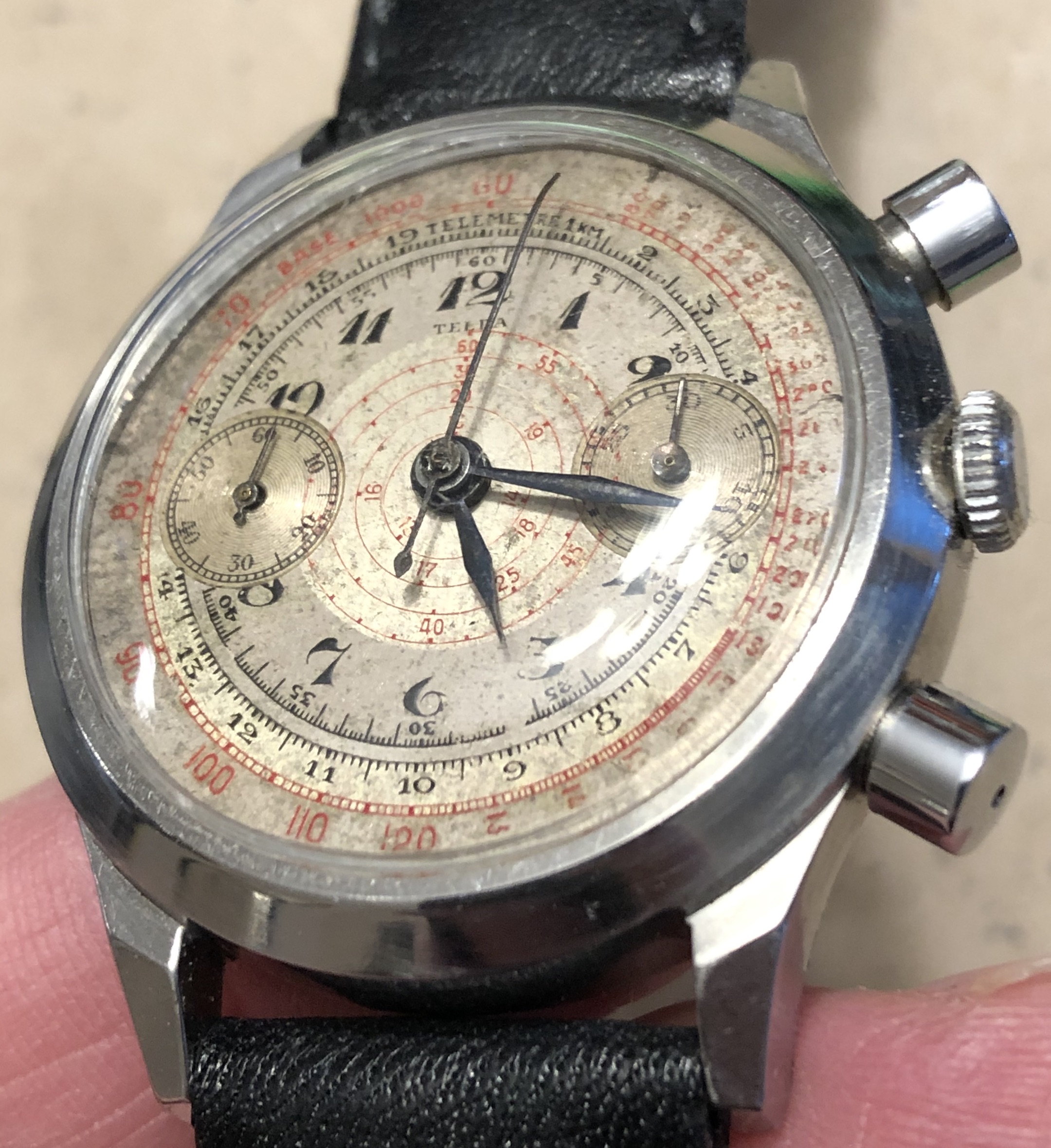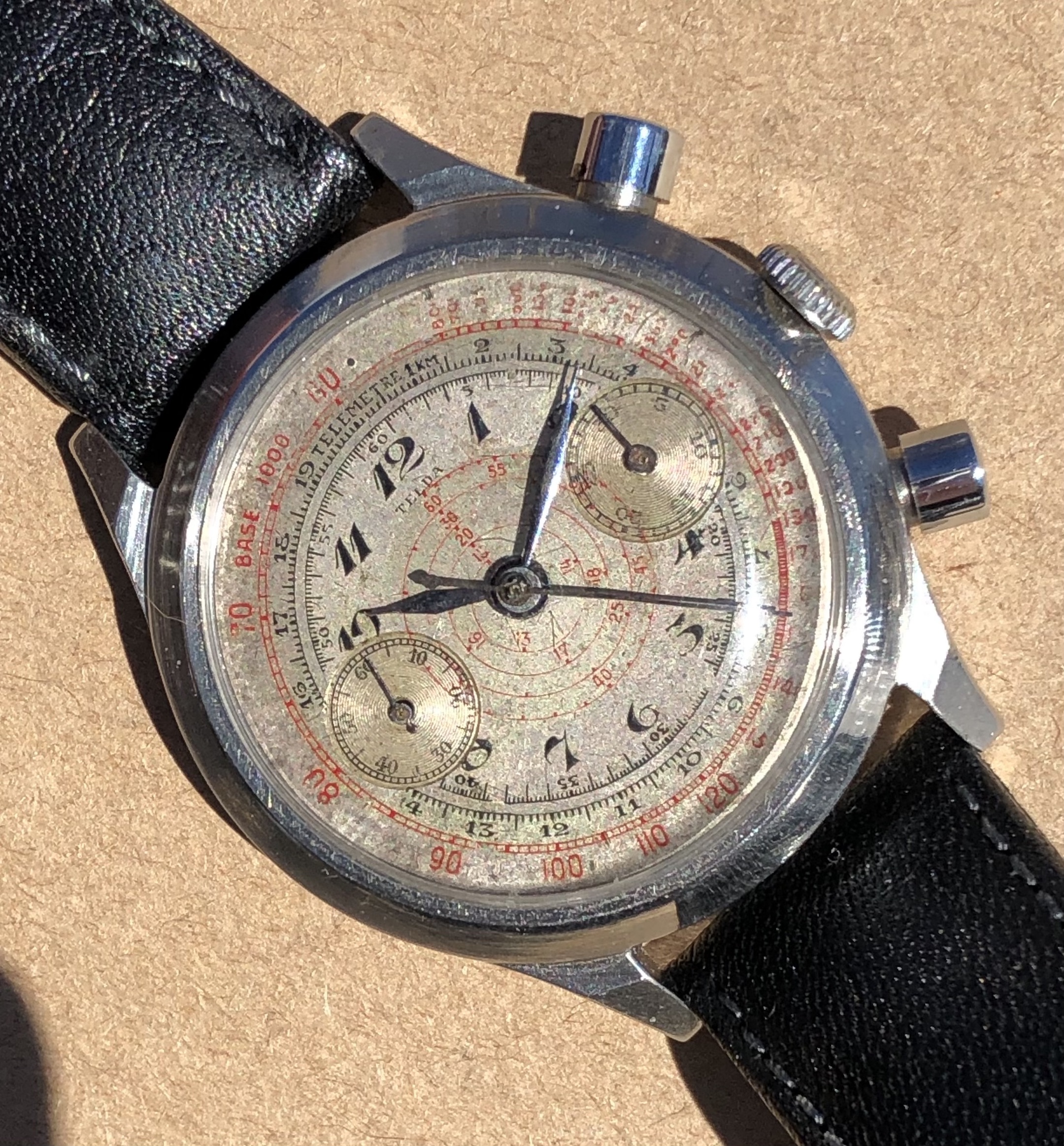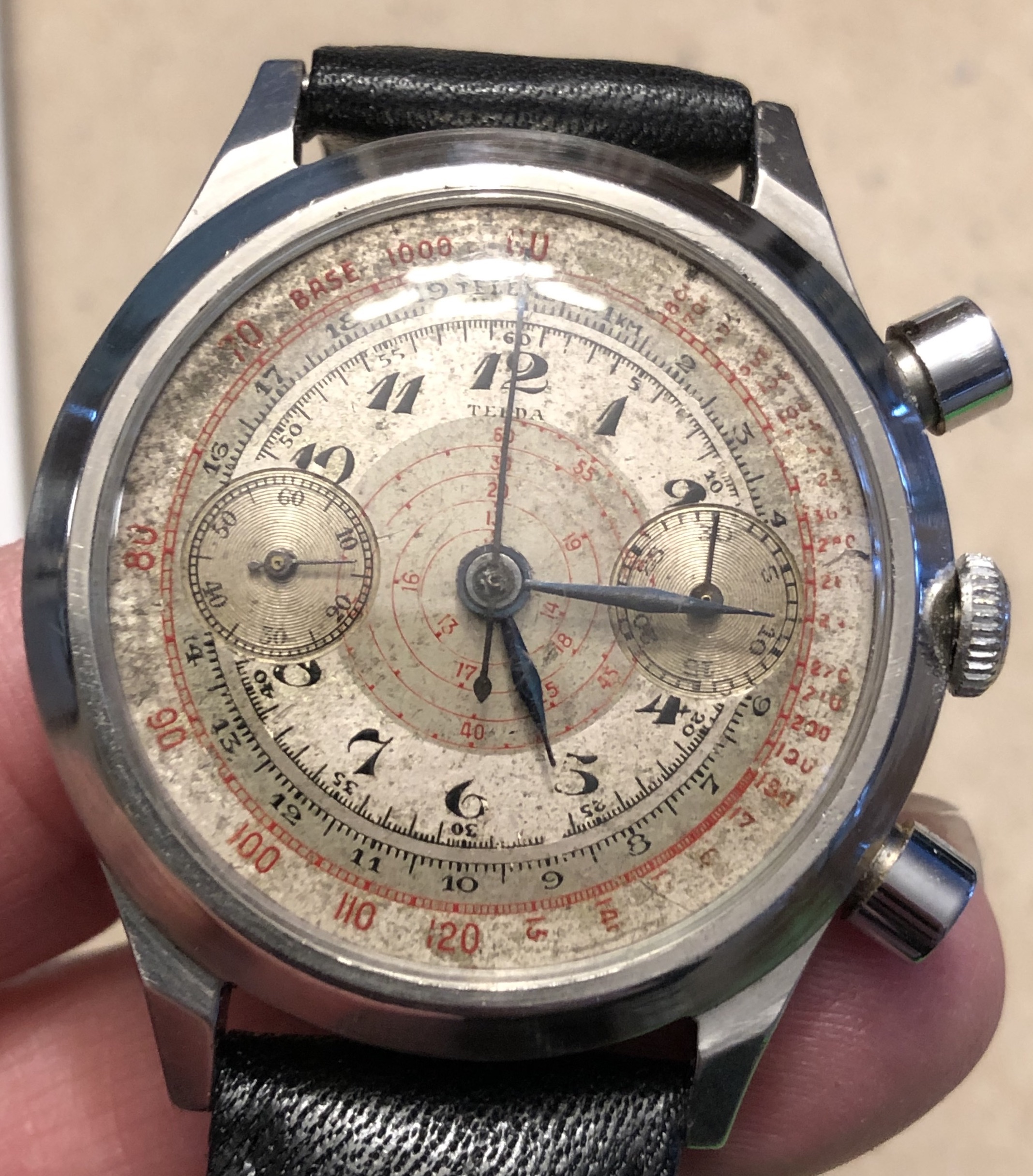 ·Here's something you don't see every day, a 1940s Telda chronograph with a Valjoux 22 column wheel movement. The Telda name was associated with the Armand Nicolet company of Tramelan Switzerland, which dates back to 1875.