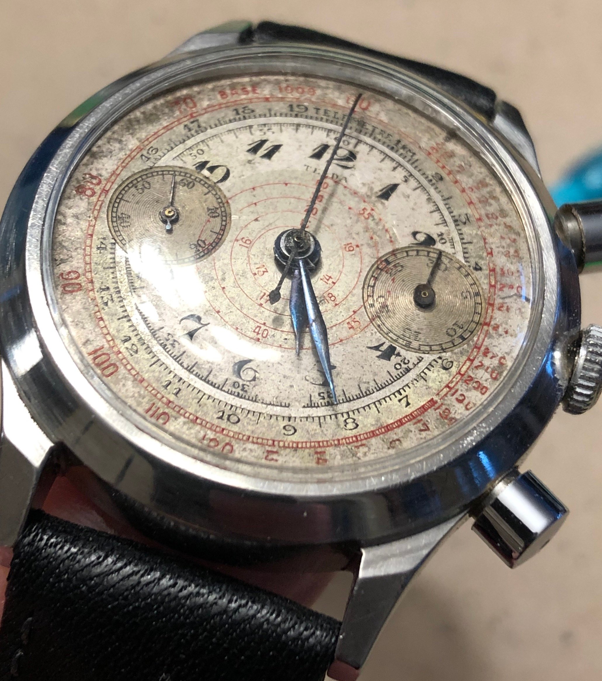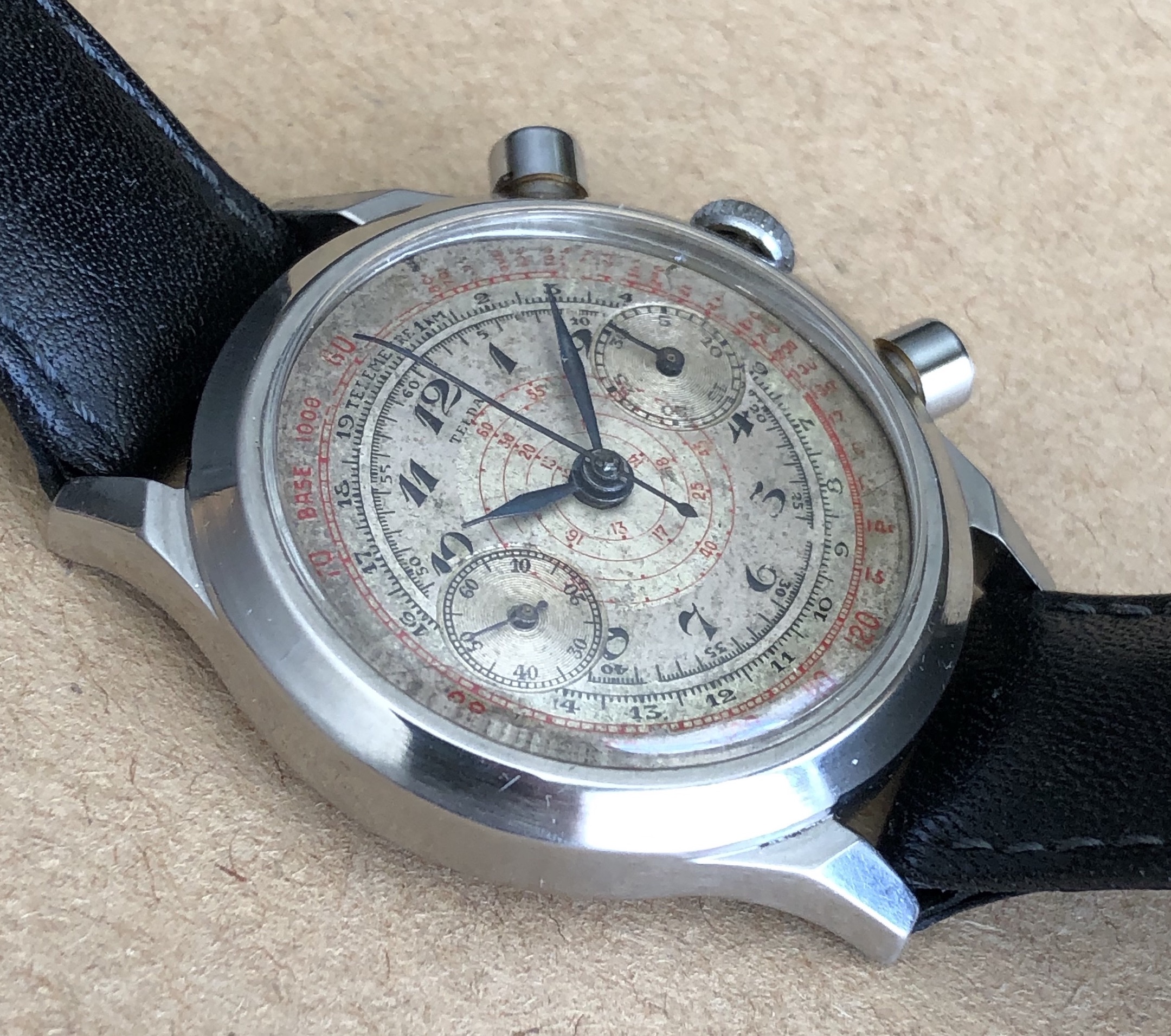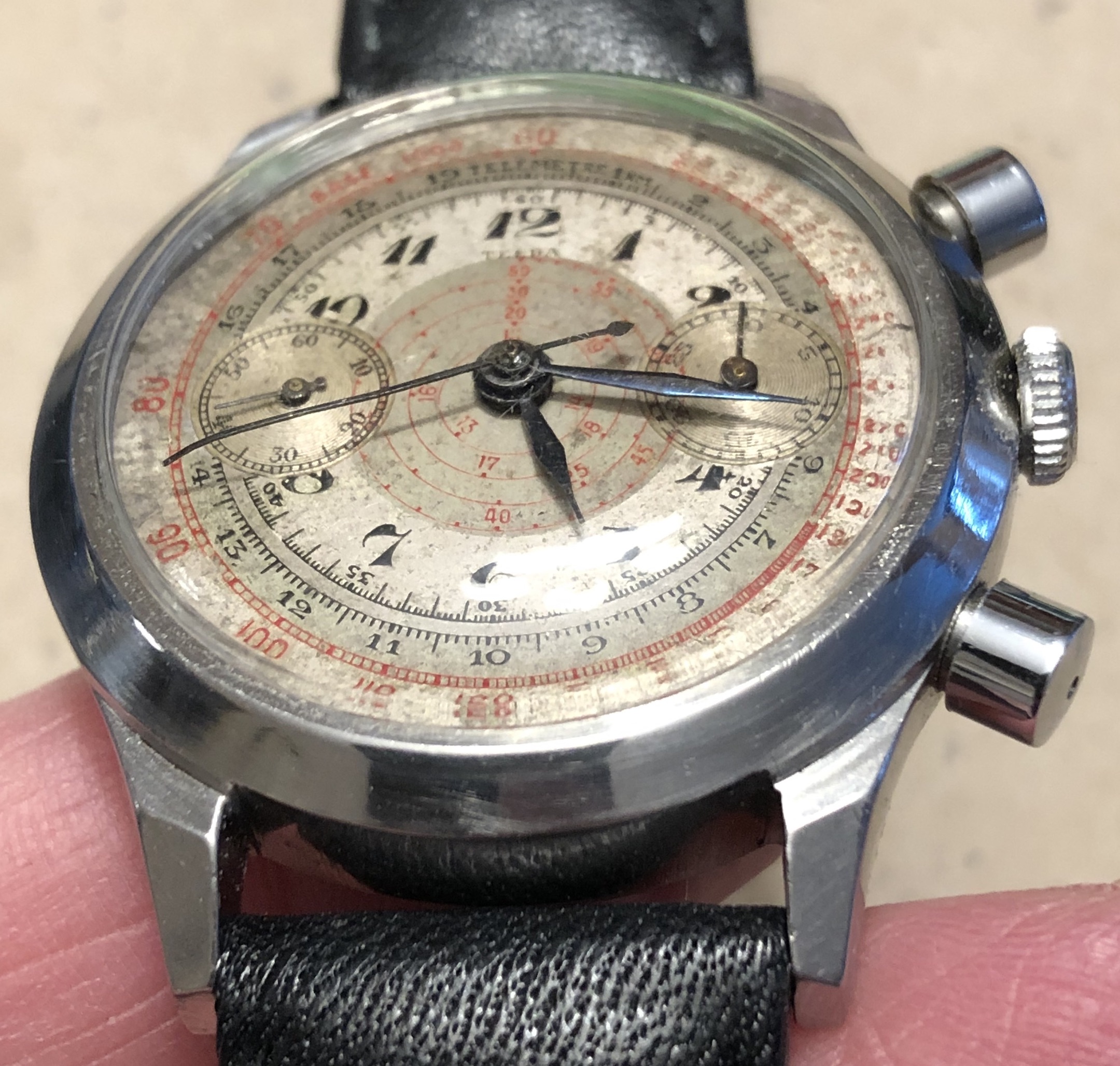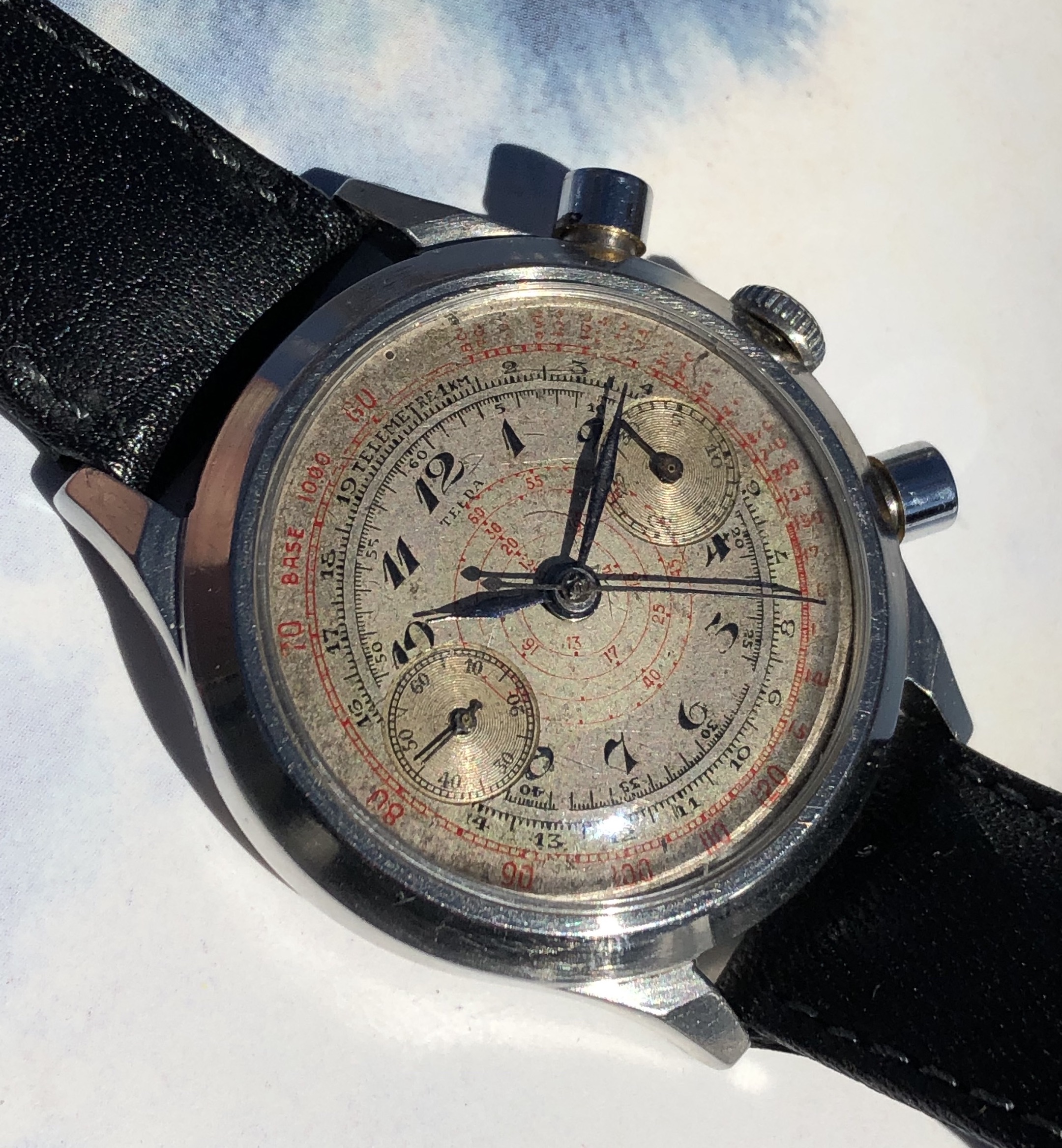 ·Here's something you don't see every day, a 1940s Telda chronograph with a Valjoux 22 column wheel movement. The Telda name was associated with the Armand Nicolet company of Tramelan Switzerland, which dates back to 1875.