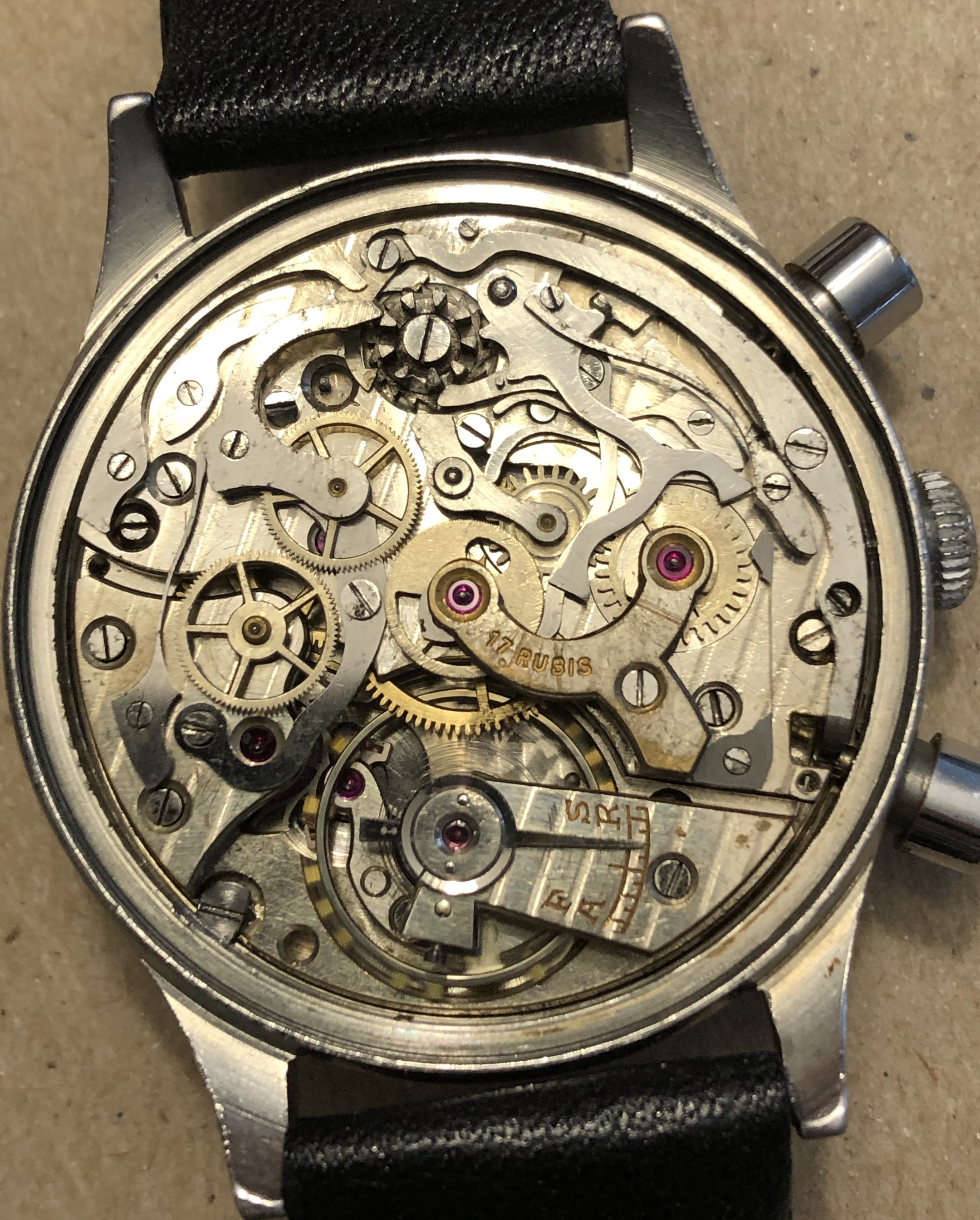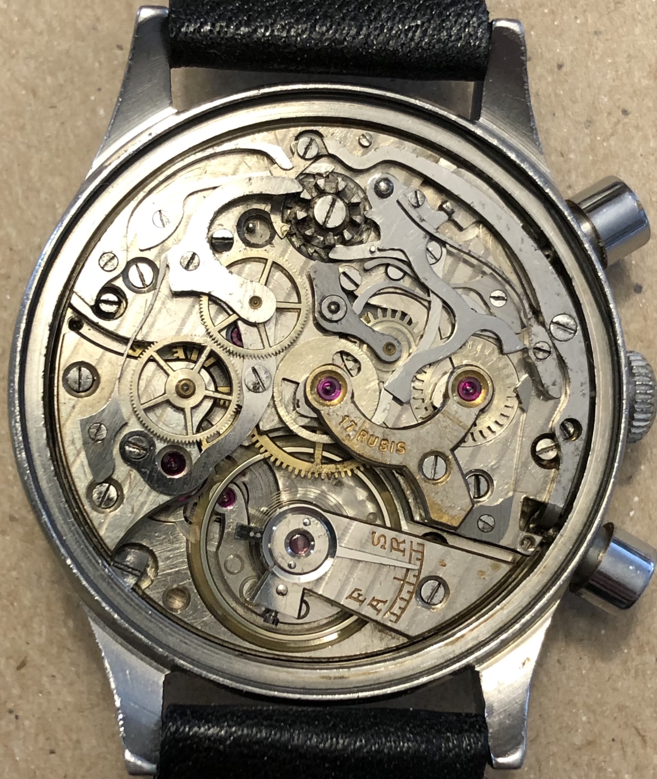 The Valjoux 22 movement has some decorative stripes. It is running, and the chronograph functions are operating properly. The watch has not been serviced in my possession, and no specific guarantee or long-term warranty is offered on performance. A professional service is obviously recommended if you plan to use the watch regularly.