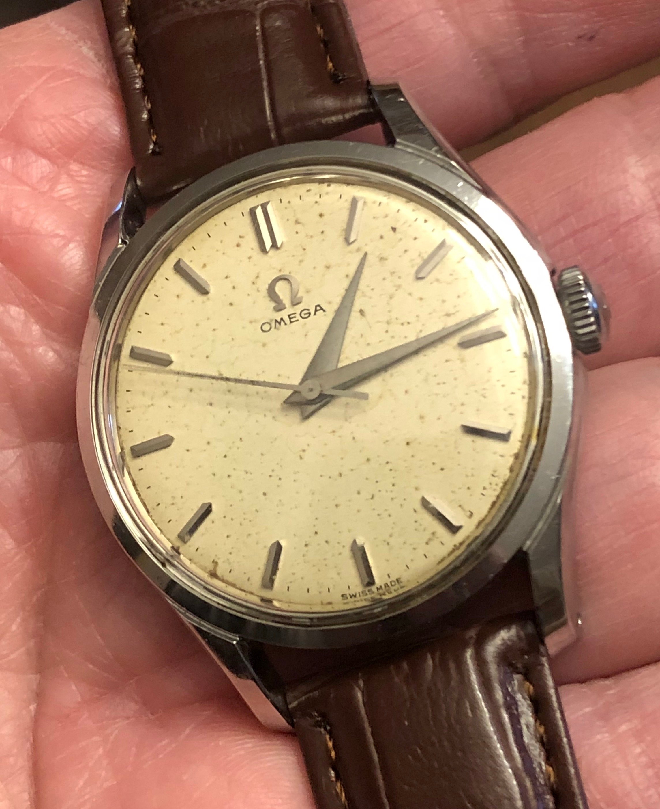 ·Here's a nice piece for someone who appreciates an aged vintage look, this dial reminds me a bit of the "fauxtina" that some brands are emulating in their re-issues of vintage models. This is an all stainless no-lume no-date Omega from approximately 1955 with a hand-winding cal. 283 movement from the venerable 30mm family. Honest watch that shows signs of age, but appealing in my opinion and faces up well on the wrist.