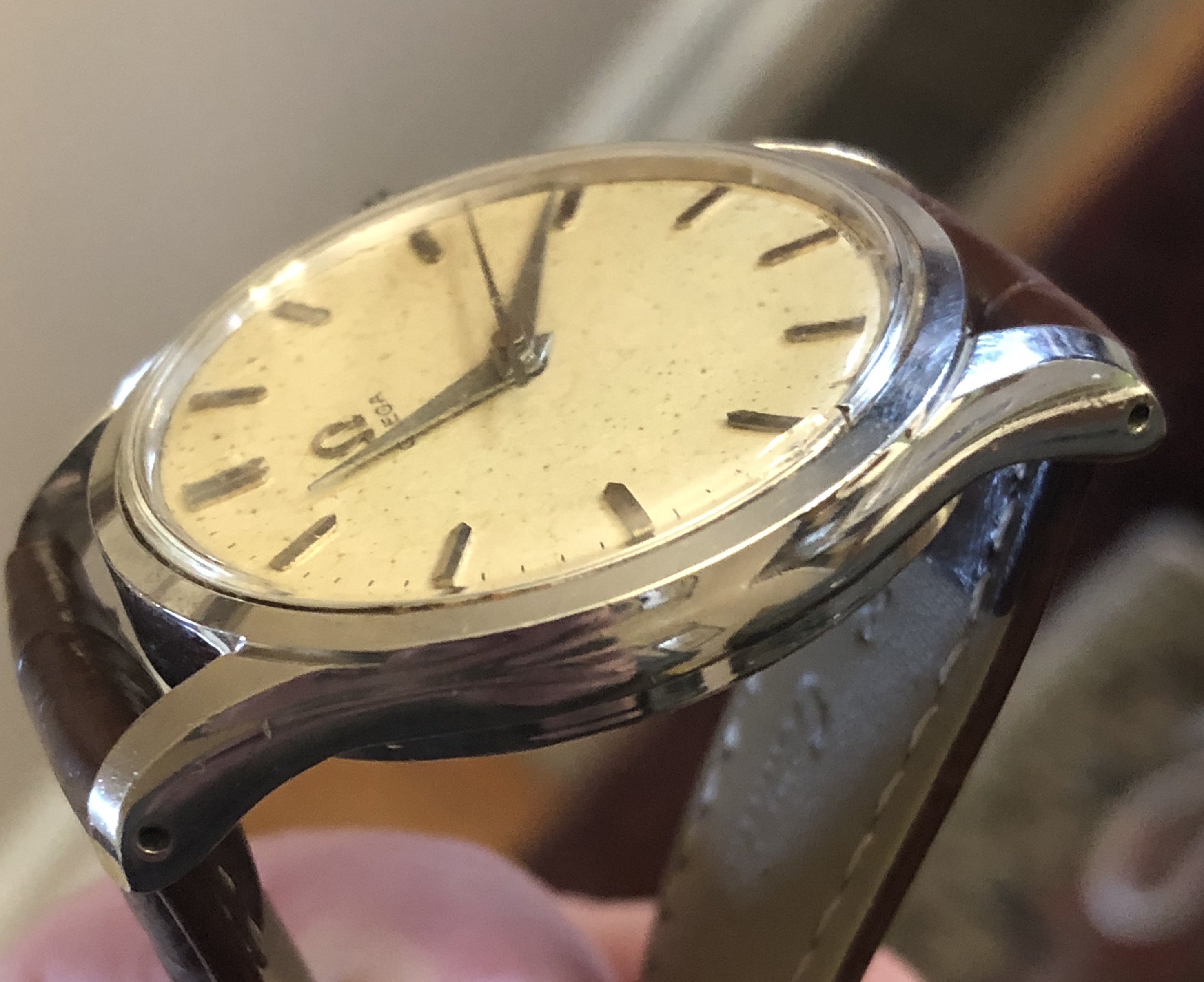 The screw-back case is a perfect size at 36mm, and appears to share a very similar shape (maybe identical TBH) as the more common ref 2639 (which has a sub-dial for the running seconds, instead of a sweep). As shown in the photos, the case is in nice condition with sharp edges and everything appears original to my eye. An etched Omega symbol can be seen in the center of the crystal.