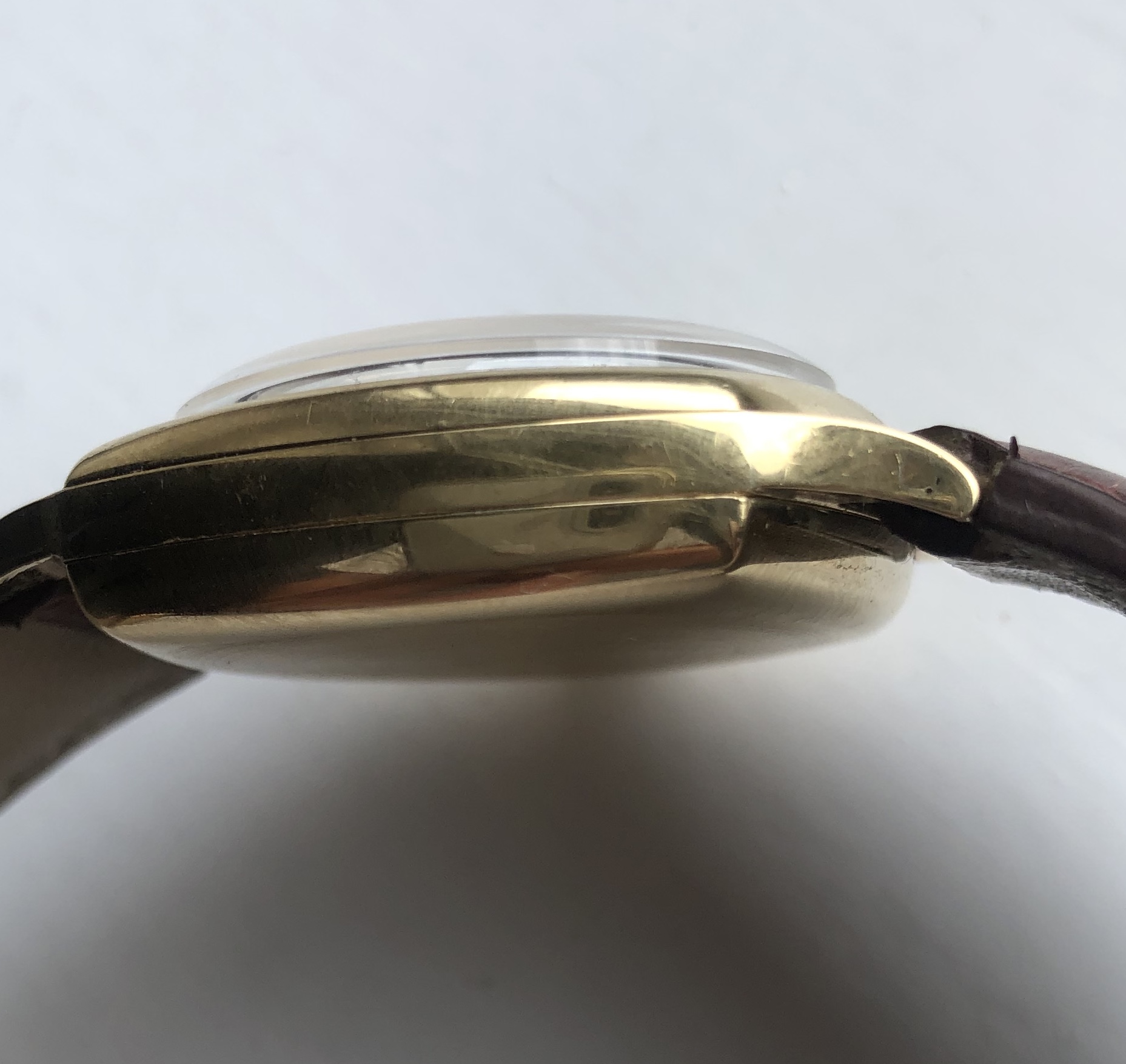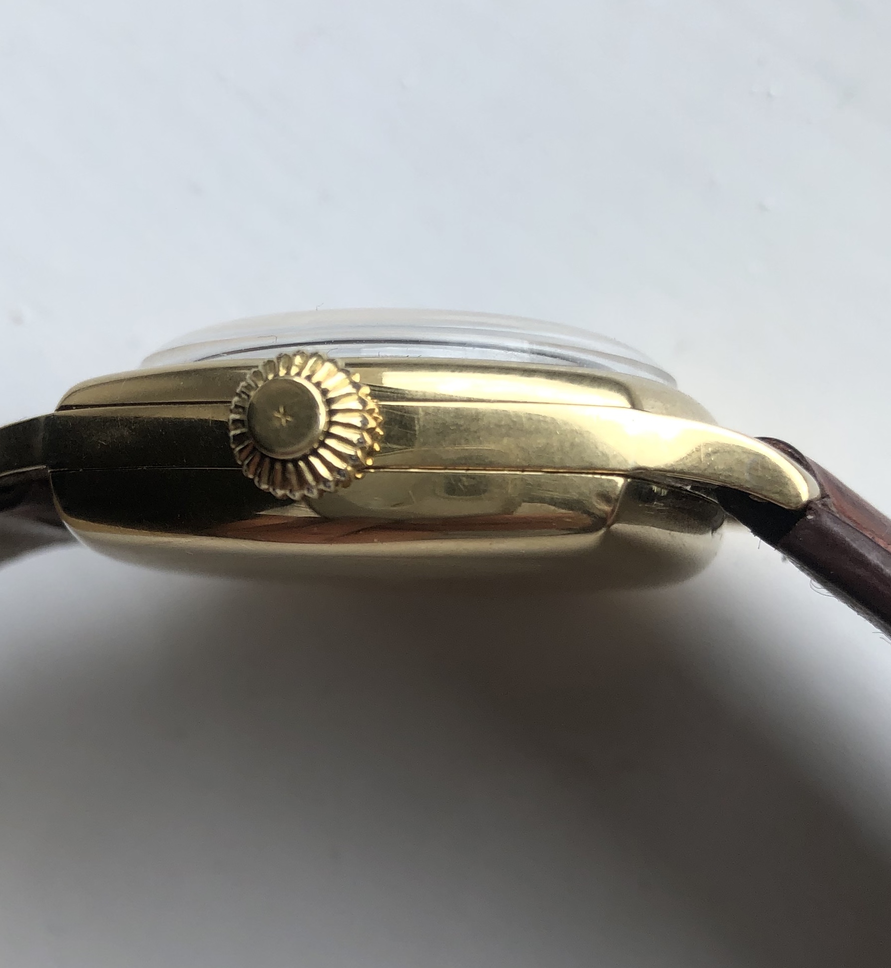3 piece 18k gold case 13.33 z with integral chronograph button on the crown at 3 o'clock