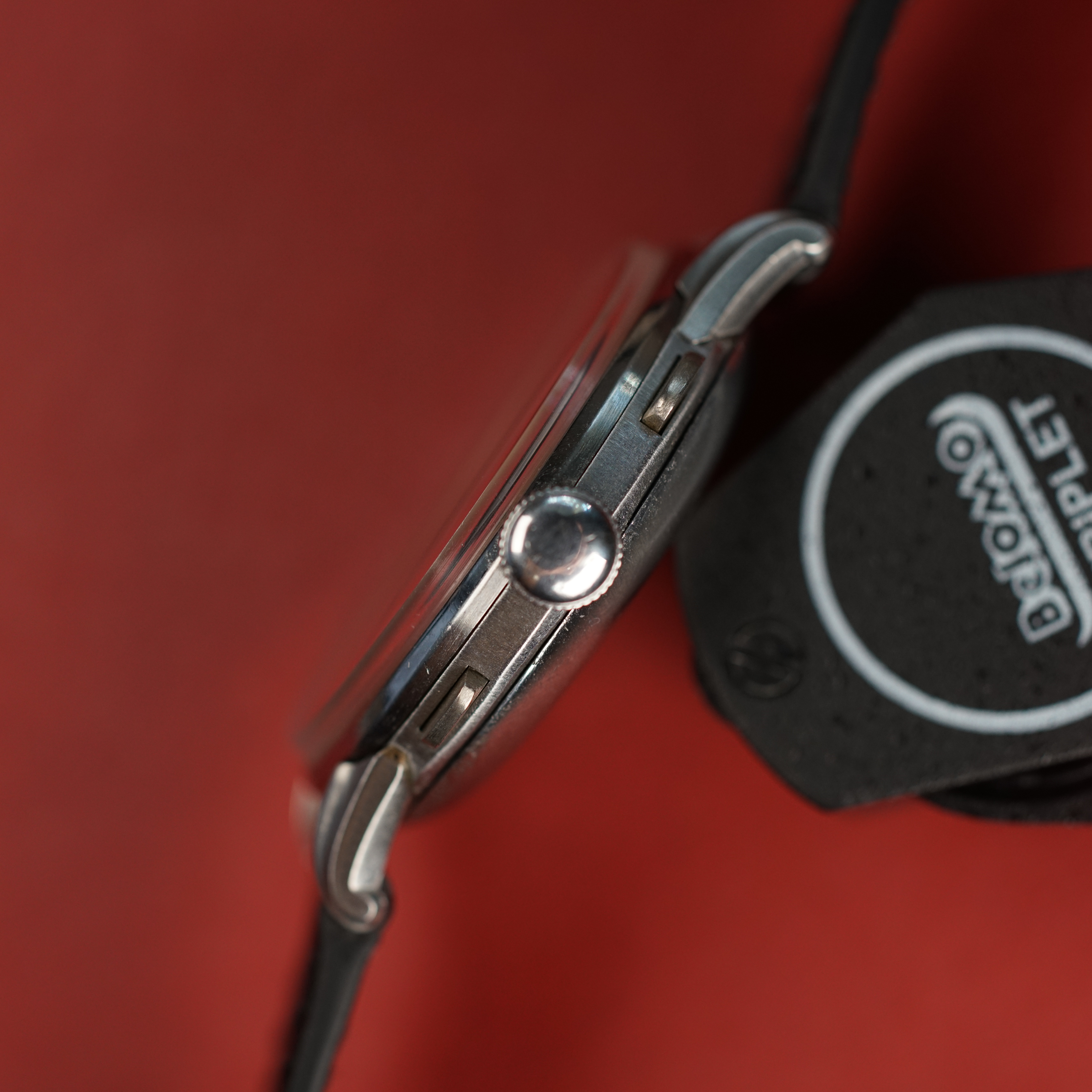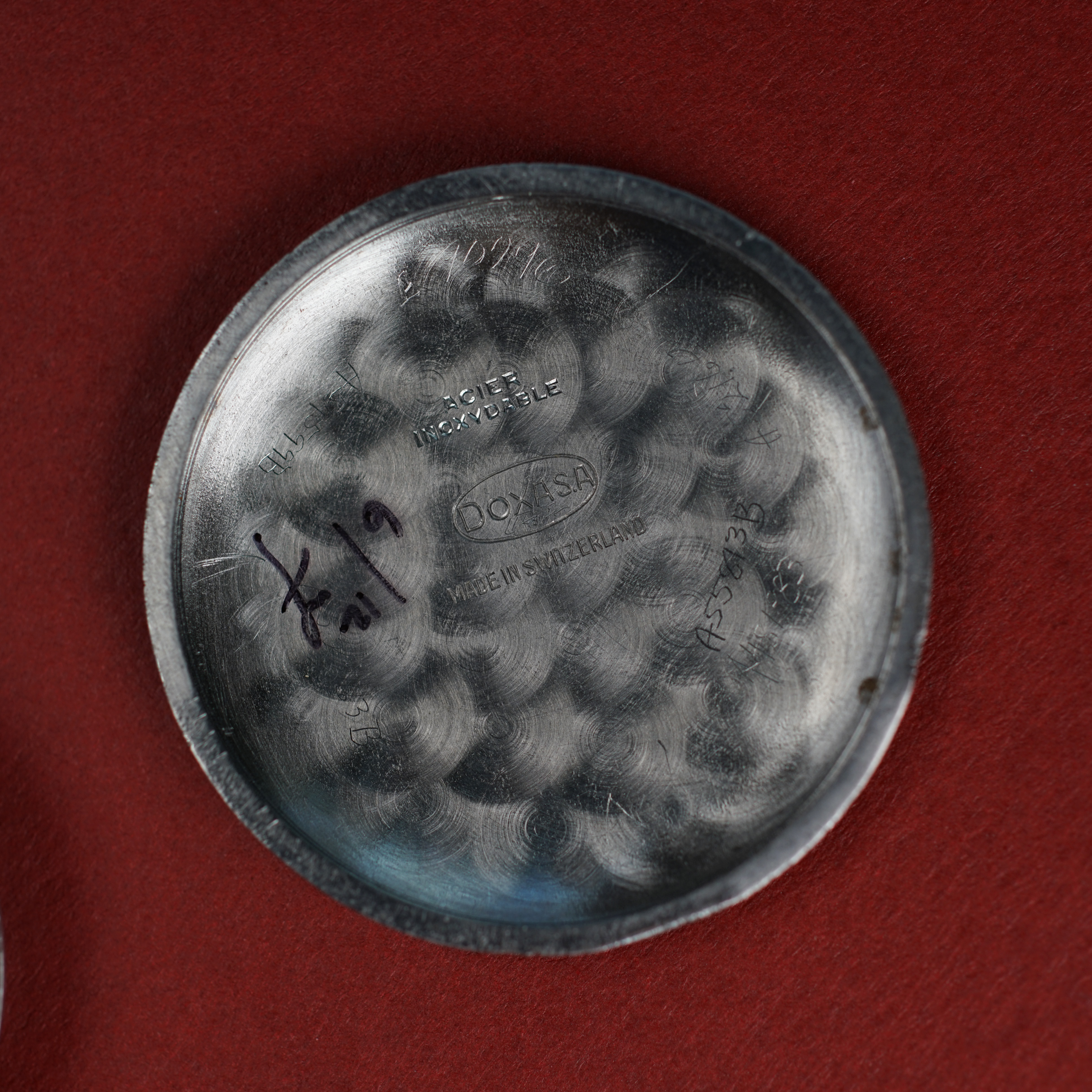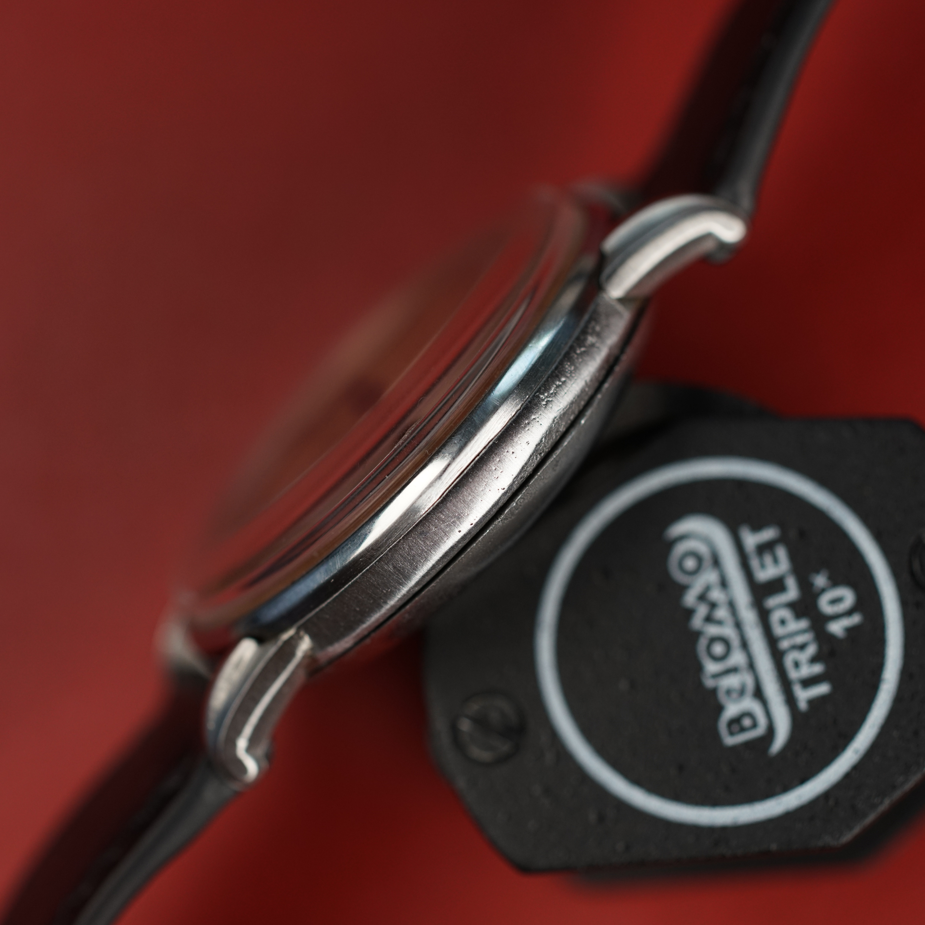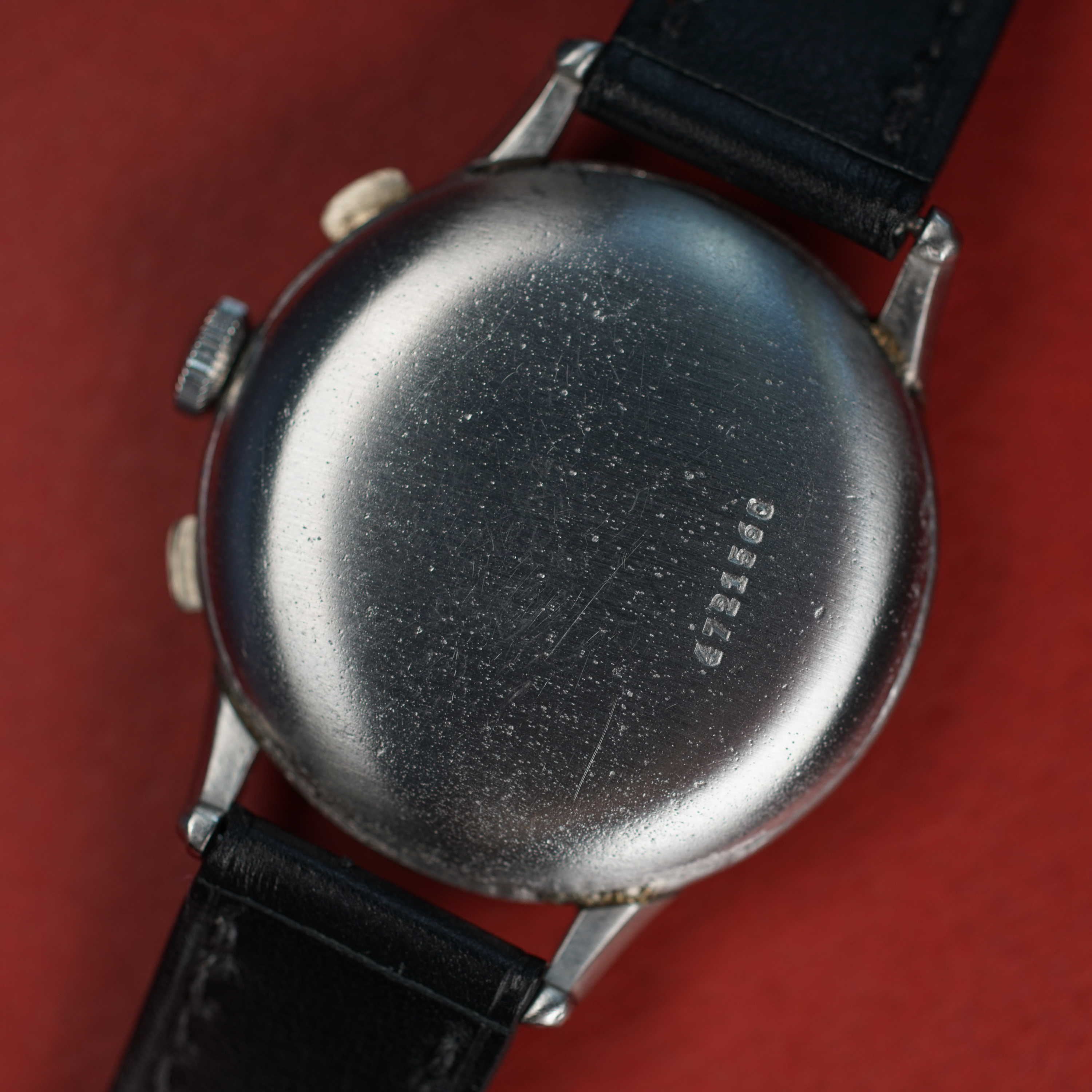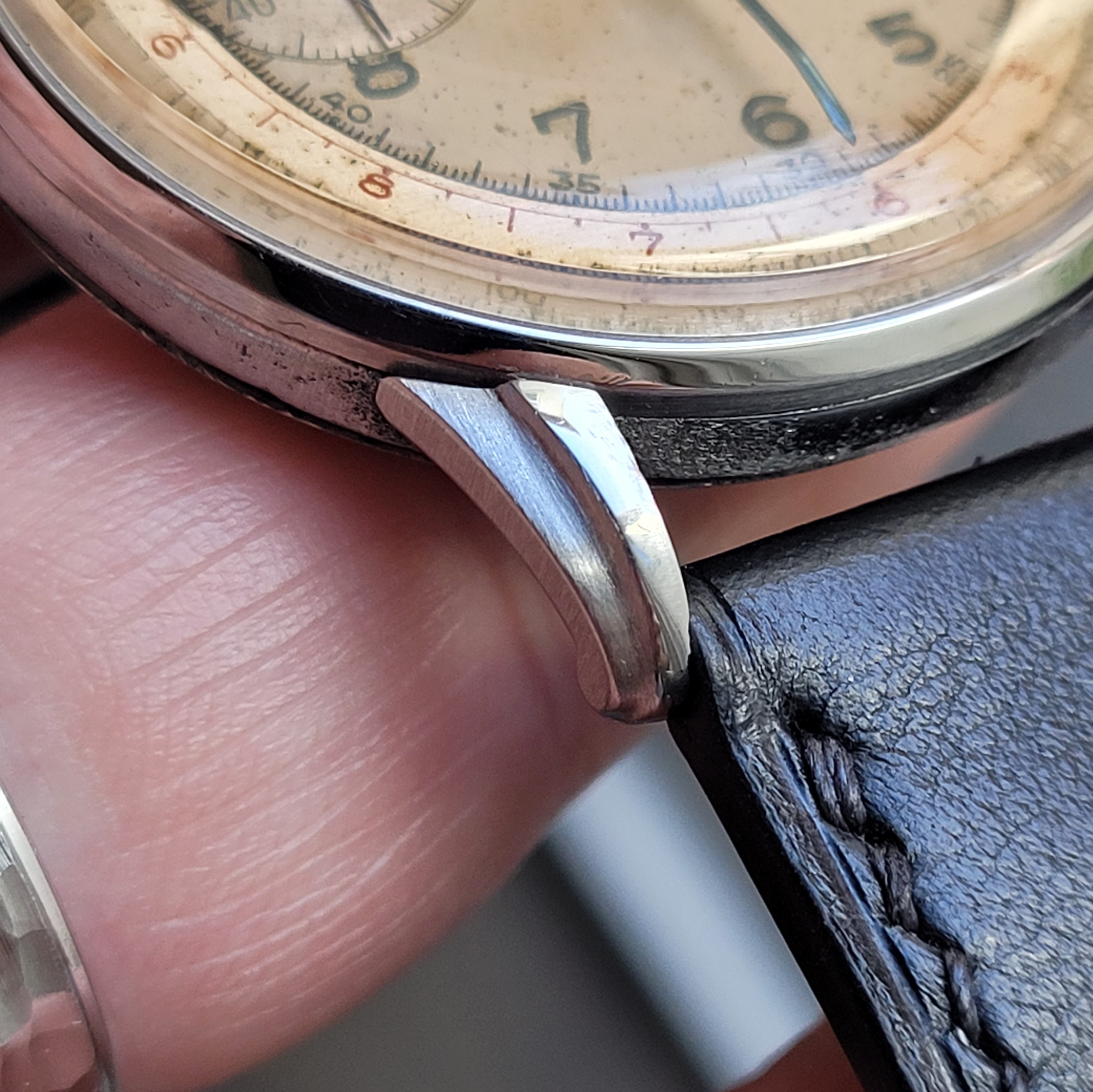 Case: 37.5mm uncommon jumbo stainless steel case with snap back case back. There is some pitting commensurate with a watch that has been worn since the 1940s. The pitting is mostly along the case back interface. Some shallow spotting on the case back and lug welds can be seen on one of the lugs.