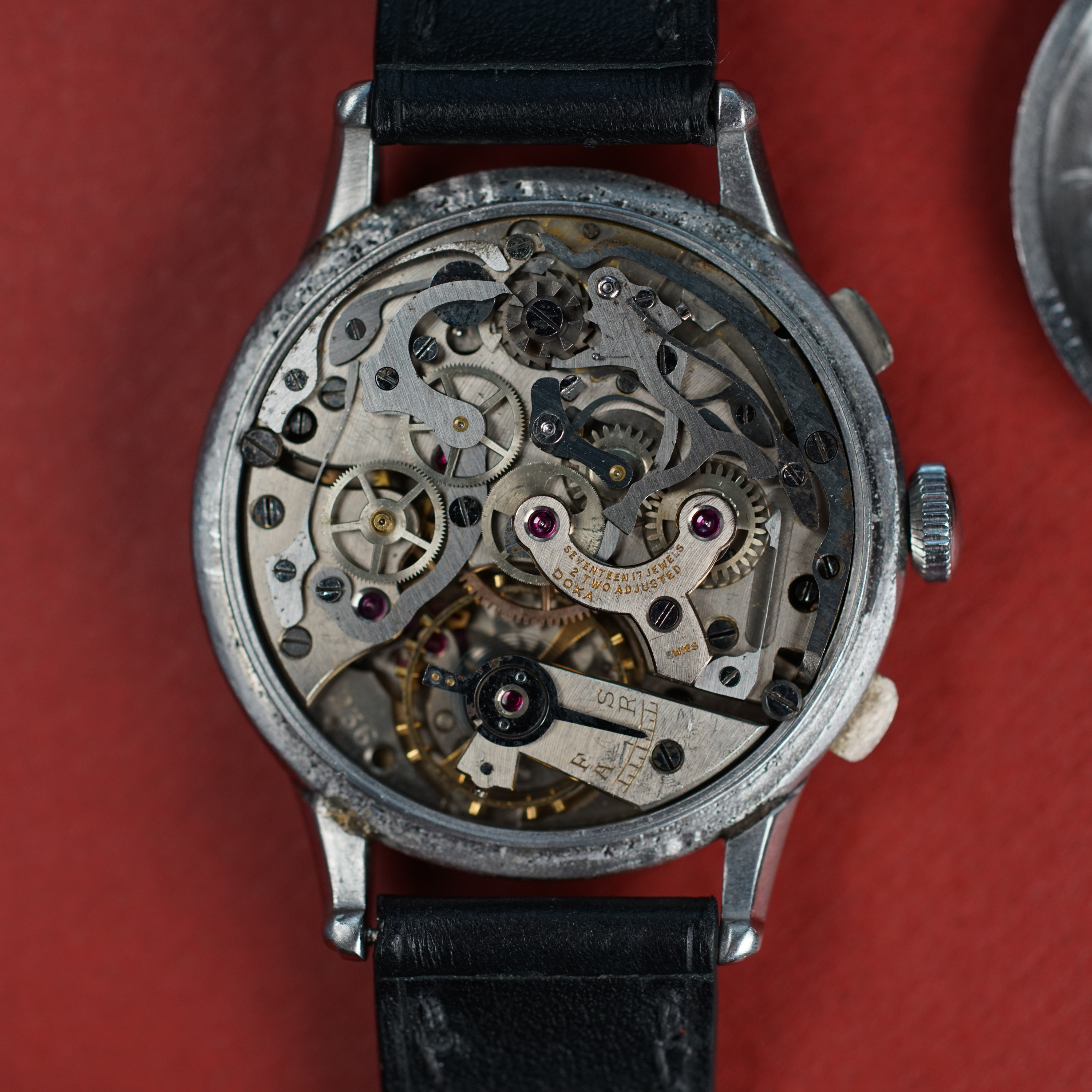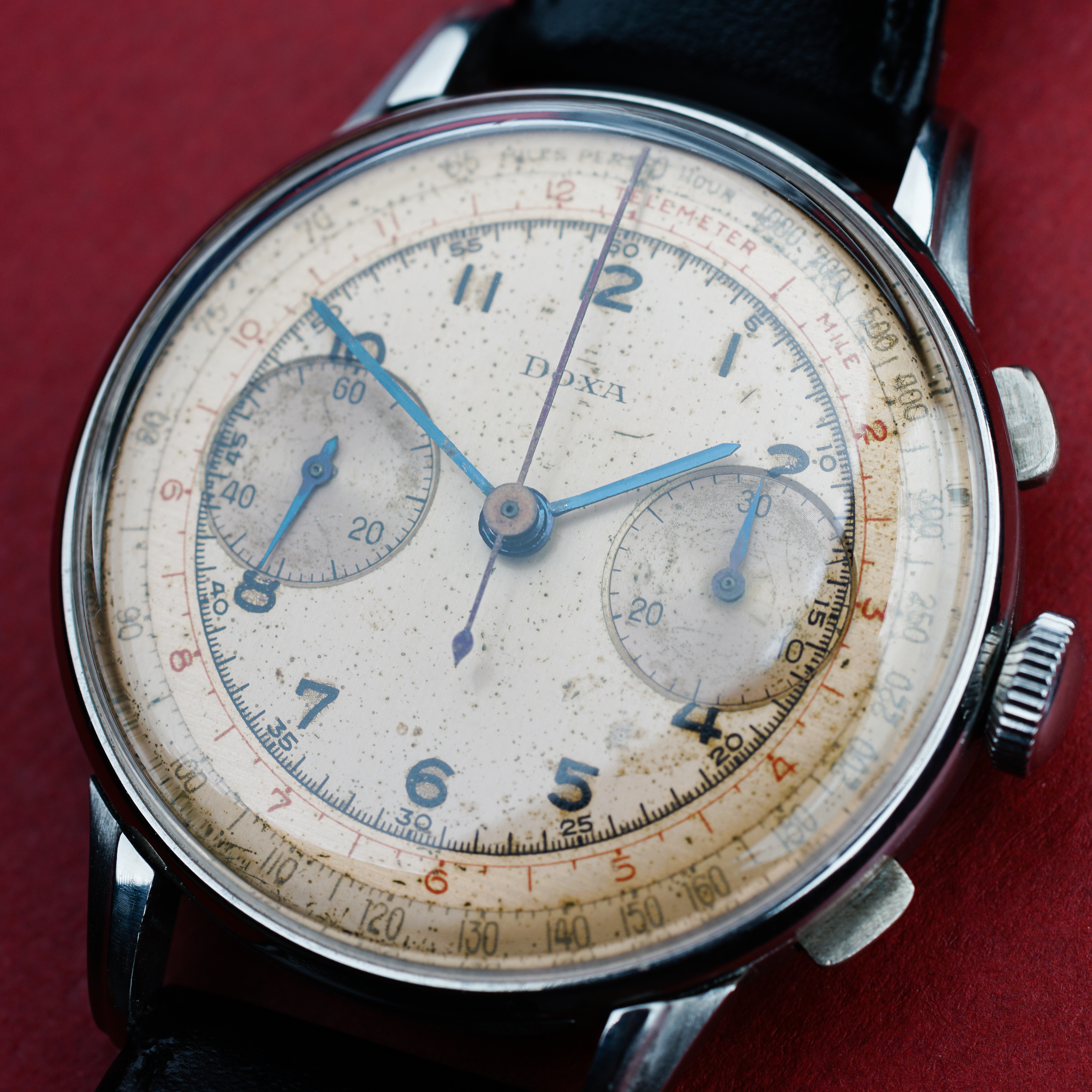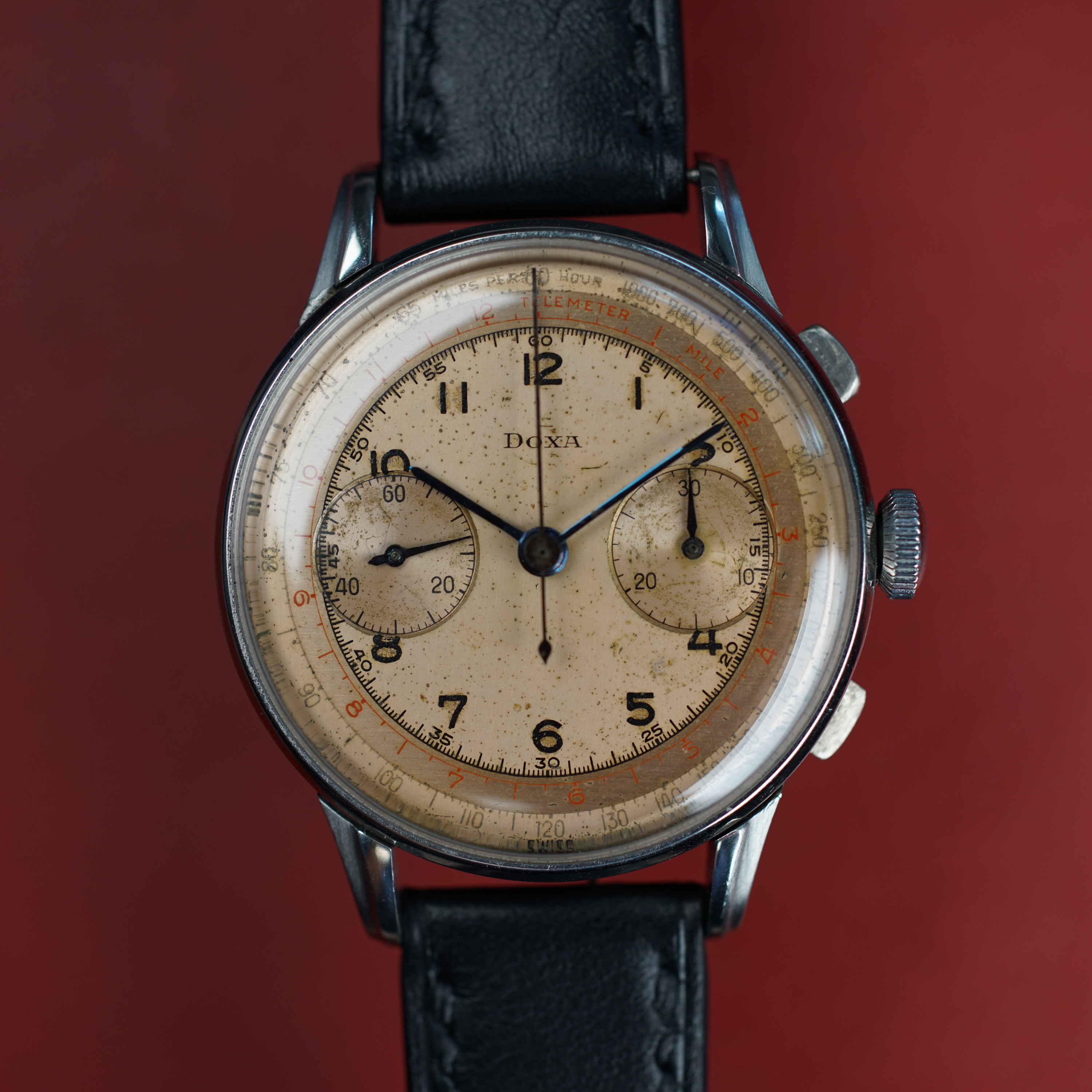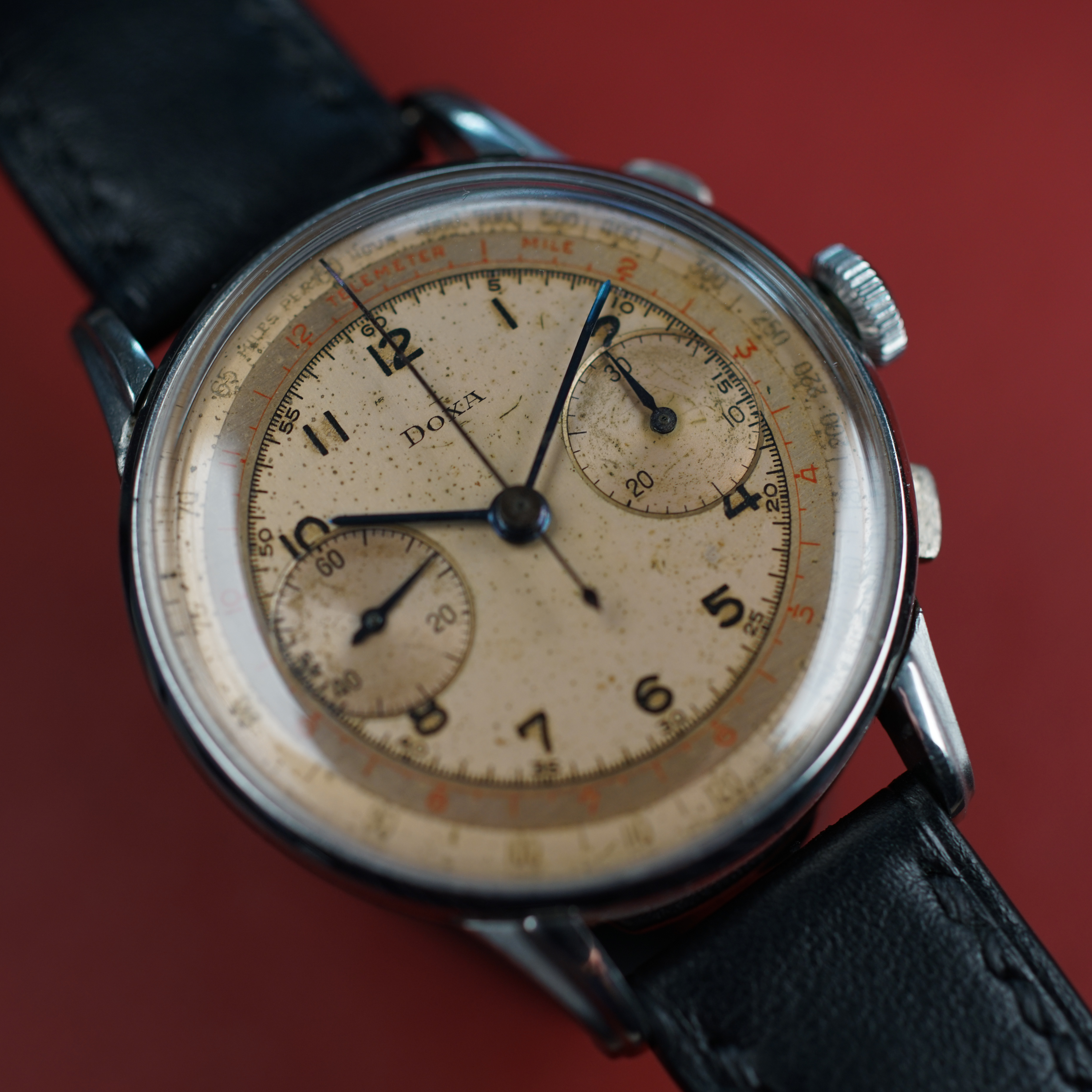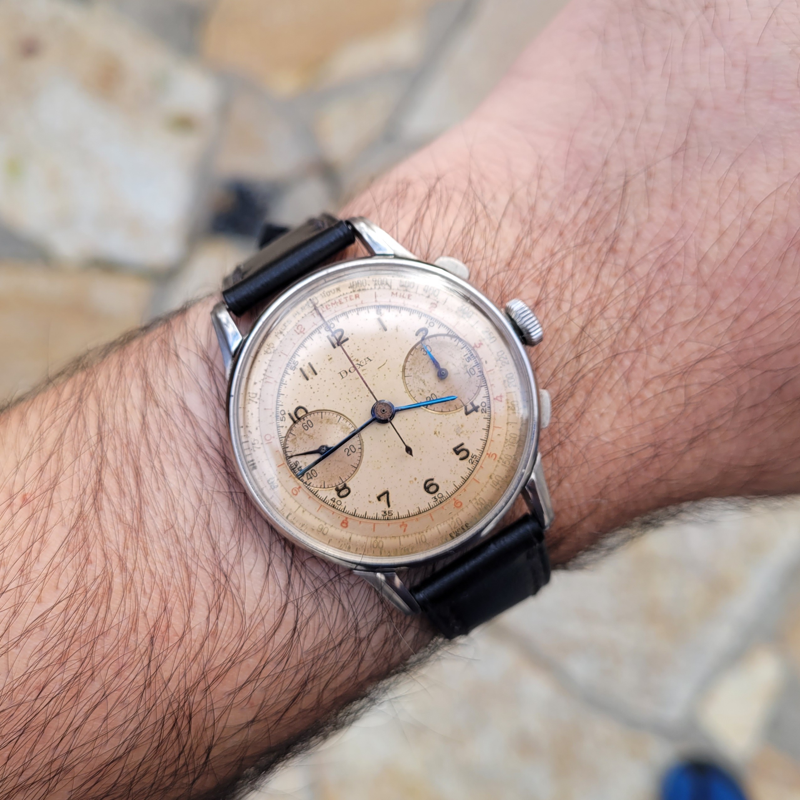 Movement: Valjoux 22 Column wheel chronograph, service history unknown. I have used the chronograph function once and after 5 minutes of running, I stopped and it reset correctly.