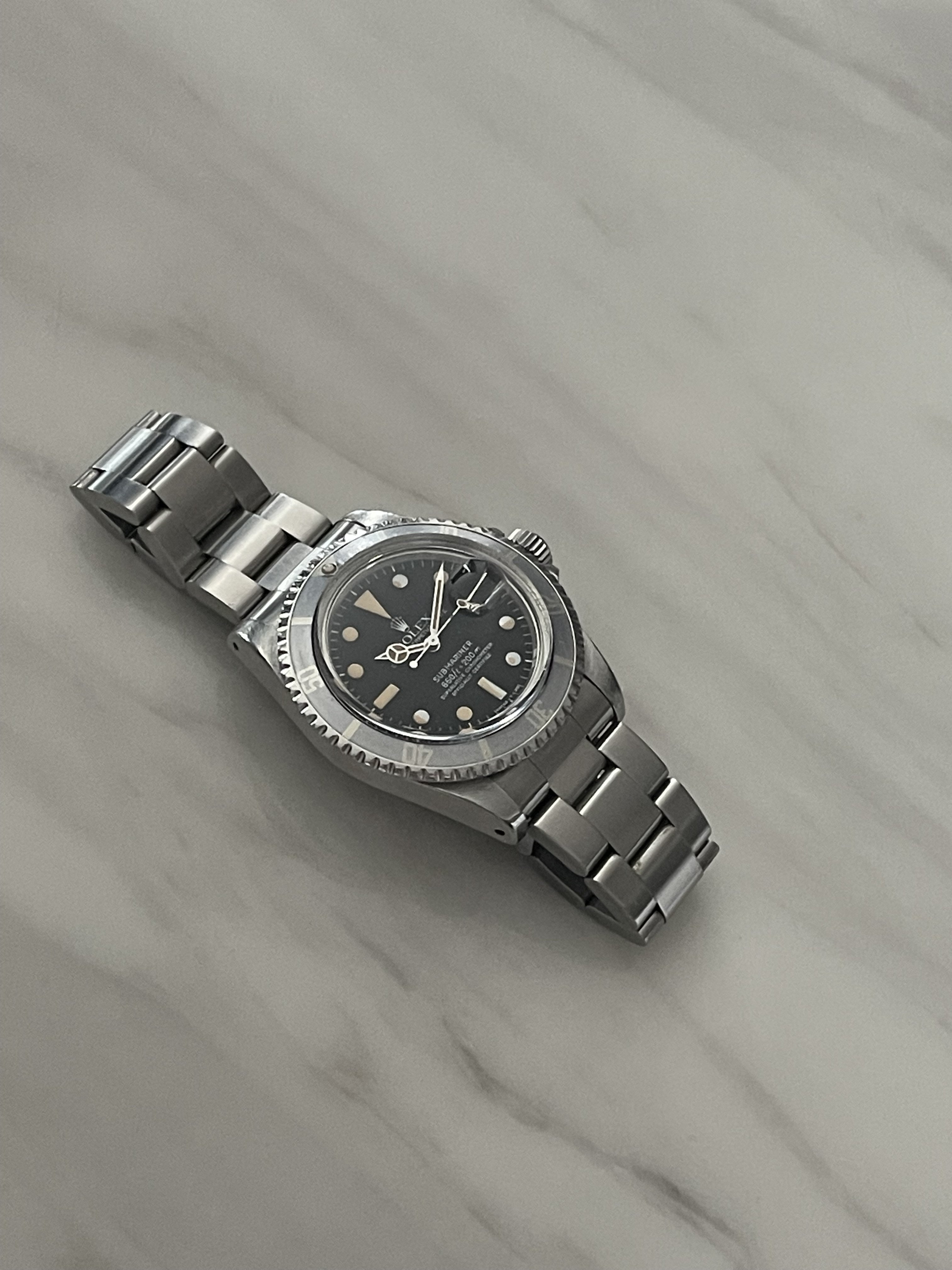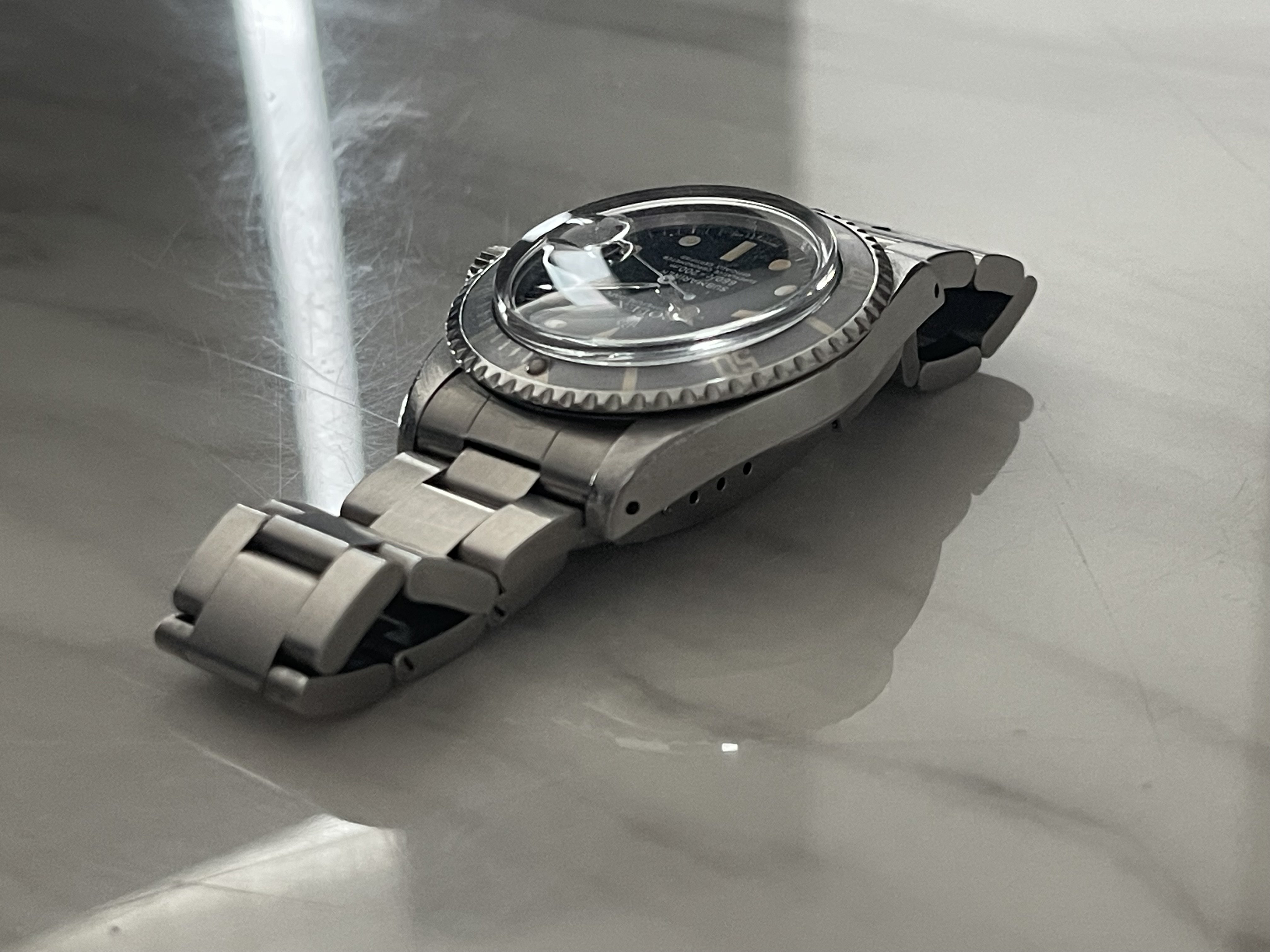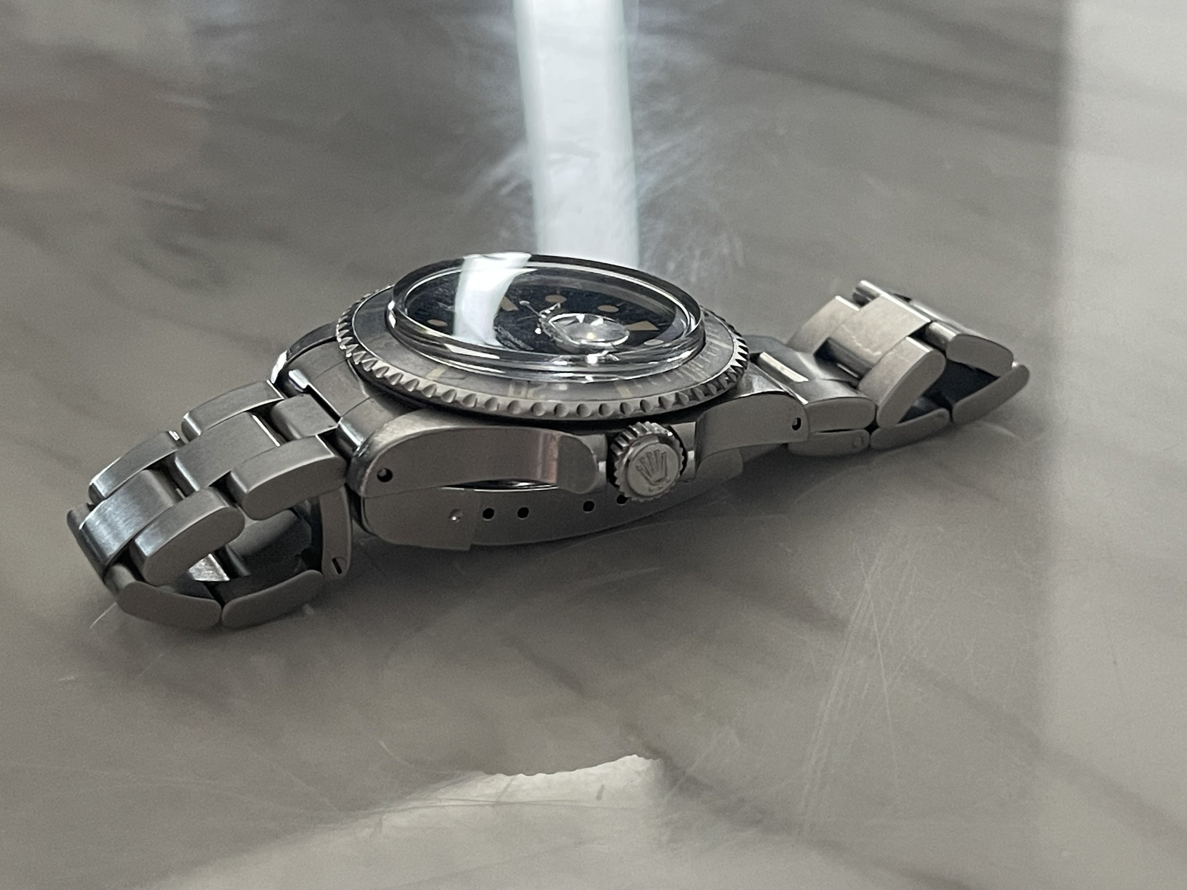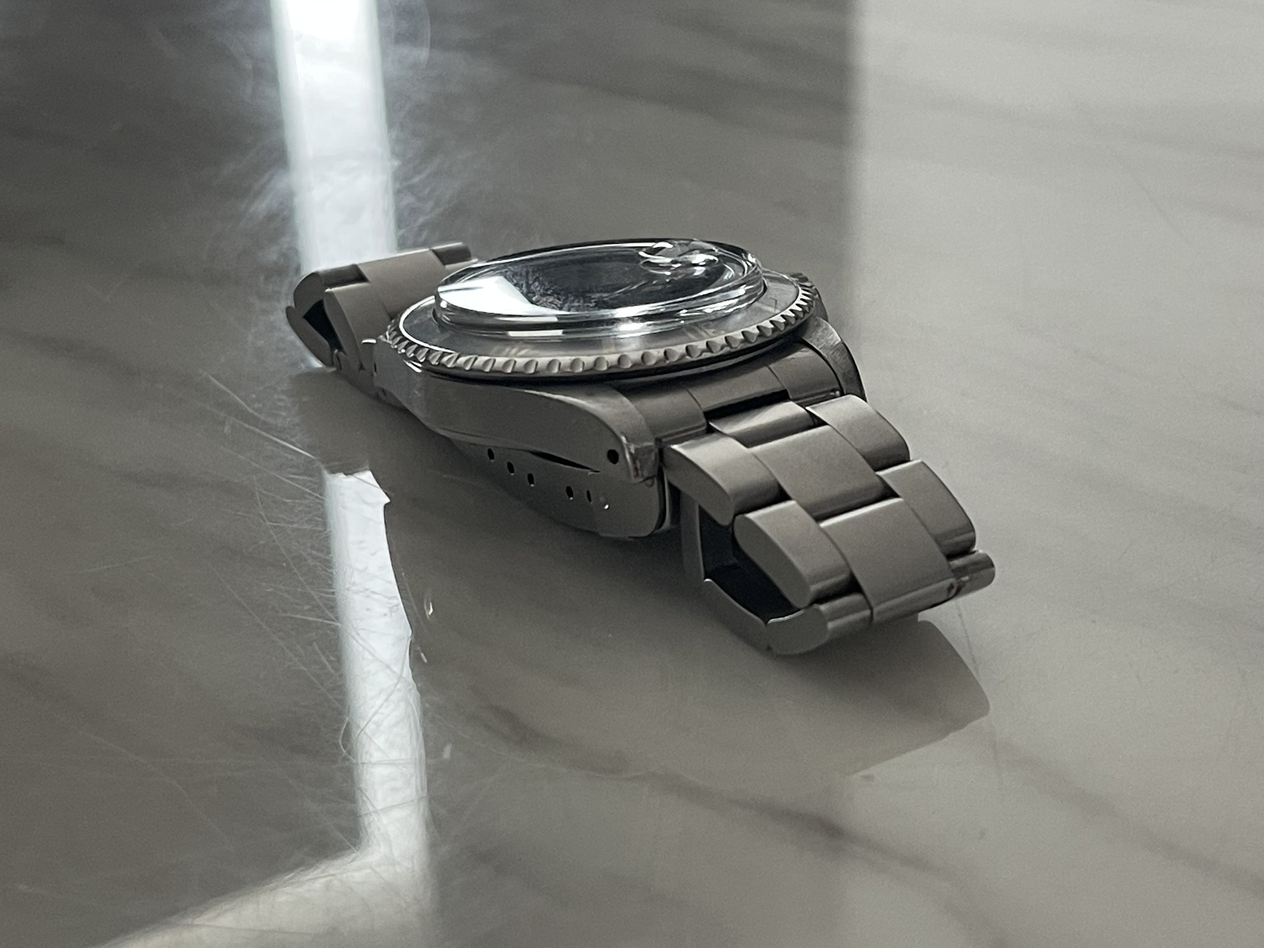 The ghost bezel is original to the watch and is the deepest natural fade I’ve ever seen on a fat font 1680 white bezel. It is hard to capture in photos but in person has this look almost like a brake rotor with a very metallic tone to the light grey, it turns beautifully.