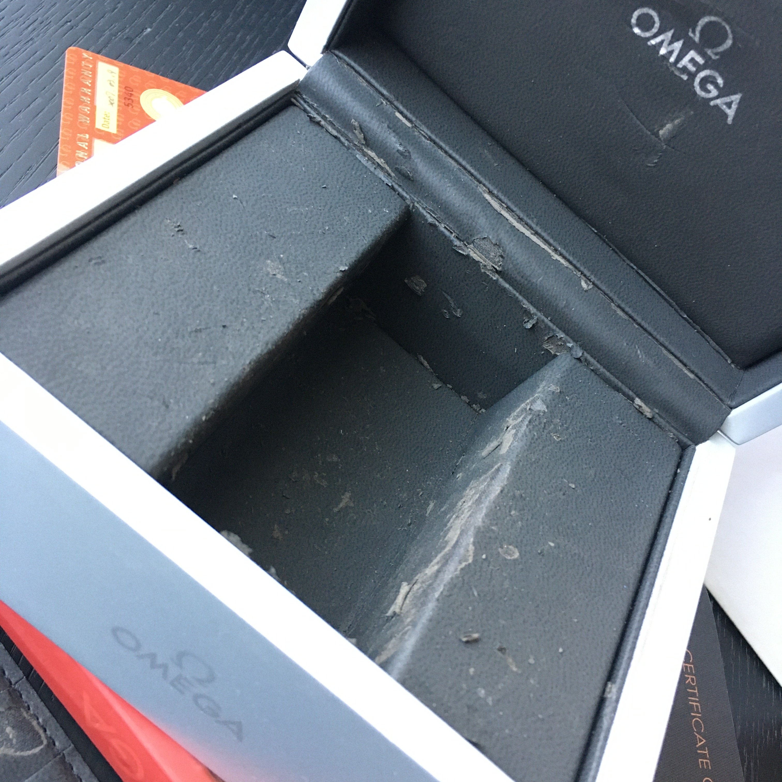 It comes complete with white cardboard outer box, silver/gray presentation box*, Certificate of Authenticity, International Warranty card (dated March 2007), cards holder*, and Operating Instructions (*see pictures for the deteriorating condition of these two items).