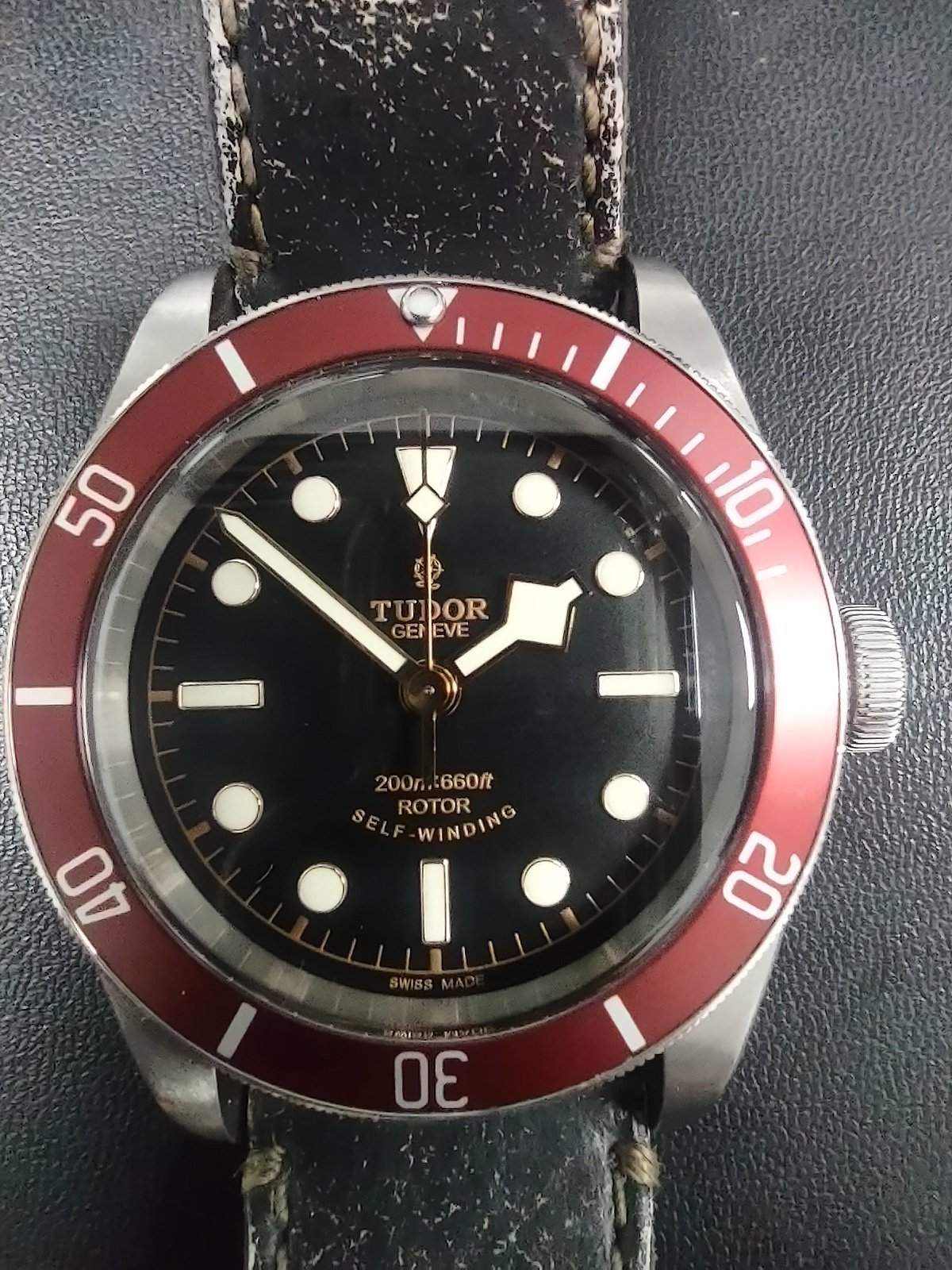 At 41mm, it sits perfectly on my 7.5 in wrist. There are some minor scratches on the case and scuffs on the deployment buckle. I specifically asked the watchmaker not to polish the case. The distressed leather strap with Tudor deployment buckle is probably one of the most comfortable I have worn.