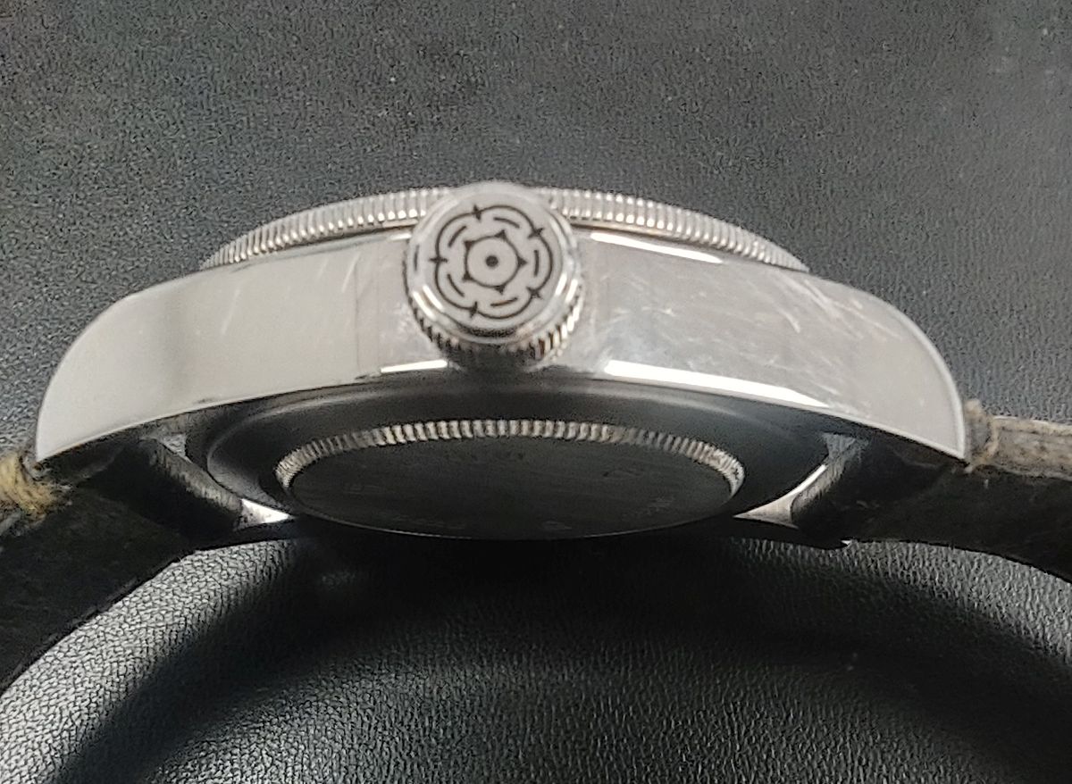 The black dial with gilt printing and Tudor rose is a nod to Tudor's history. The large screw-down crown also sports the Tudor rose.