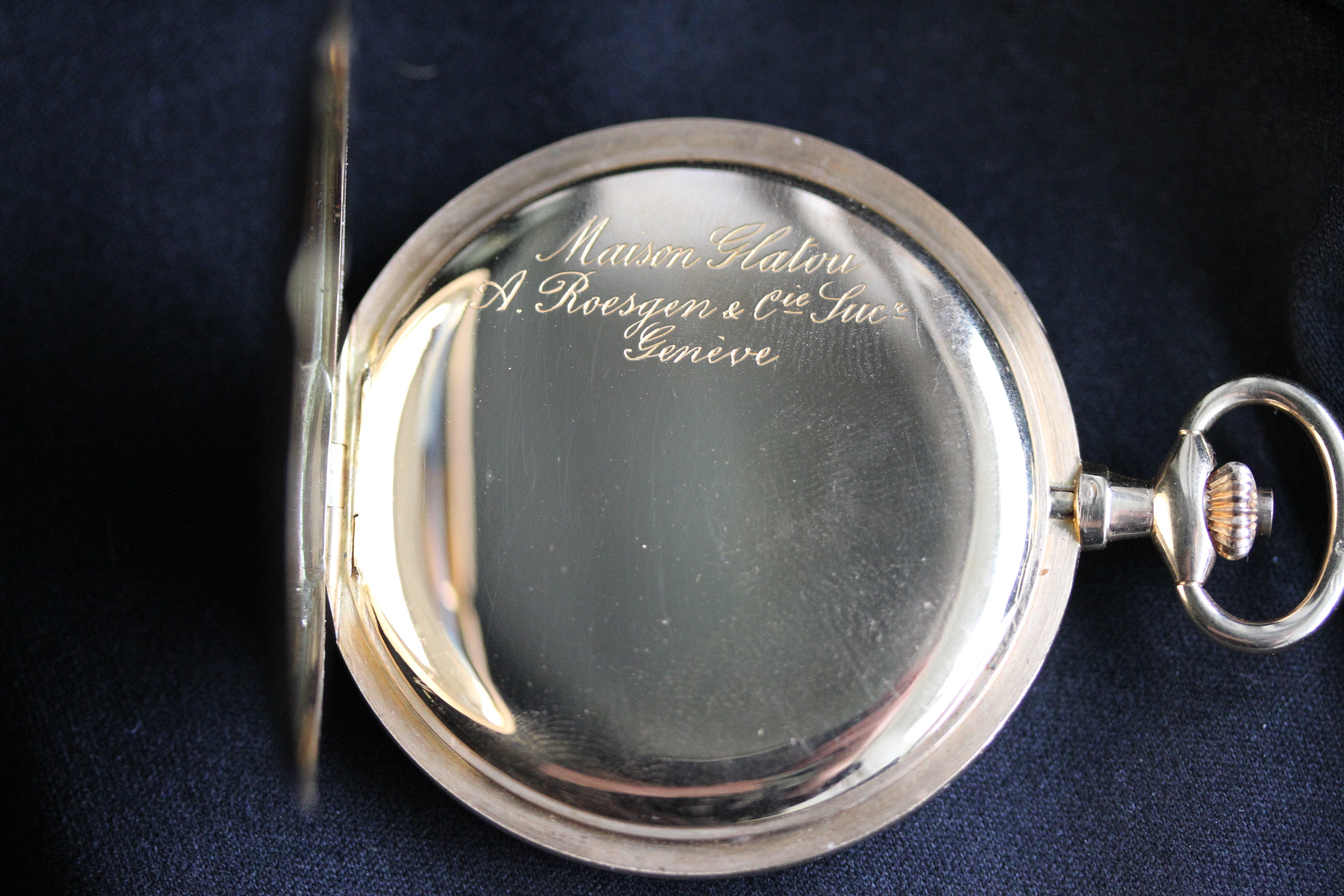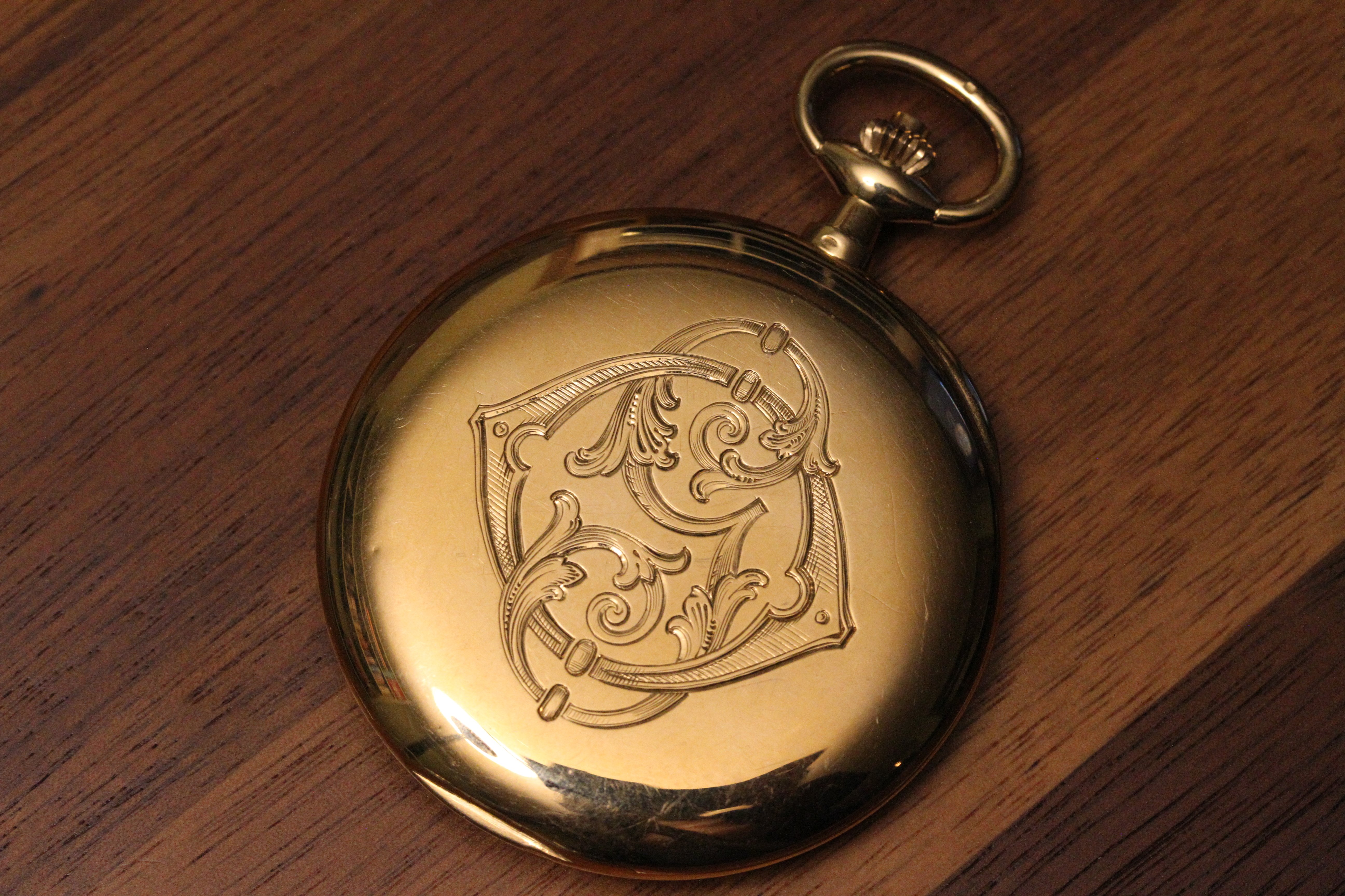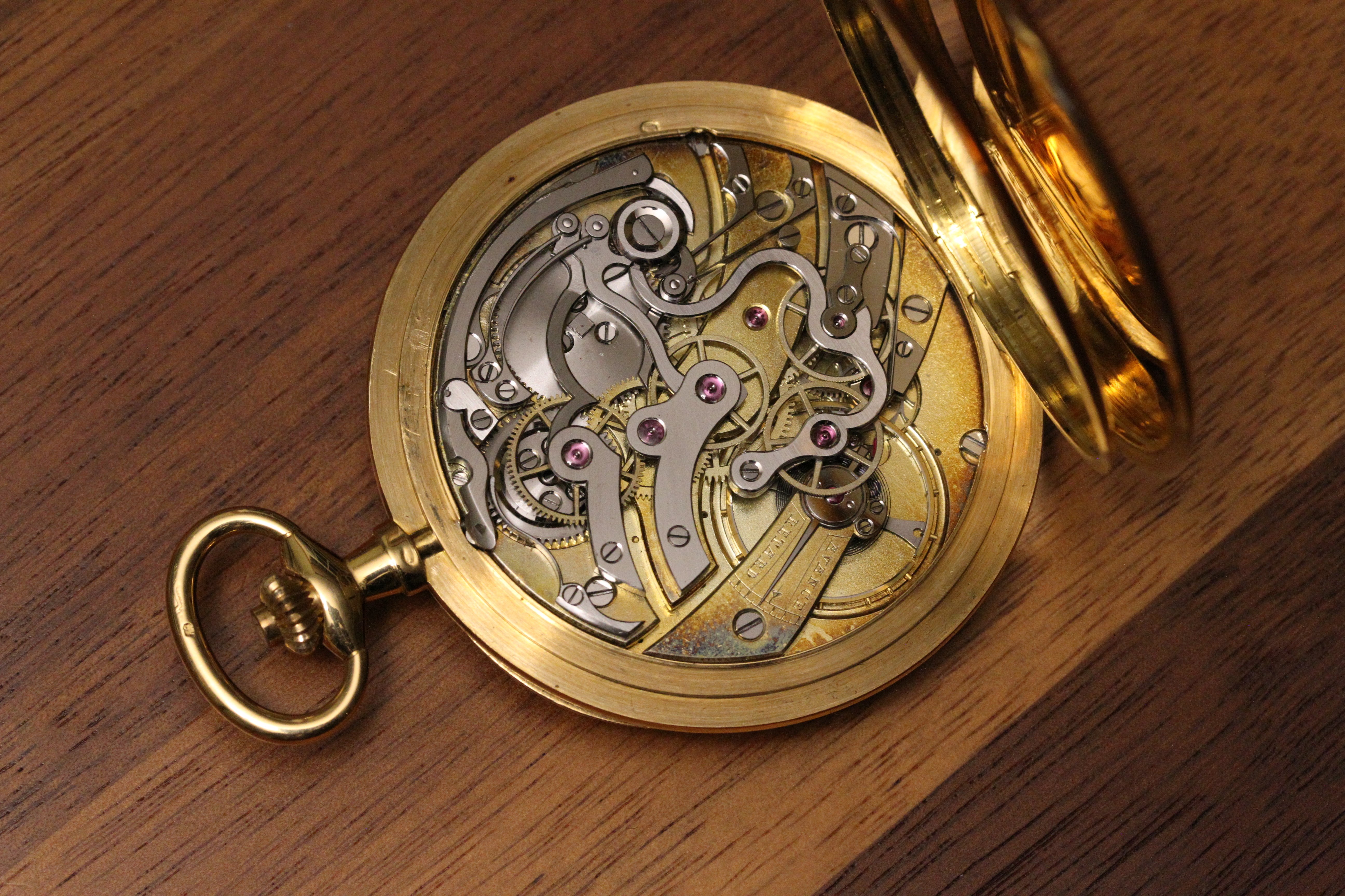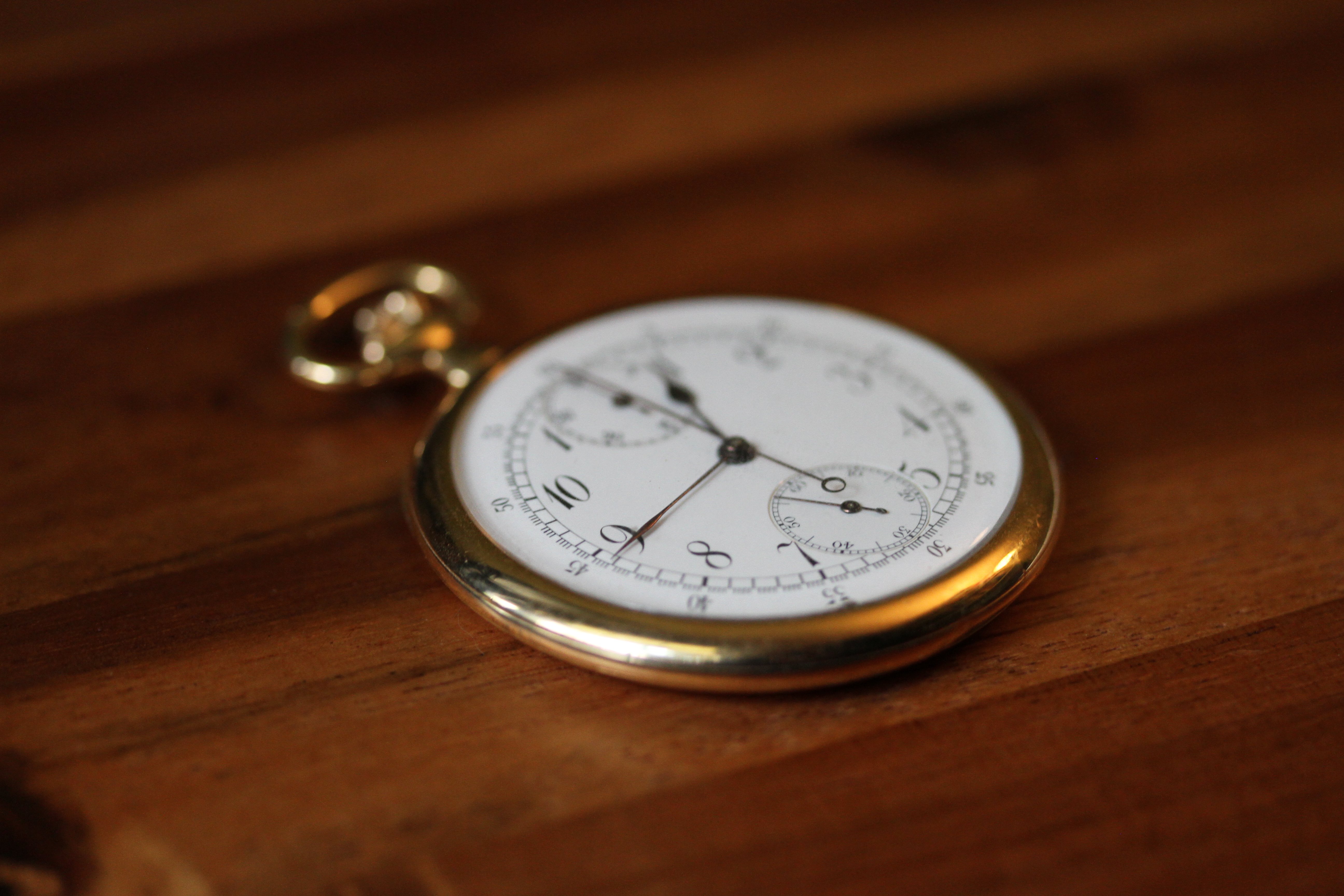 ·Here is an ultra thin, early century 18k chronograph pocket watch. The watch is an exceptional example of early turn-of-the-century watchmaking. The movement is rare to the point that I haven't seen another with this configuration. High level of finish, with polished and bevelled steel and a cap jewel on the escape wheel.
