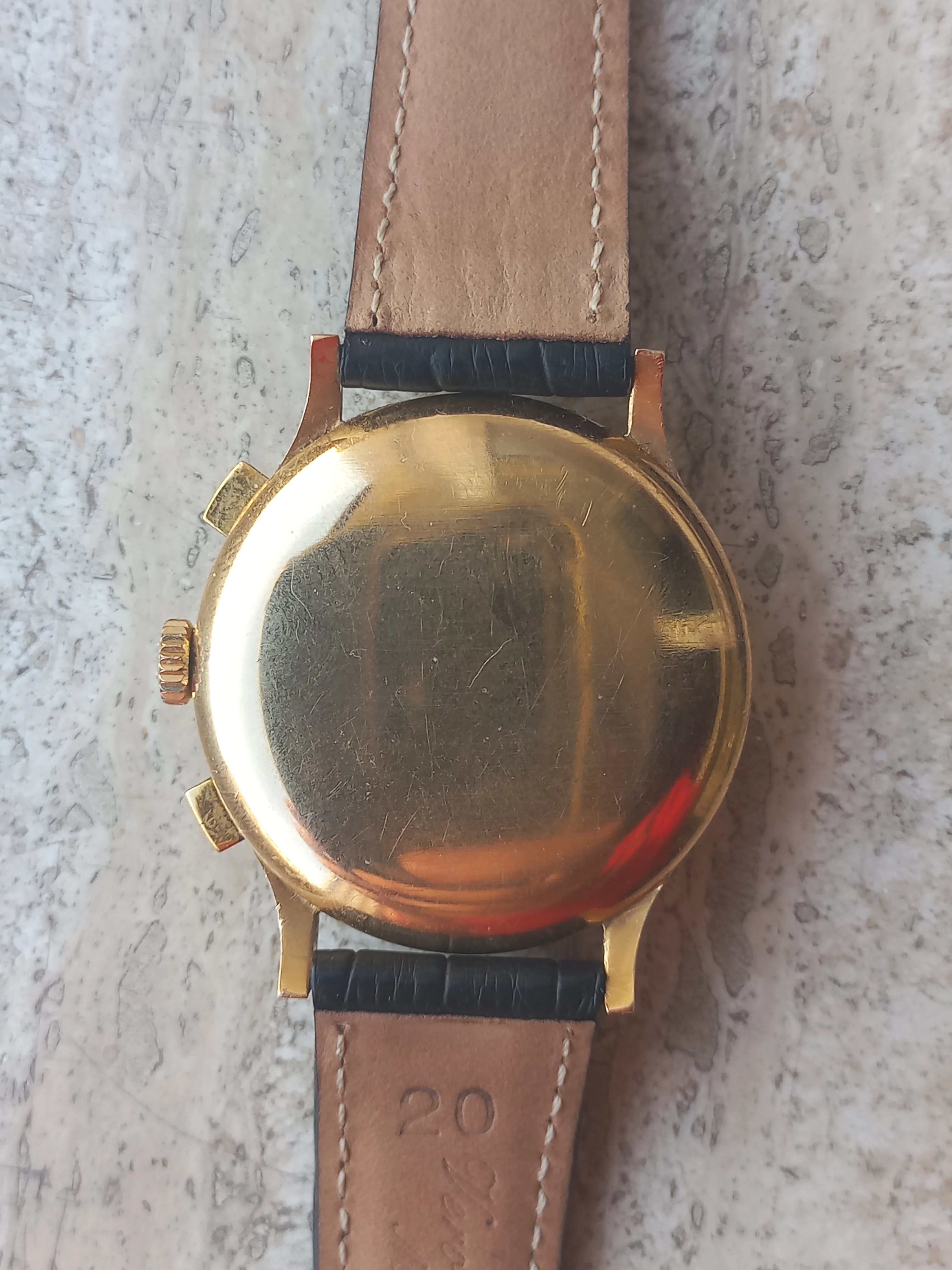 The queen of the party here is the case, a huge 39mm yellow gold excluded crown that makes this watch very nice and contemporary to wear. It looks untouched to me, pushers are in great conditions, signed crown is a later replacement. Inside the signed snap back the engraved serial case number is fully readable and dates back to early 50s. Lug width 20mm.