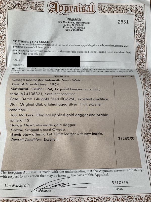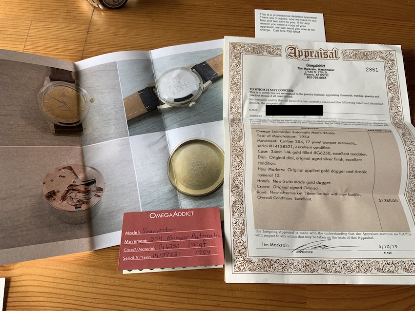 Last service: 5/10/2019 by watchmaker Tim Mackrain (OmegaAddict) with one-year warranty.