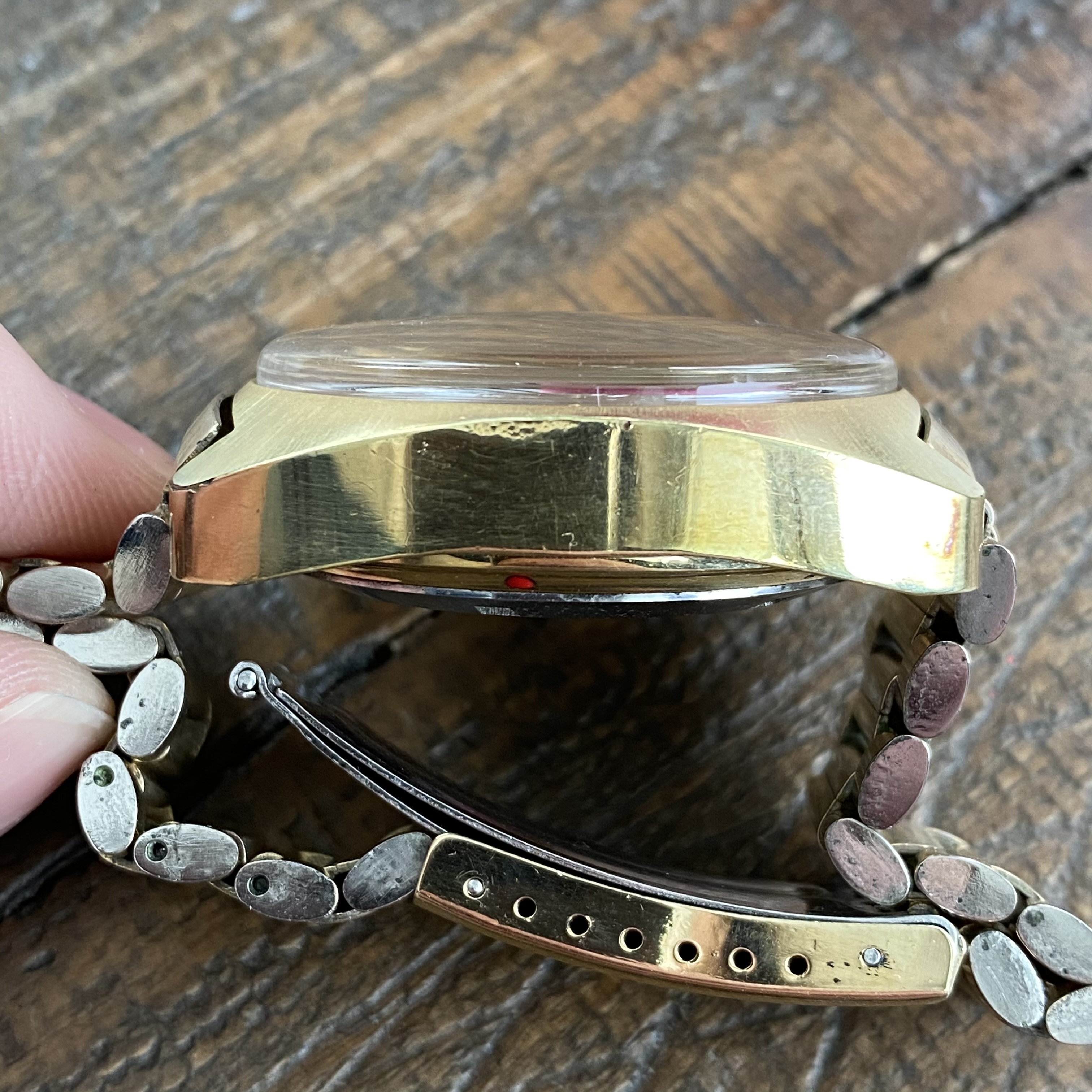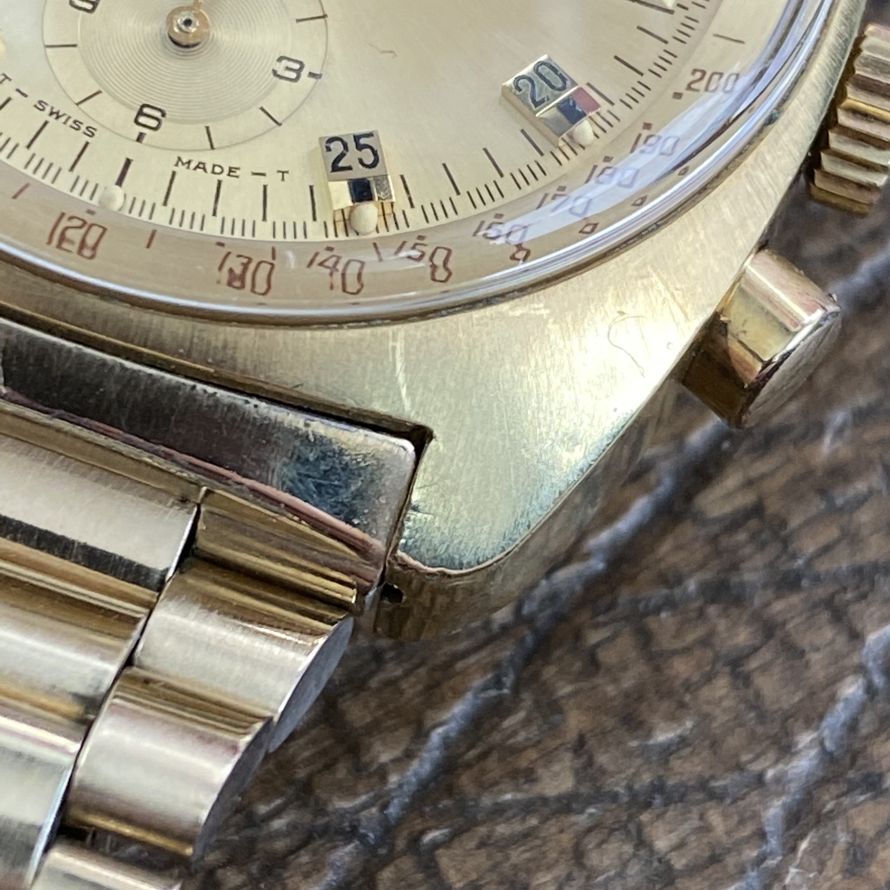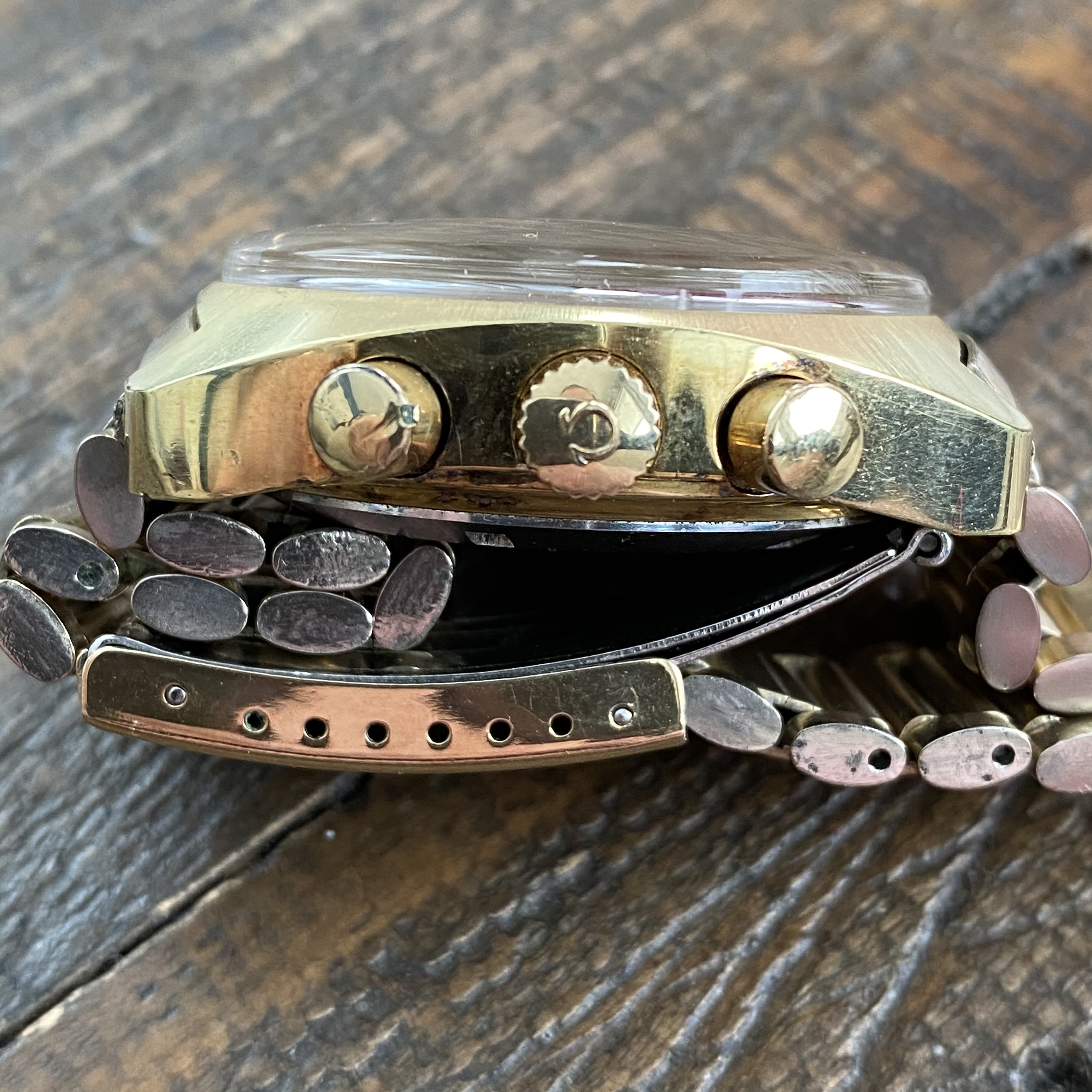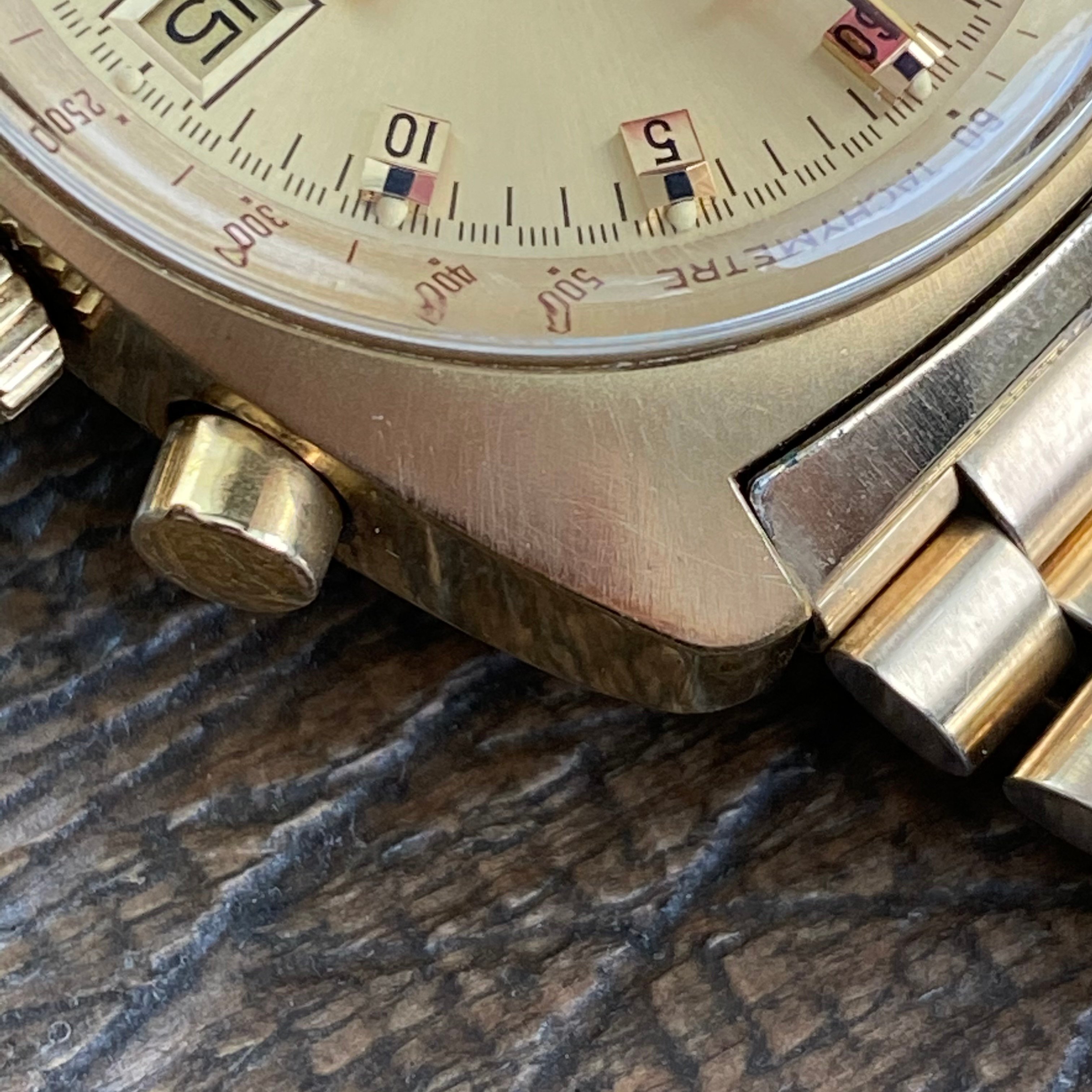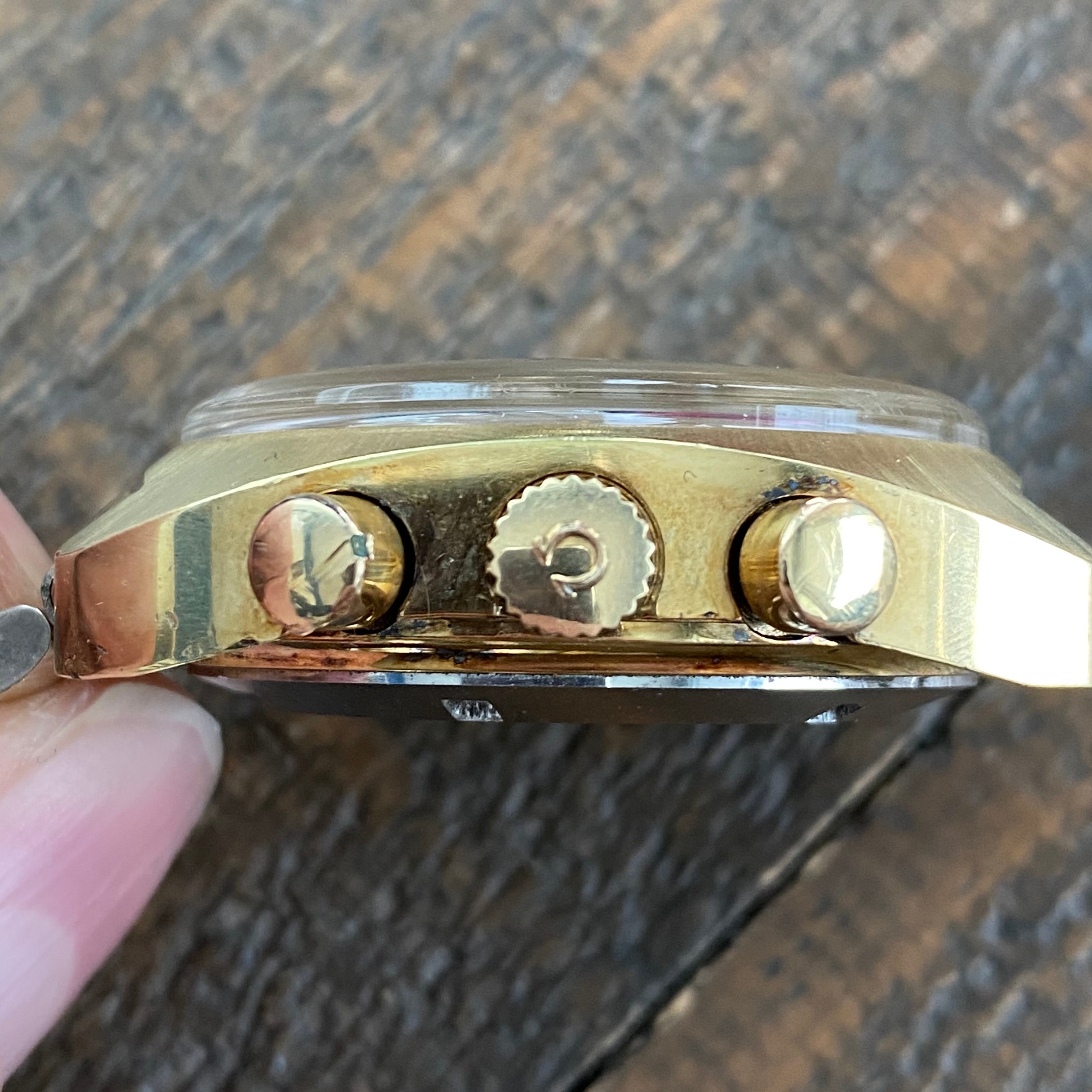 Pushers and crown functioning as they should. One pusher has a chip in the plating - see closeup photo. The plating on the pushers of these is often missing, but mostly present on this example.