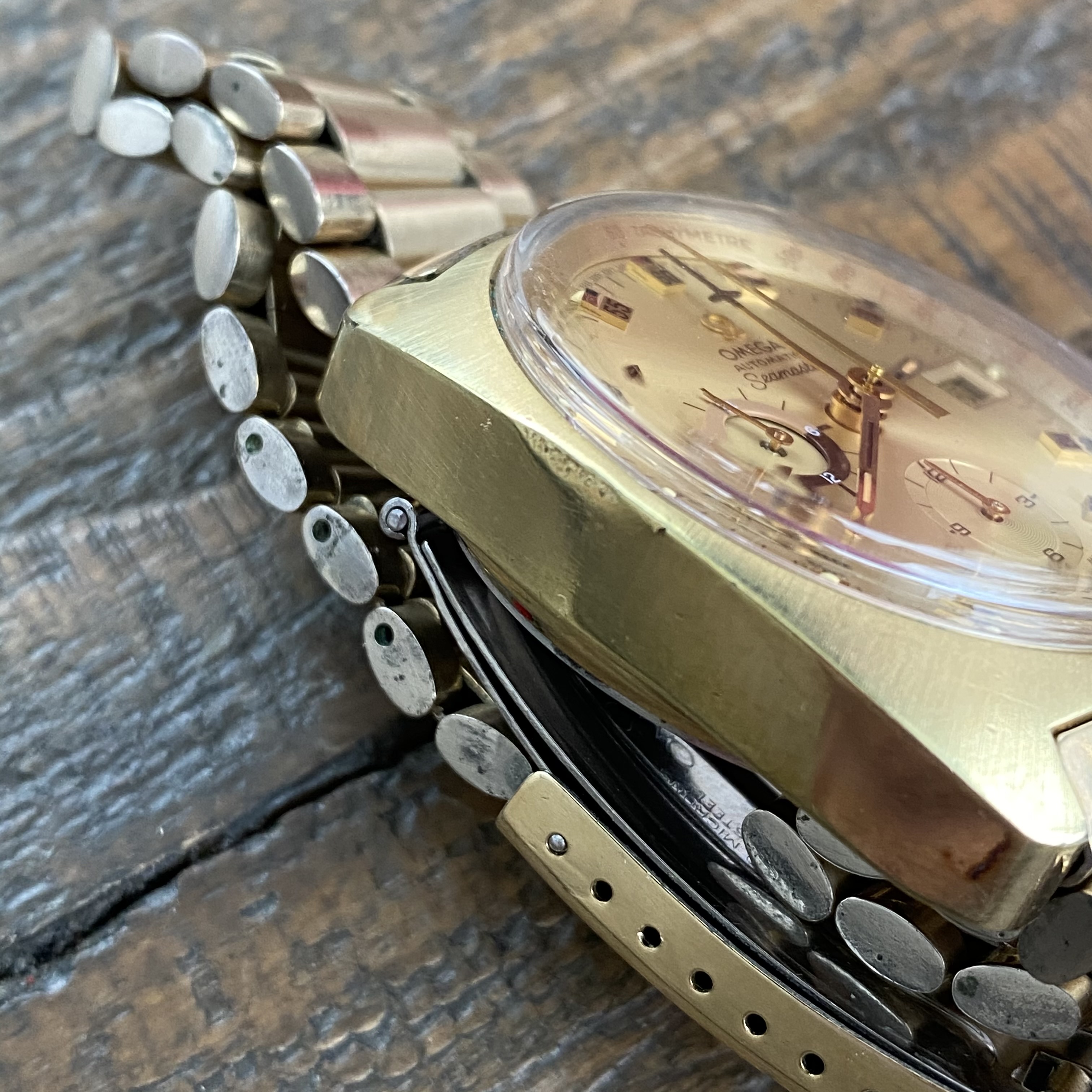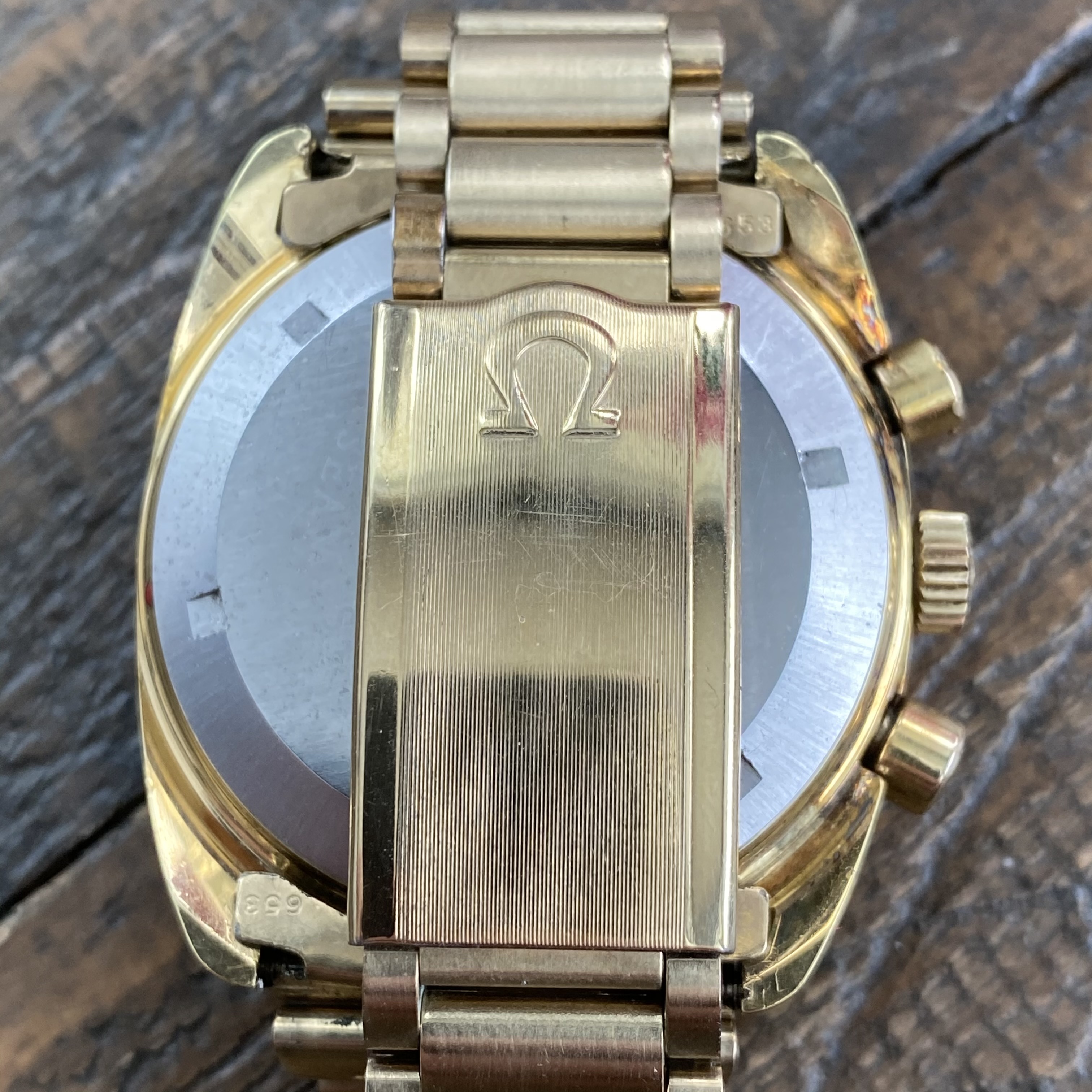 Comes on original Omega bracelet reference 1162 with 653 end links and a 10-76 date stamp. Bracelet fits up to 7.5 inch wrist.